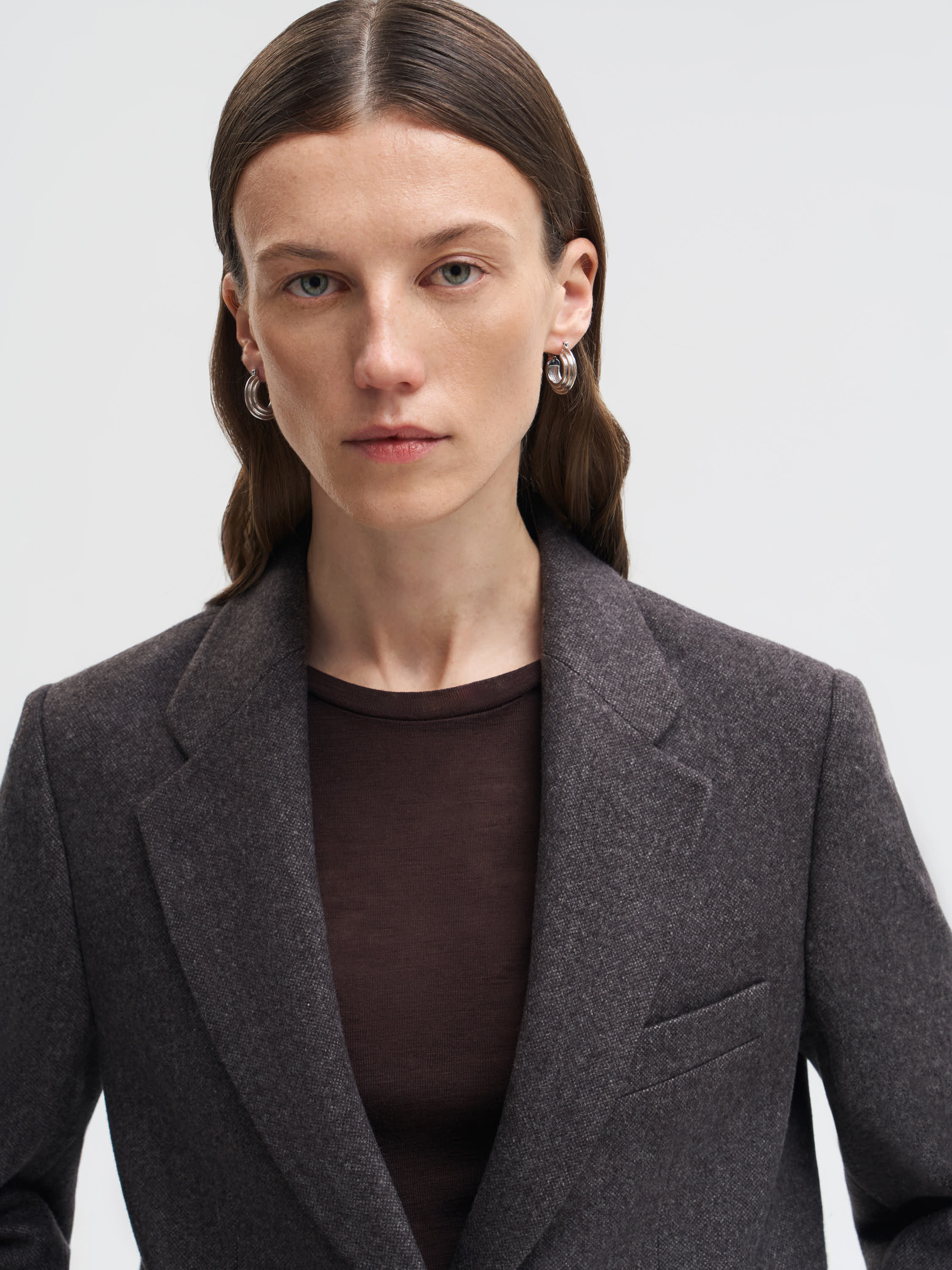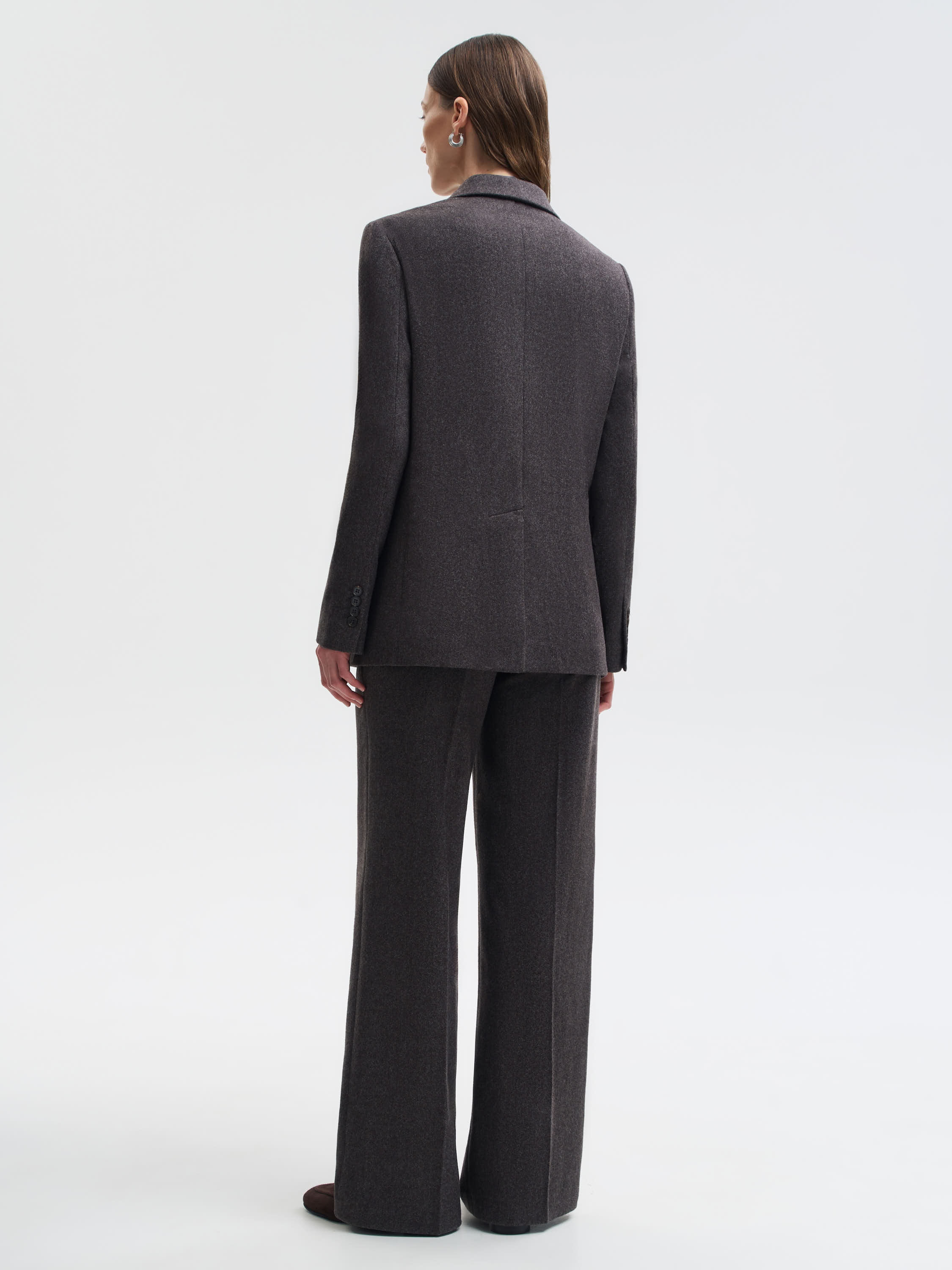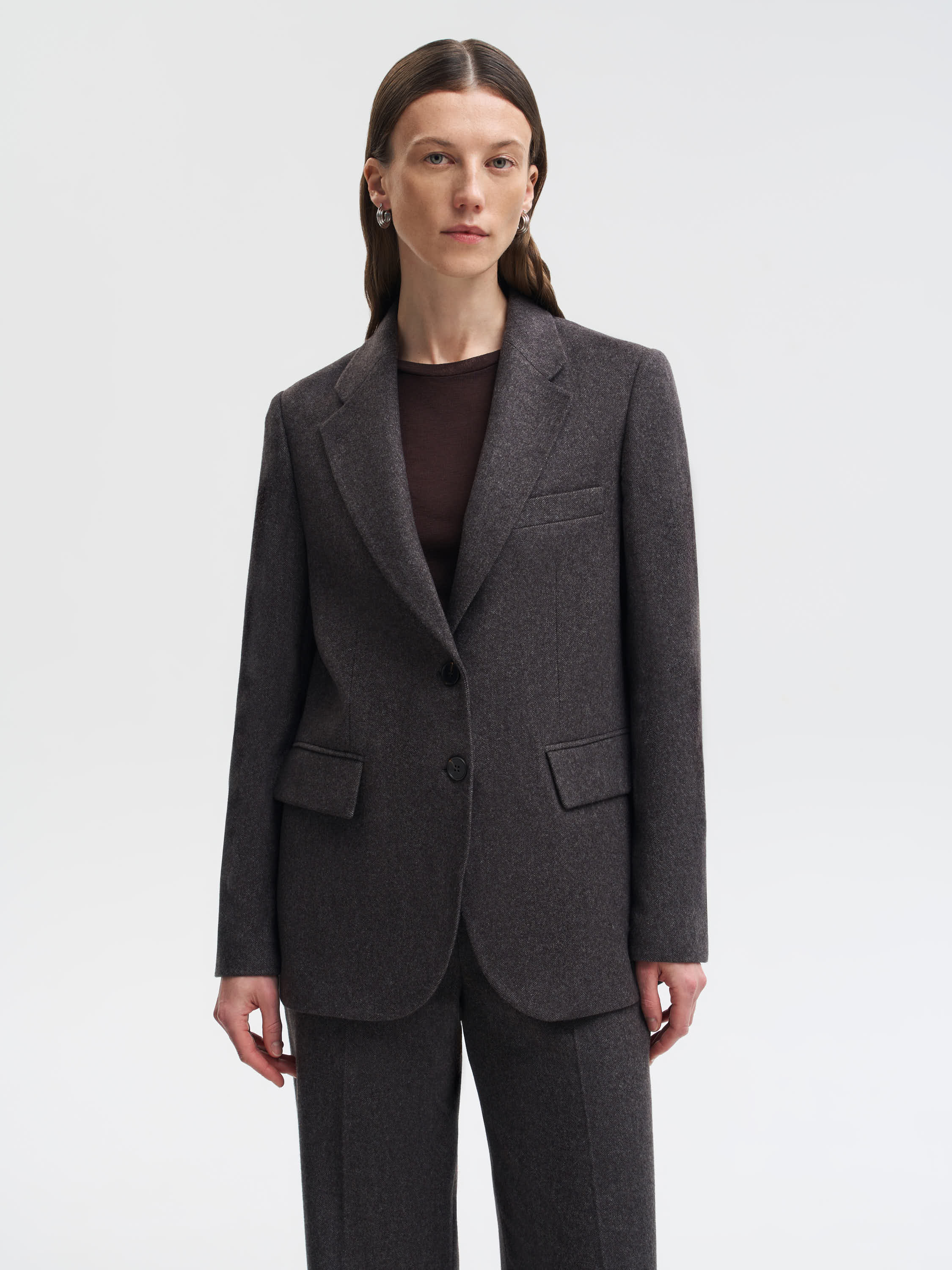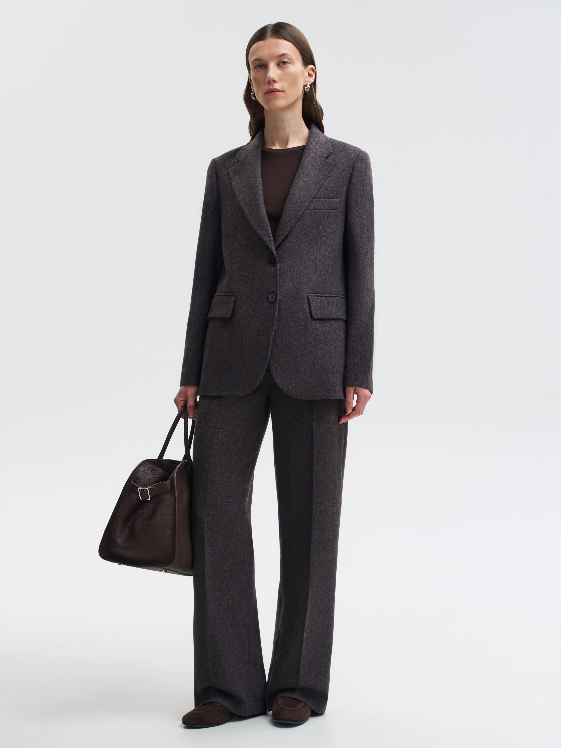 Жакет выполнен из шерсти и шелка — костюмная ткань с добавлением шелковых волокон придает поверхности мягкий блеск и характерную гладкость. Материал сохраняет тепло, держит форму и выглядит безупречно даже при активном ритме дня. Классический крой с акцентом на плечах и приталенной линией создает элегантный силуэт. Однобортная застежка, прорезные карманы с клапанами, шлица сзади — детали, подчеркивающие безупречное исполнение. Жакет гармонично смотрится в комплекте с брюками из того же материала или в дуэте с шелковыми блузами и тонким трикотажем, формируя утонченные и современные образы.