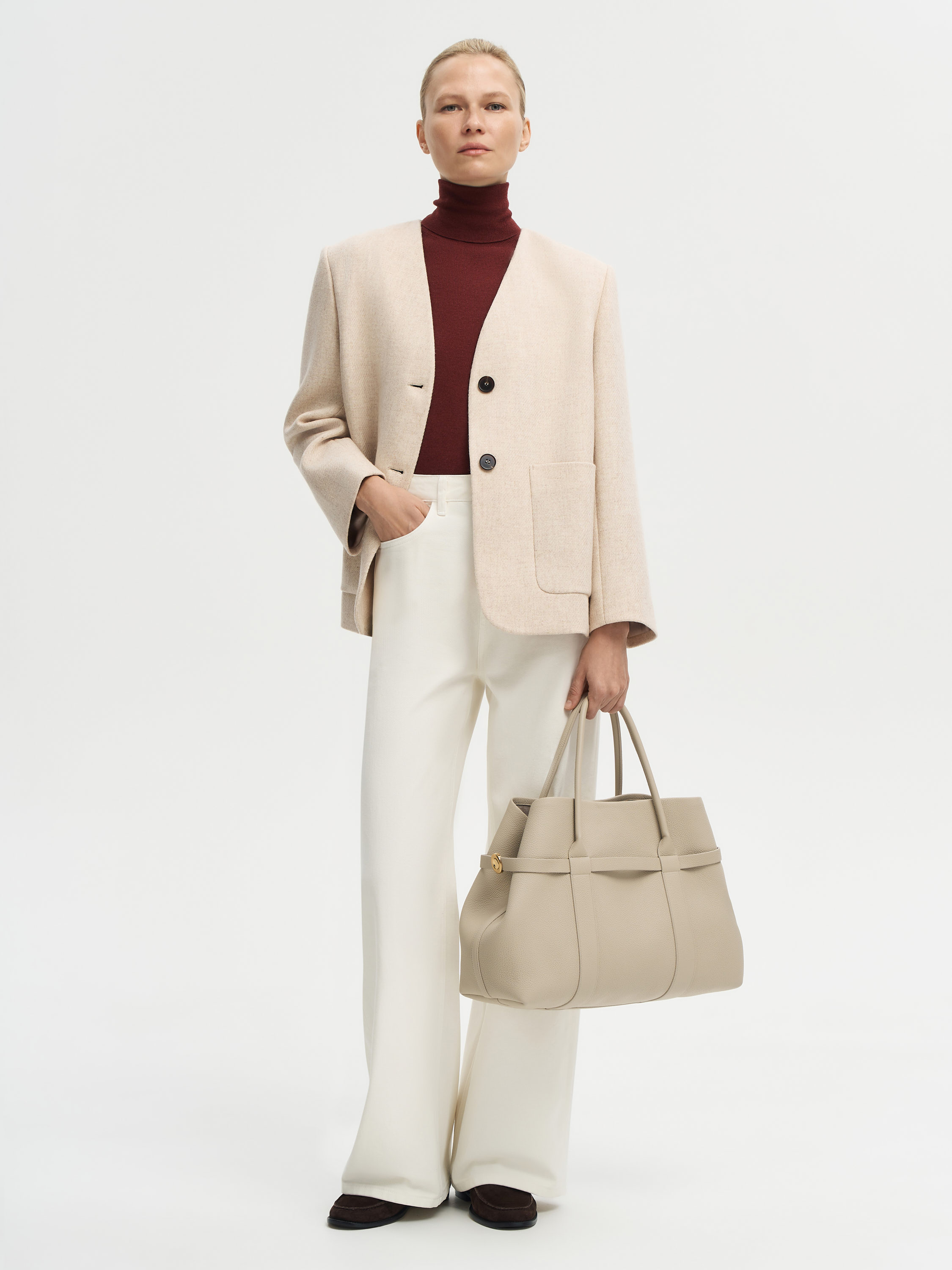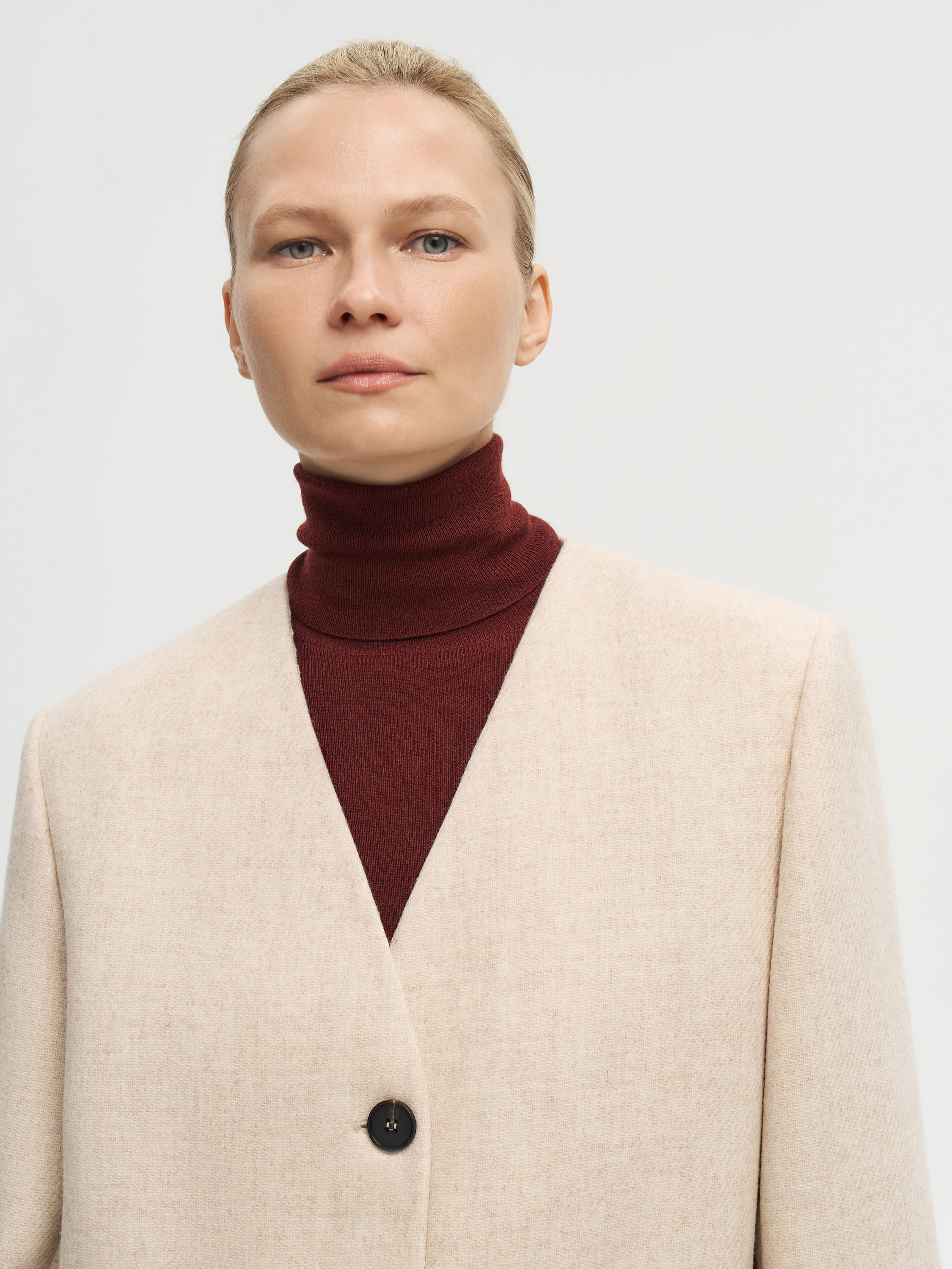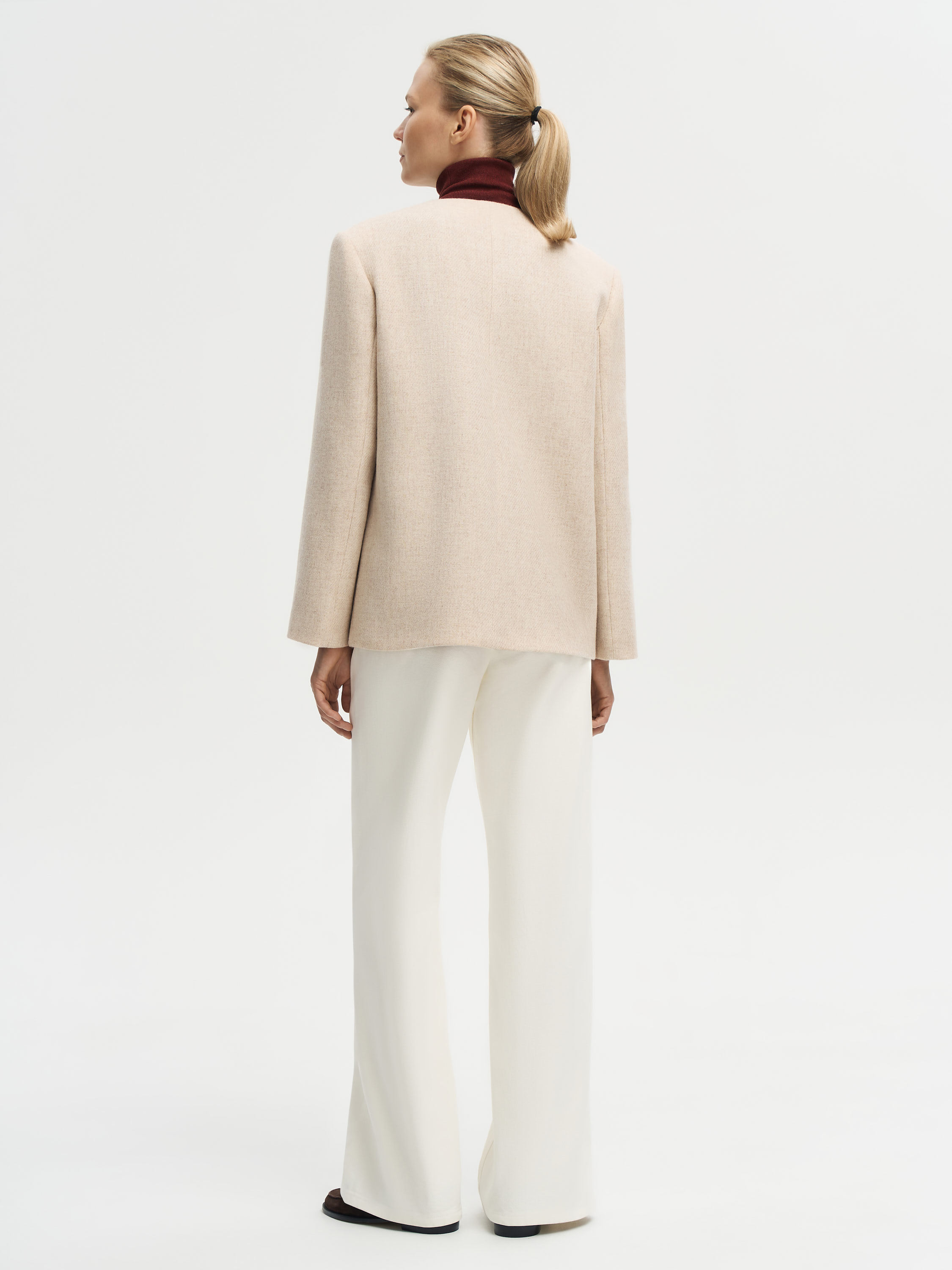 Жакет из шерсти с мягкой, плотной текстурой и естественным матовым блеском волокон. Материал сохраняет тепло, хорошо держит форму и комфортен в носке. Модель имеет свободный силуэт без воротника, с глубоким V-образным вырезом и застежкой на две пуговицы. Крупные накладные карманы подчеркивают лаконичность дизайна, а округлые линии низа добавляют мягкости образу. Такой жакет уместен в офисных и повседневных комплектах, особенно в сочетании с однотонными брюками, водолазками и рубашка.