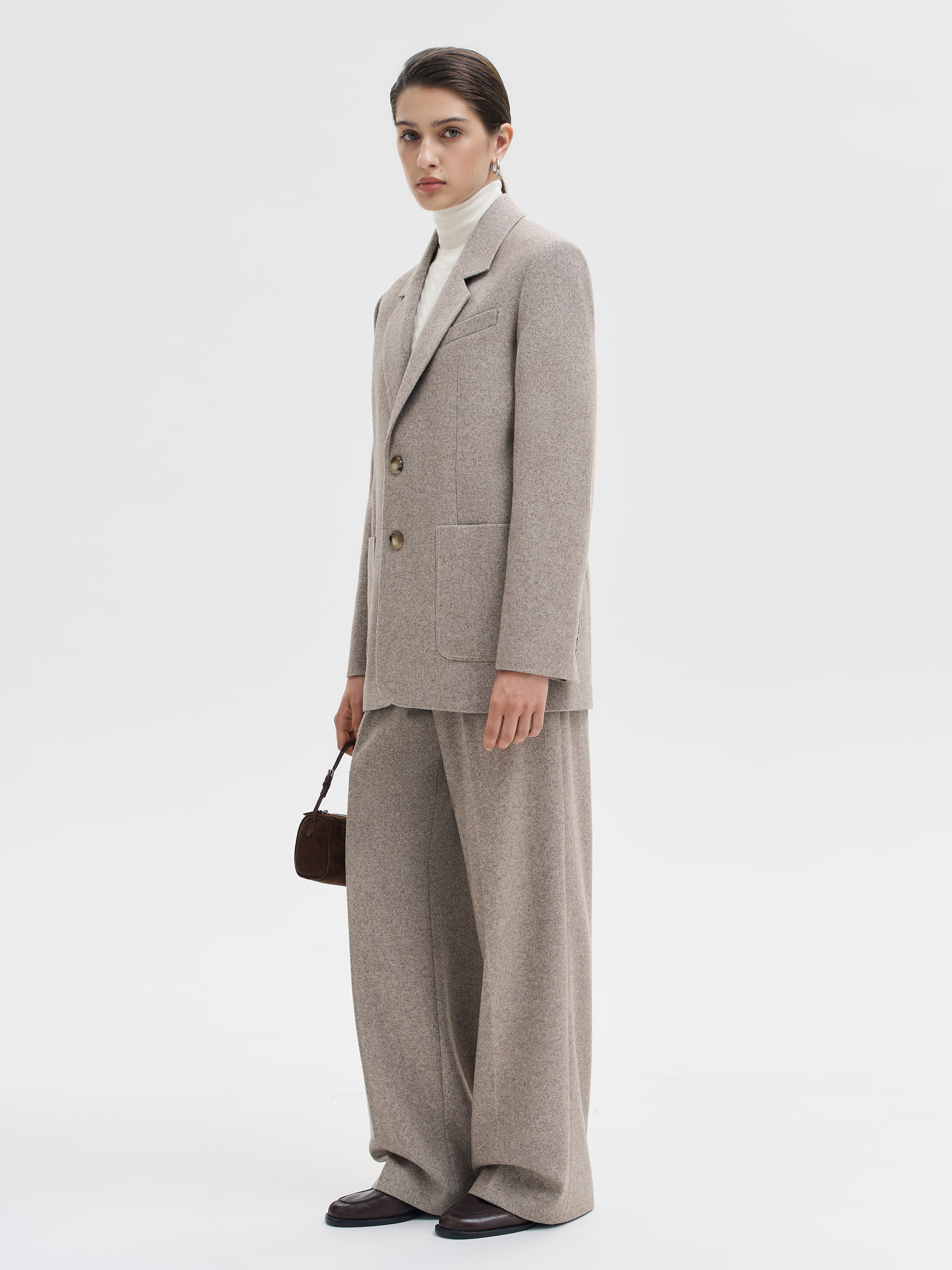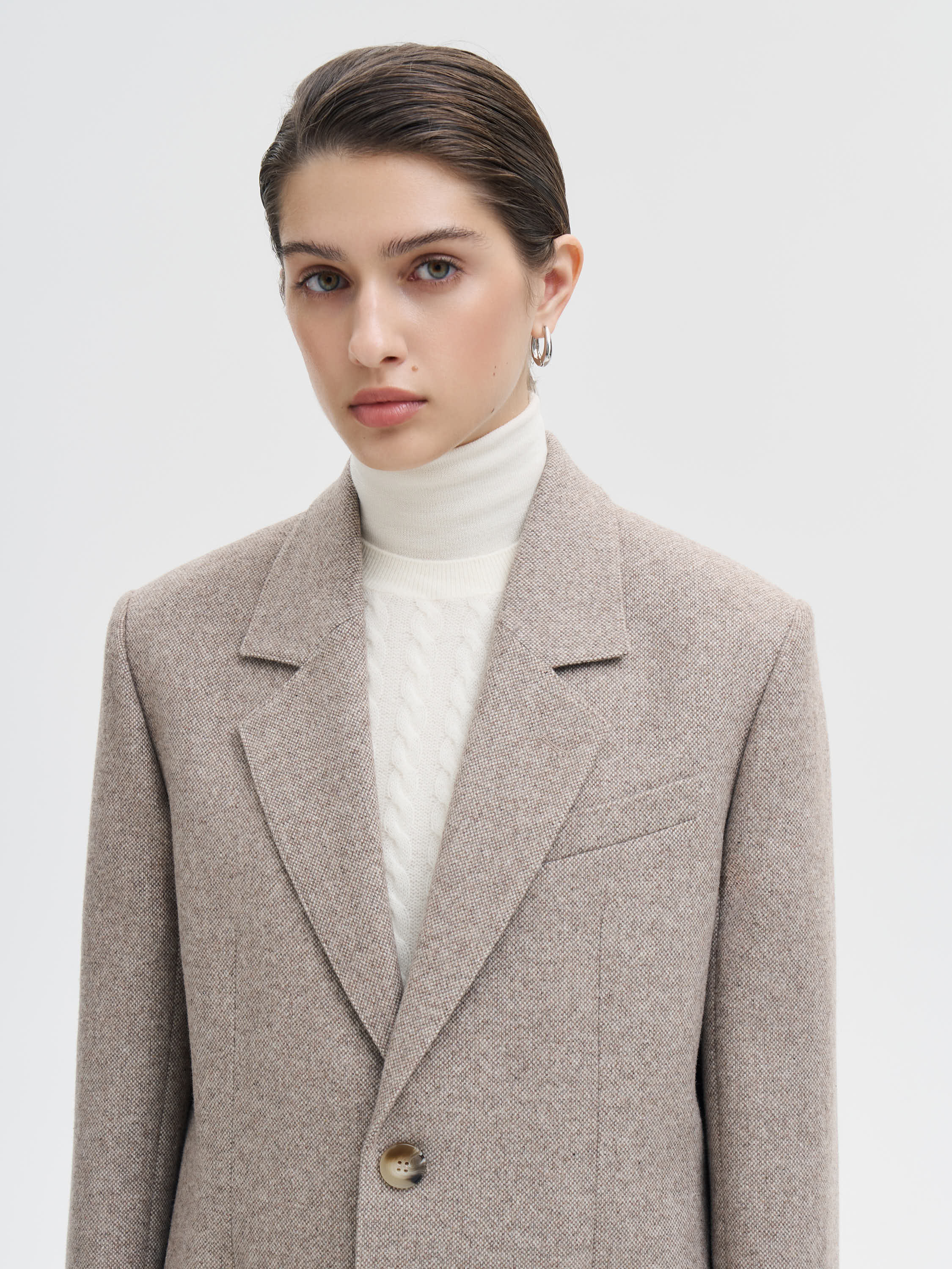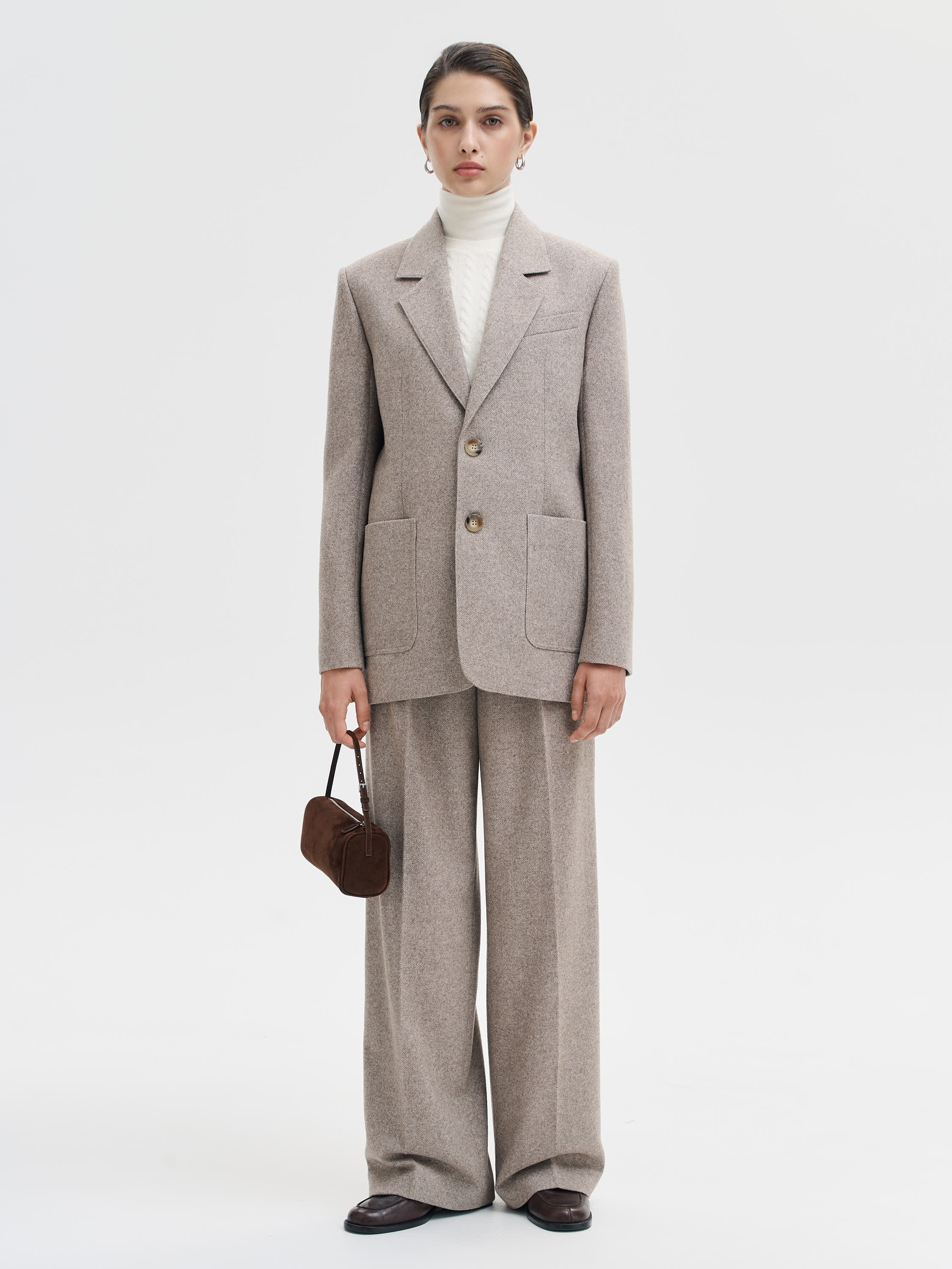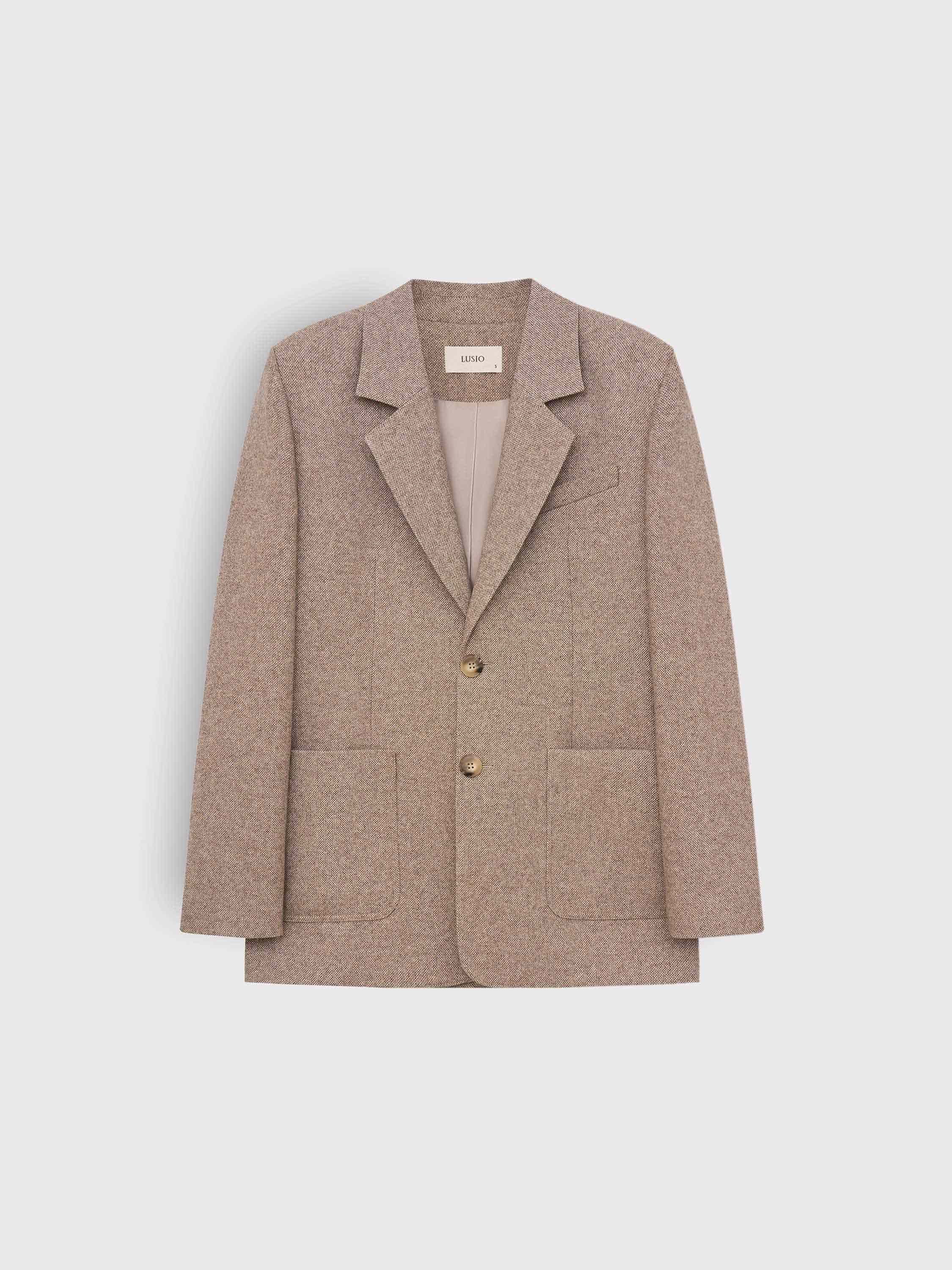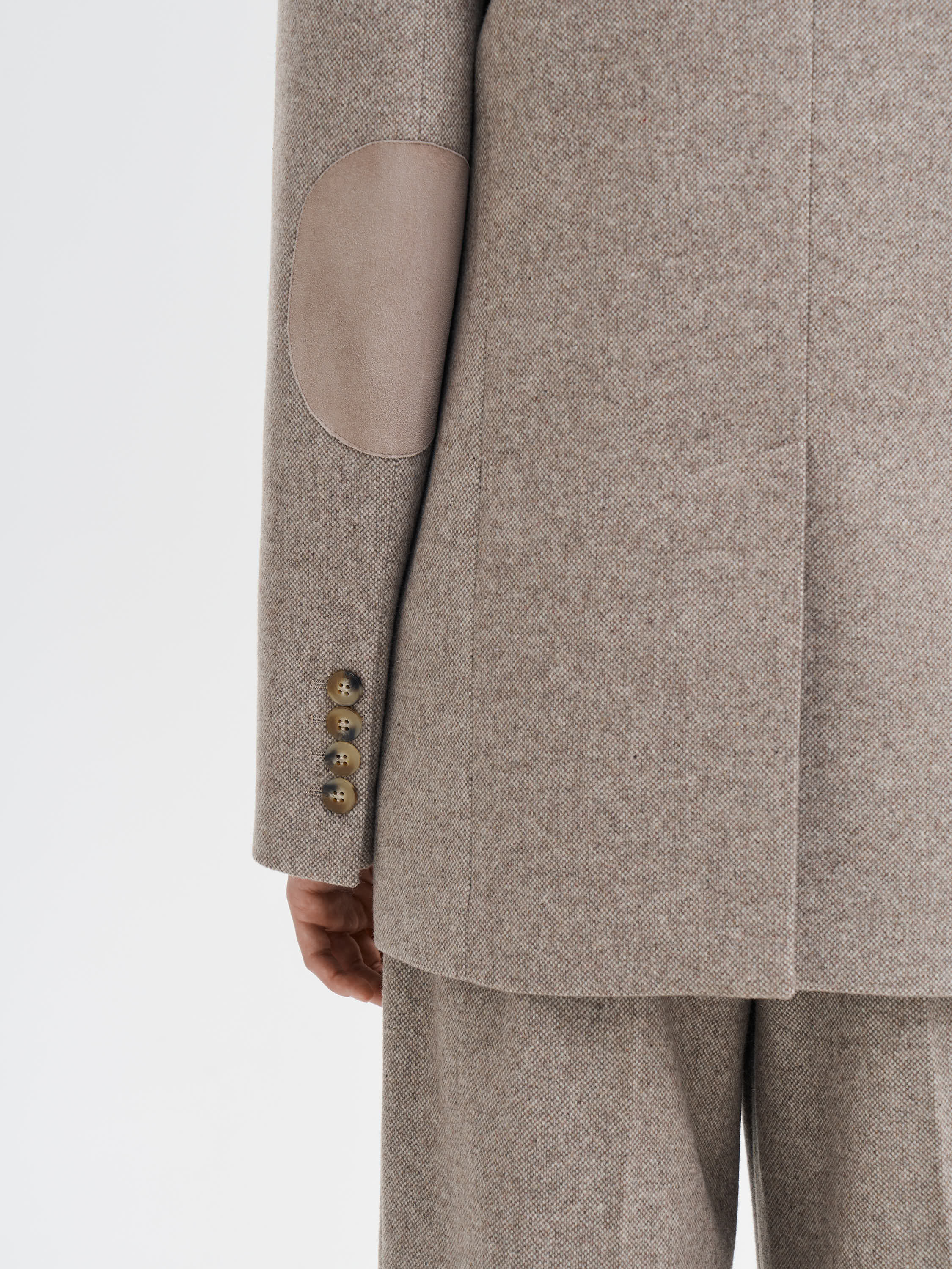 Жакет прямого кроя из смесовой ткани с шерстью. Плотное костюмное полотно с мягкой поверхностью держит форму, дышит и сохраняет тепло. Модель выполнена на подкладке, дополнена отложным воротником с узкими лацканами, крупными накладными карманами и застежкой на две пуговицы. Акцентная деталь — накладки на локтях из натуральной кожи, придающие изделию характер и повышающую износостойкость. Прямые рукава, выверенные пропорции и сдержанный оттенок позволяют легко интегрировать жакет в деловой, повседневный или капсульный гардероб.