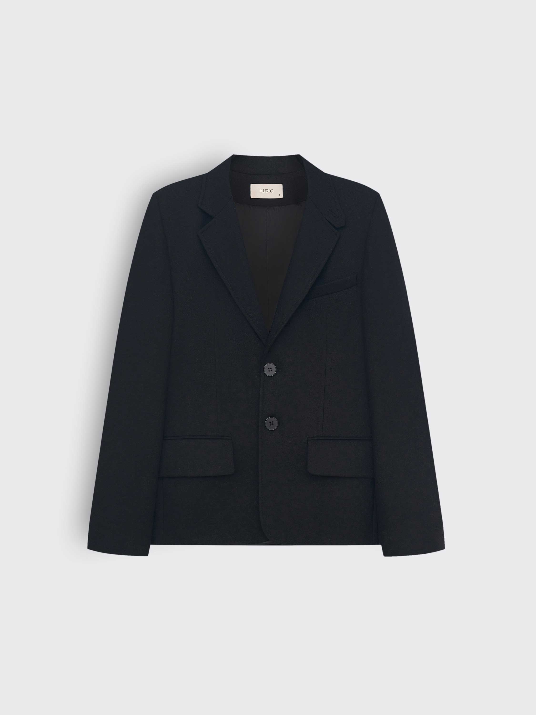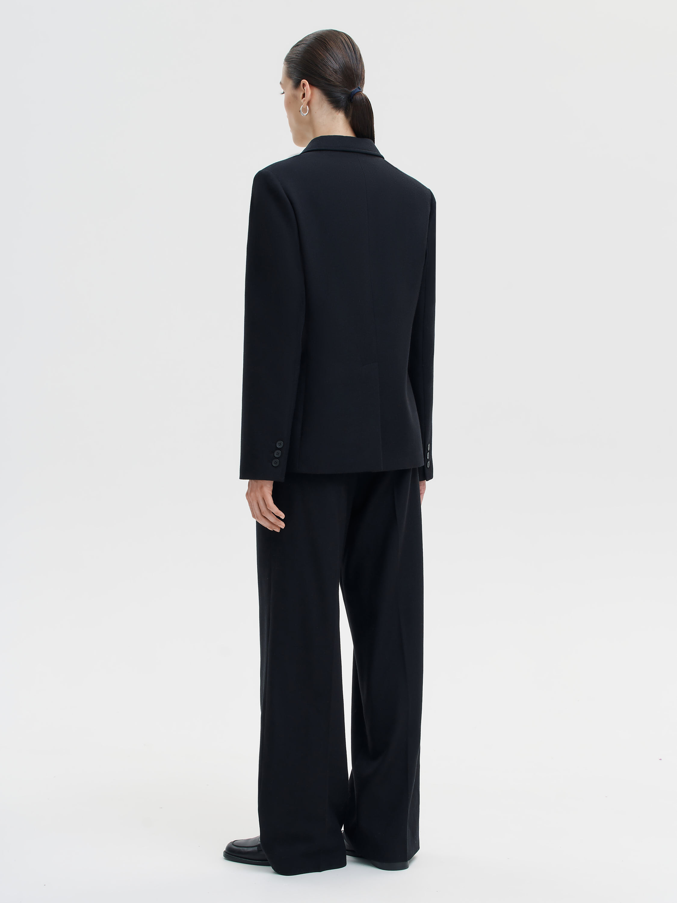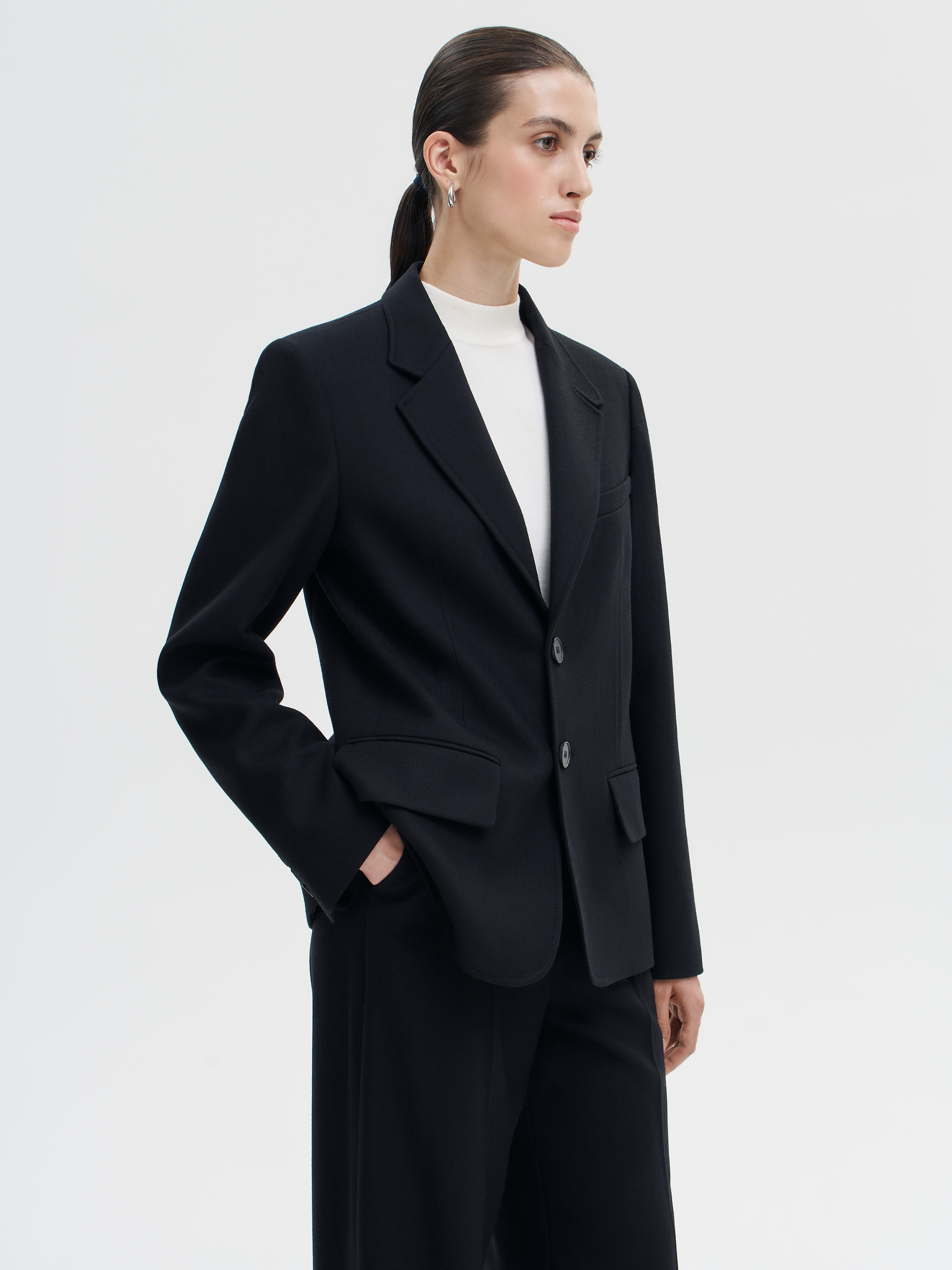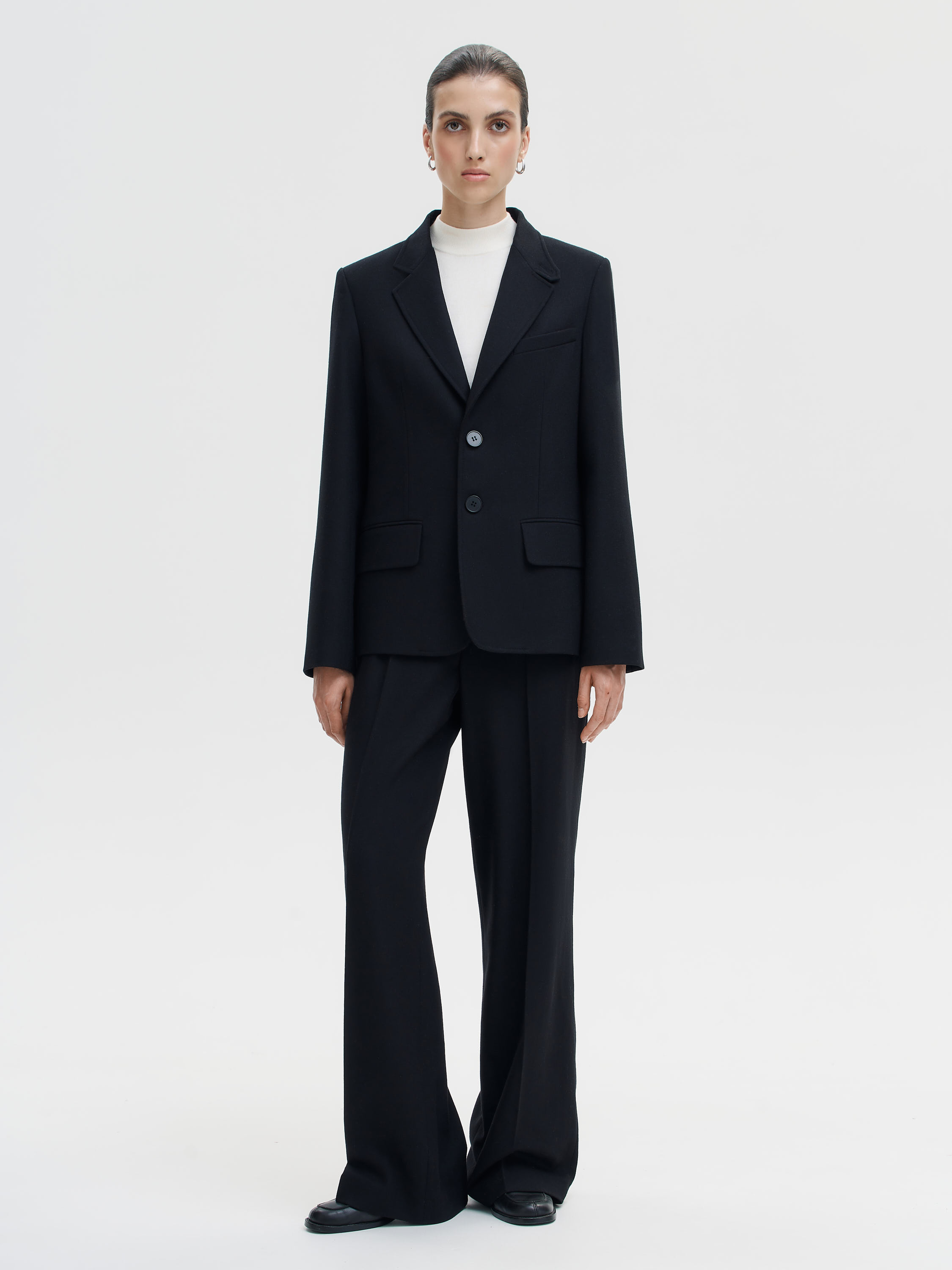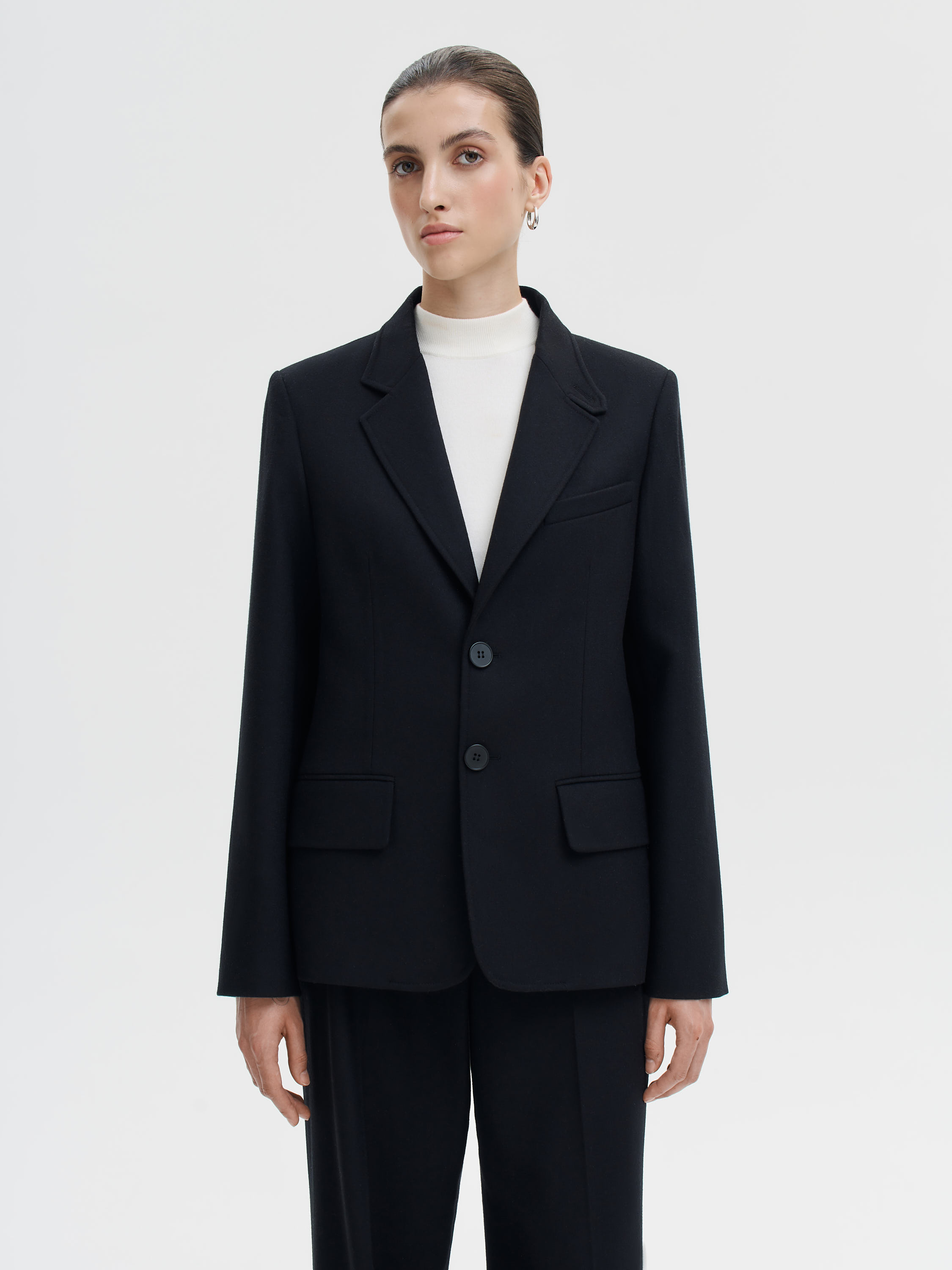 Структурный черный жакет строгого кроя, выполненный из шерстяной ткани с добавлением модала. Материал держит форму, но при этом ощущается мягким и комфортным. Модель с острыми лацканами, прорезным нагрудным карманом и двумя клапанами — лаконичная, но выразительная. Посадка четкая, не перегруженная деталями: жакет работает как самостоятельный акцент в образе, но так же уверенно вписывается в многослойность.