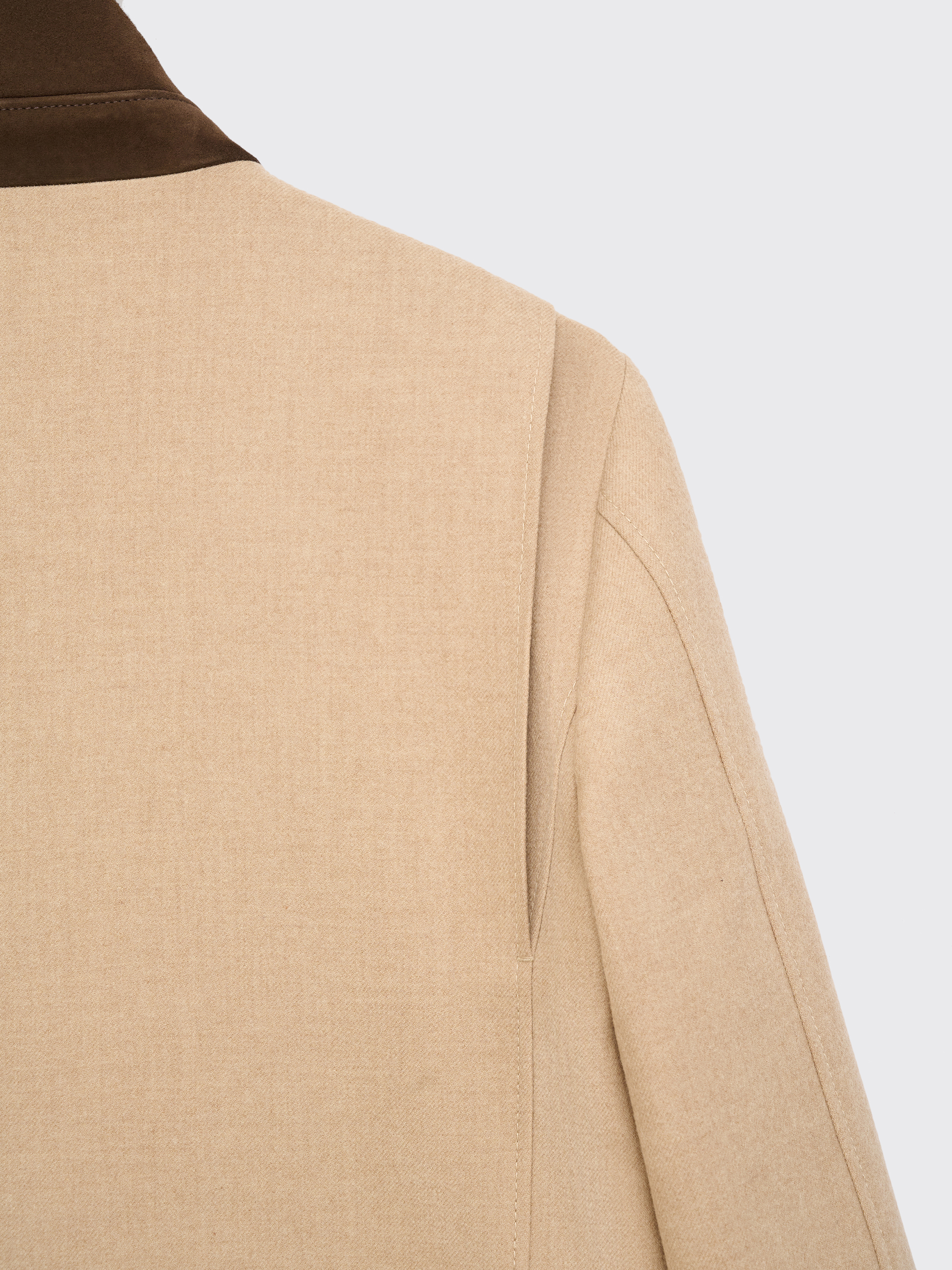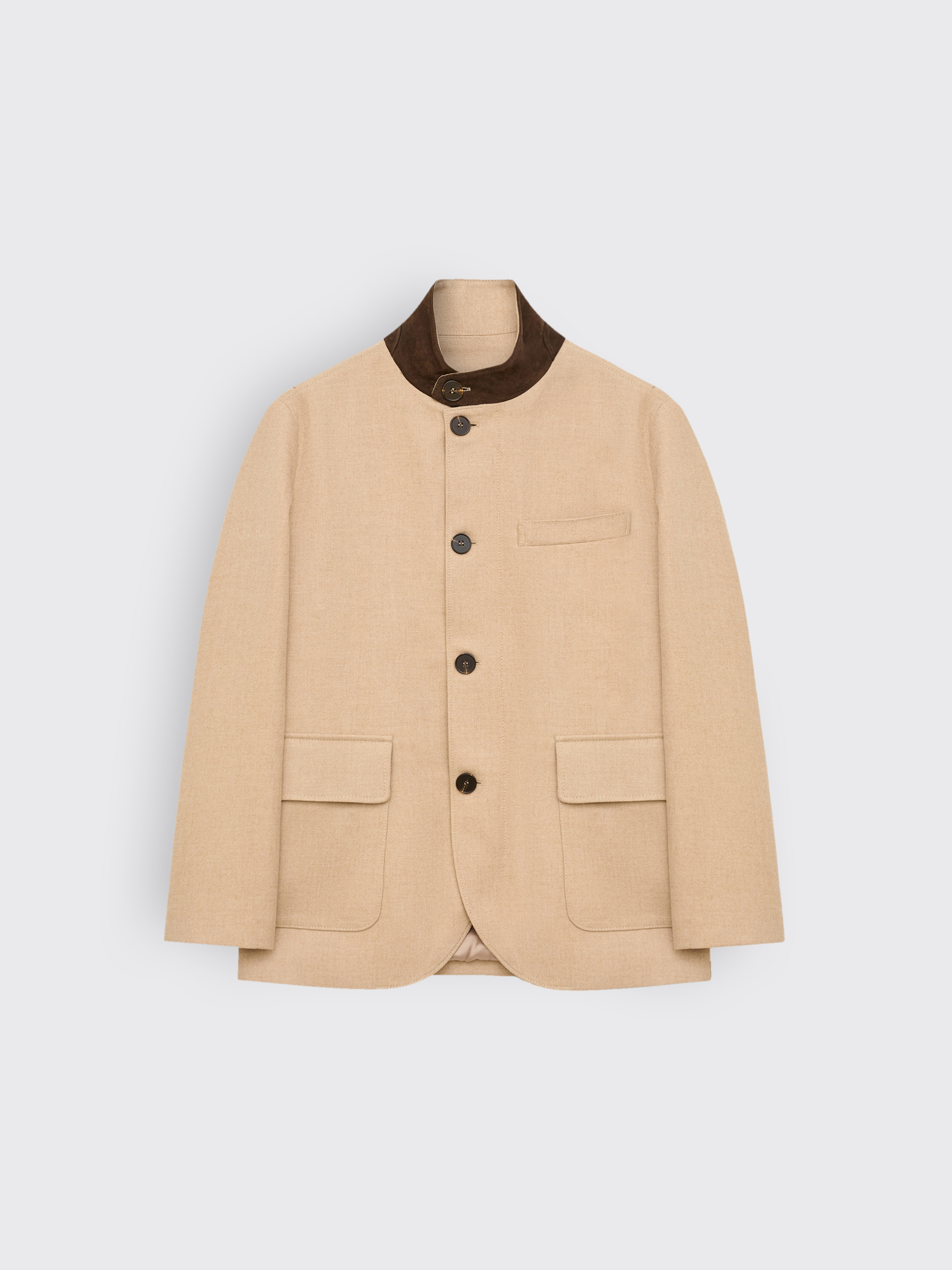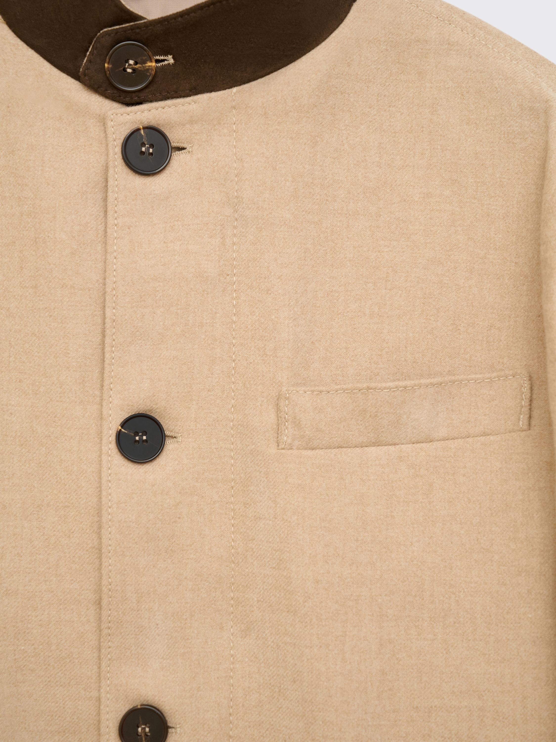 Жакет выполнен из смесового шерстяного полотна с добавлением верблюжьей шерсти и шелка, что придает ткани плотность, ровную текстуру и устойчивость формы при мягком тактильном ощущении. Конструкция собранная, с прямым силуэтом и аккуратной посадкой по плечам. Воротник-стойка с контрастной отделкой формирует четкую линию верха и добавляет графический акцент, застежка на пуговицы поддерживает лаконичную архитектуру модели. Накладные карманы и нагрудный карман выстроены симметрично и сохраняют баланс пропорций. Жакет органично сочетается с прямыми брюками, юбками миди и тонким трикотажем, формируя выверенные образы.