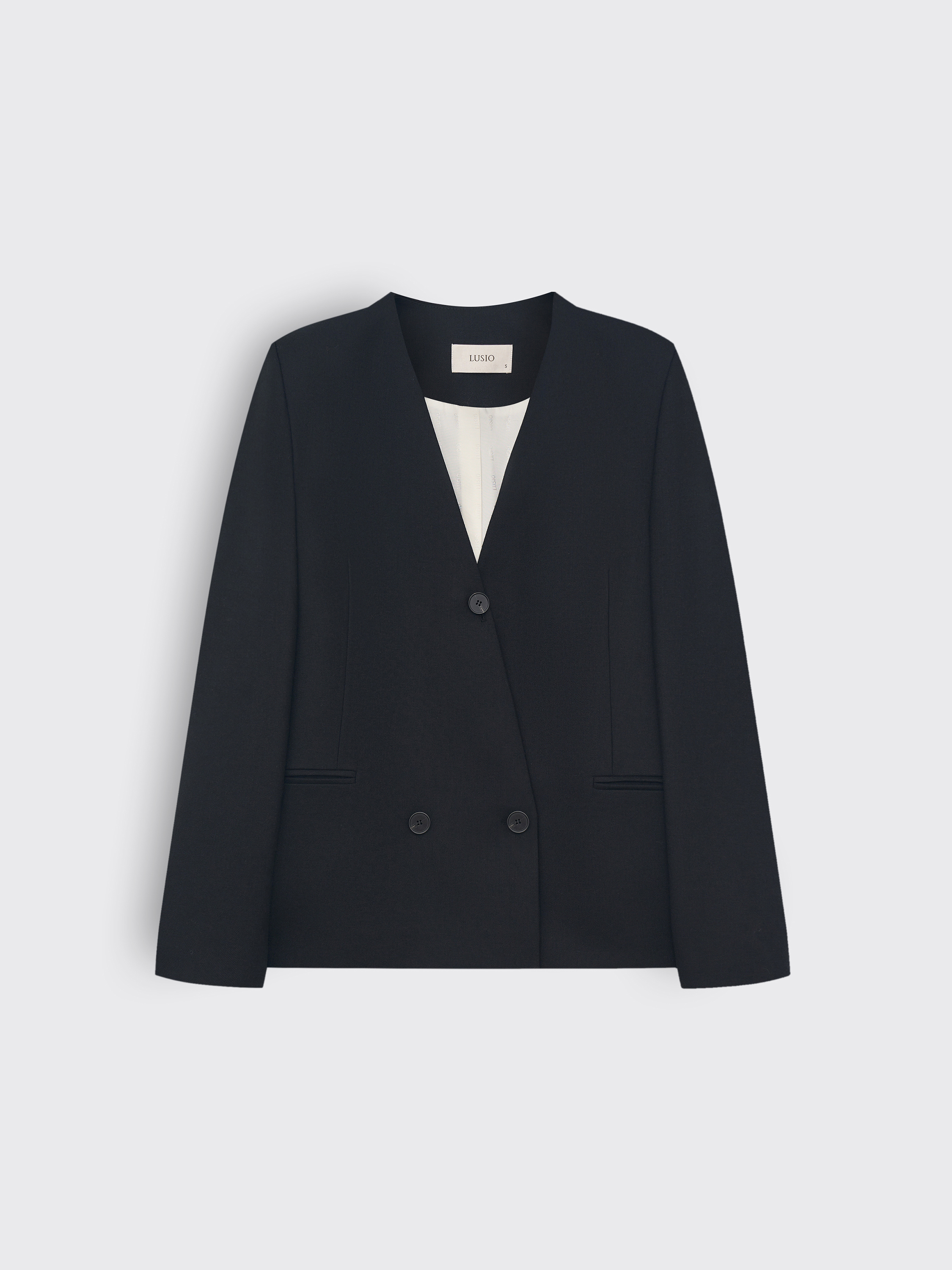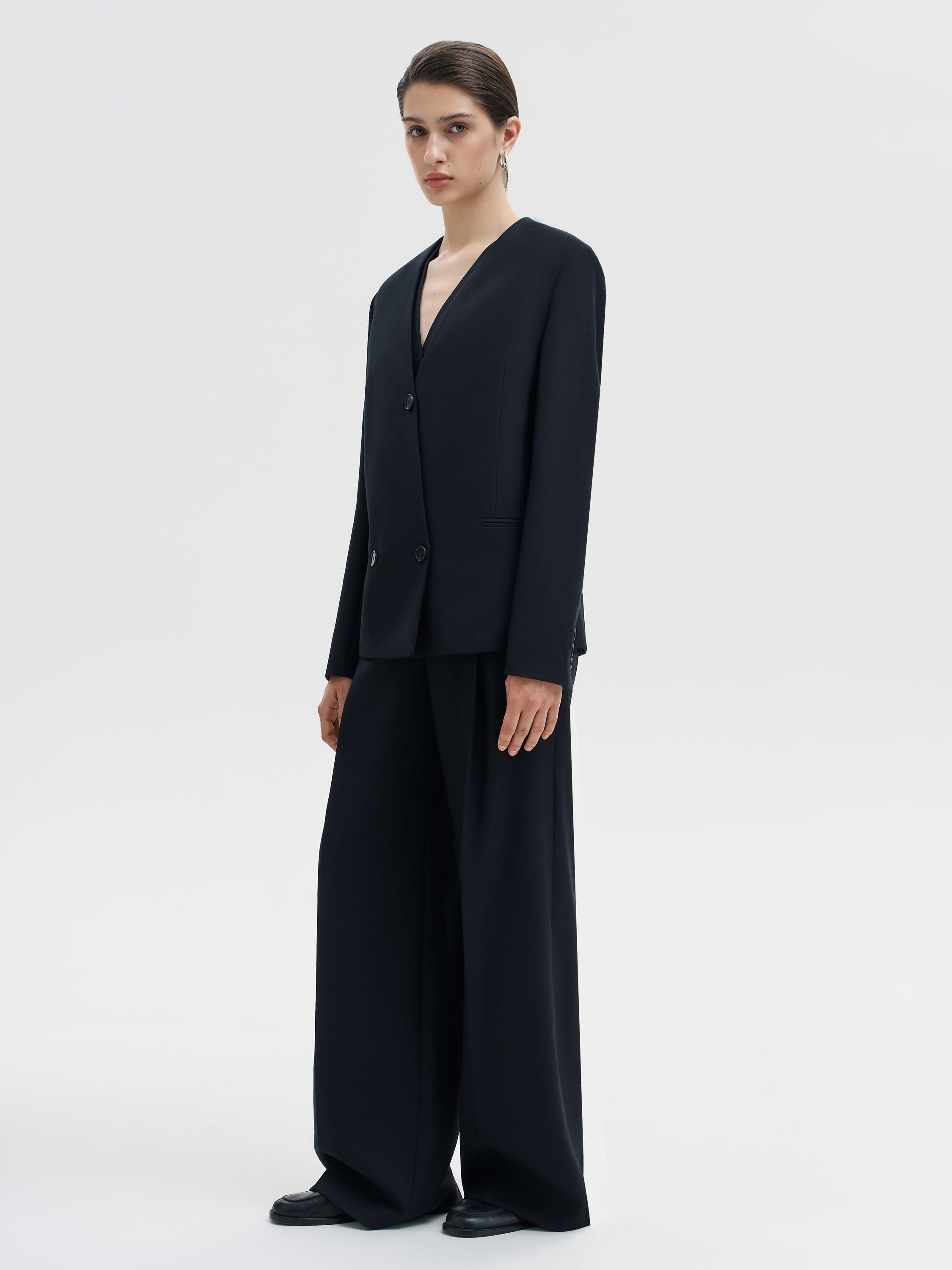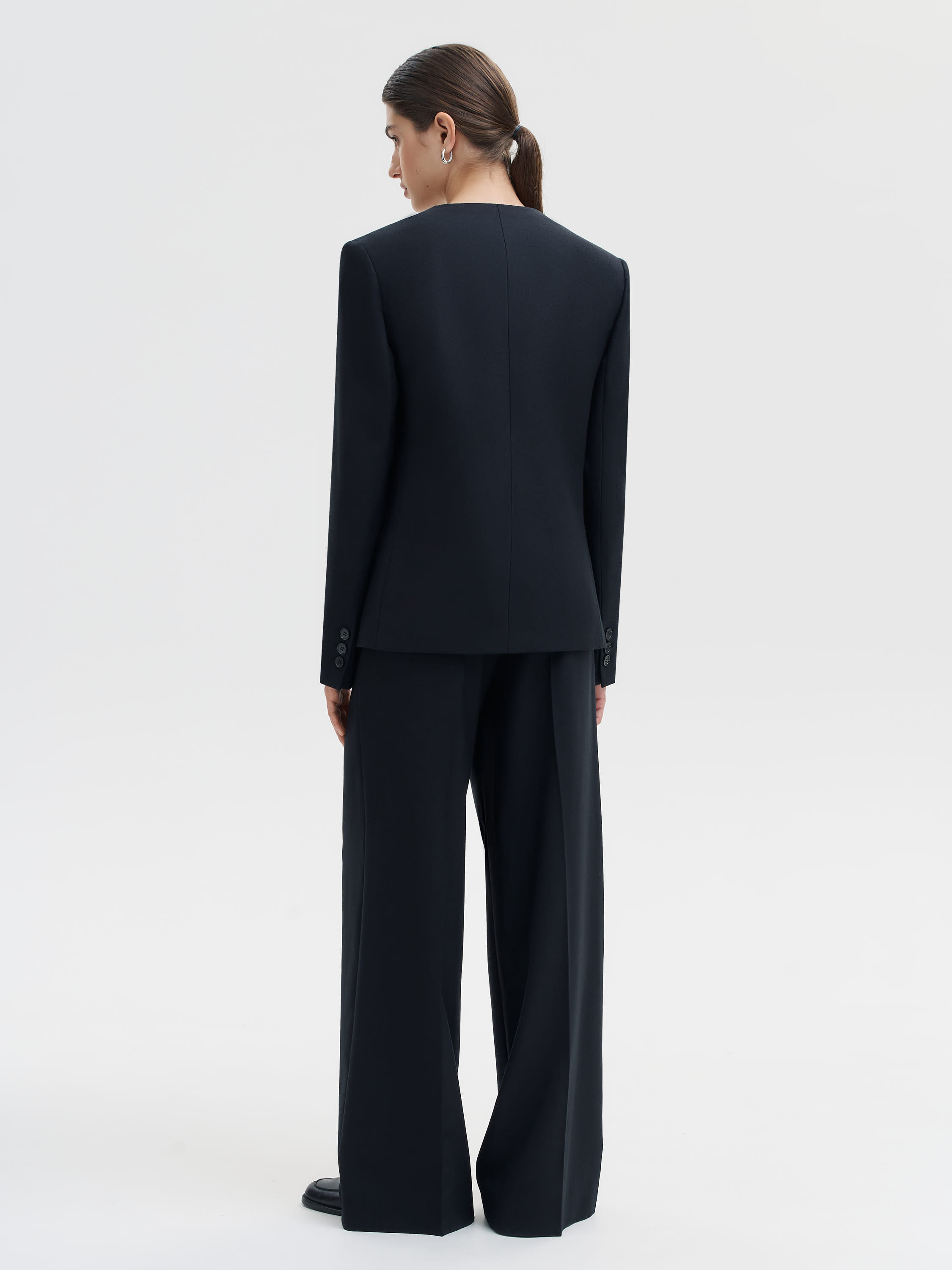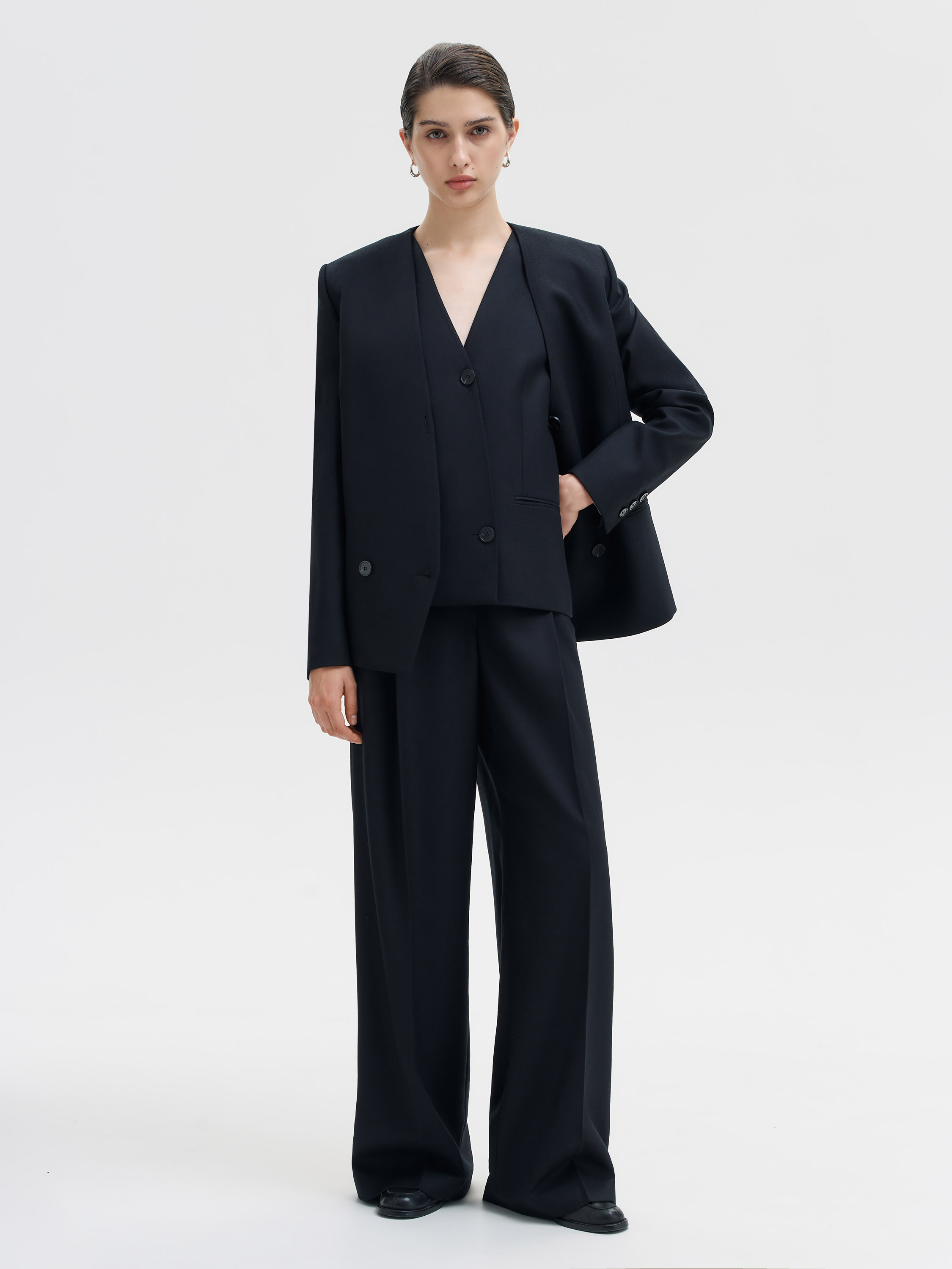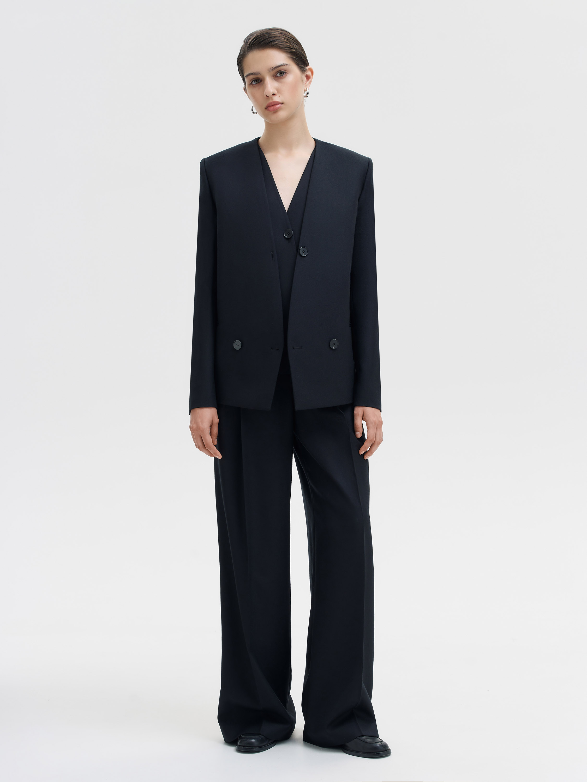 Жакет из чистой шерсти строгого, архитектурного кроя. Минималистичная форма с прямой линией плеч и глубоким V-образным вырезом создает выразительный силуэт без излишней строгости. Плотная костюмная шерсть держит структуру, придавая модели четкость и собранность. Двубортная застежка смещена к центру, что подчеркивает современный характер вещи. Универсальный формат для базового гардероба одинаково уместен в комплекте с брюками, юбкой или джинсами.
