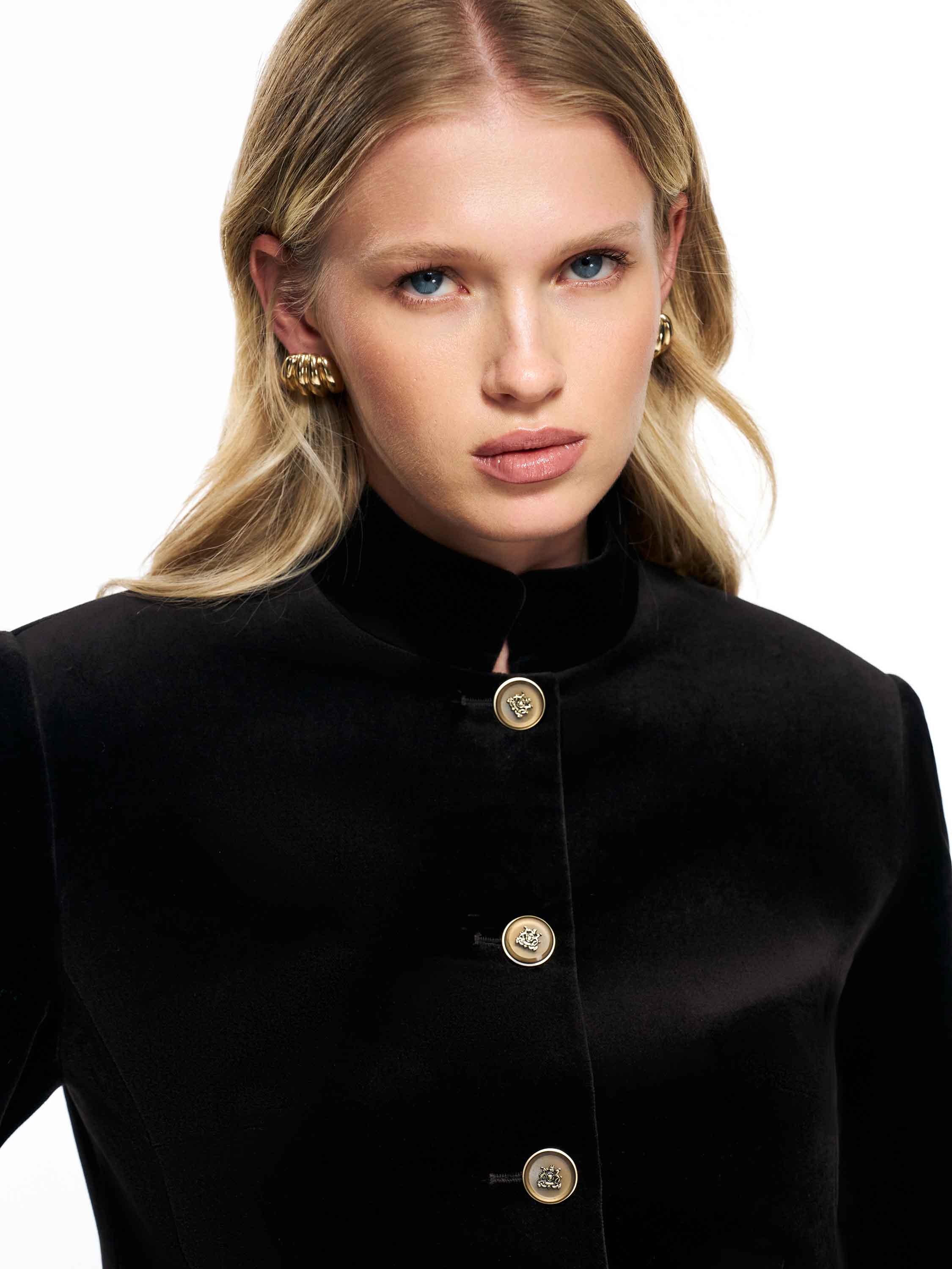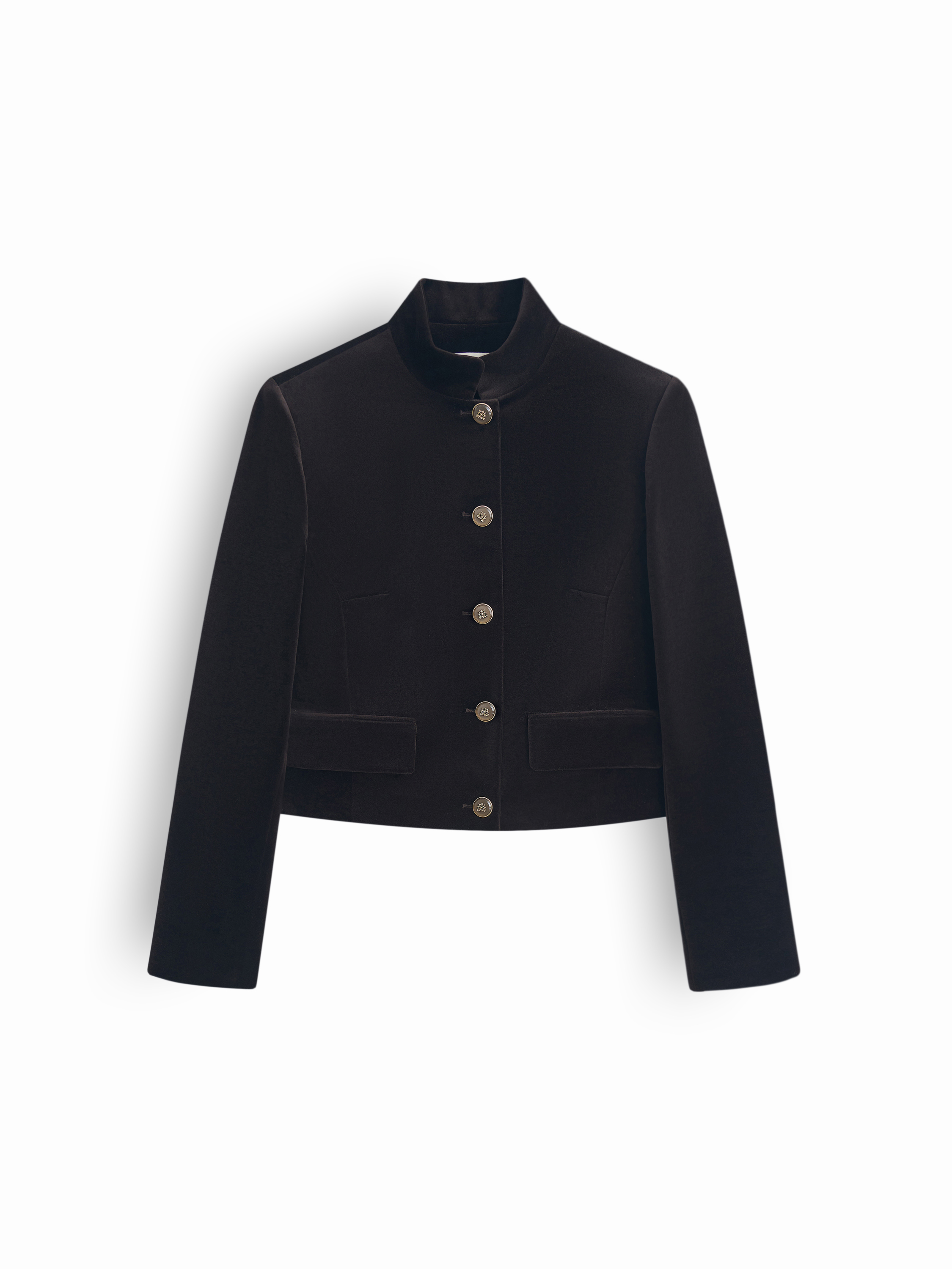 Жакет из хлопкового бархата с мягкой плотностью и деликатным матовым блеском. Материал формирует чистый силуэт, держит линию и при этом остается комфортным в движении. Посадка укороченная, прямая, с аккуратной посадкой по плечам. Воротник-стойка создает современный, собранный контур и подчеркивает вертикаль изделия. Застежка на ряд декоративных пуговиц добавляет графичности, а прорезные карманы с клапанами поддерживают архитектуру кроя. Модель работает как акцентный элемент в комплекте с юбками, брюками и платьями, подходит для вечерних и дневных образов.