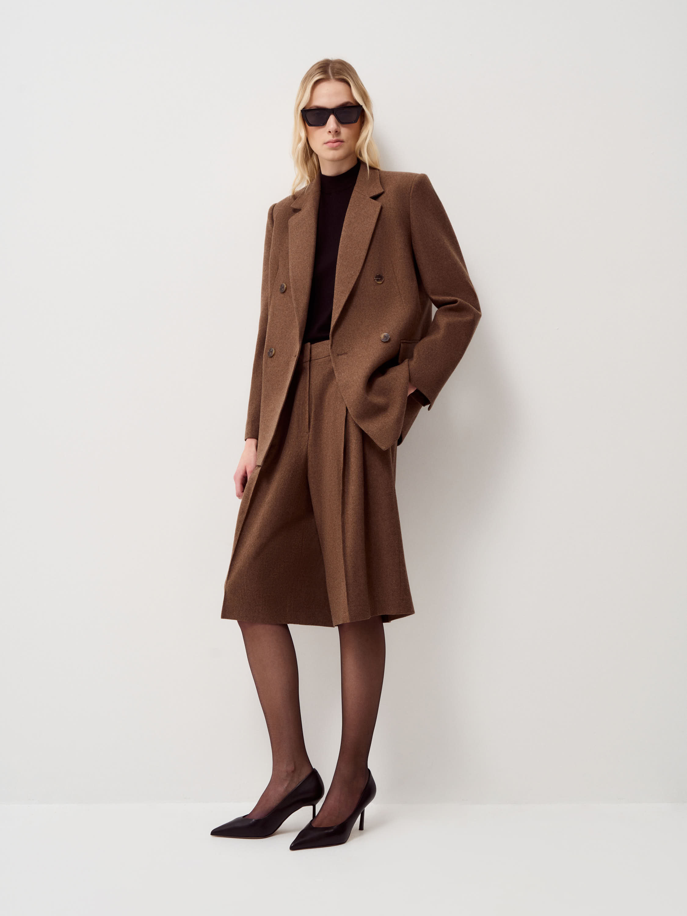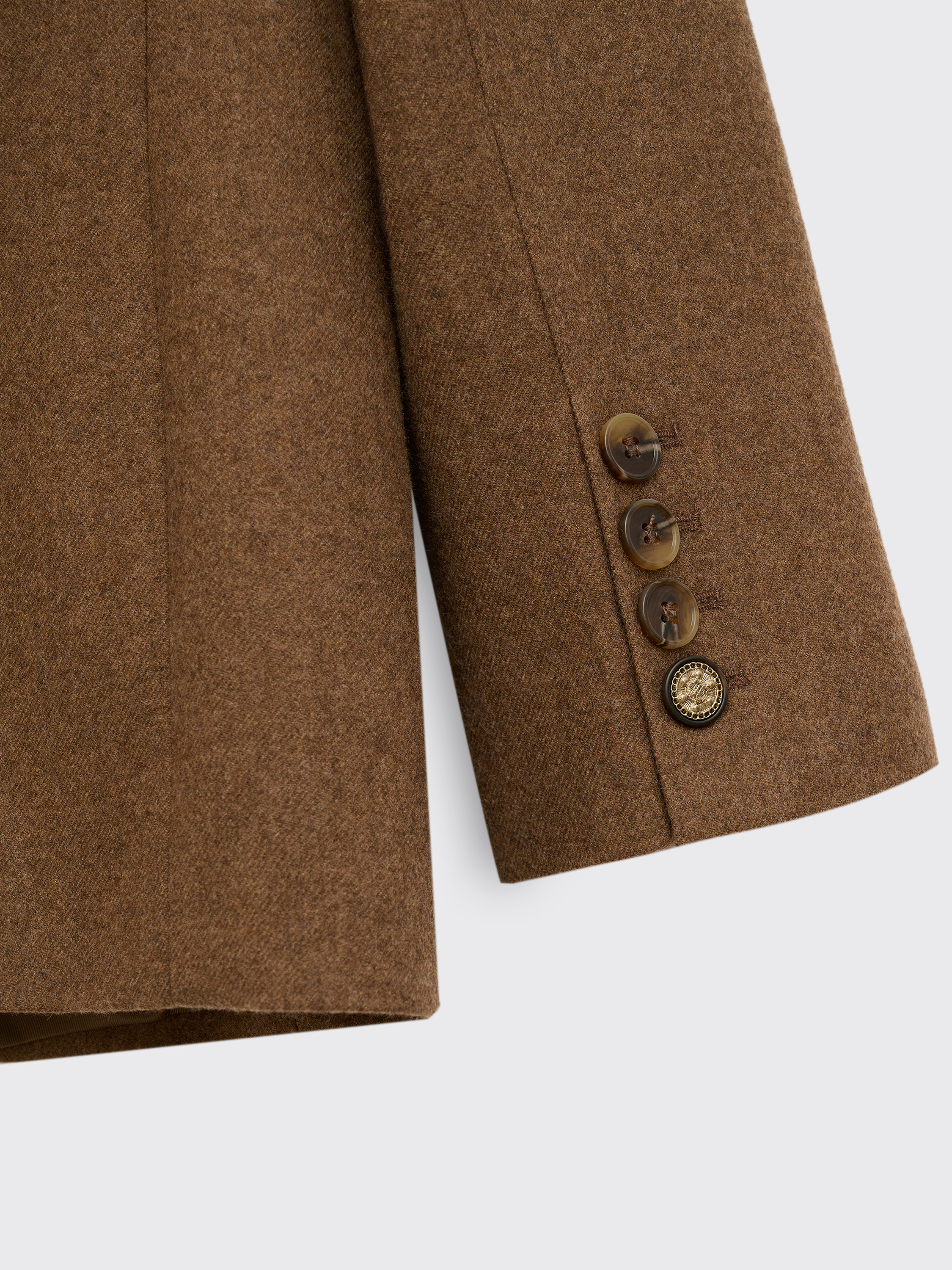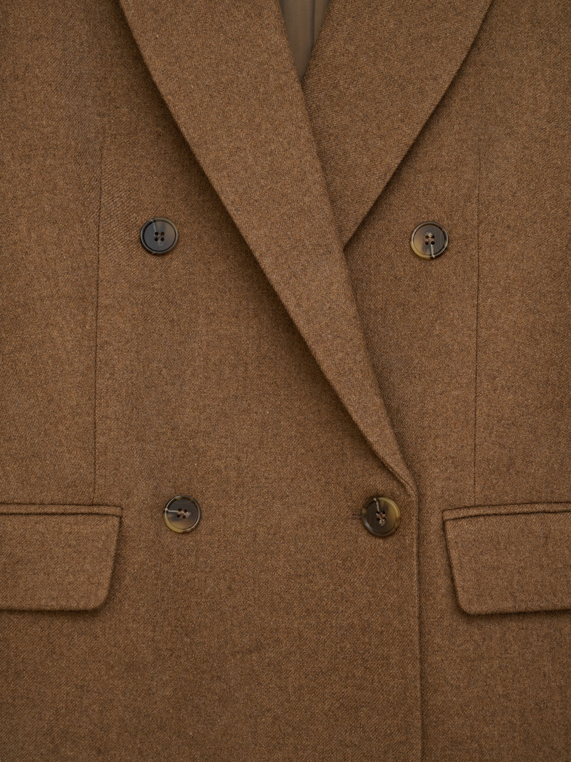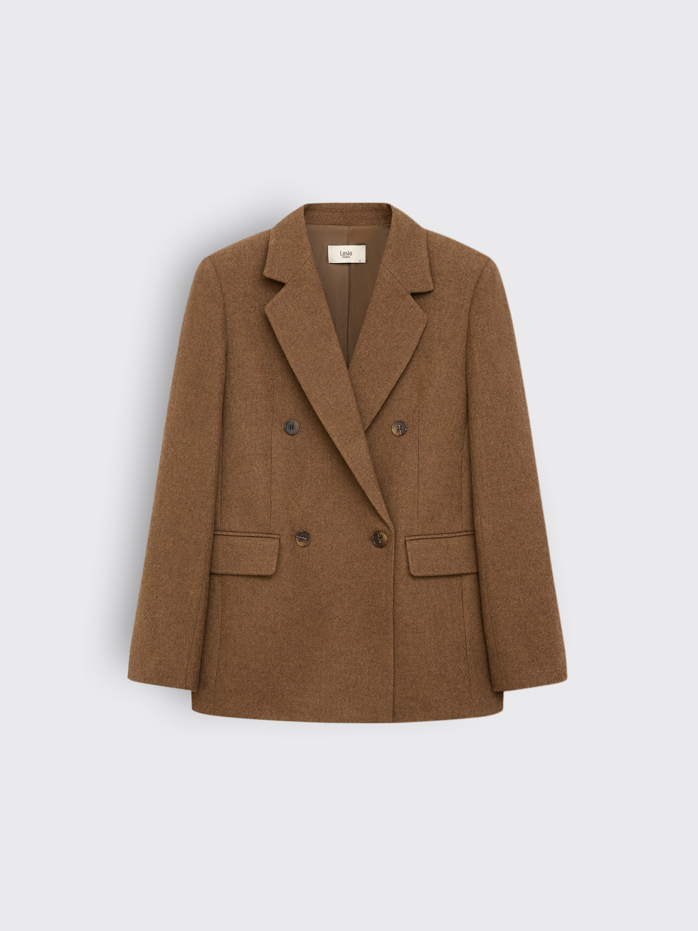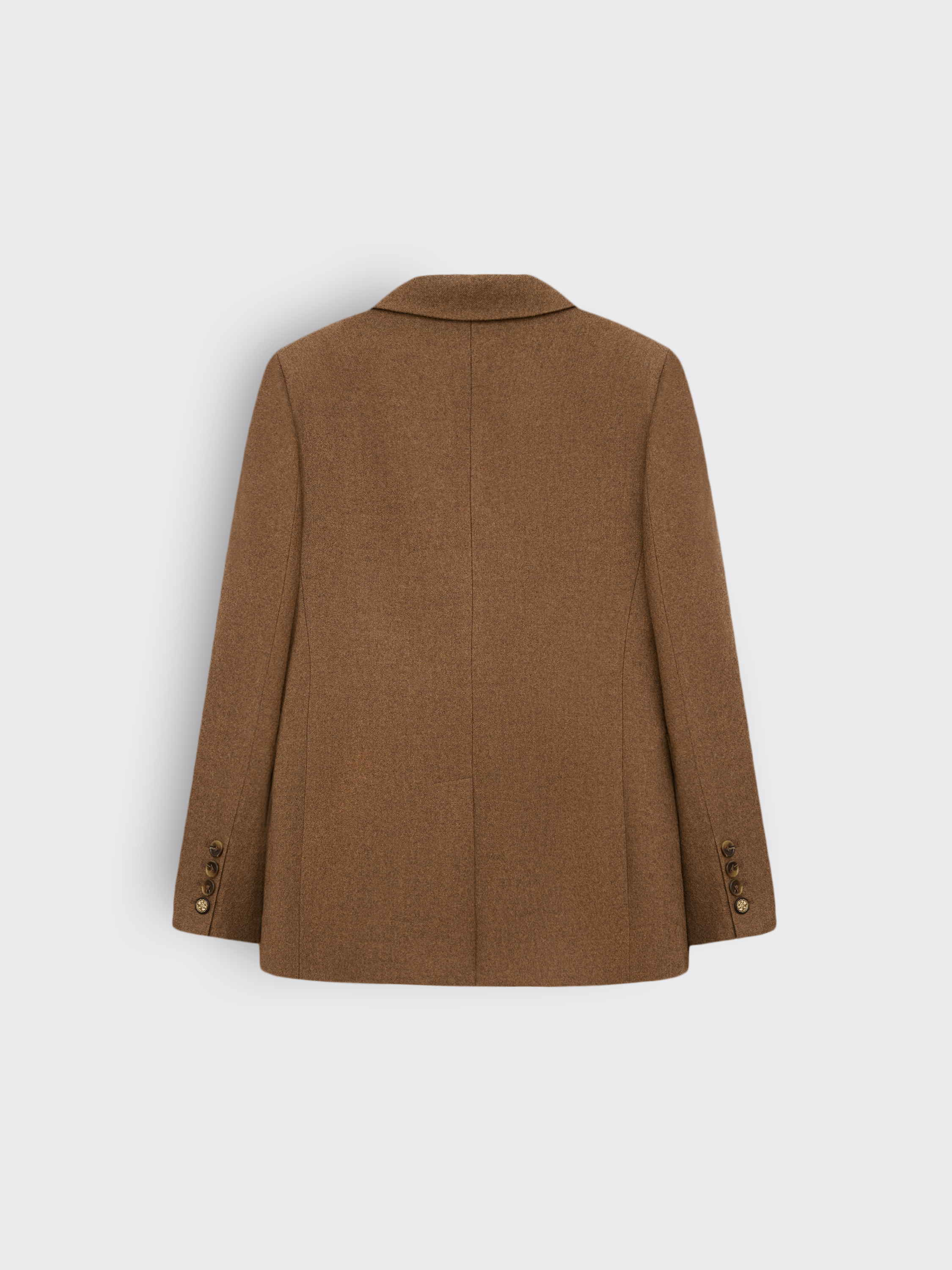 Жакет выполнен из смесового шерстяного полотна с добавлением верблюжьей шерсти и шелка, что придает ткани плотность, устойчивость формы и мягкую, ровную фактуру. Силуэт прямой, двубортный, с четко выстроенной линией плеч и аккуратно оформленными лацканами. Застежка на пуговицы и прорезные карманы с клапанами поддерживают классическую архитектуру модели без утяжеления. Жакет хорошо сочетается с прямыми брюками, юбками миди и лаконичным трикотажем, формируя собранные и выверенные комплекты.