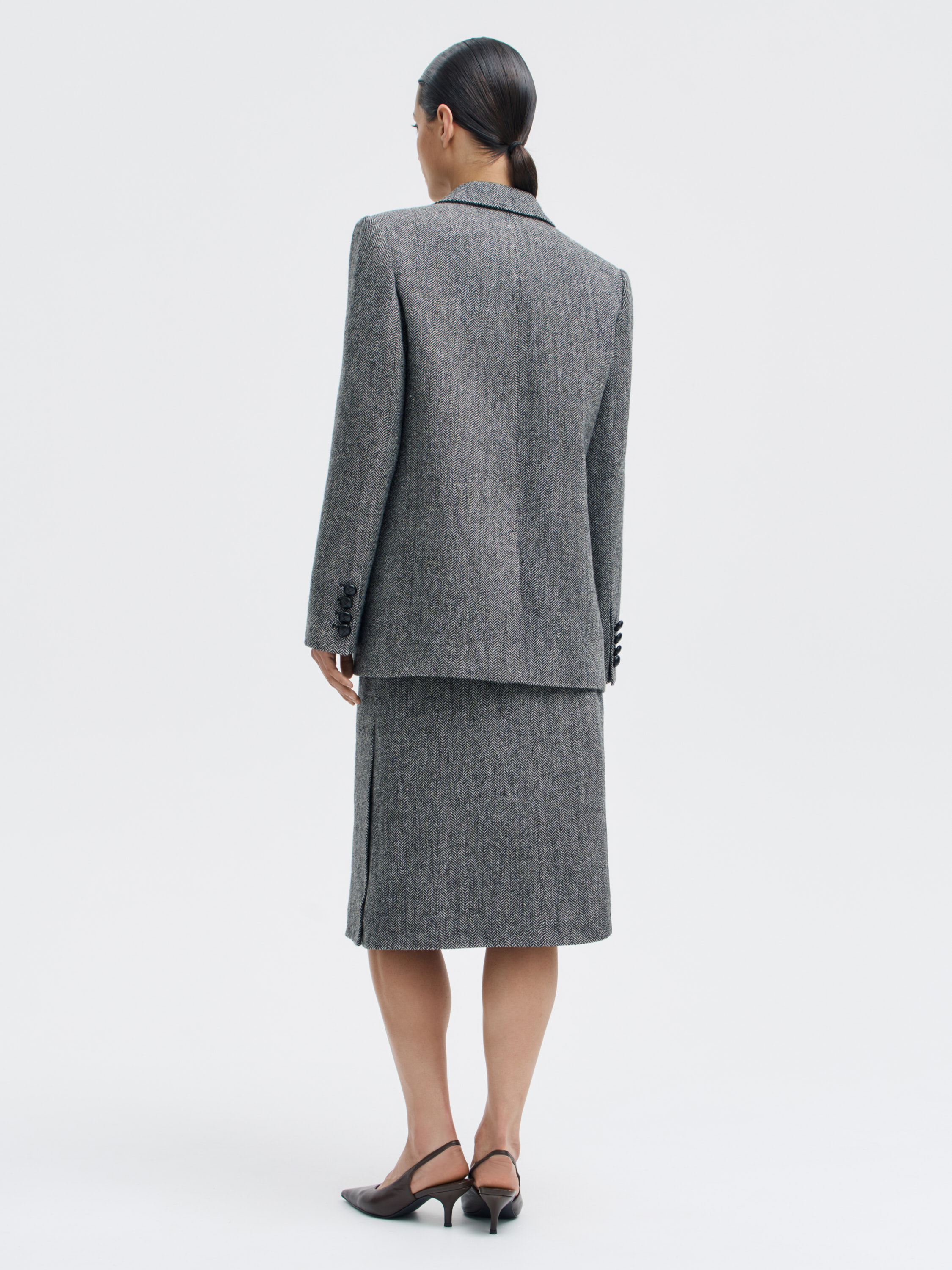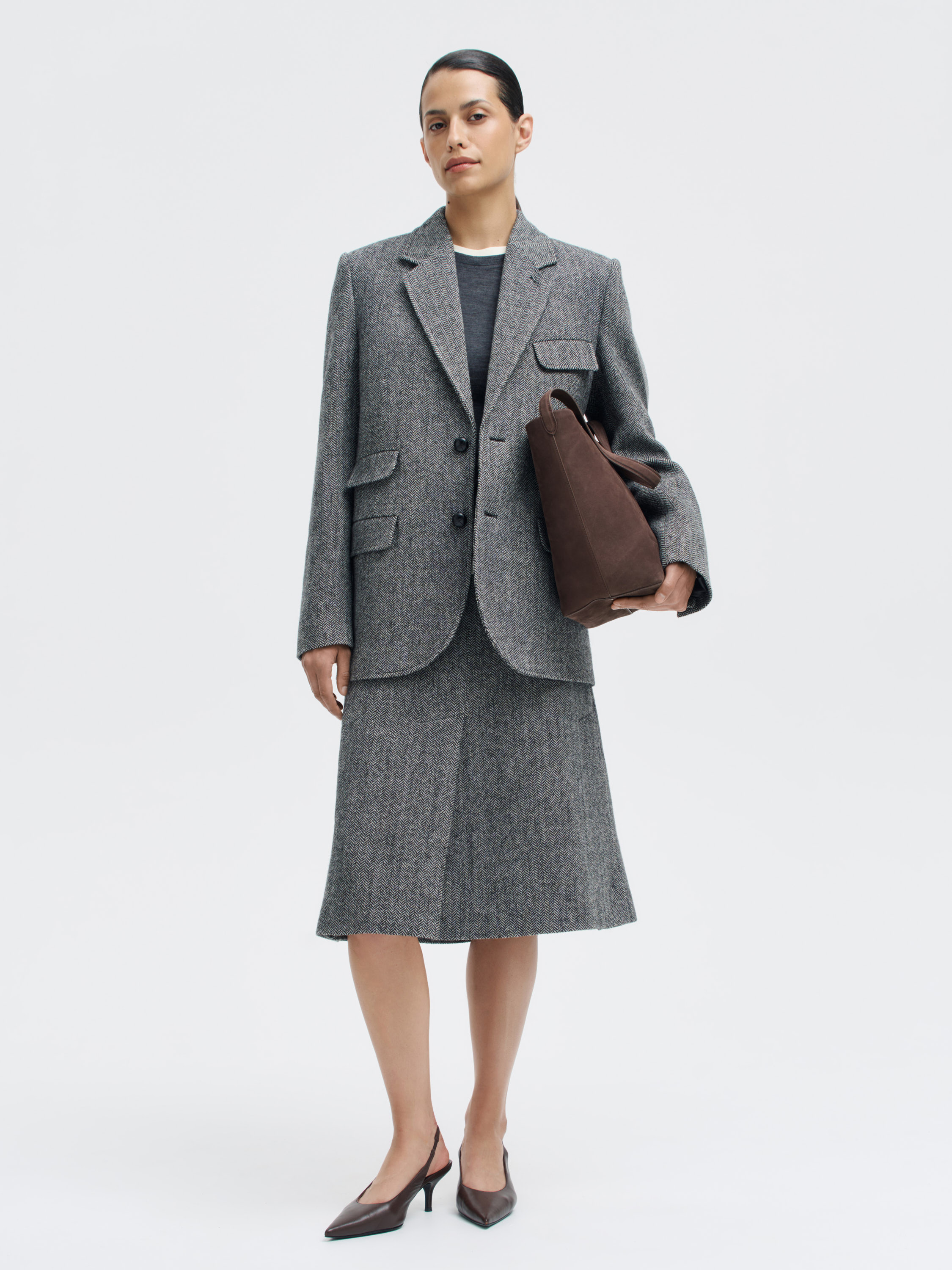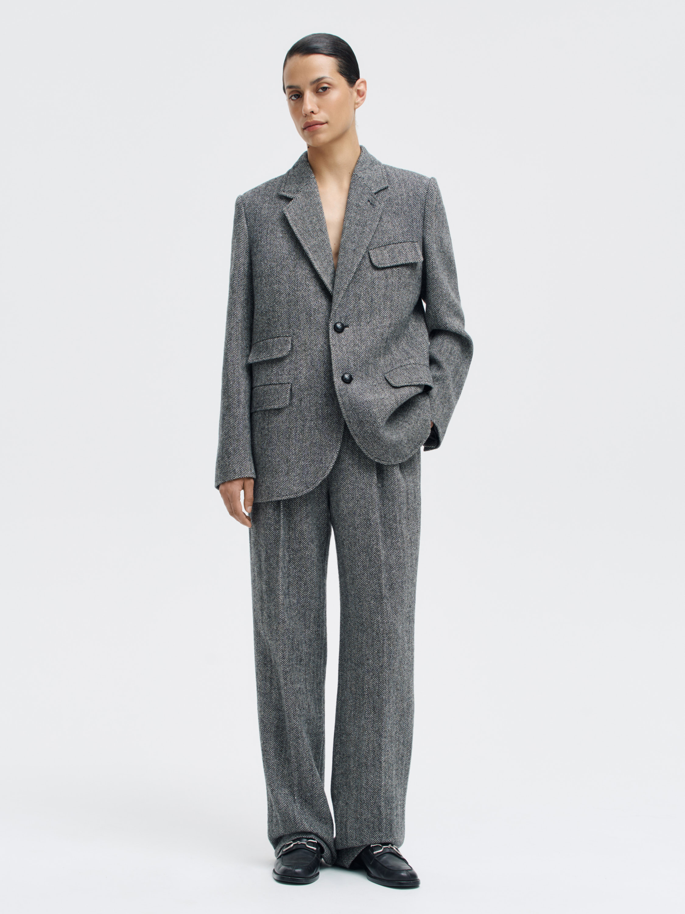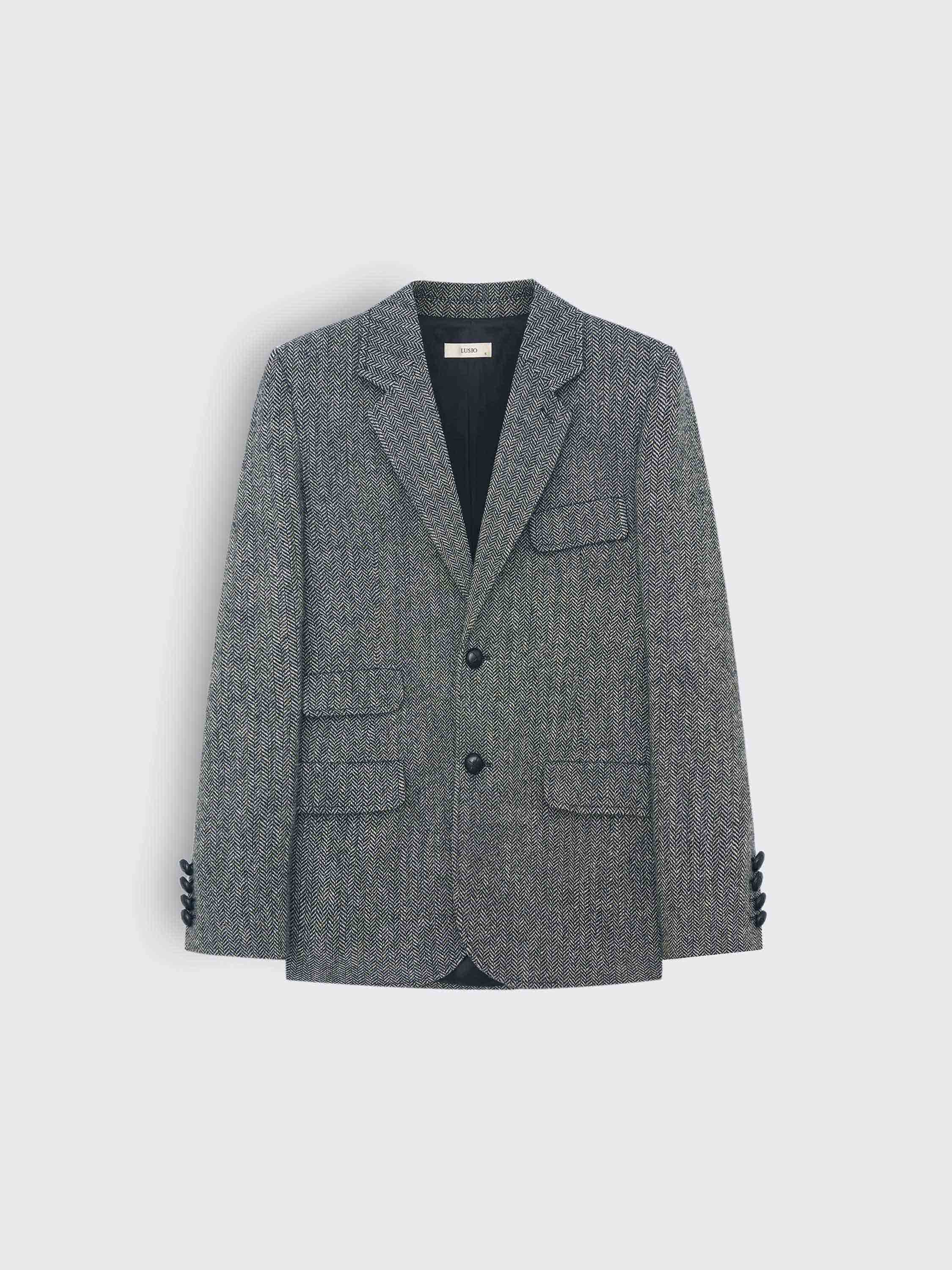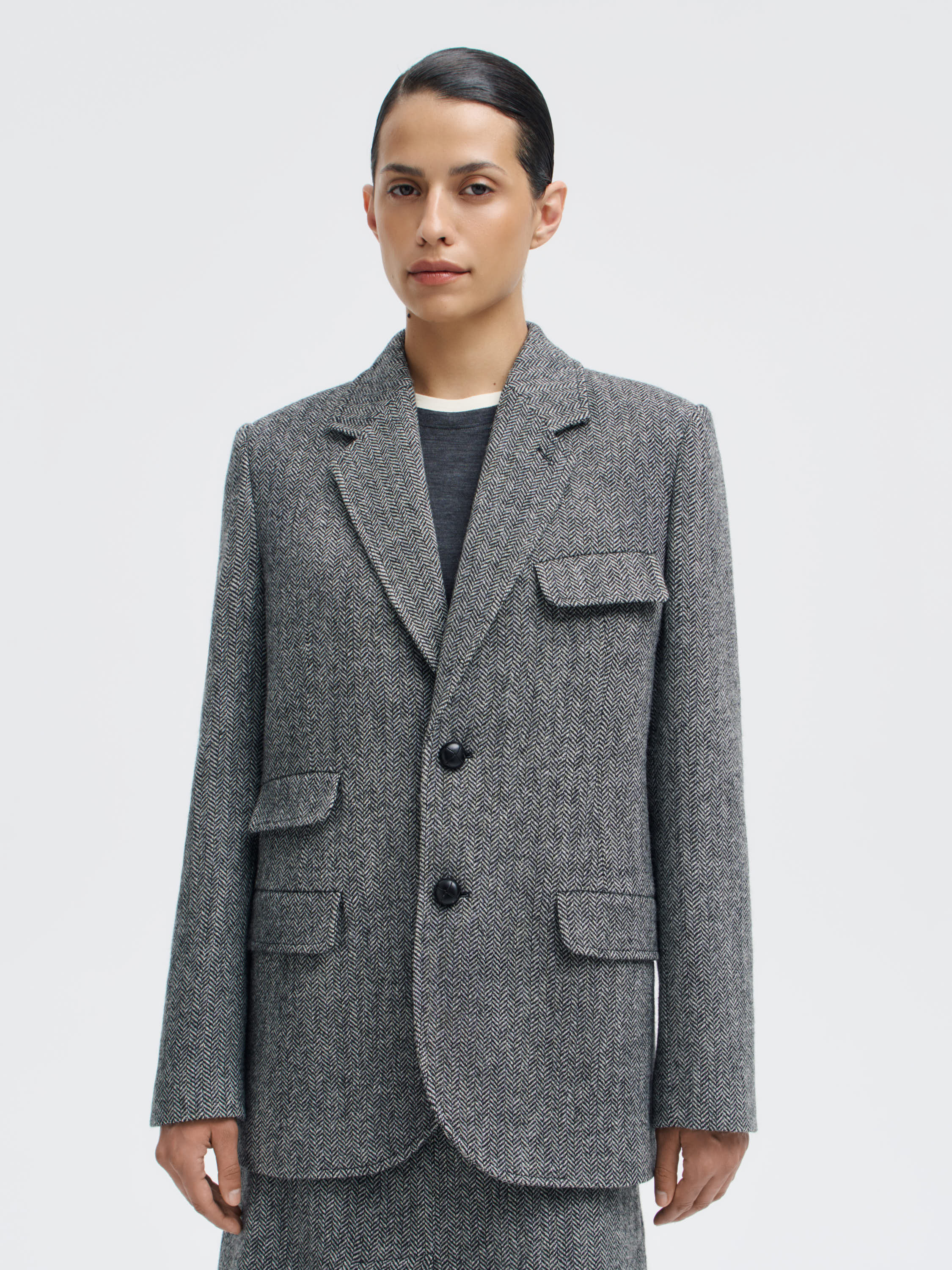 Структурированный жакет прямого кроя, сшитый из шерсти с выразительным плетением «елочка». Фактура ткани считывается вблизи и на расстоянии, создавая глубину и сдержанную динамику. Классический воротник, планка на двух пуговицах, объемные клапаны карманов и умеренно широкие плечи отсылают к эстетике мужского пиджака, но остаются в рамках женственного образа. Жакет держит форму и подходит для создания сбалансированных силуэтов в сочетании с юбкой, брюками или денимом.