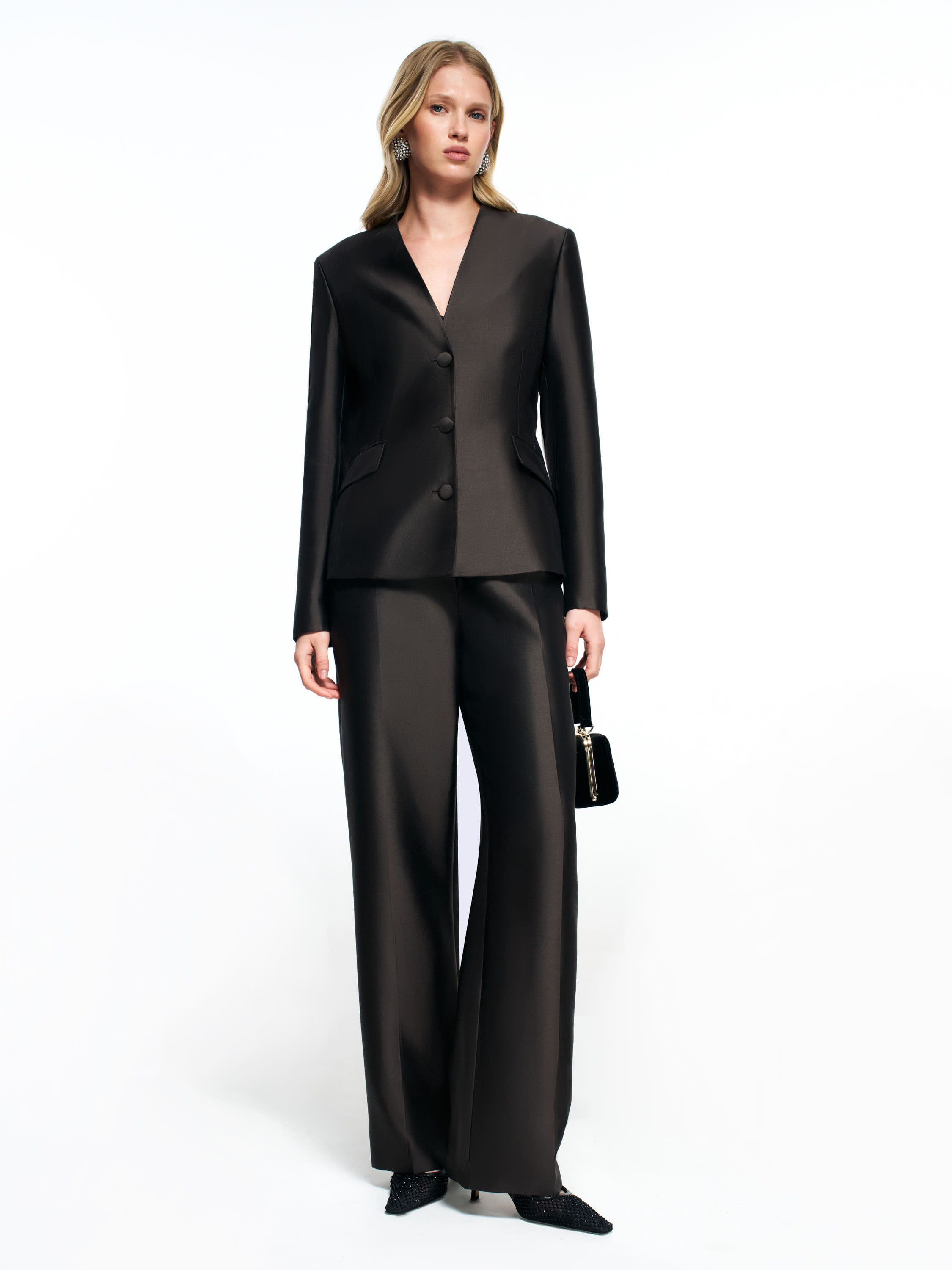 Жакет из костюмной ткани на основе шерсти и шелка создан в чистой, графичной конструкции. Полотно плотное, гладкое, с легким сатиновым блеском, держит форму и подчеркивает архитектуру линии плеч. Посадка прямая, со слегка удлиненной полкой и аккуратной посадкой в груди. V-образный вырез без лацканов формирует строгий контур, не перегружая силуэт. Застежка оформлена крупными обтянутыми пуговицами, поддерживающими целостность дизайна. Карманы с клапанами расположены низко, создают корректный баланс пропорций.