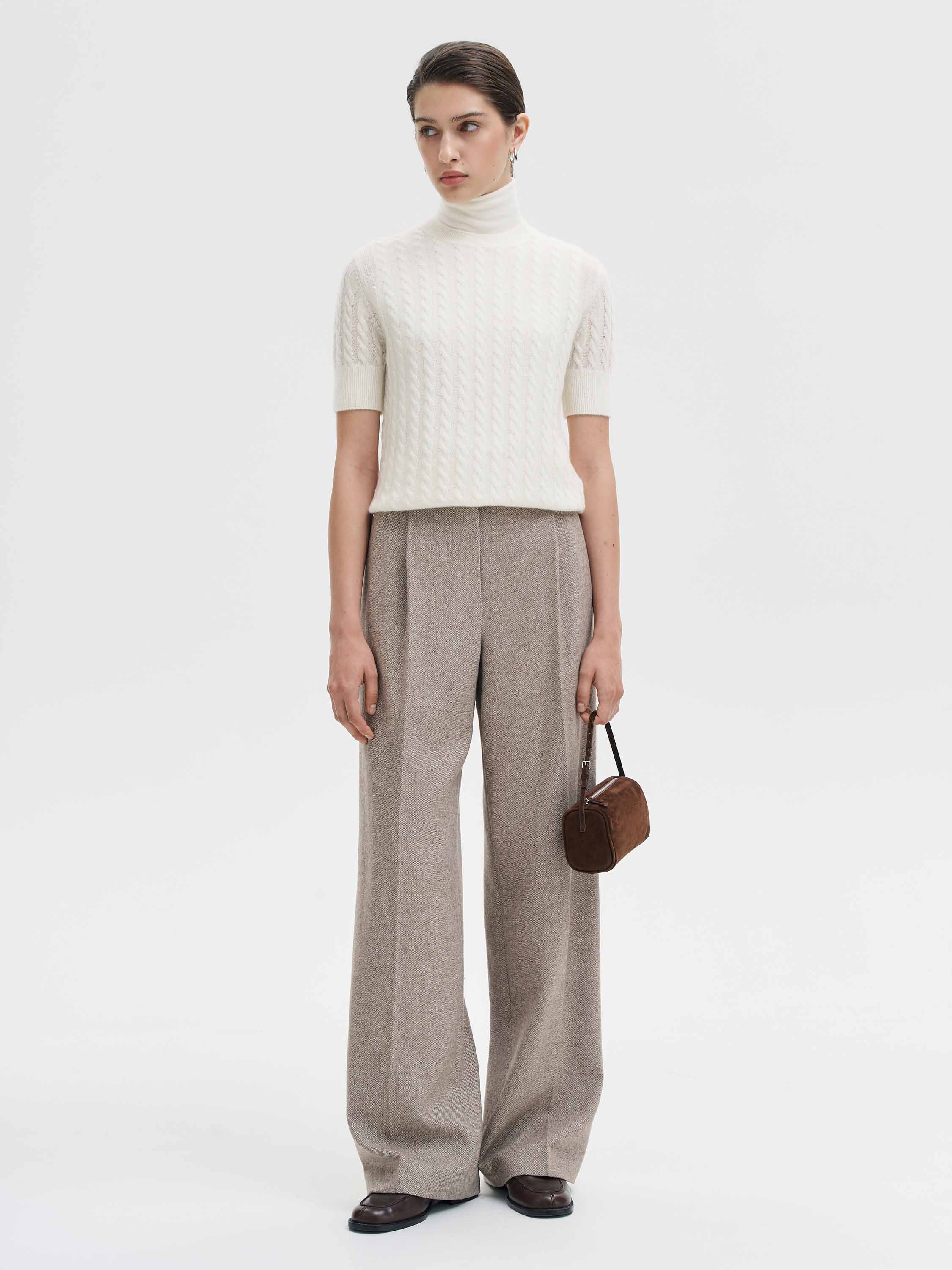 Брюки прямого кроя из смесовой ткани с шерстью. Полотно с мягкой, тактильно приятной поверхностью дышит, сохраняет тепло и устойчиво к износу. Высокая посадка оформлена поясом со шлевками, мягкие складки спереди добавляют объема, а четкие стрелки формируют чистую вертикаль силуэта. Брючины удлиненные, свободные, красиво драпируются при движении. Благодаря сдержанному оттенку и универсальному крою модель легко интегрируется как в деловой, так и в повседневный гардероб.