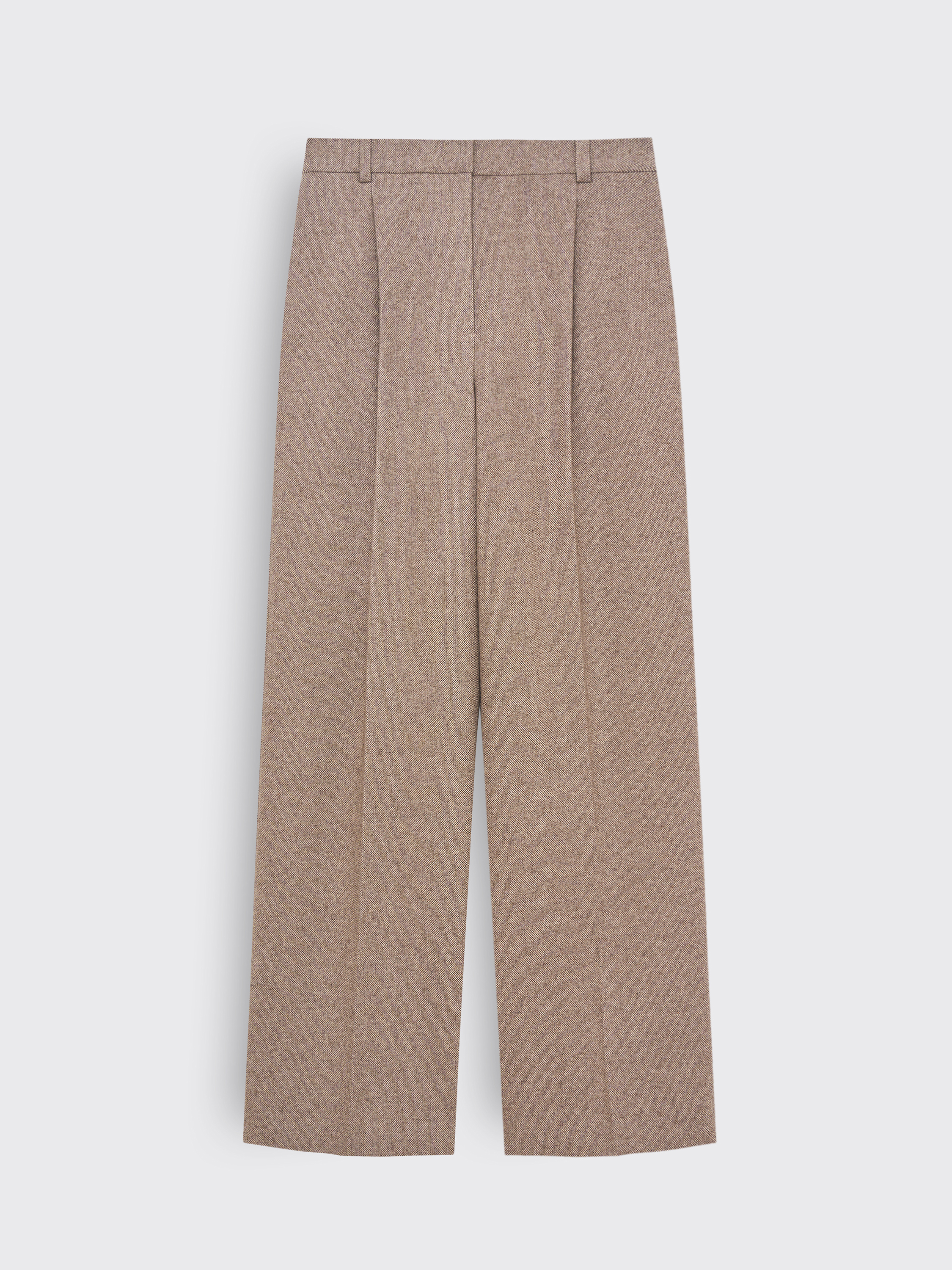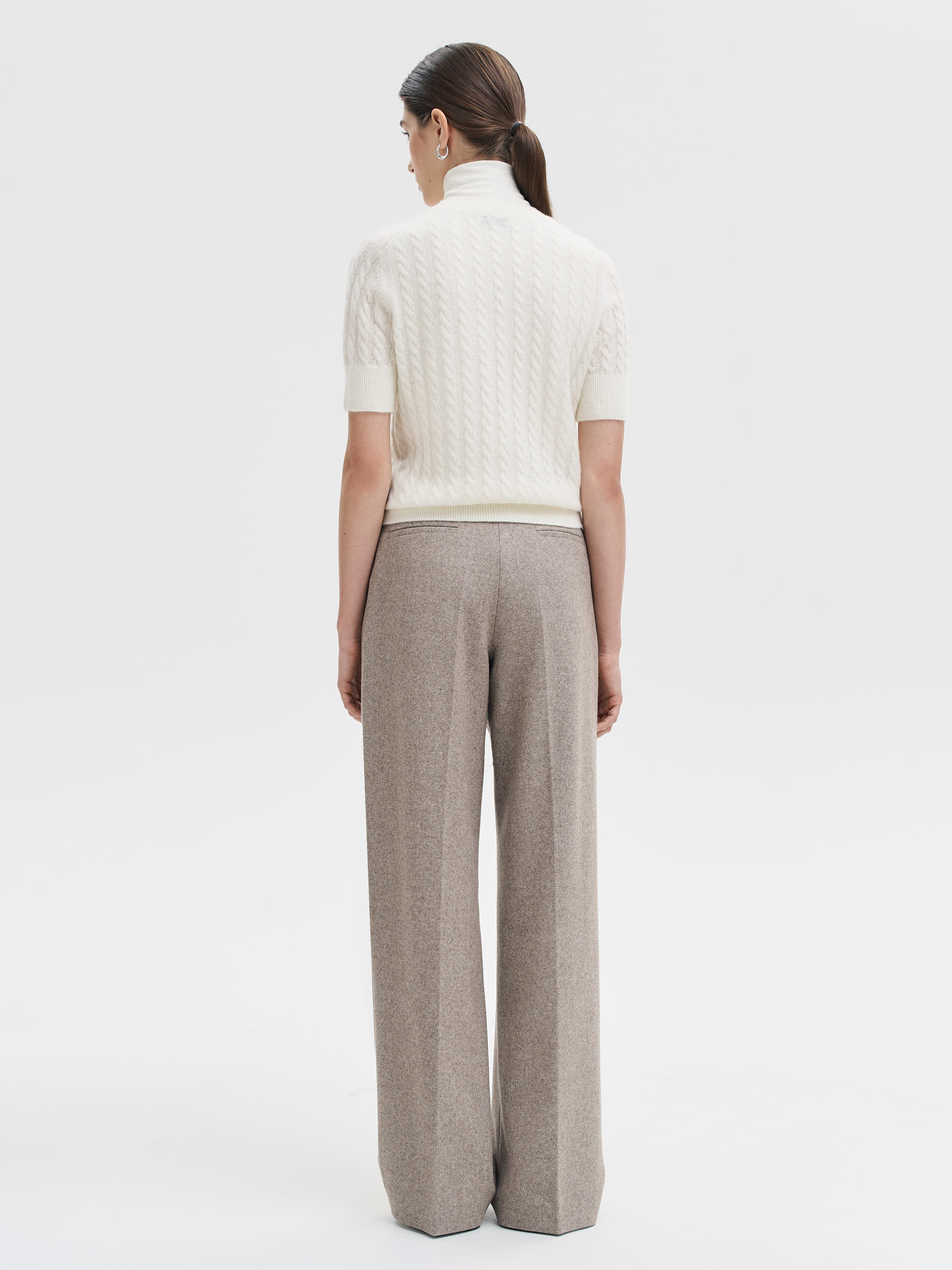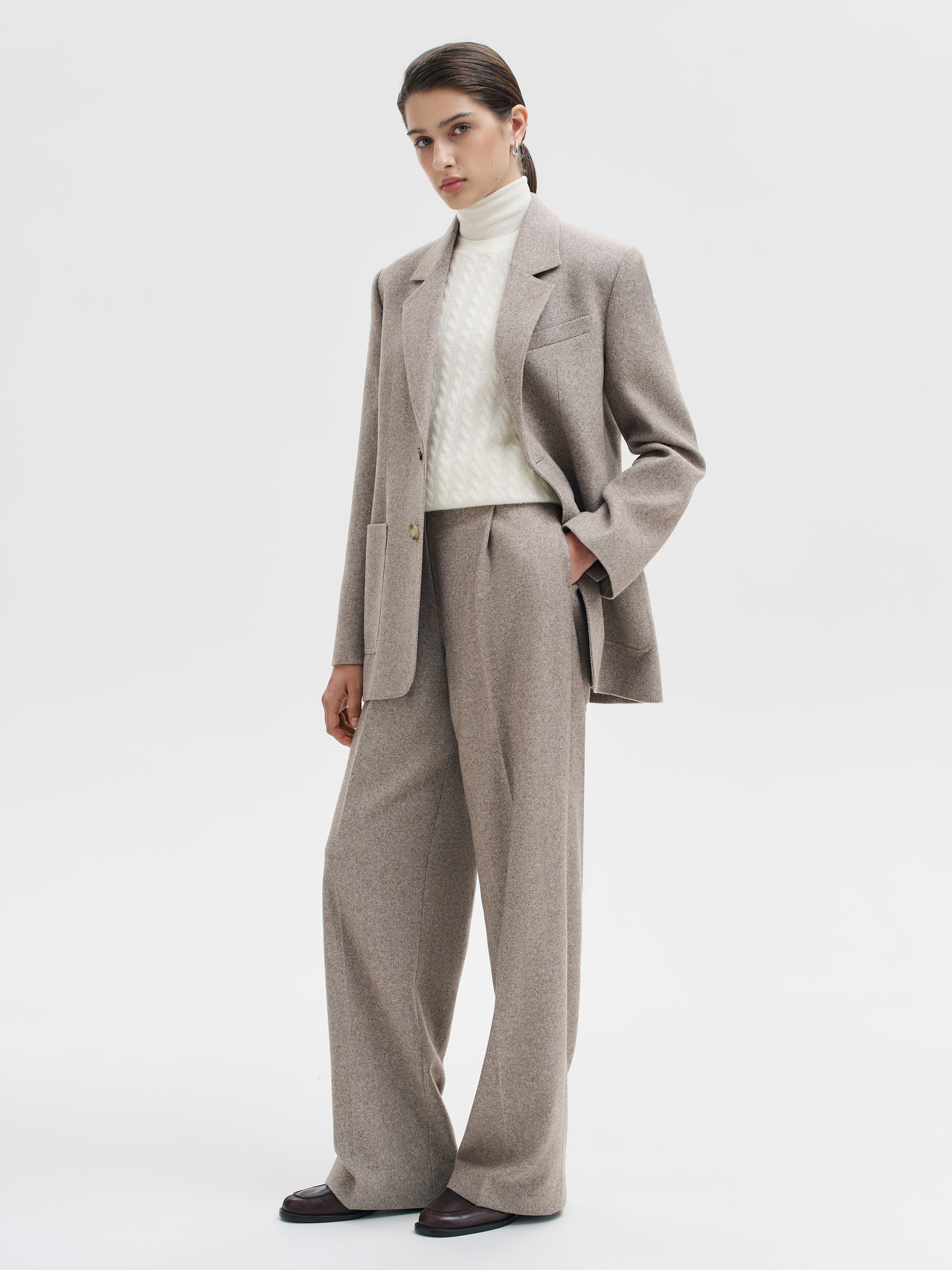 Брюки прямого кроя из смесовой ткани с шерстью. Полотно с мягкой, тактильно приятной поверхностью дышит, сохраняет тепло и устойчиво к износу. Высокая посадка оформлена поясом со шлевками, мягкие складки спереди добавляют объема, а четкие стрелки формируют чистую вертикаль силуэта. Брючины удлиненные, свободные, красиво драпируются при движении. Благодаря сдержанному оттенку и универсальному крою модель легко интегрируется как в деловой, так и в повседневный гардероб.