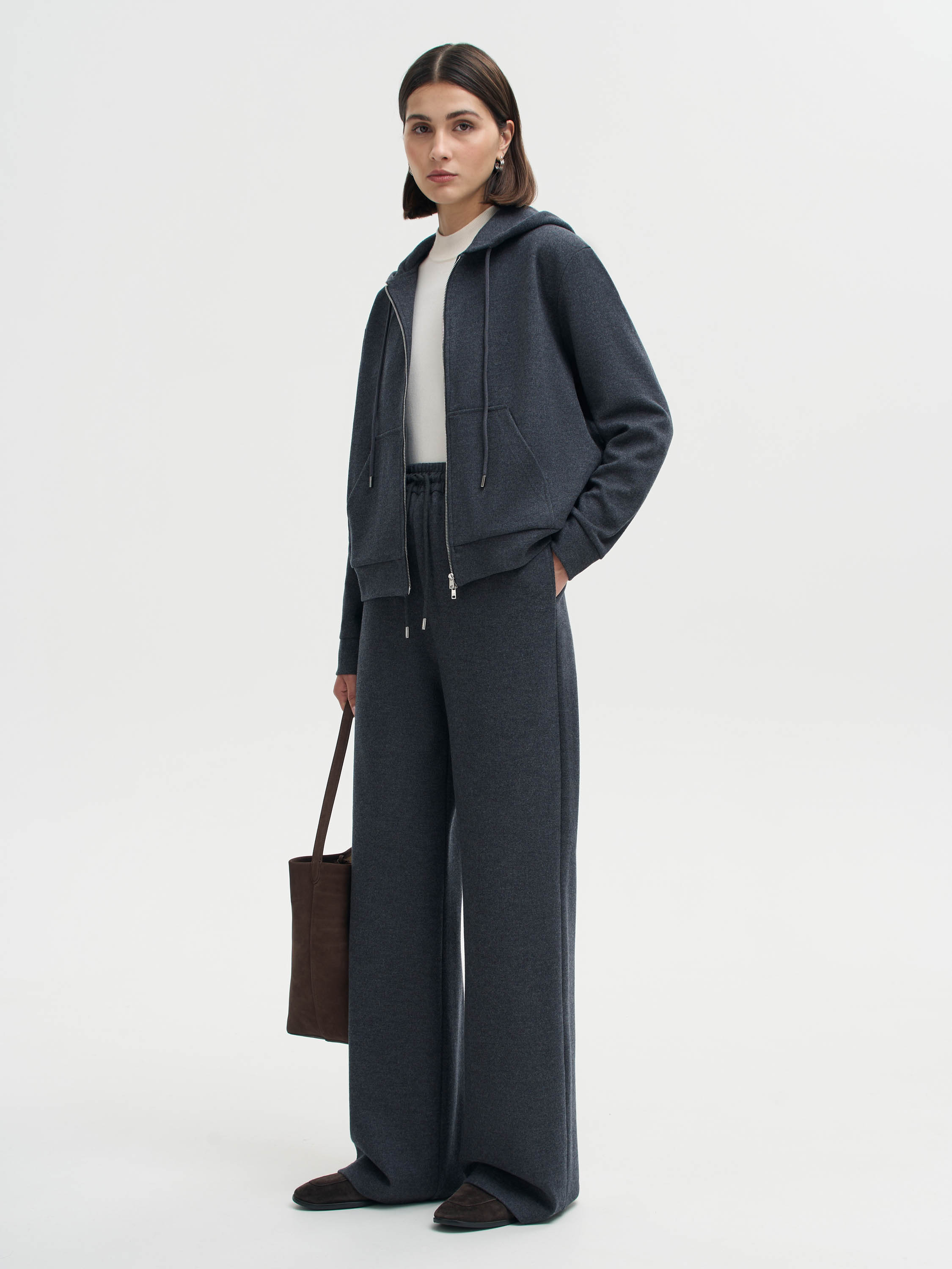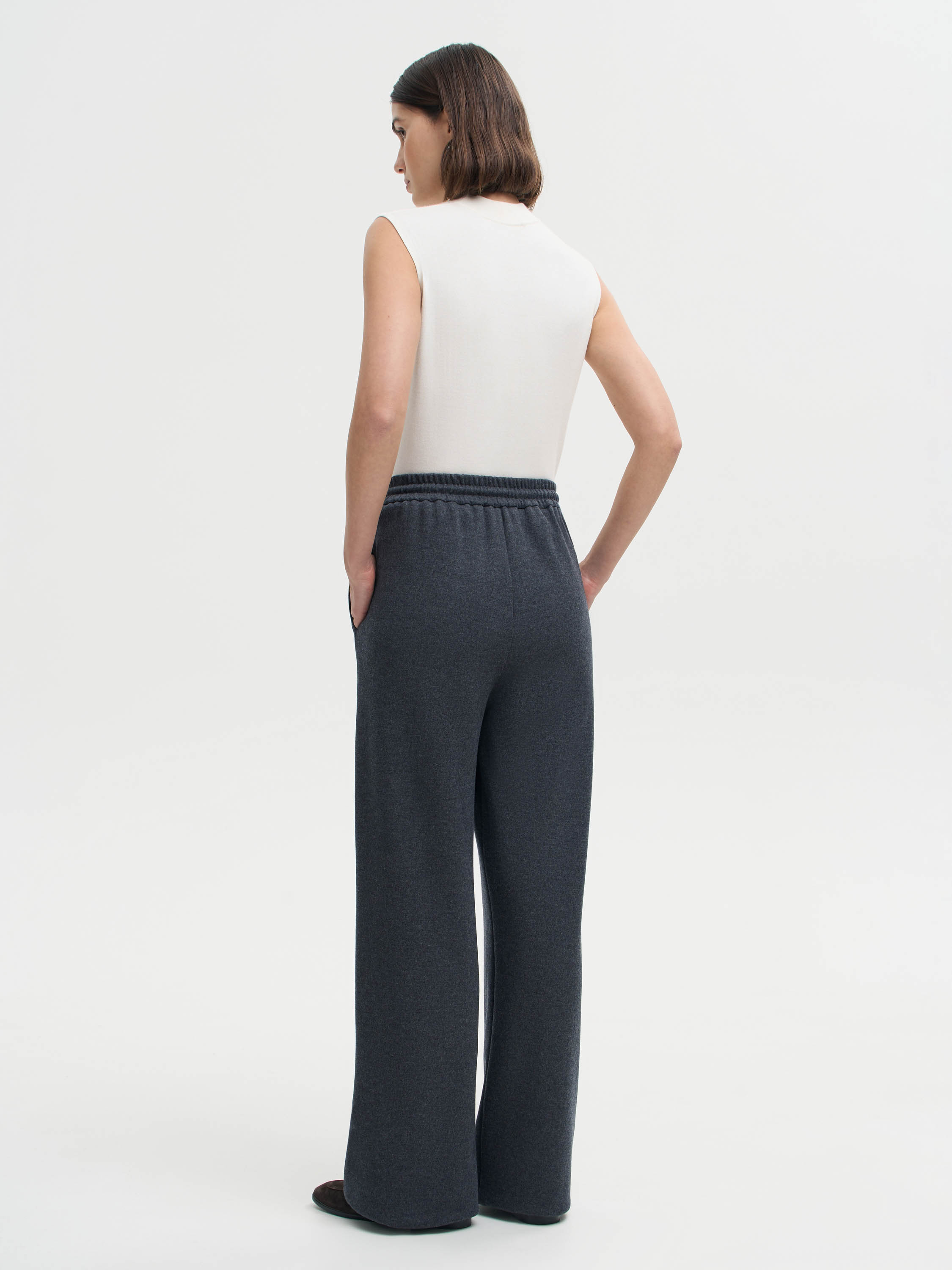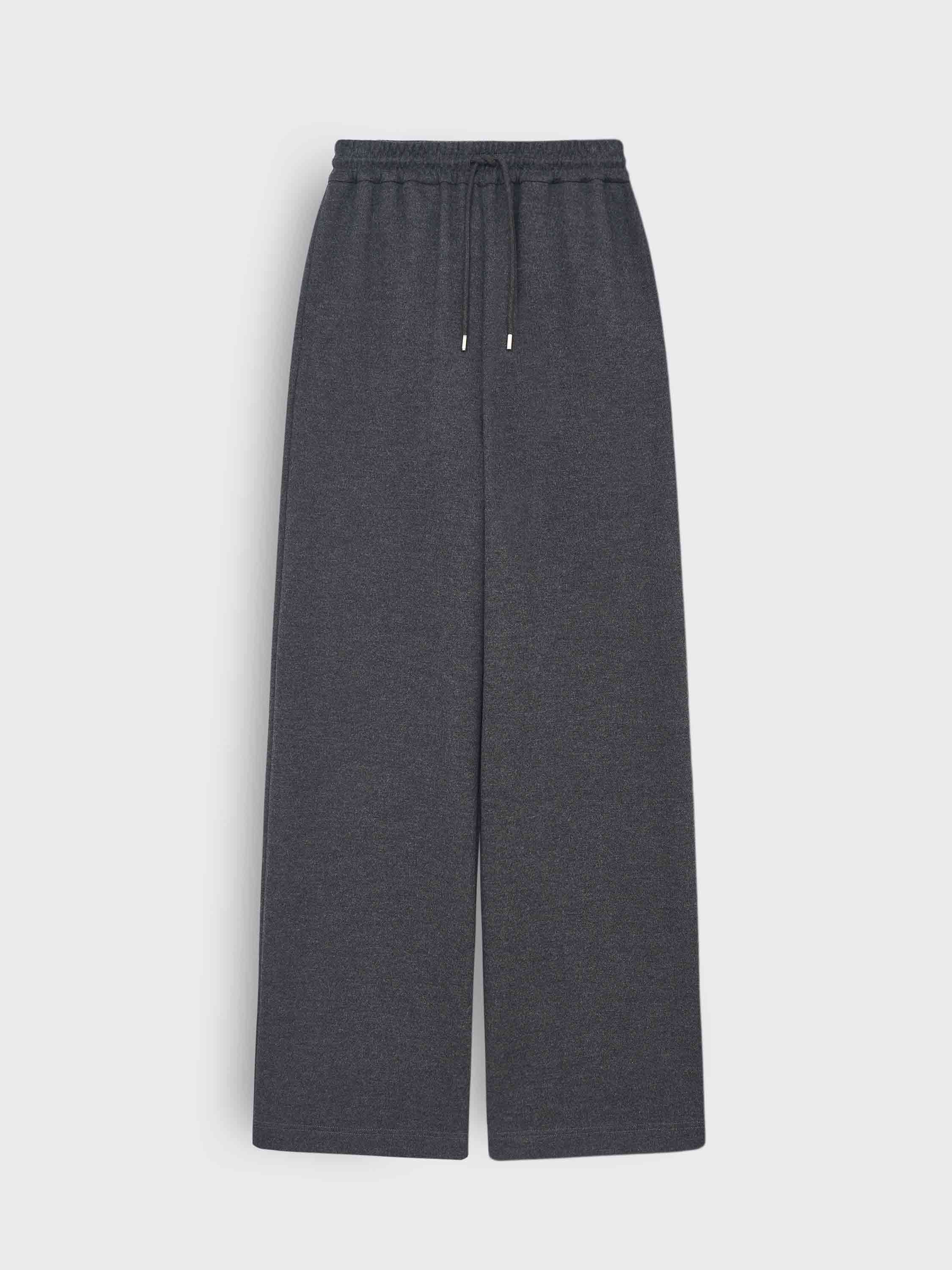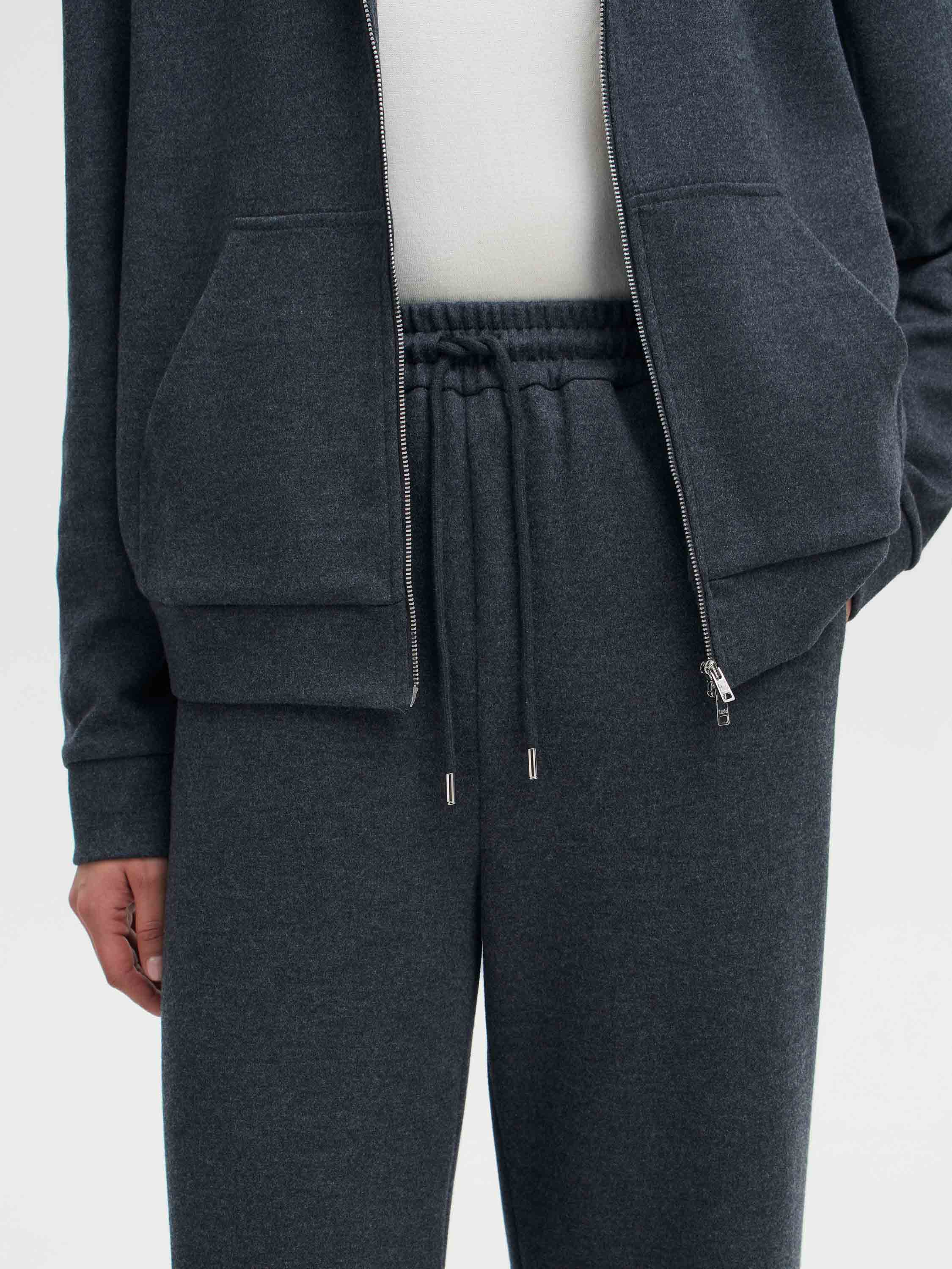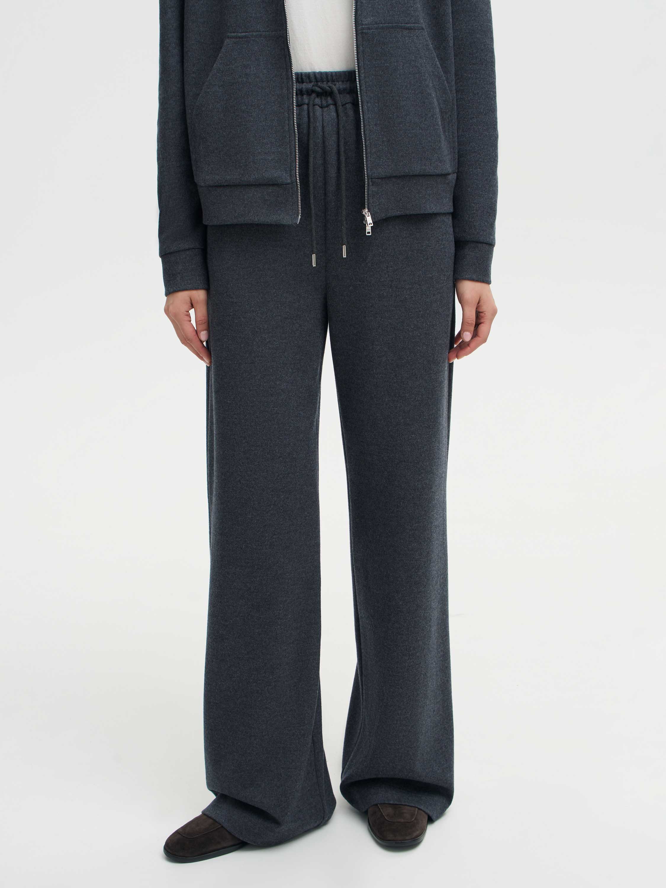 Брюки из смесового полотна на основе шерсти и хлопка с добавлением мягких и прочных волокон. Материал тактильно приятный, пластичный, с ровной поверхностью. Крой свободный, прямой, пояс на эластичной резинке с кулиской регулирует посадку и подчеркивает спортивный характер модели. В боковых швах — карманы. Брюки подходят как для комплекта с худи в том же стиле, так и для более легких сочетаний с топами и футболками.