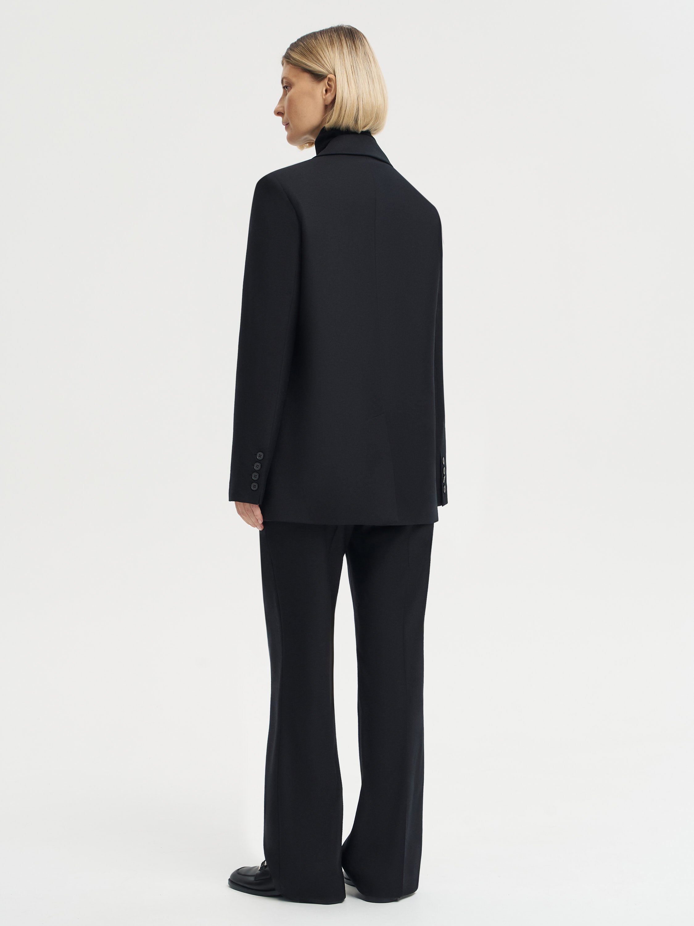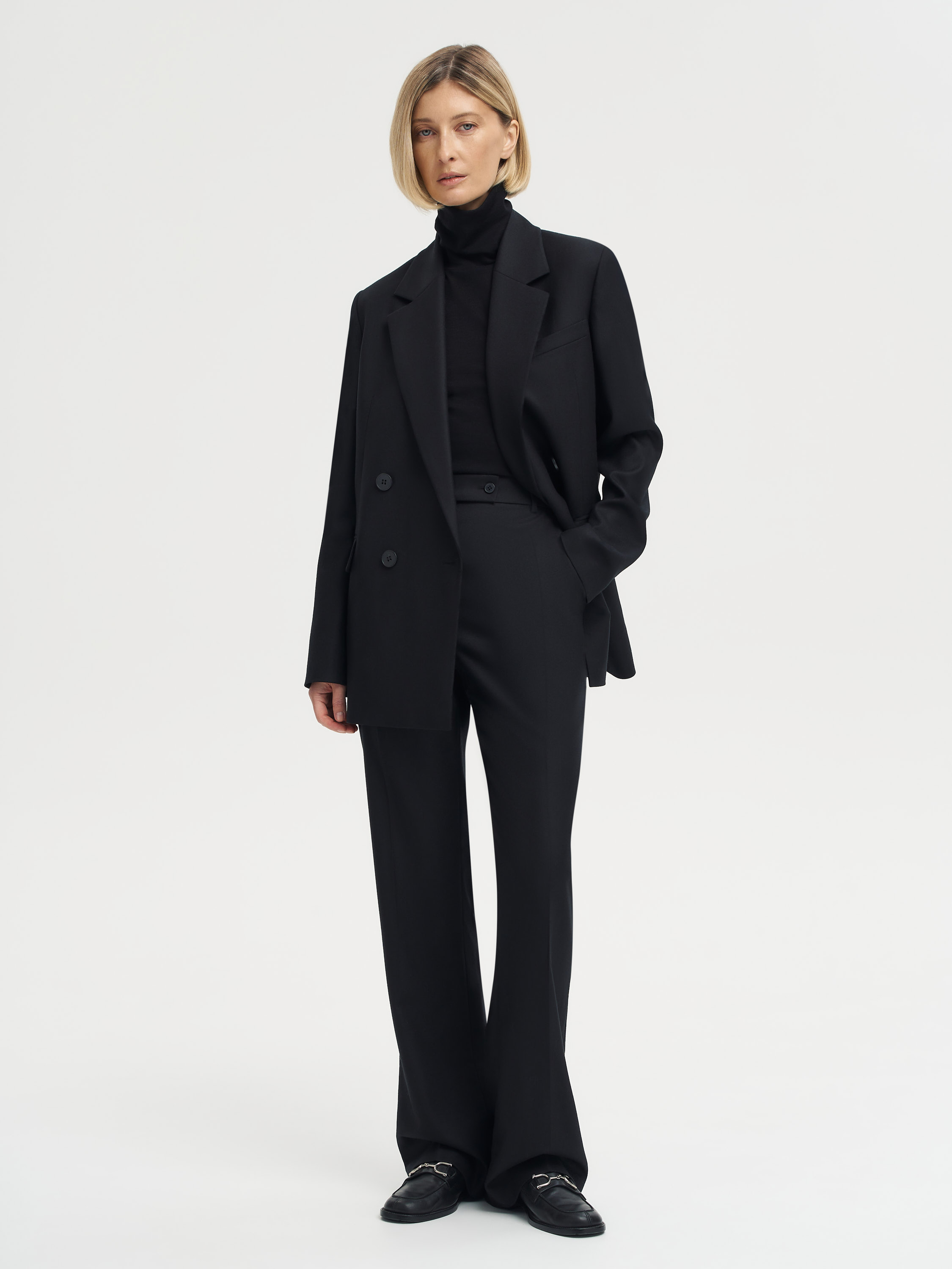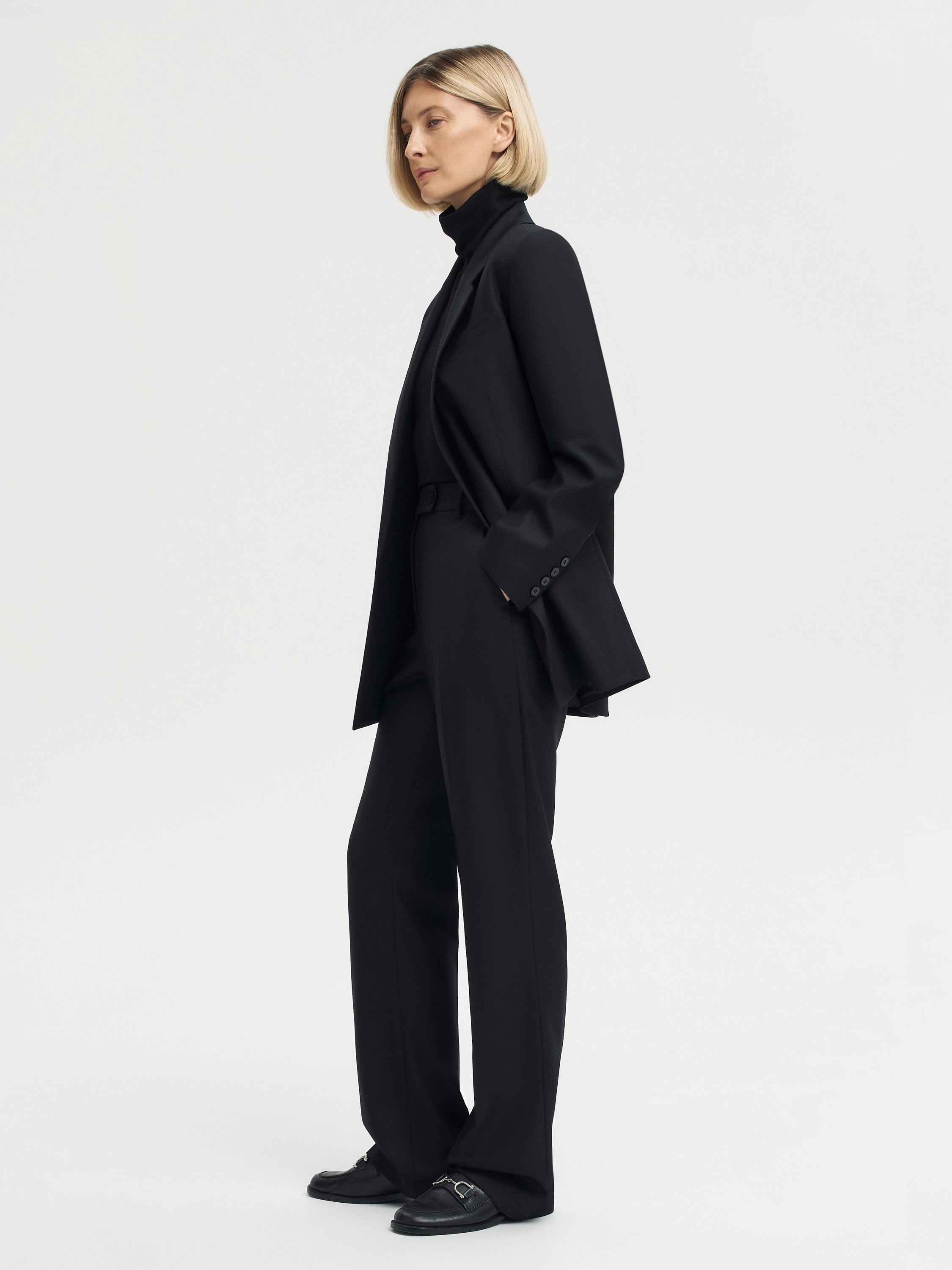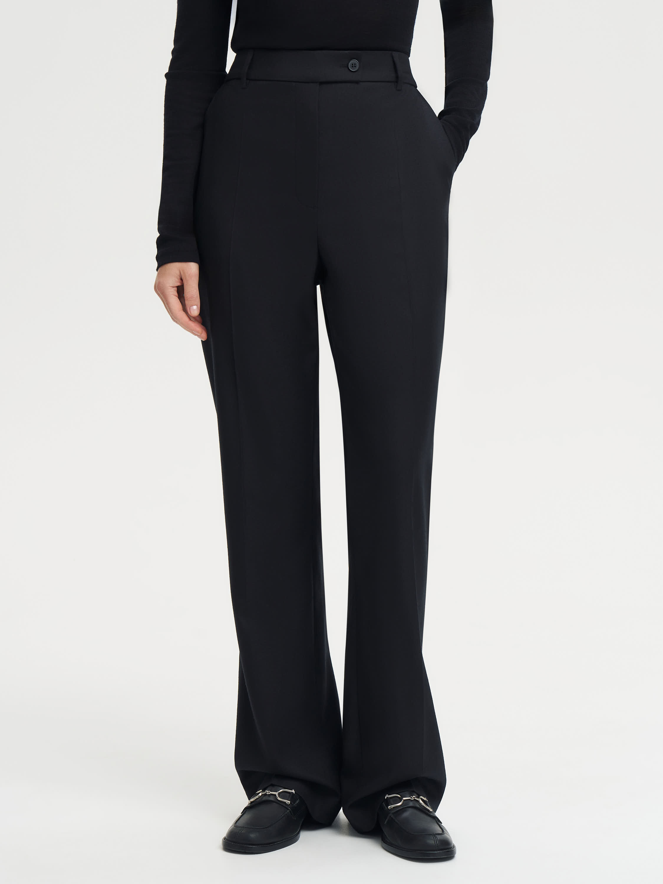 Брюки из тонкой шерсти с добавлением эластана. Материал держит форму, оставаясь податливым и комфортным в движении. Модель с высокой посадкой, мягкими складками у пояса и четко очерченными стрелками. Прямой силуэт визуально вытягивает фигуру, создавая чистую вертикаль. Универсальная основа делового или повседневного гардероба — лаконичные, элегантные, безупречно скроенные.