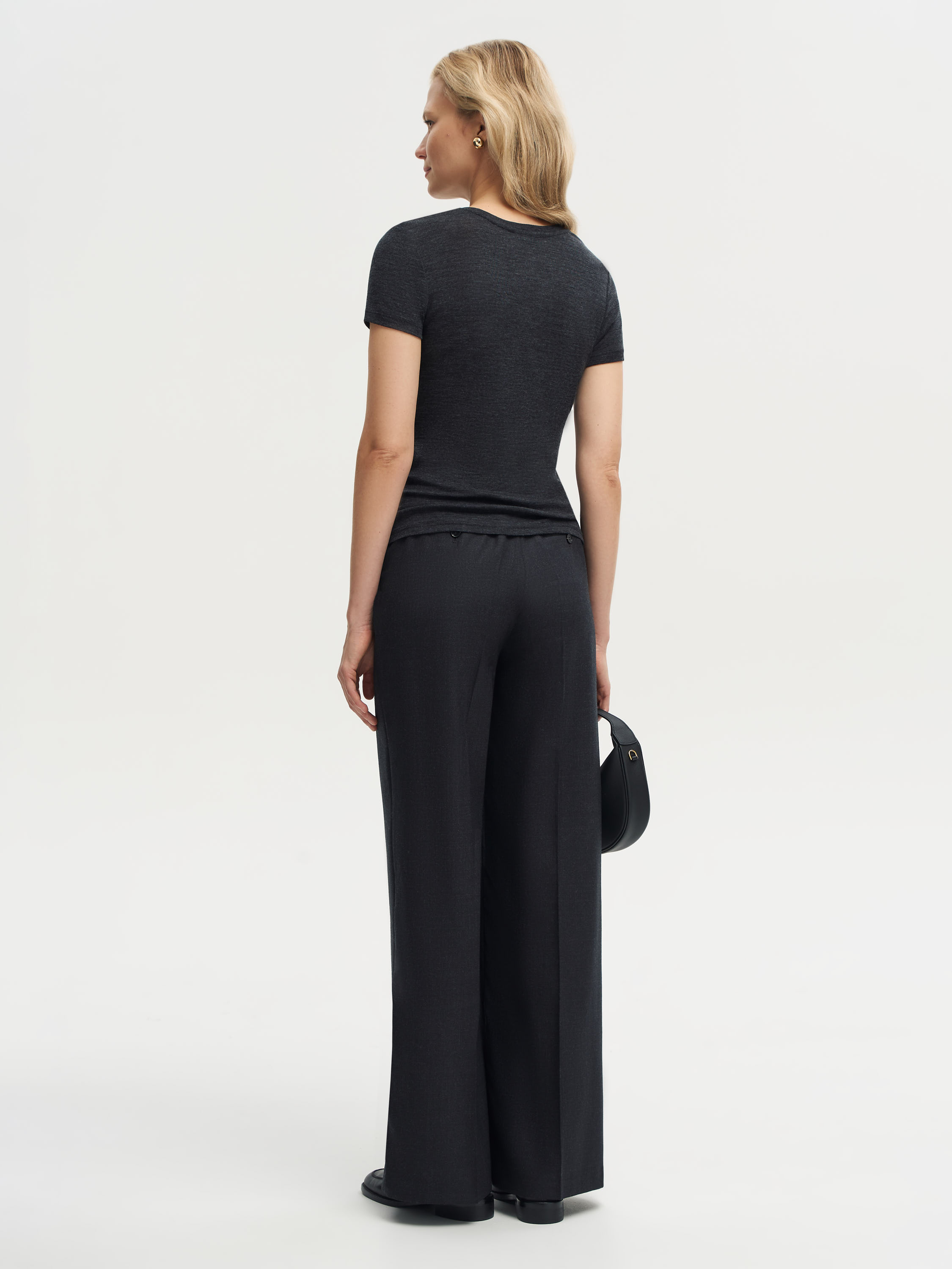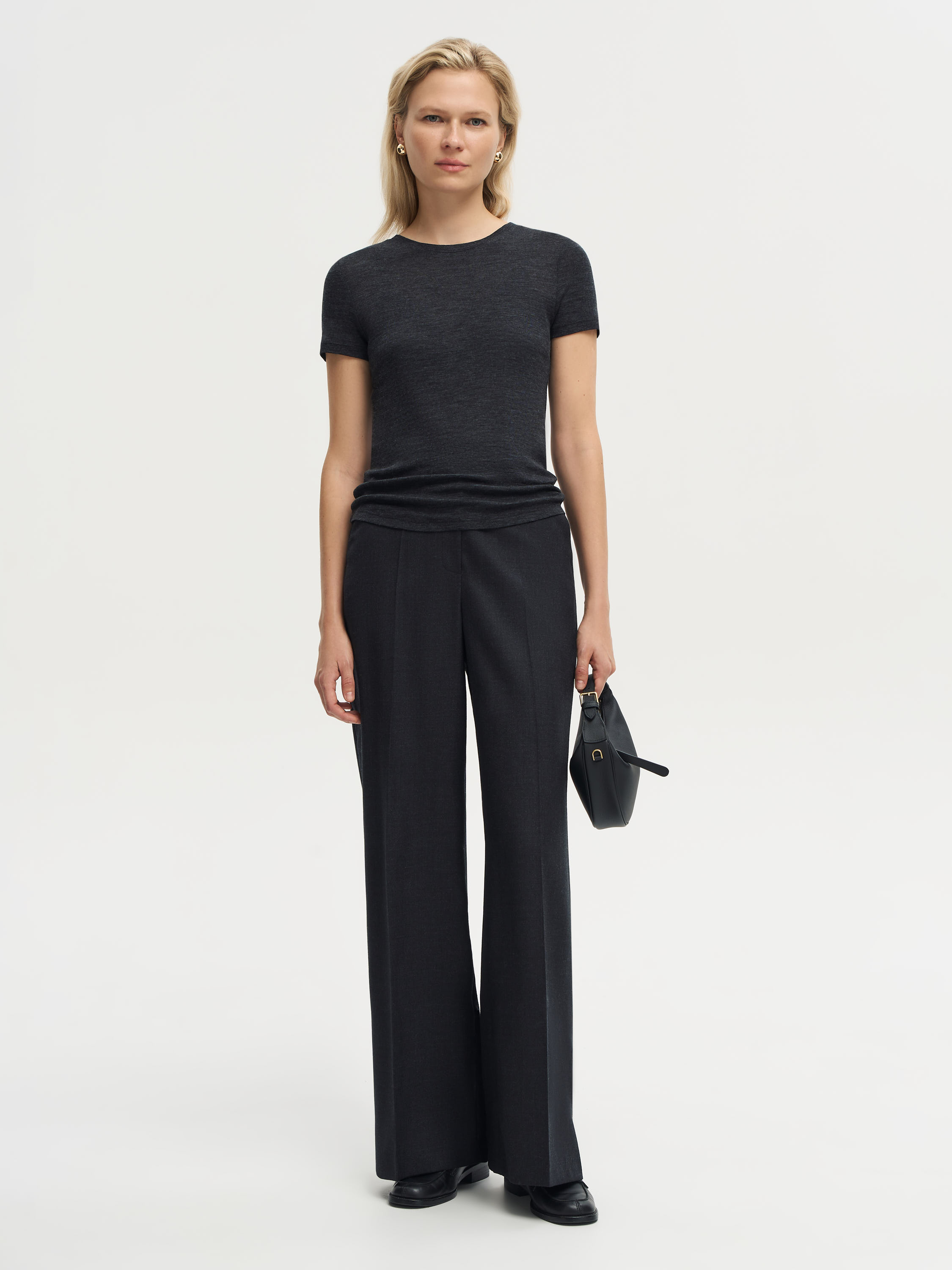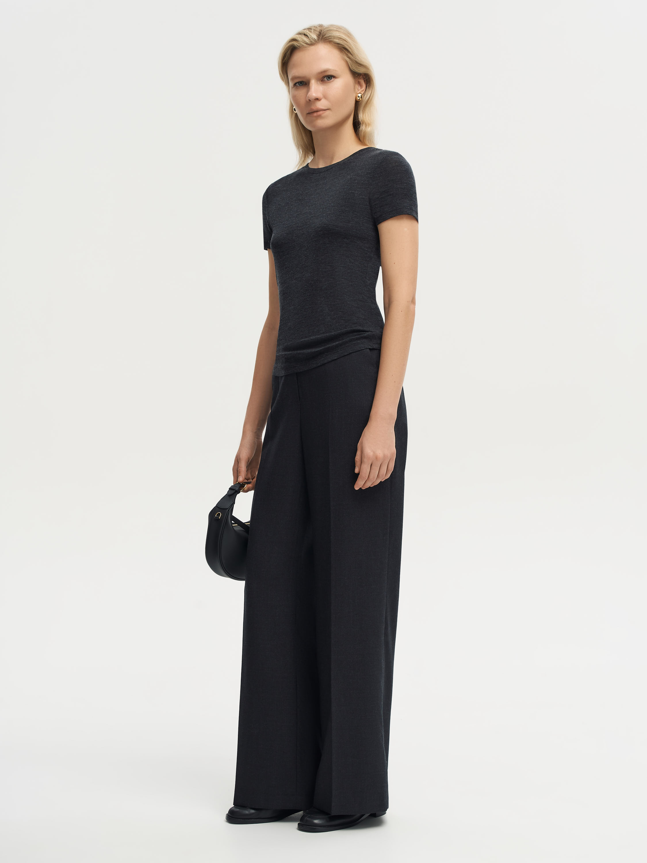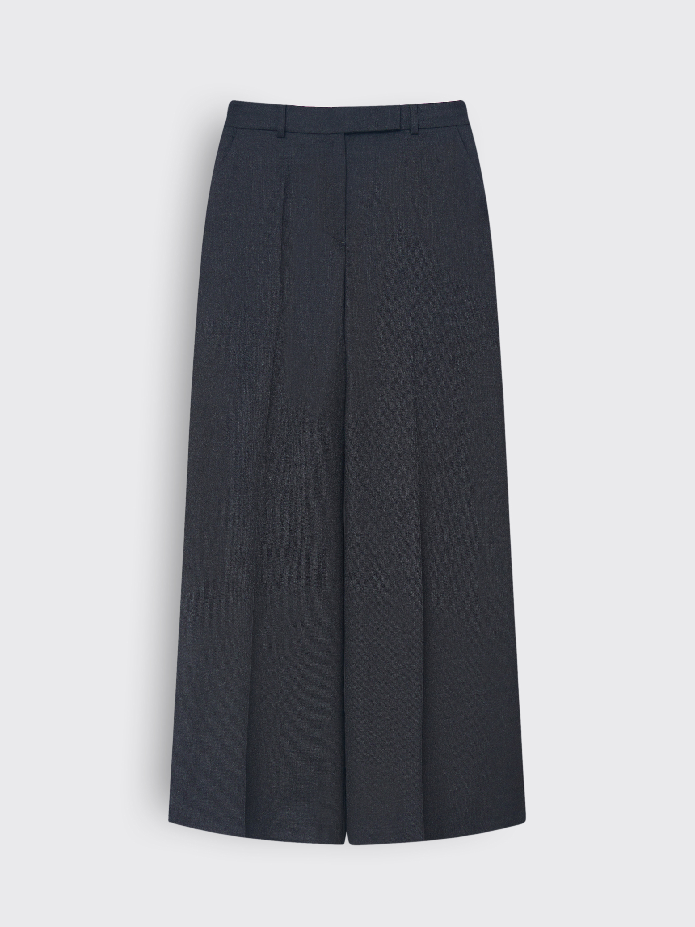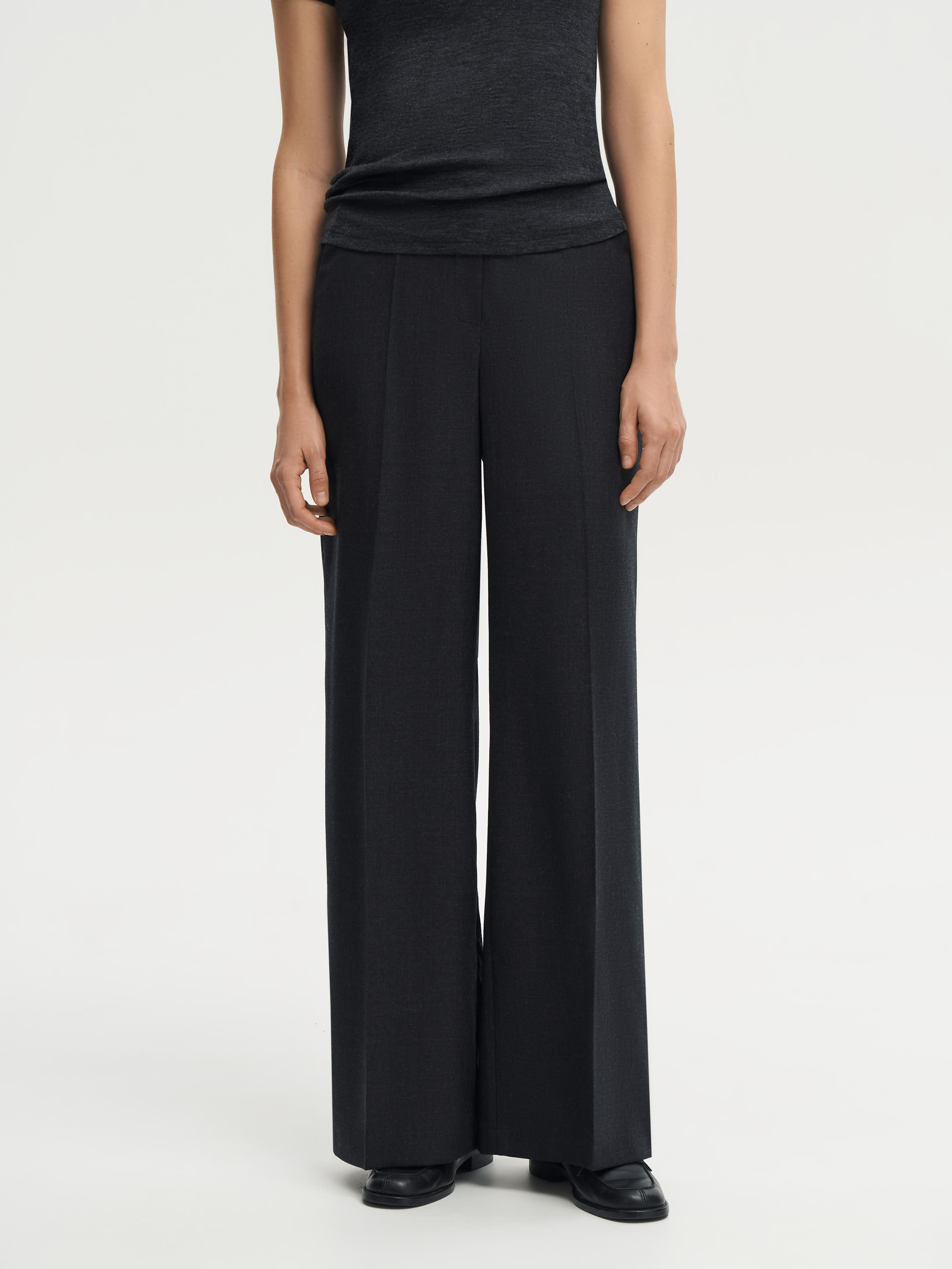 Брюки из 100% шерсти с тонкой вертикальной полоской. Прямой крой визуально вытягивает силуэт, а четкая линия стрелки подчеркивает графичность модели. Ткань плотная и пластичная, хорошо держит форму и при этом комфортна в носке. Минималистичный дизайн делает модель универсальной: брюки легко вписываются и в строгие деловые ансамбли, и в более расслабленные комплекты на каждый день.