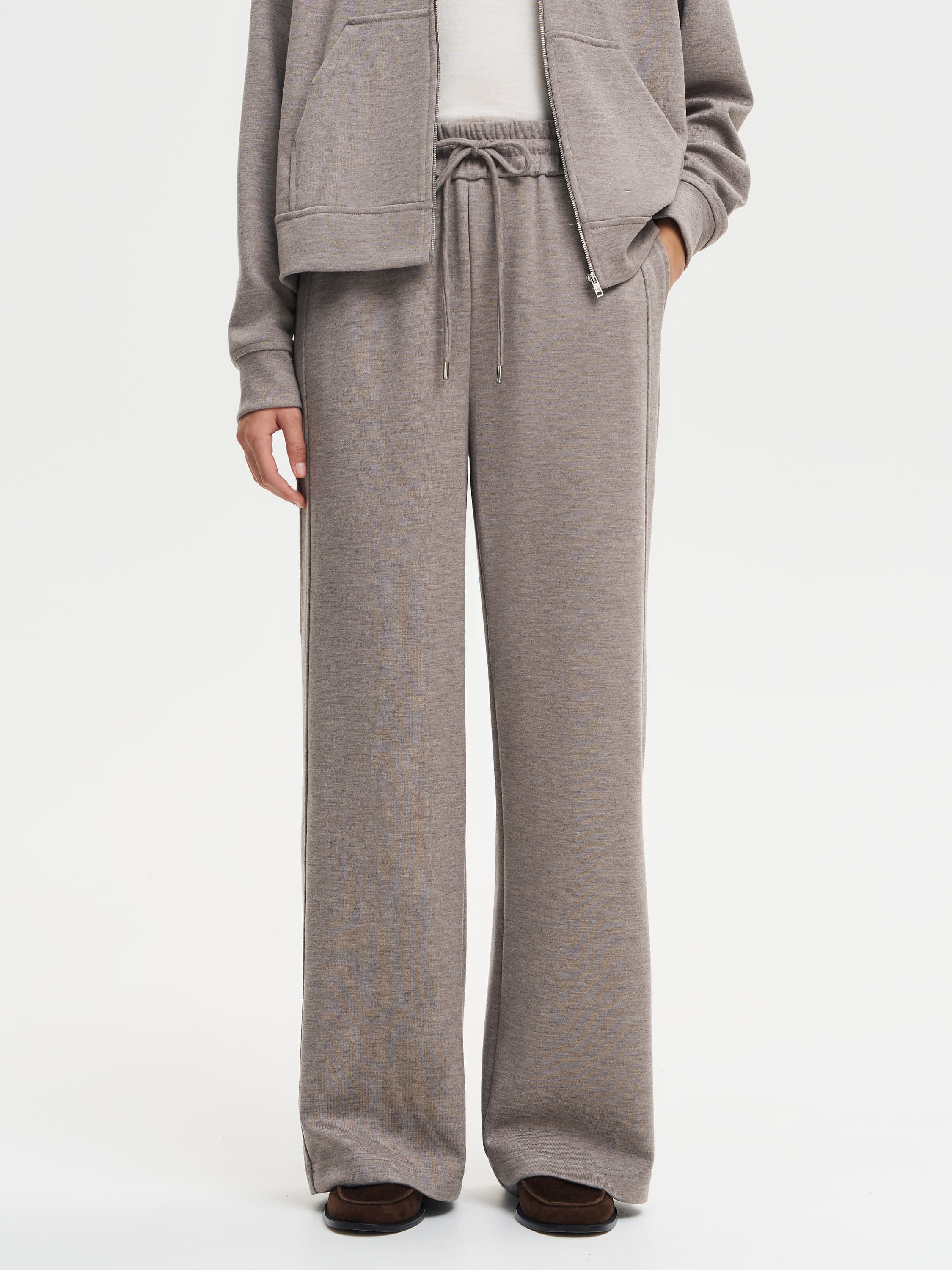 Лаконичные брюки из смесовой шерсти с мягкой фактурой и выразительной посадкой. Полотно держит форму, оставаясь пластичным и комфортным в движении. Прямой широкий крой выстраивает чистую вертикаль и визуально вытягивает силуэт. Эластичный пояс с кулиской регулирует посадку и добавляет непринужденности. Аккуратные стрелки формируют сдержанный, собранный силуэт. Универсальная модель, которая легко вписывается в повседневный гардероб и сочетается как с худи из той же линии, так и с классическими вещами.