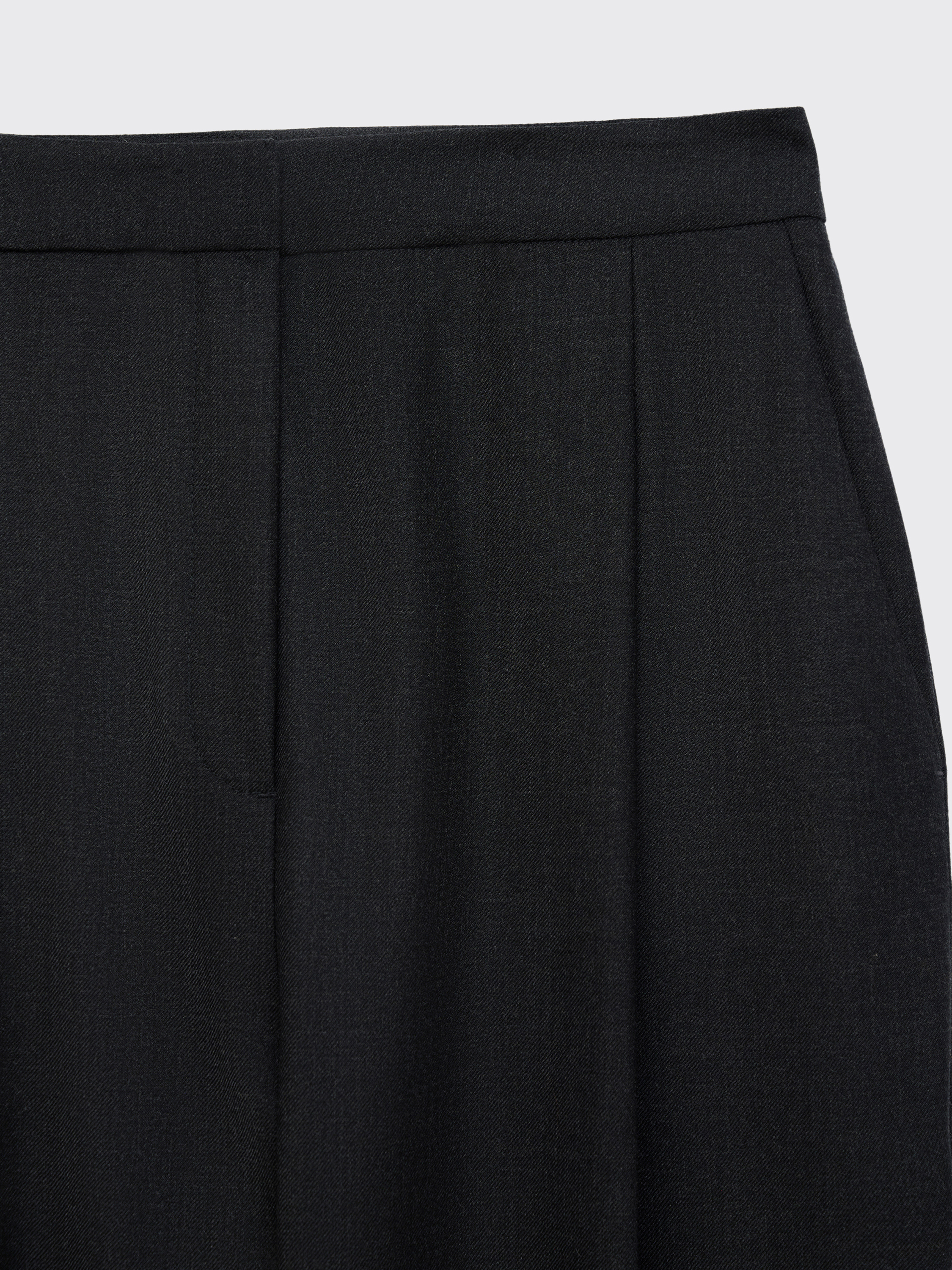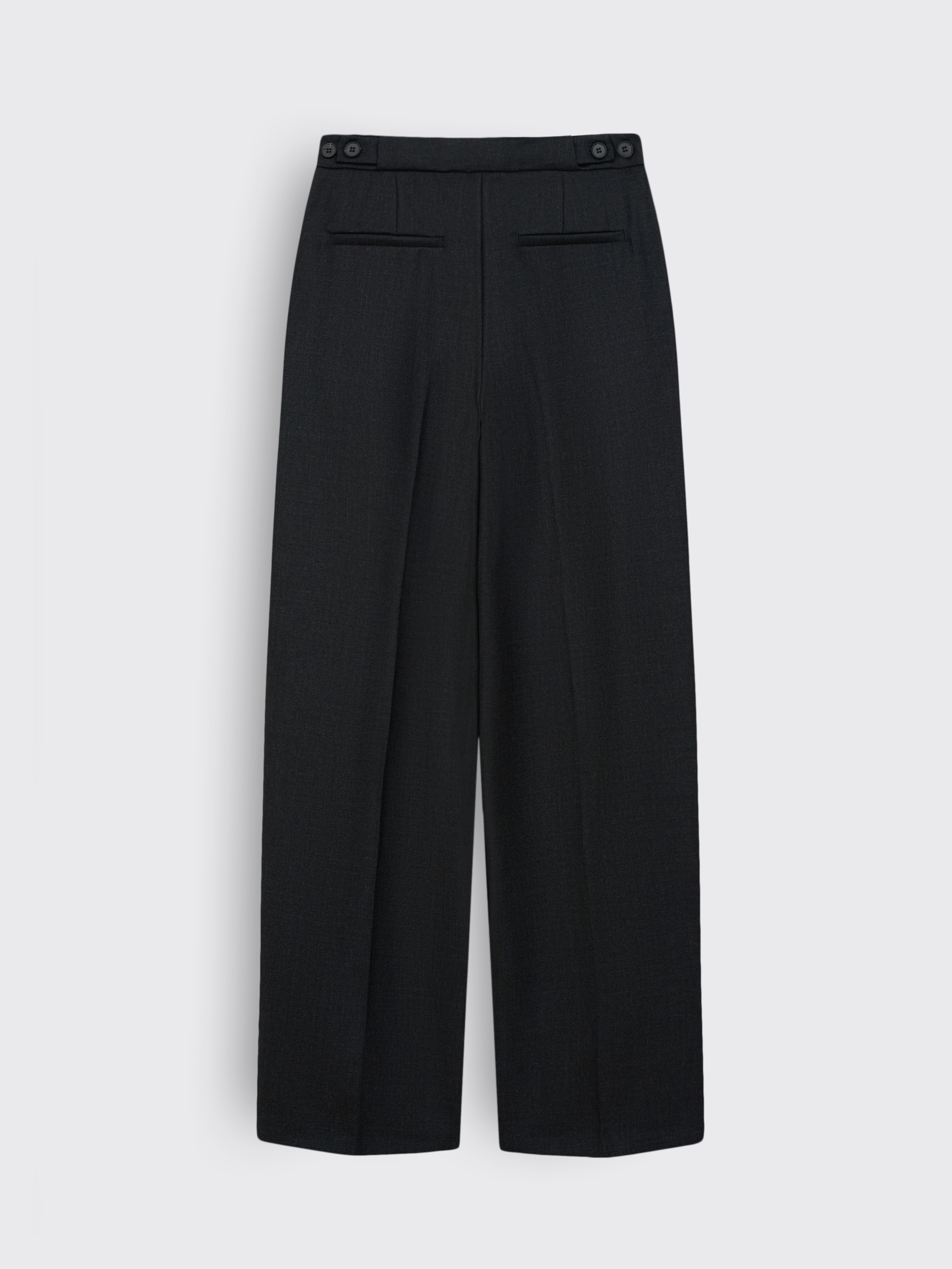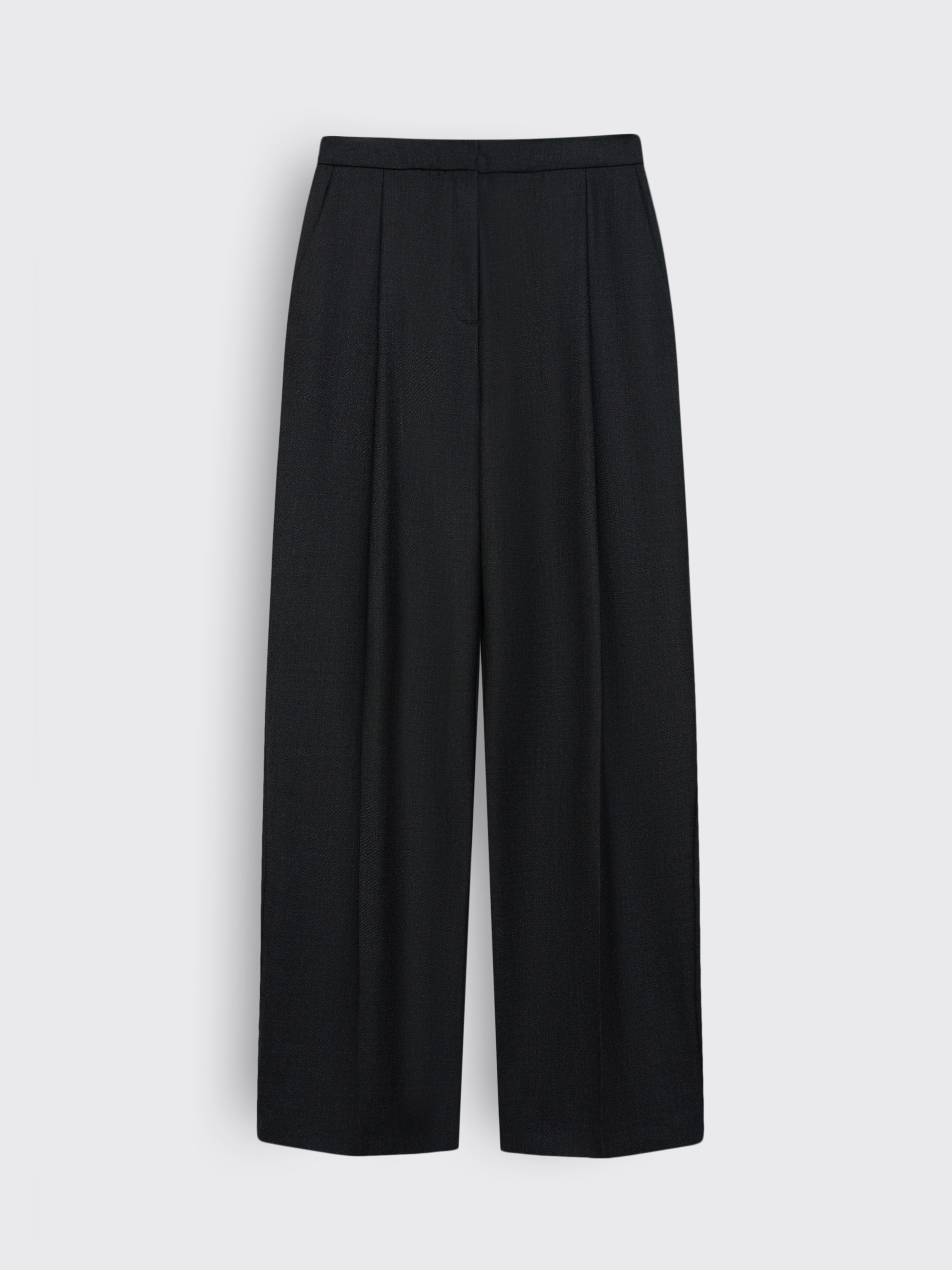 Брюки выполнены из 100% шерсти с плотным, ровным полотном, которое хорошо держит форму и сохраняет четкость линий. Посадка высокая, пояс оформлен лаконично, без декоративных элементов, формируя собранную линию талии. Продольные заутюженные линии от пояса выстраивают вертикаль и подчеркивают архитектуру кроя, а брючины идут прямой широкой линией, сохраняя аккуратную геометрию силуэта. Модель сочетается с жакетами строгого кроя, тонким трикотажем и рубашками, формируя сдержанные и выверенные образы.