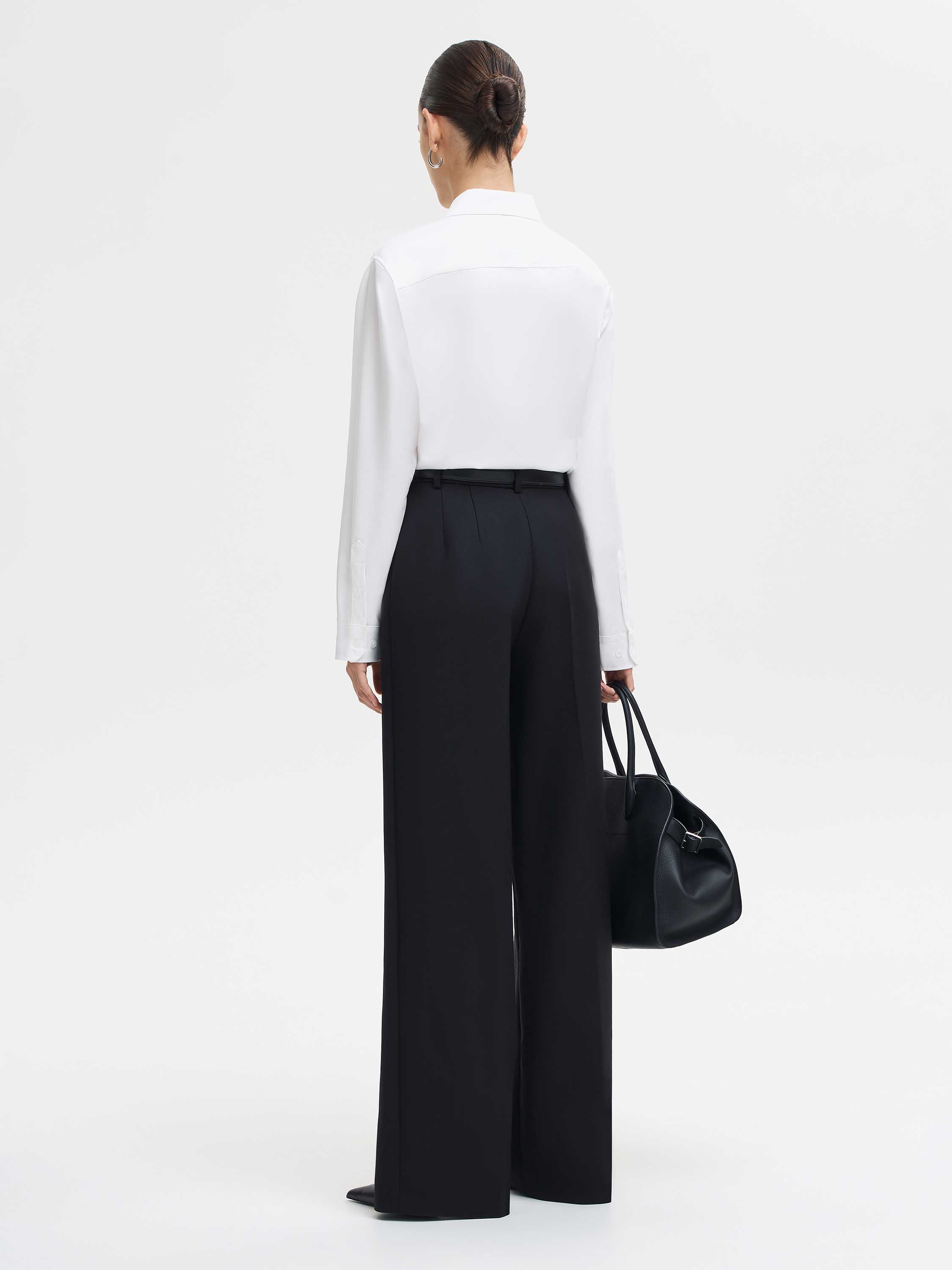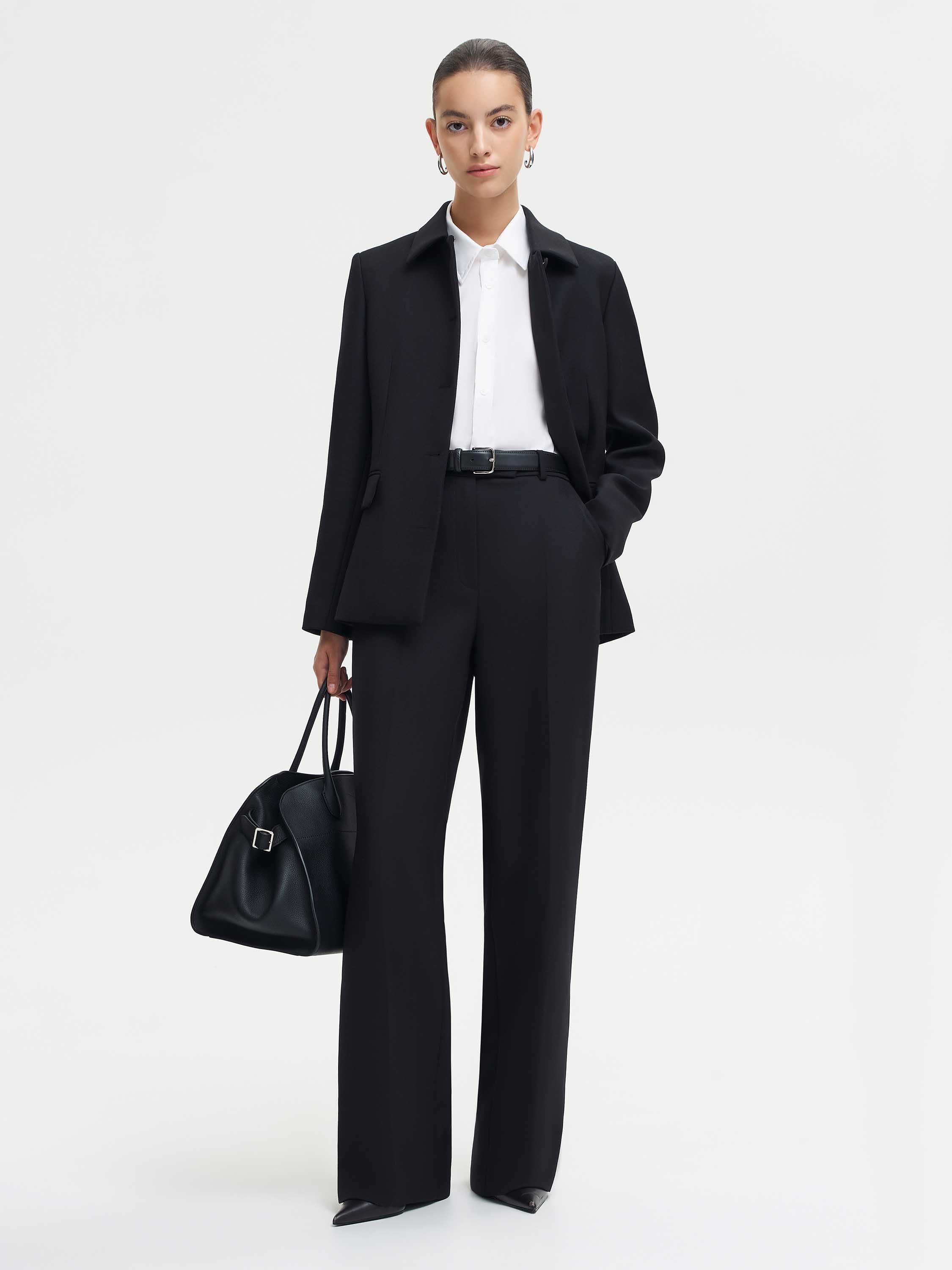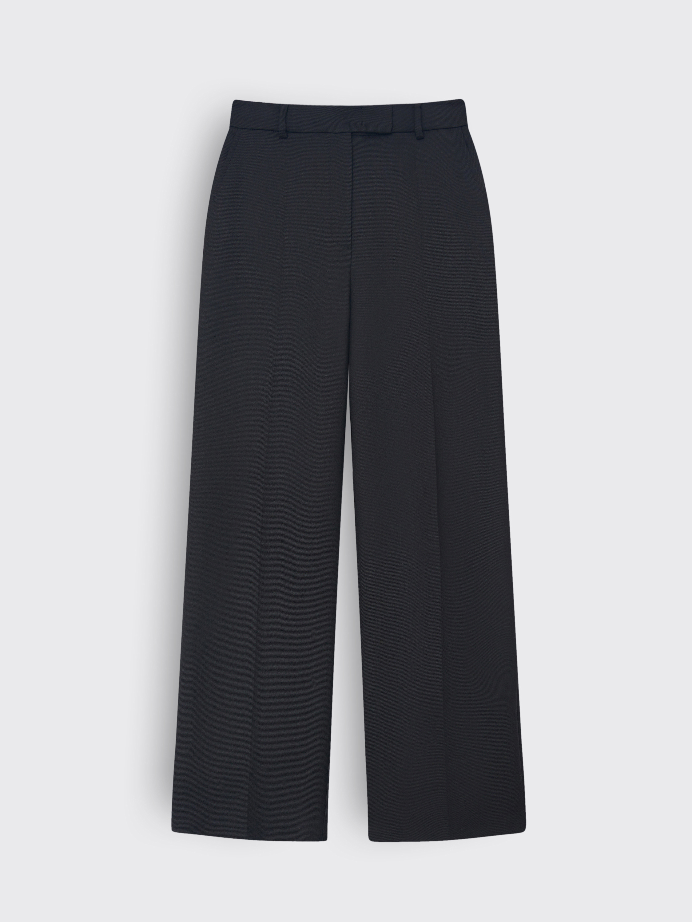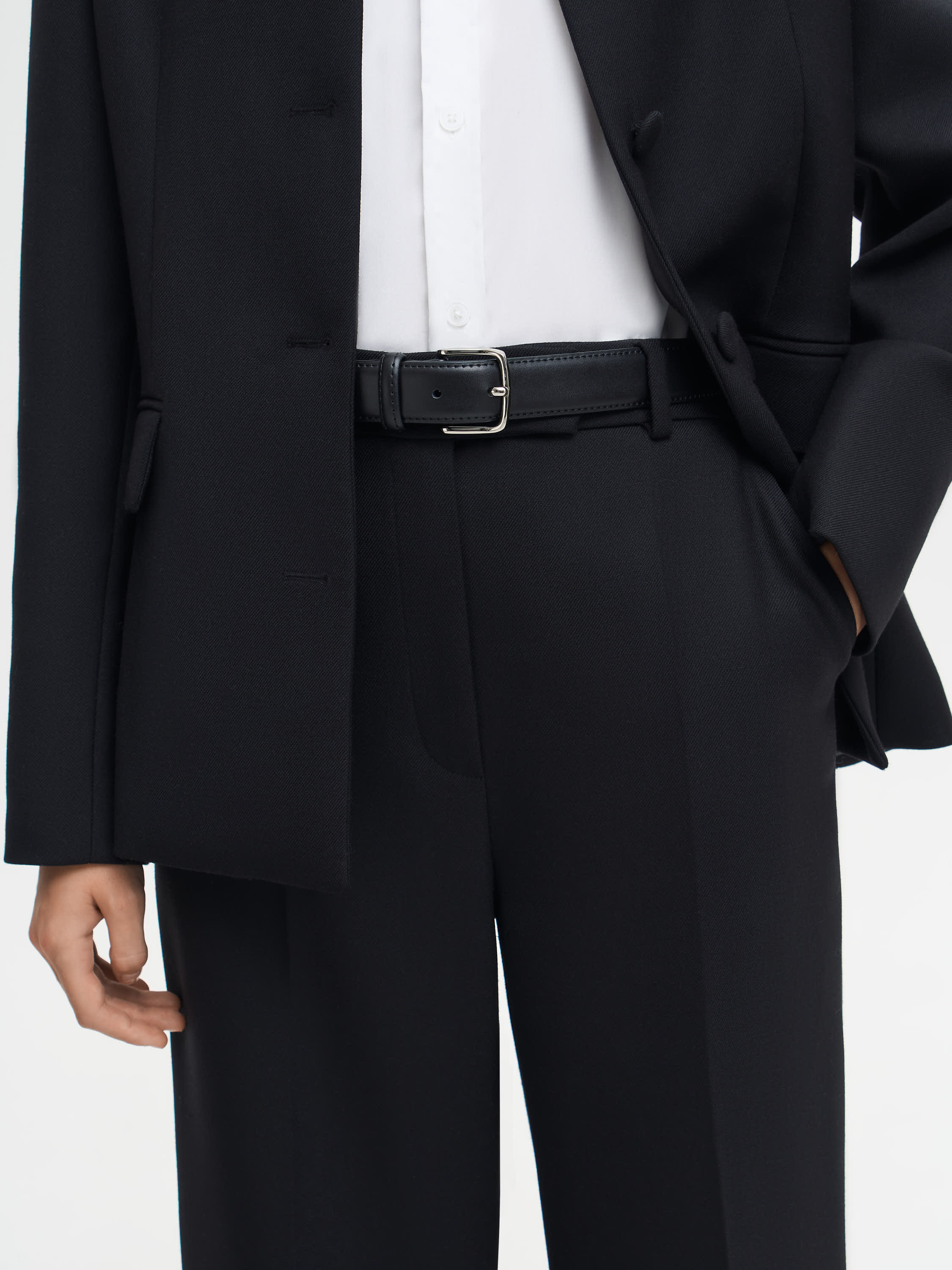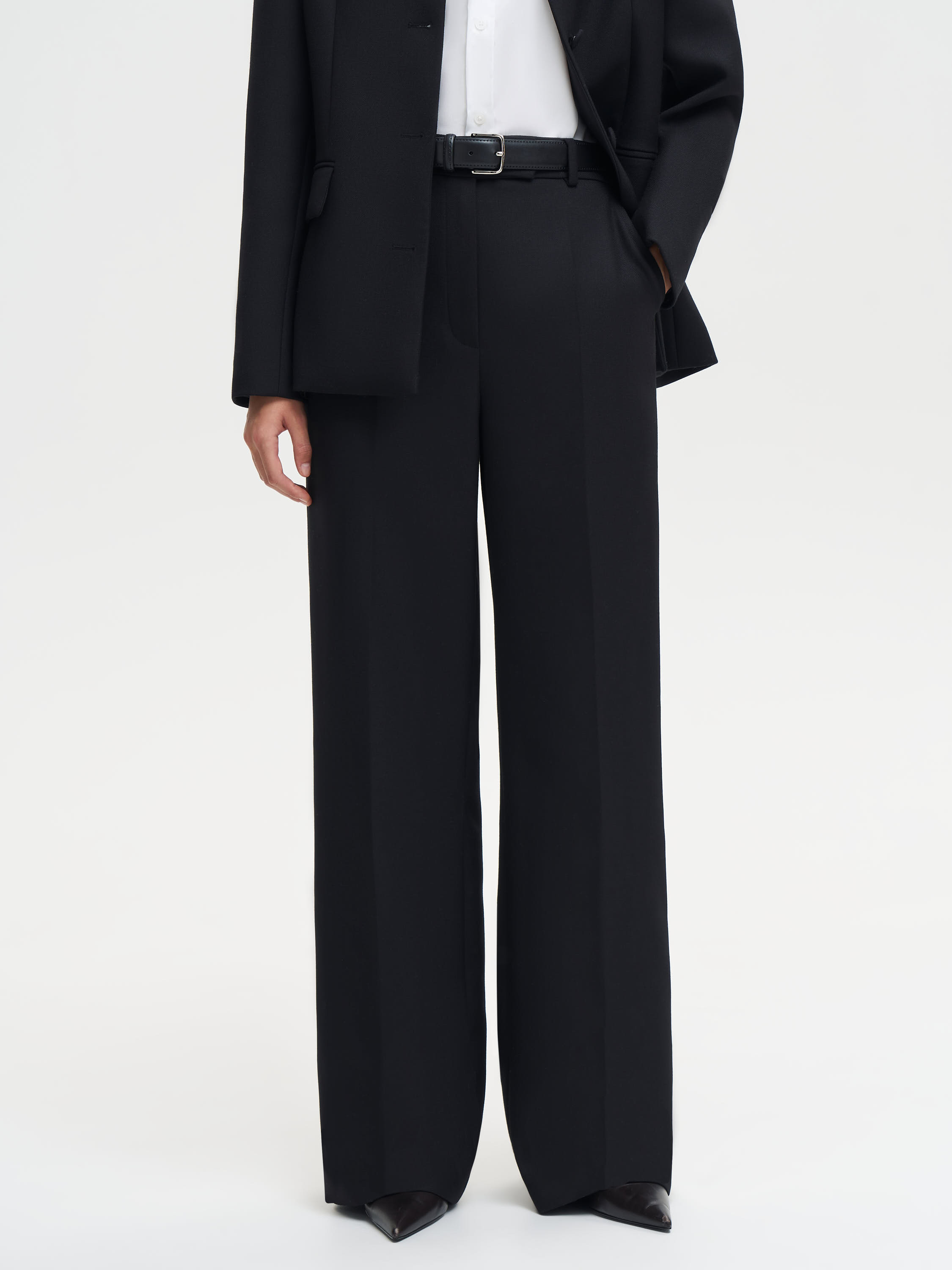 Брюки прямого кроя из смесовой шерсти с выразительной фактурой полотна. Модель с высокой посадкой и мягко скроенной линией талии подчеркивает силуэт, сохраняя при этом комфорт в движении. Четкие стрелки визуально вытягивают силуэт и придают образу структурность. Плотная, но пластичная ткань держит форму и создает чистую вертикаль, характерную для современного костюмного кроя. Брюки можно сочетать с жакетом в тон, объемным свитером из шерсти или лаконичной рубашкой, формируя сдержанные, продуманные образы на каждый день.