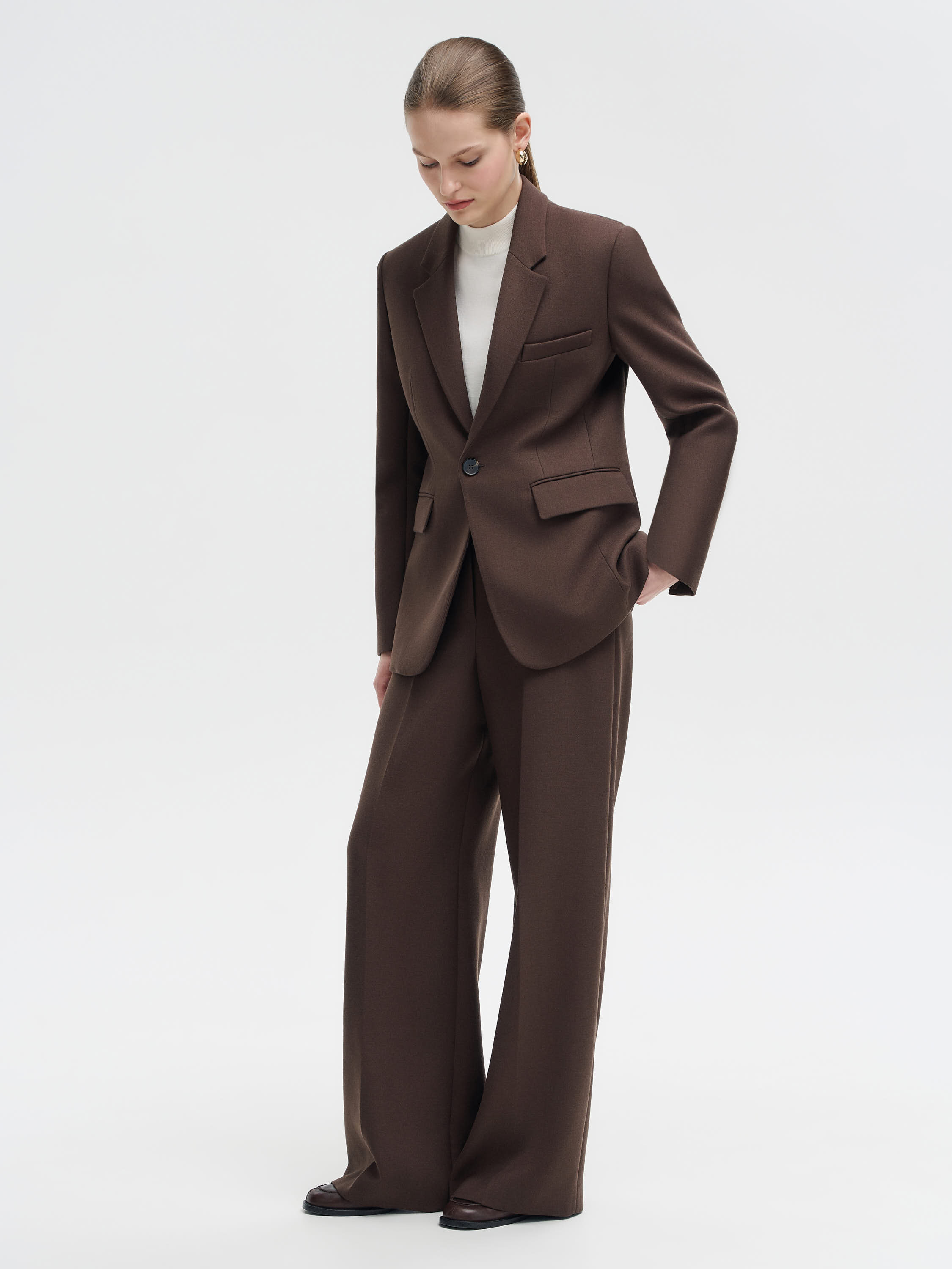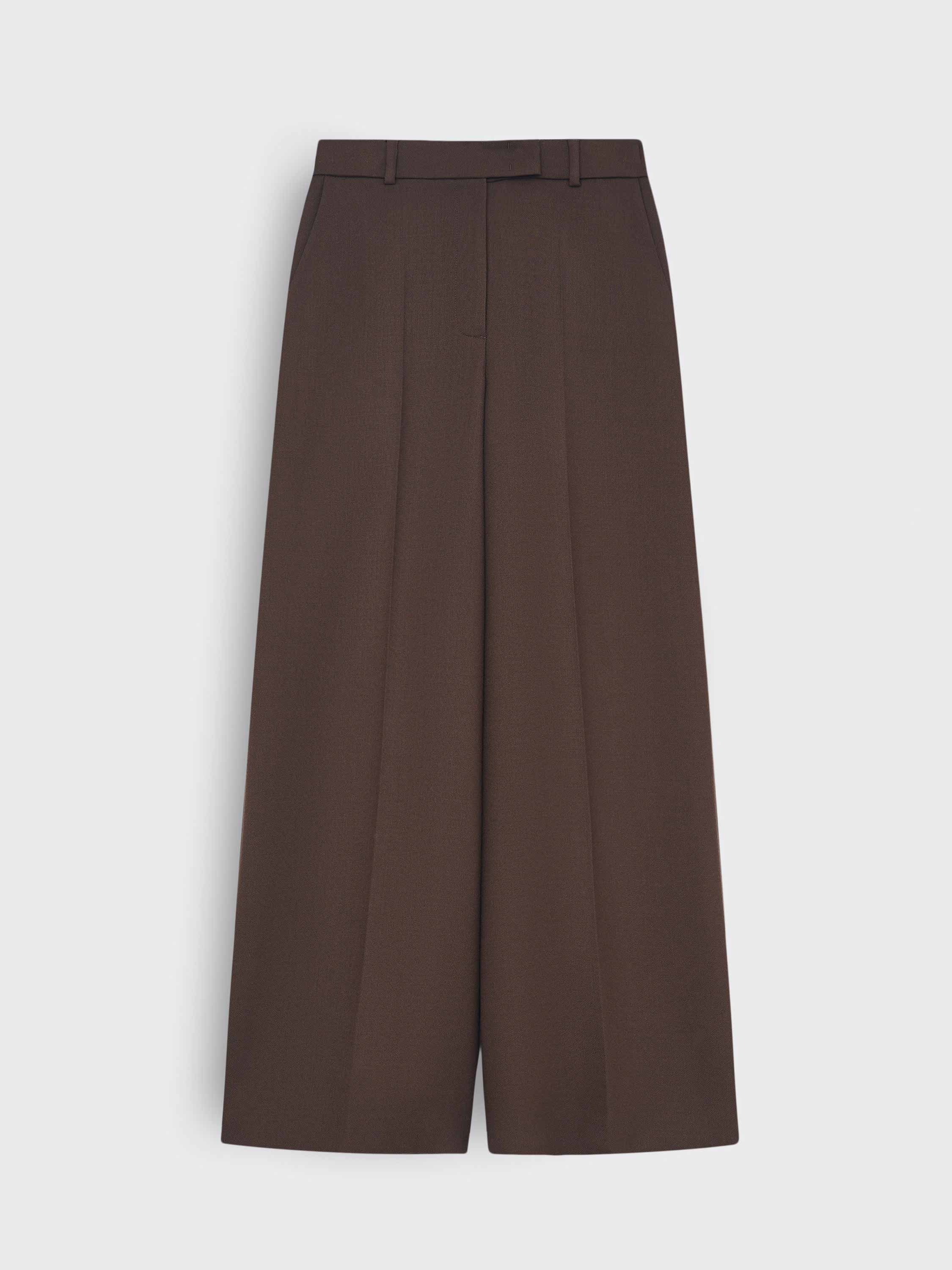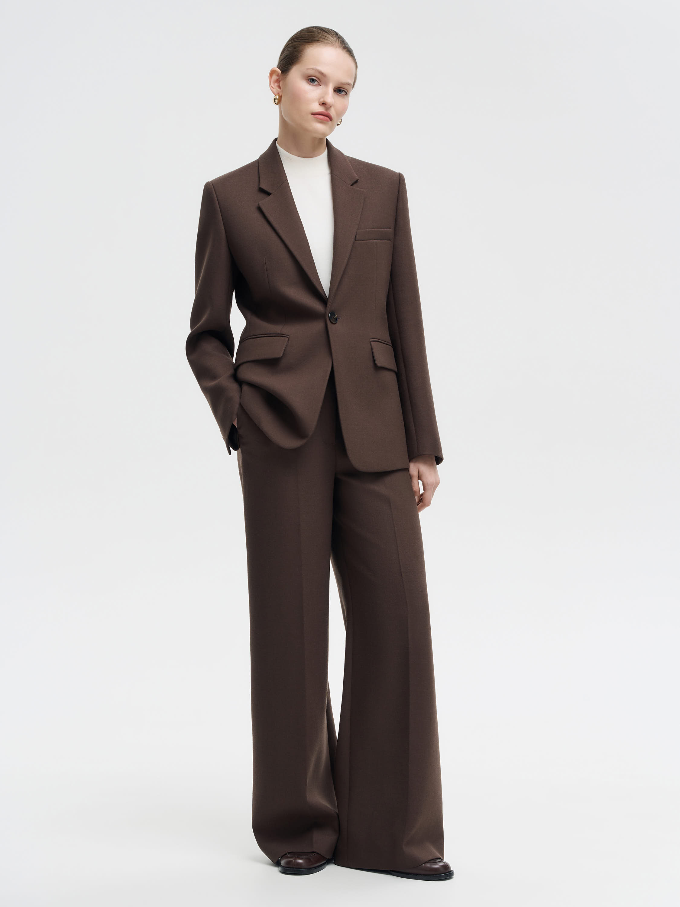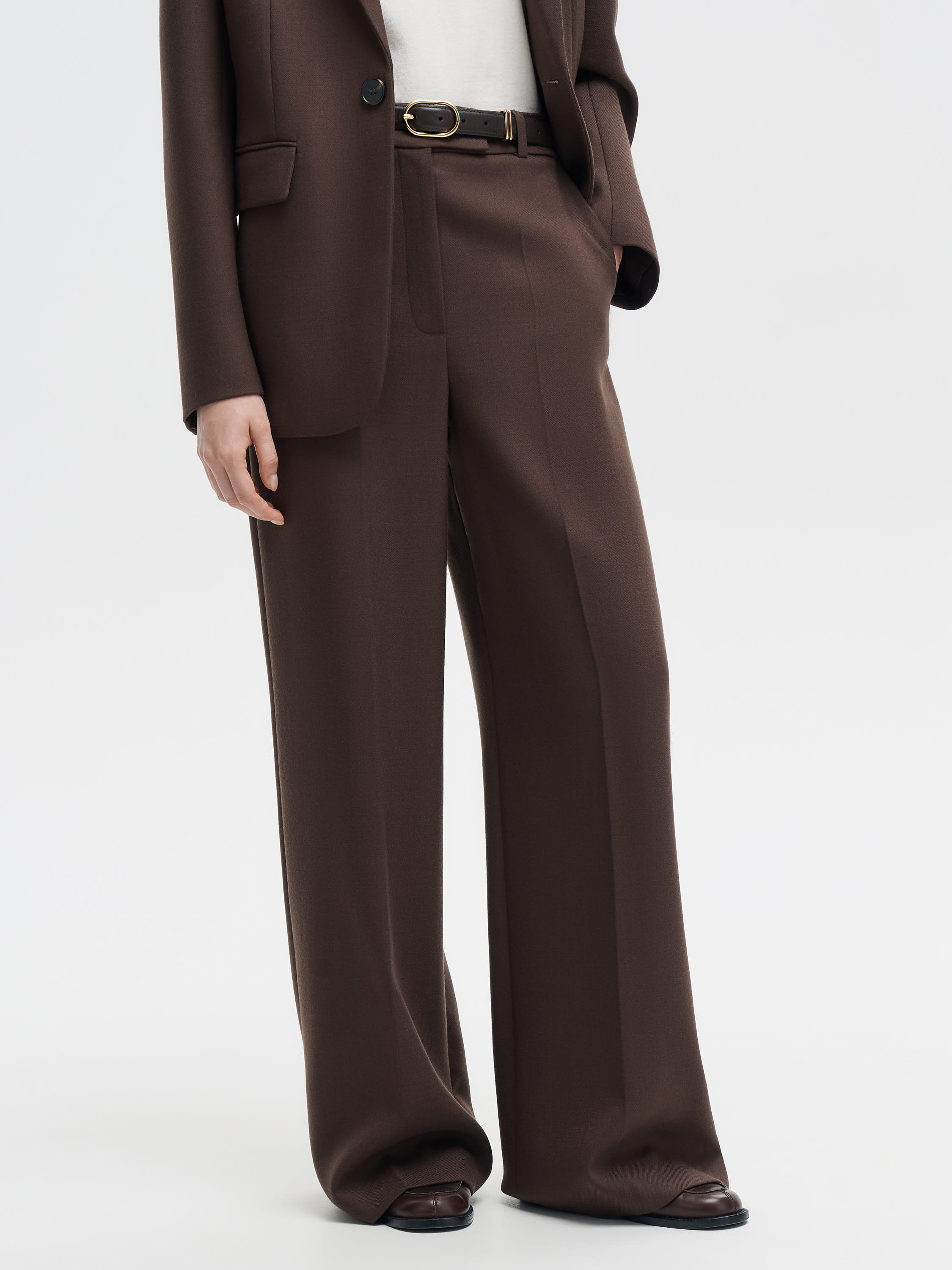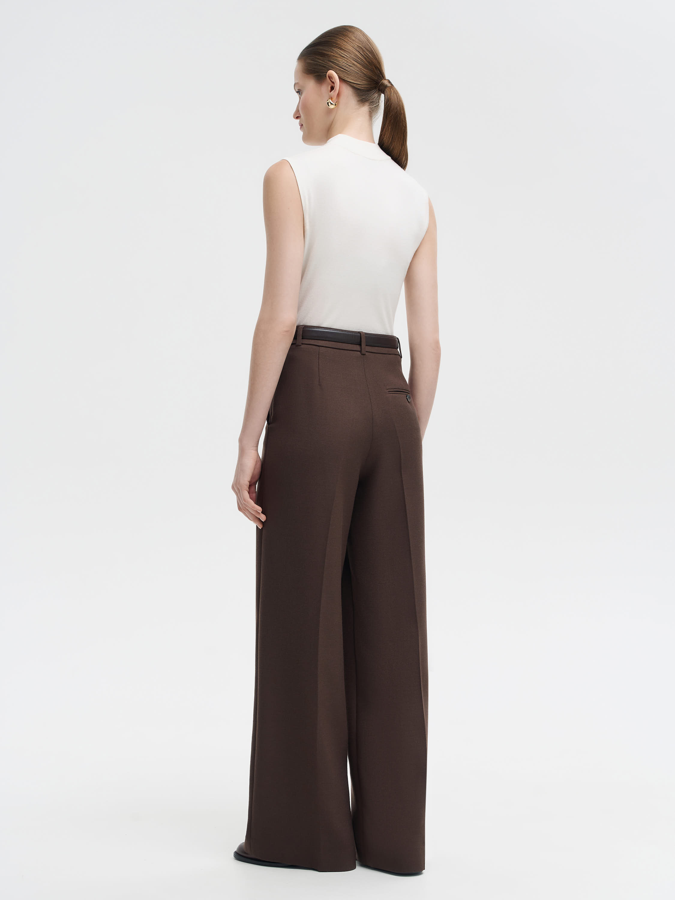 Брюки из шерсти — плотные, выразительные, с четкой посадкой и выверенным силуэтом. Высокая талия оформлена без пояса, акцент сделан на вертикали защипов и стрелок. Широкие прямые брючины создают строгий, вытянутый силуэт и подчеркивают архитектуру модели. Натуральная шерсть комфортна в носке: она держит форму, дышит и остается пластичной в движении.