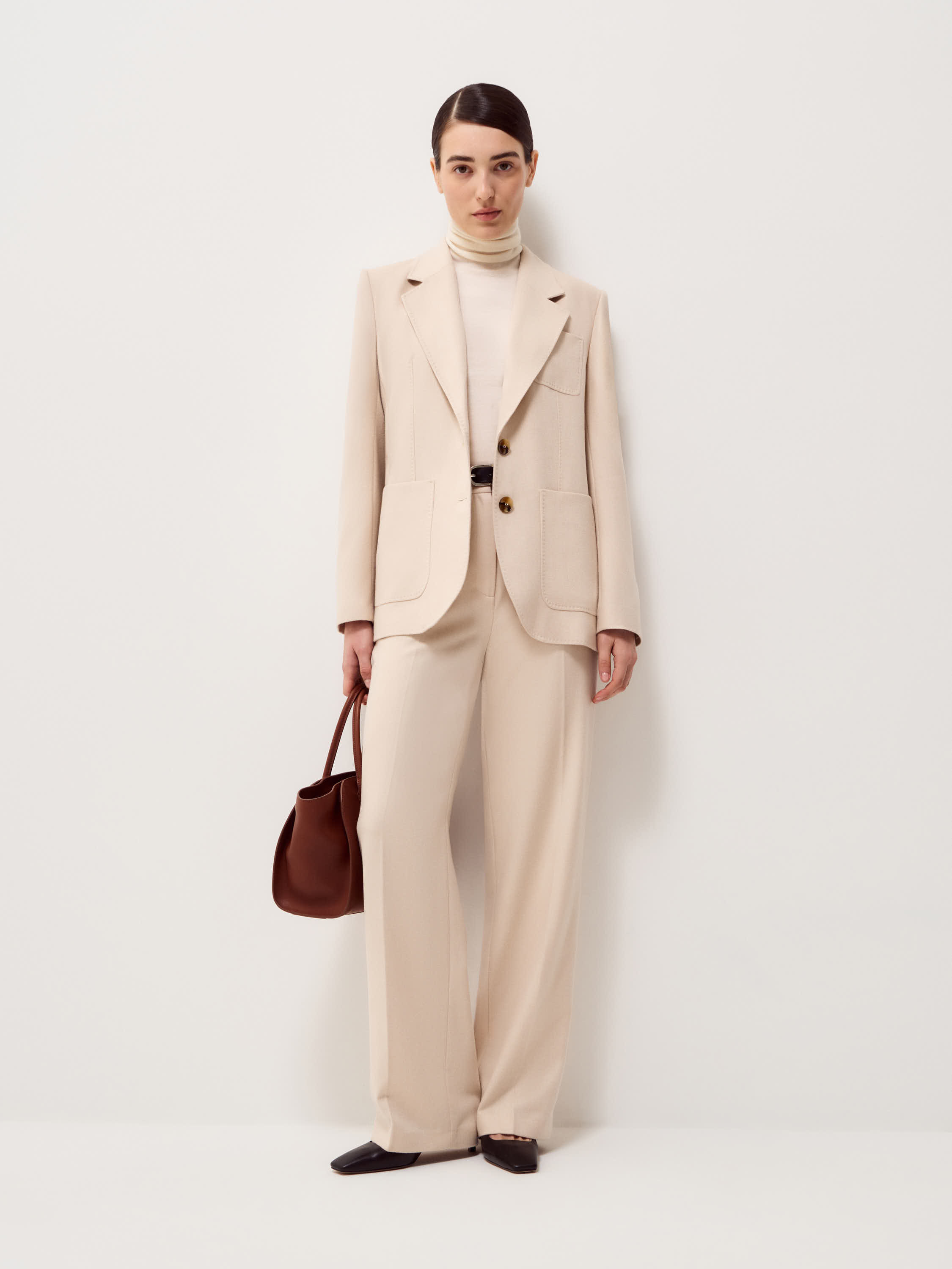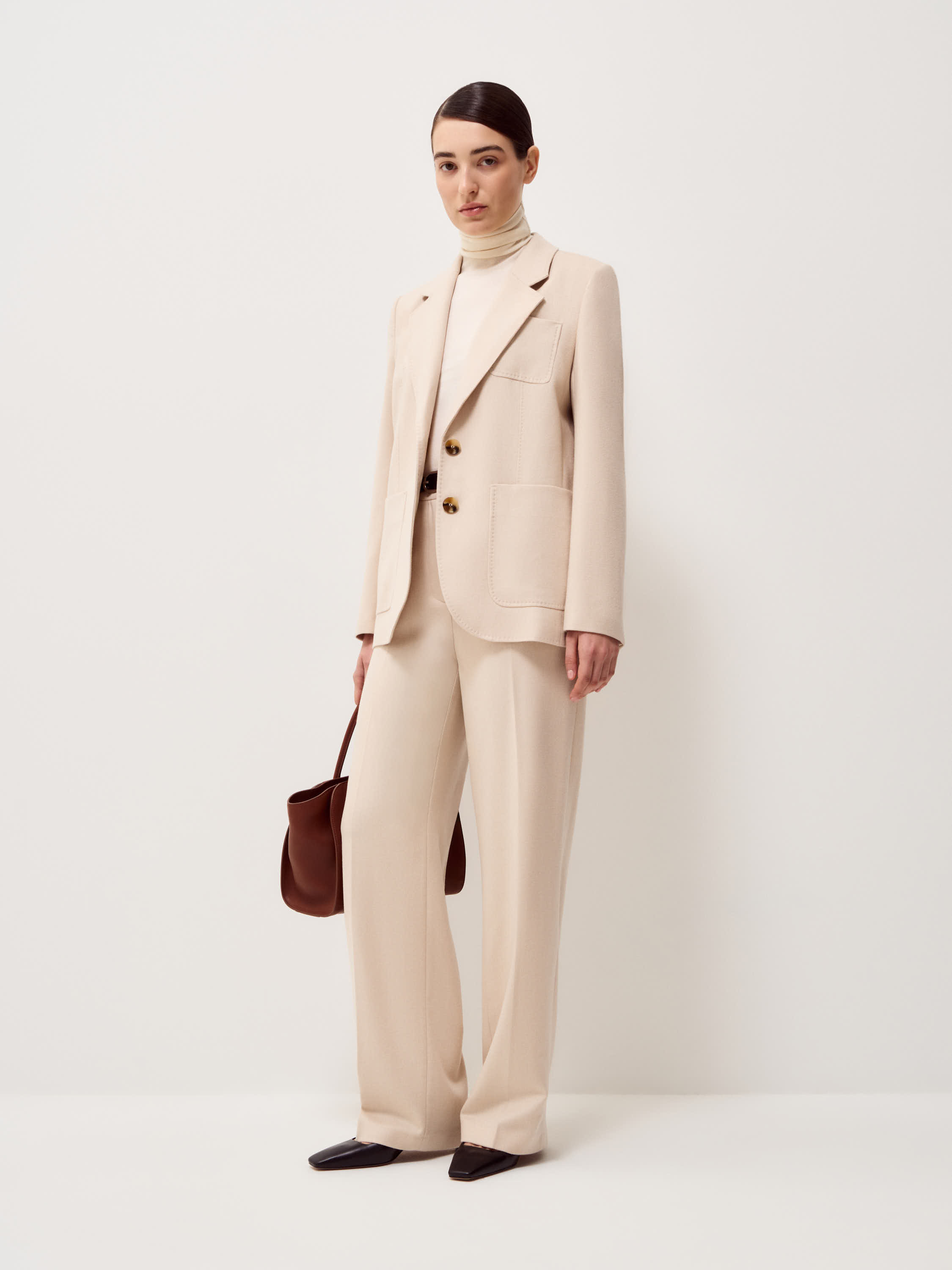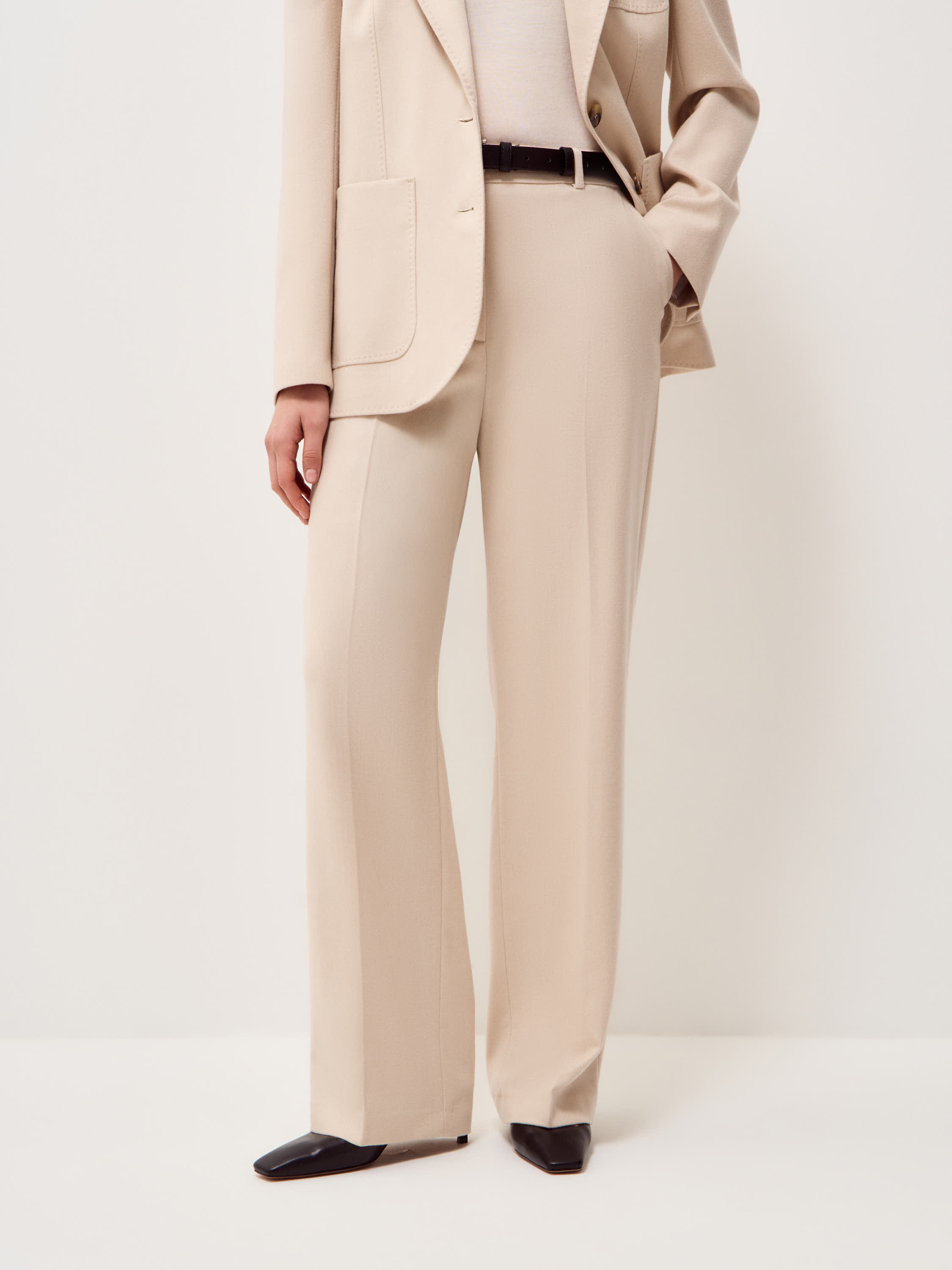 Брюки выполнены в прямом силуэте с легким расширением к линии низа и аккуратной посадкой по талии. Материал с добавлением шерсти, кашемира и шелка отличается мягкостью, пластичностью и устойчивостью к деформации, поэтому изделие сохраняет ровный, аккуратный контур в течение дня. Стрелки формируют четкую вертикаль и визуально вытягивают силуэт, а пояс со шлевками позволяет дополнить образ ремнем при необходимости. Длина брюк подходит для разных вариантов обуви и делает модель универсальной в современном гардеробе. Они органично сочетаются с рубашками, жакетами, трикотажем и лаконичными топами, составляя собранные, элегантные комплекты для повседневных и деловых ситуаций.