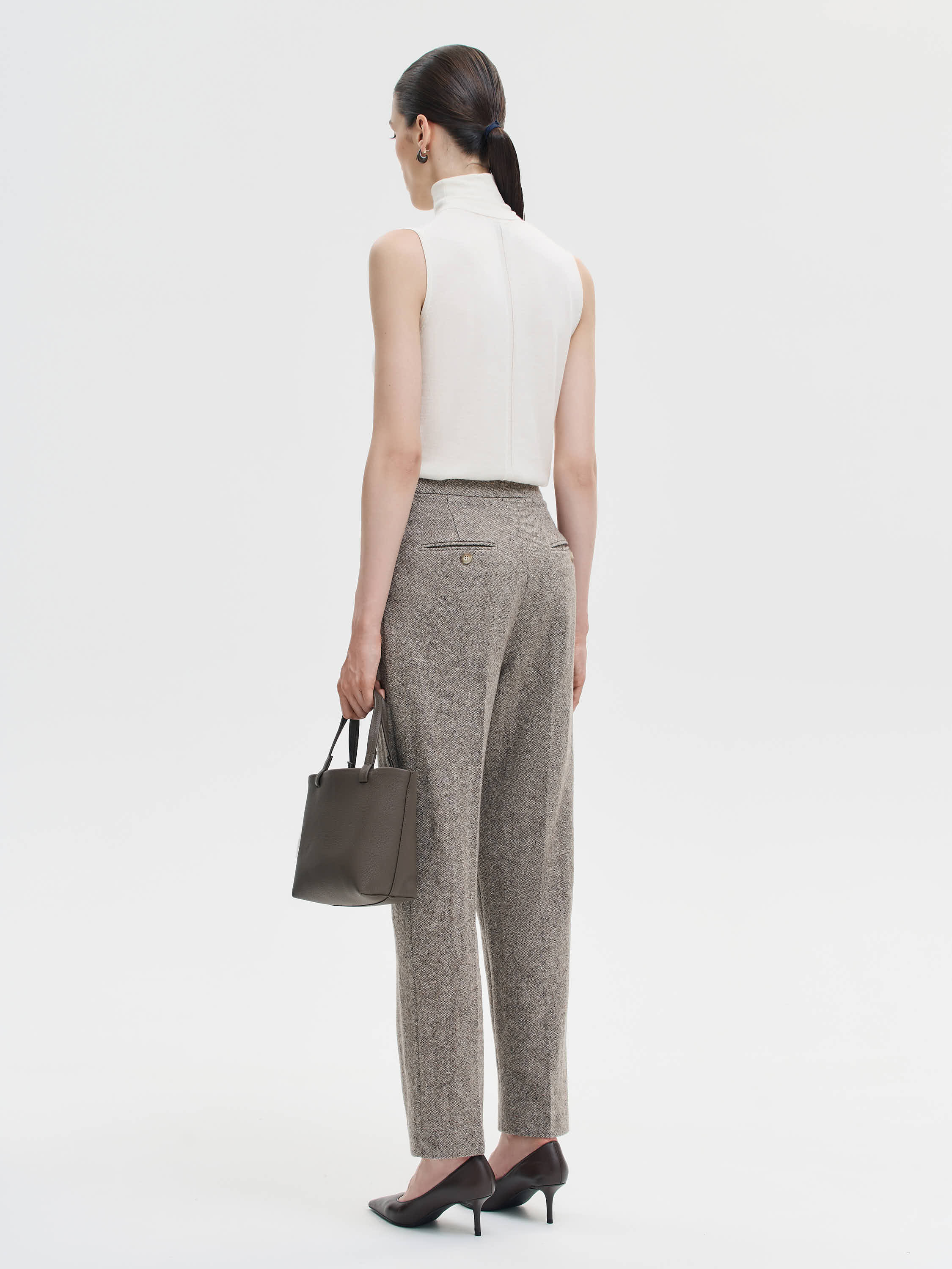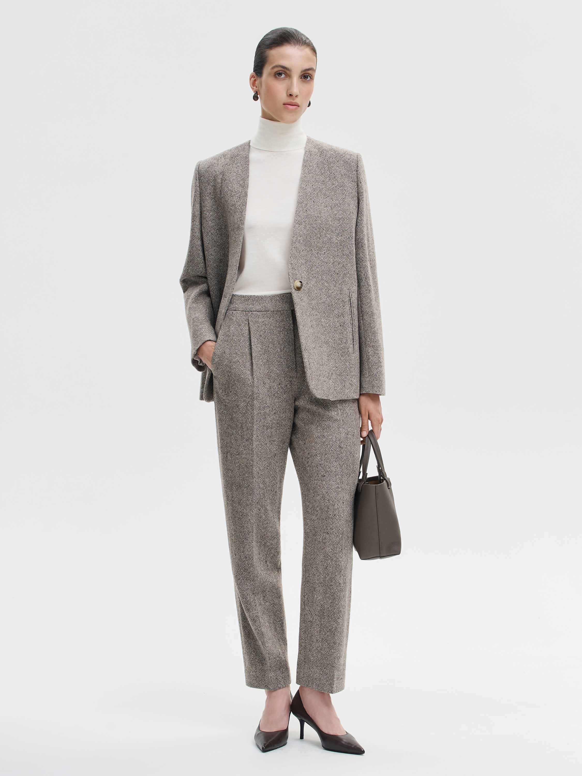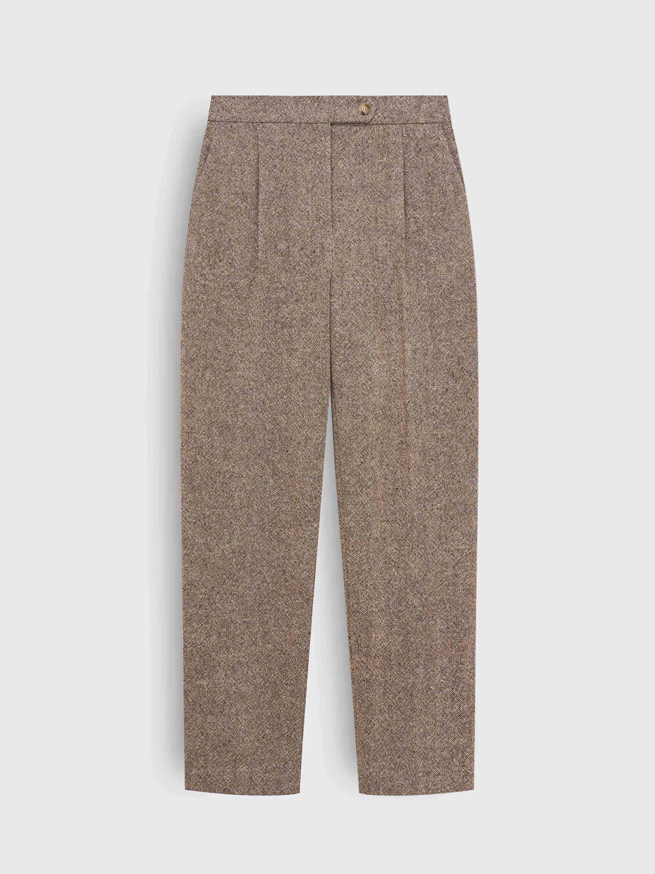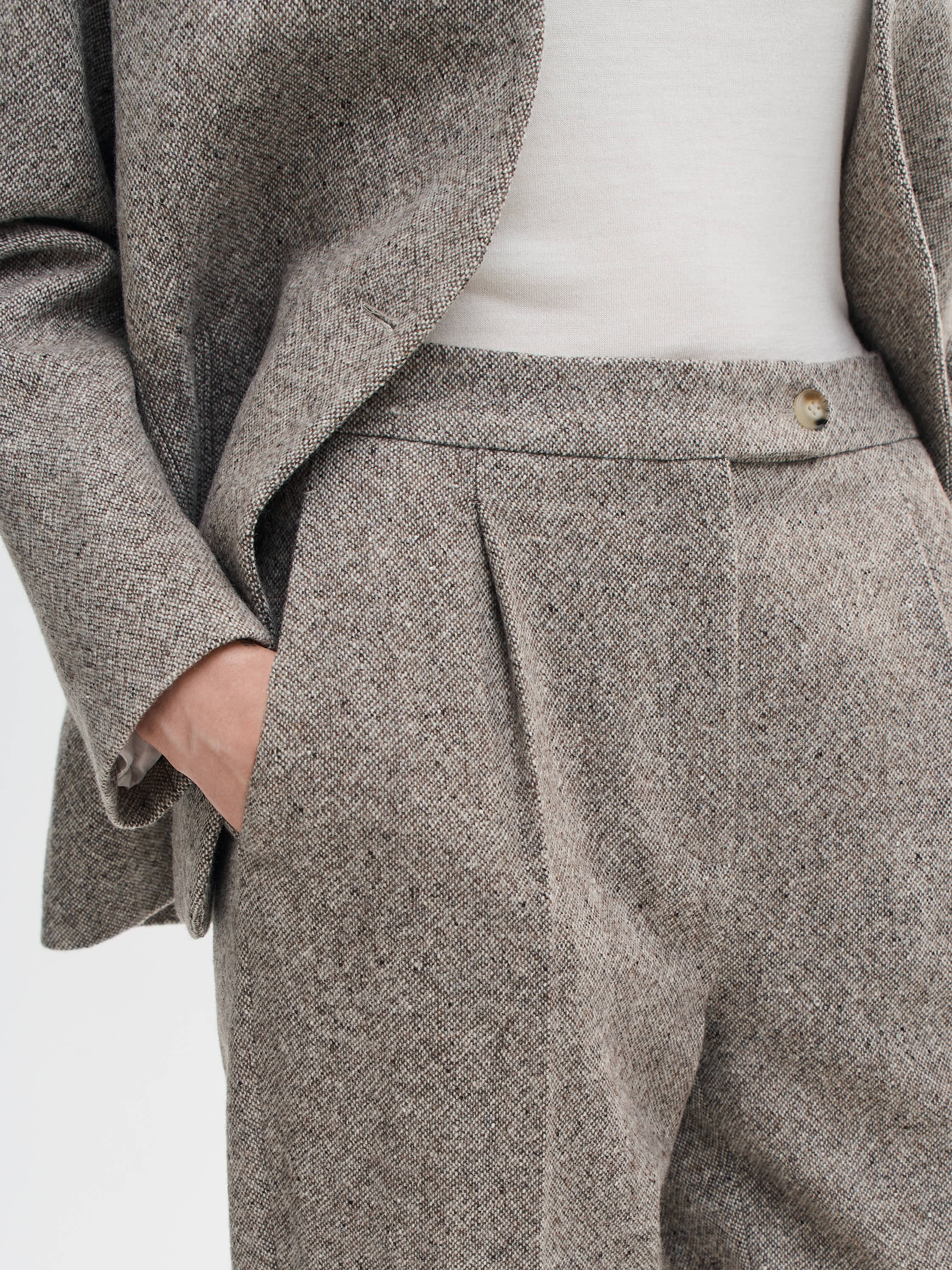 Брюки прямого кроя из плотной костюмной шерсти с характерной твидовой фактурой. Материал держит форму, греет и при этом дышит, оставаясь комфортным даже при длительном ношении. Ткань тактильно плотная, с благородным зернистым переплетением. Высокая посадка подчеркнута притачным поясом с застежкой на пуговицу, мягкие складки спереди создают аккуратный объем, а стрелки визуально вытягивают силуэт. Благодаря спокойному оттенку и сдержанному силуэту брюки легко впишутся и в деловой гардероб, и в повседневные образы с джемперами или футболками.