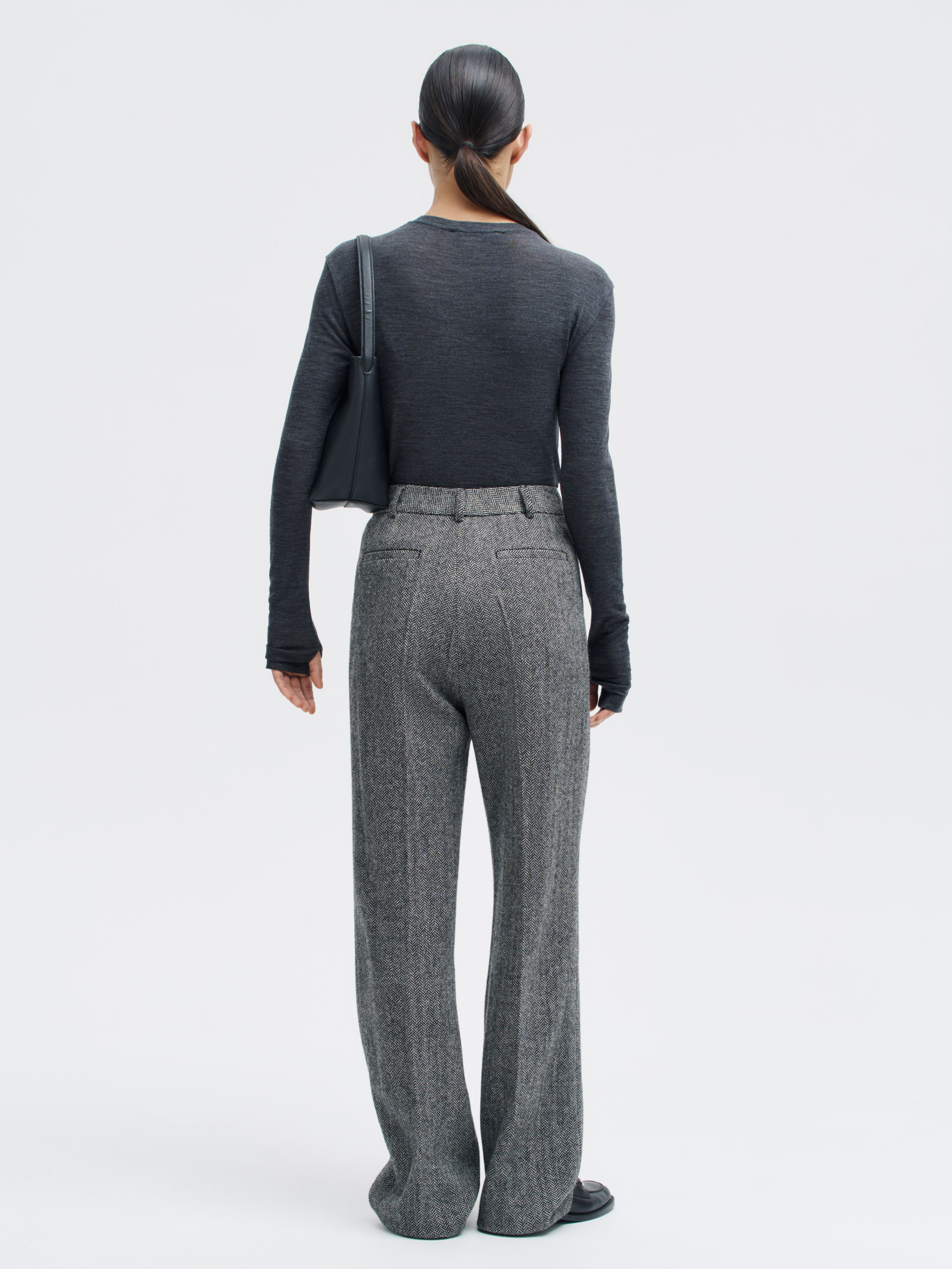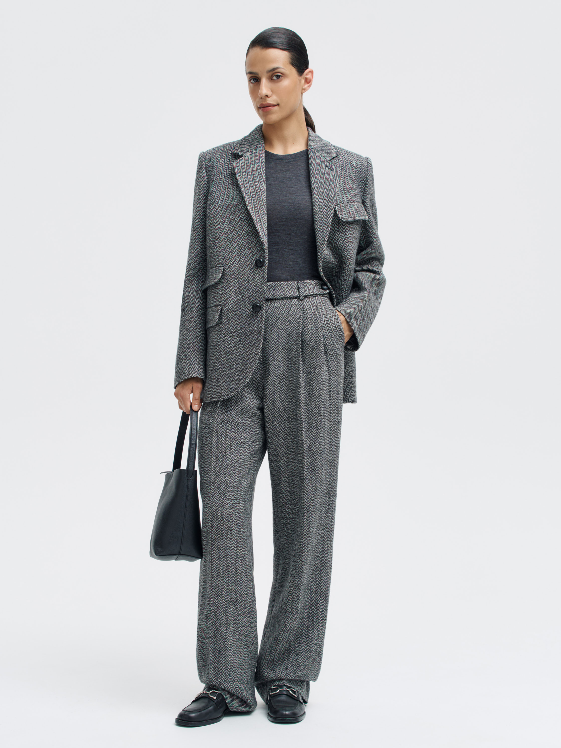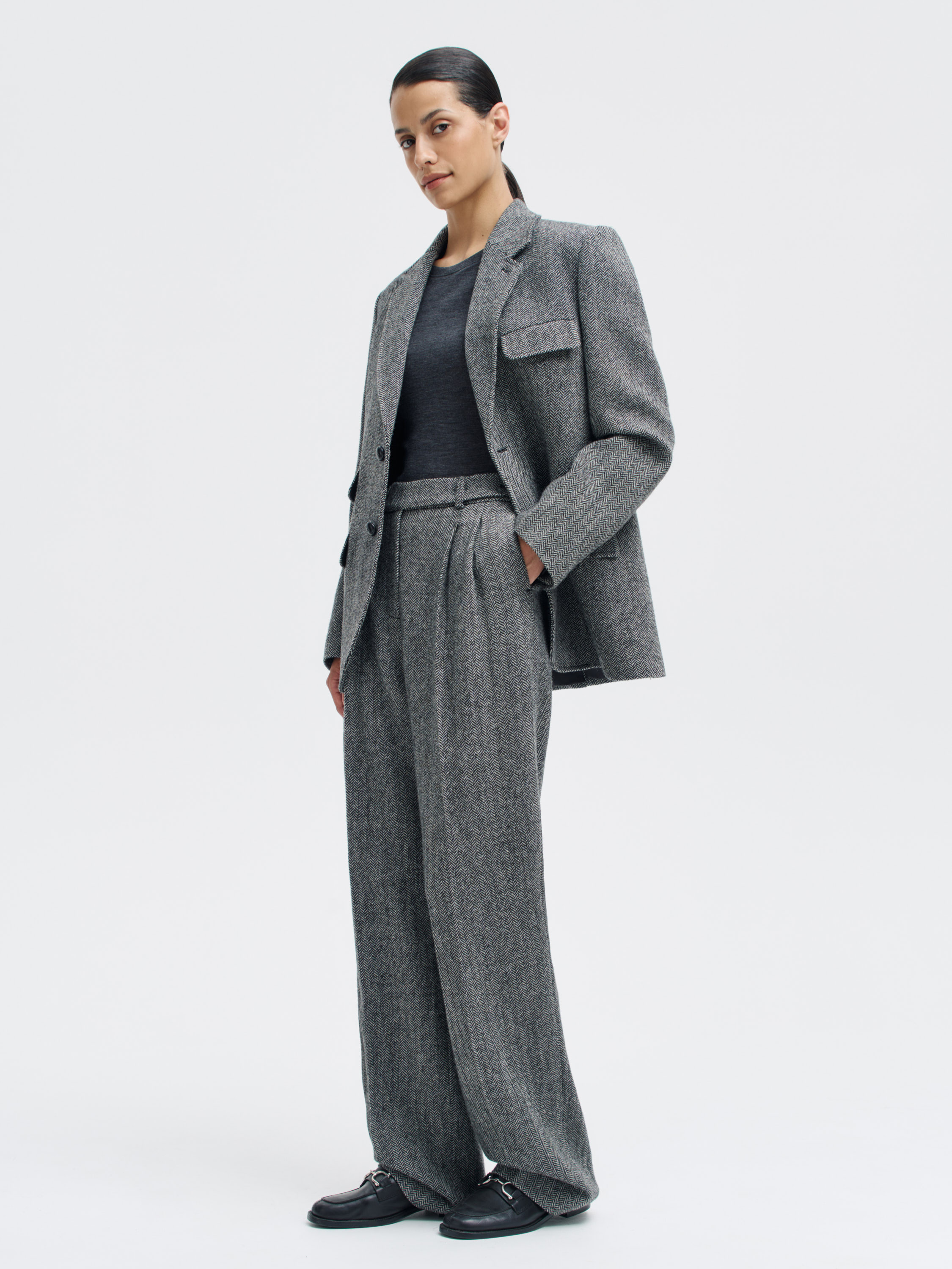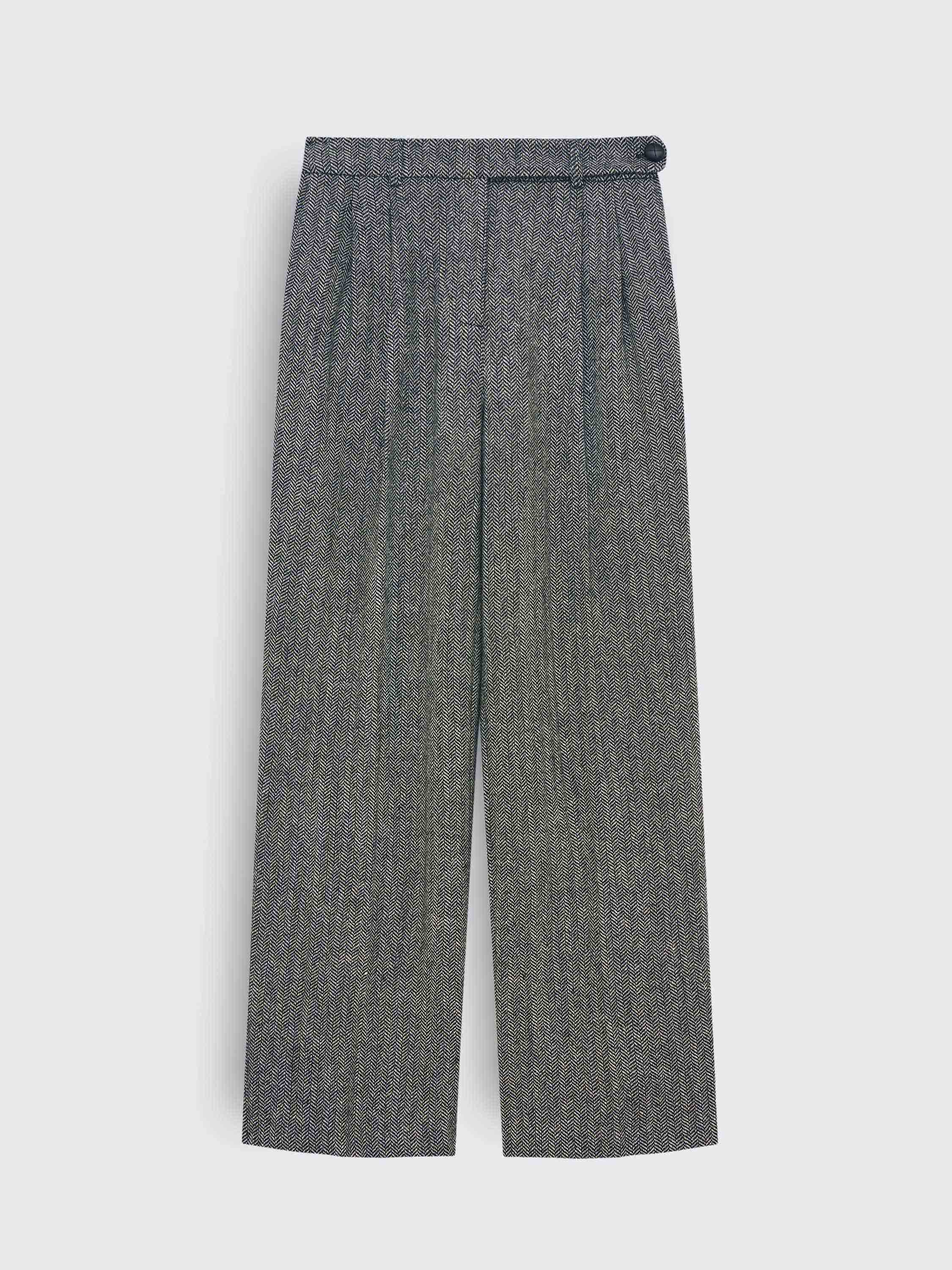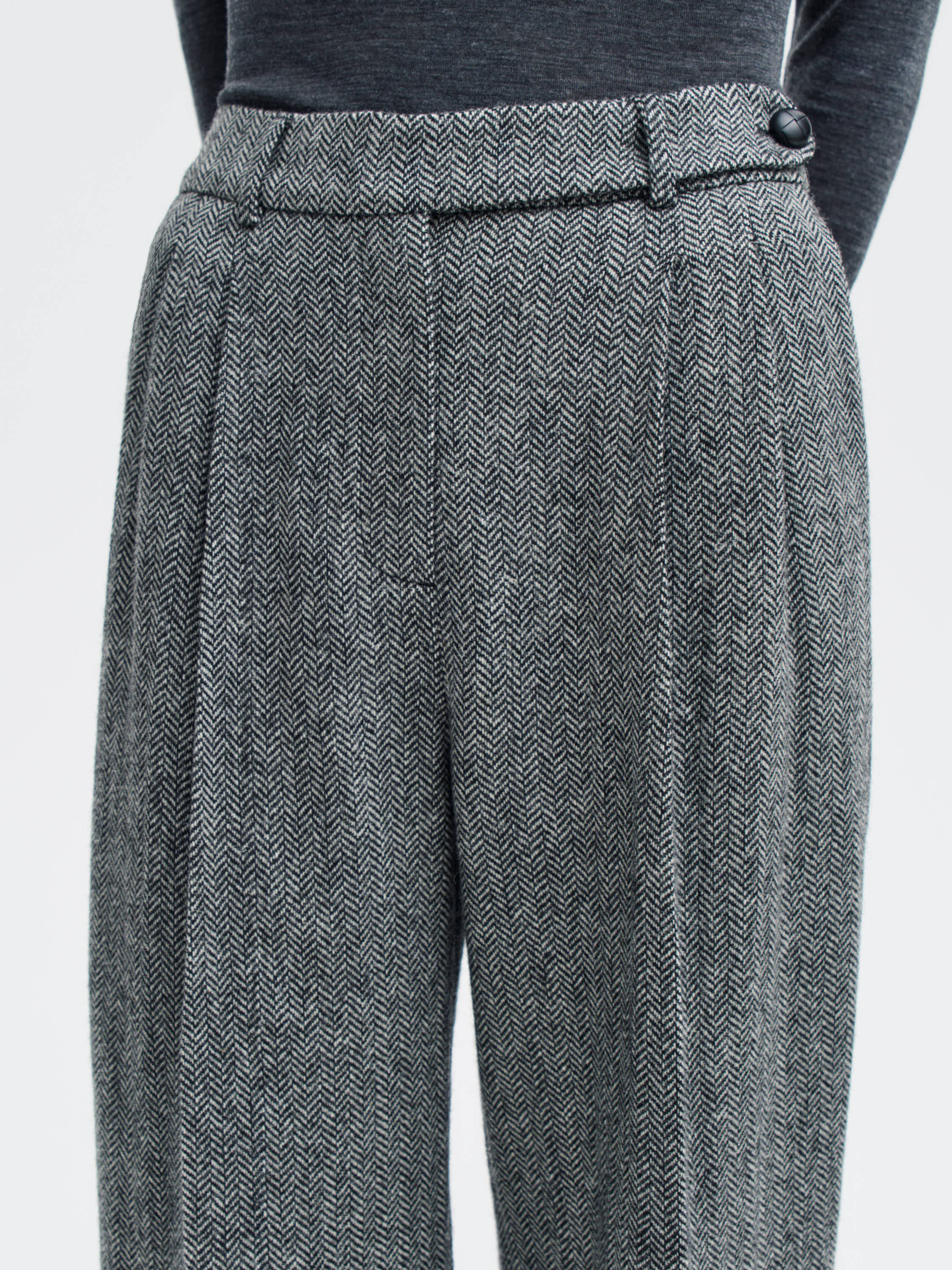 Брюки из чистой шерсти с классическим узором «елочка». Плотная ткань хорошо держит форму, оставаясь пластичной и комфортной в движении. Посадка высокая, с четкой линией талии и мягкими складками, которые создают легкий объем и подчеркивают силуэт. Штанины прямые, свободные, с визуальным вытяжением за счет равномерного распределения фактуры. Акцентная пуговица сбоку и четкие стрелки добавляют графики и собирают образ. Эта модель органично впишется в костюмные комплекты и будет работать отдельно — с тонким трикотажем, рубашками или фактурными жакетами. Уместна как в повседневных, так и в более собранных образах.