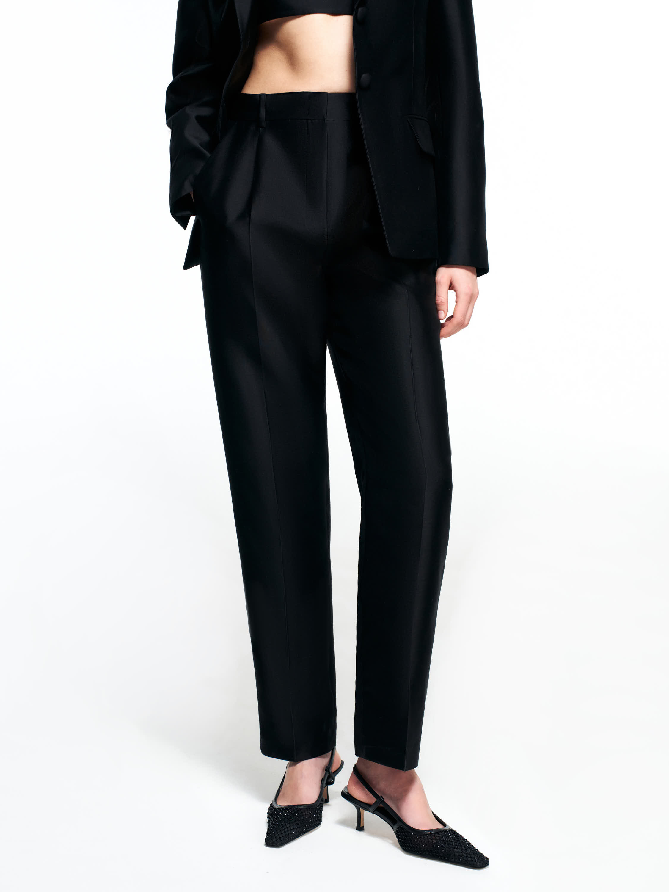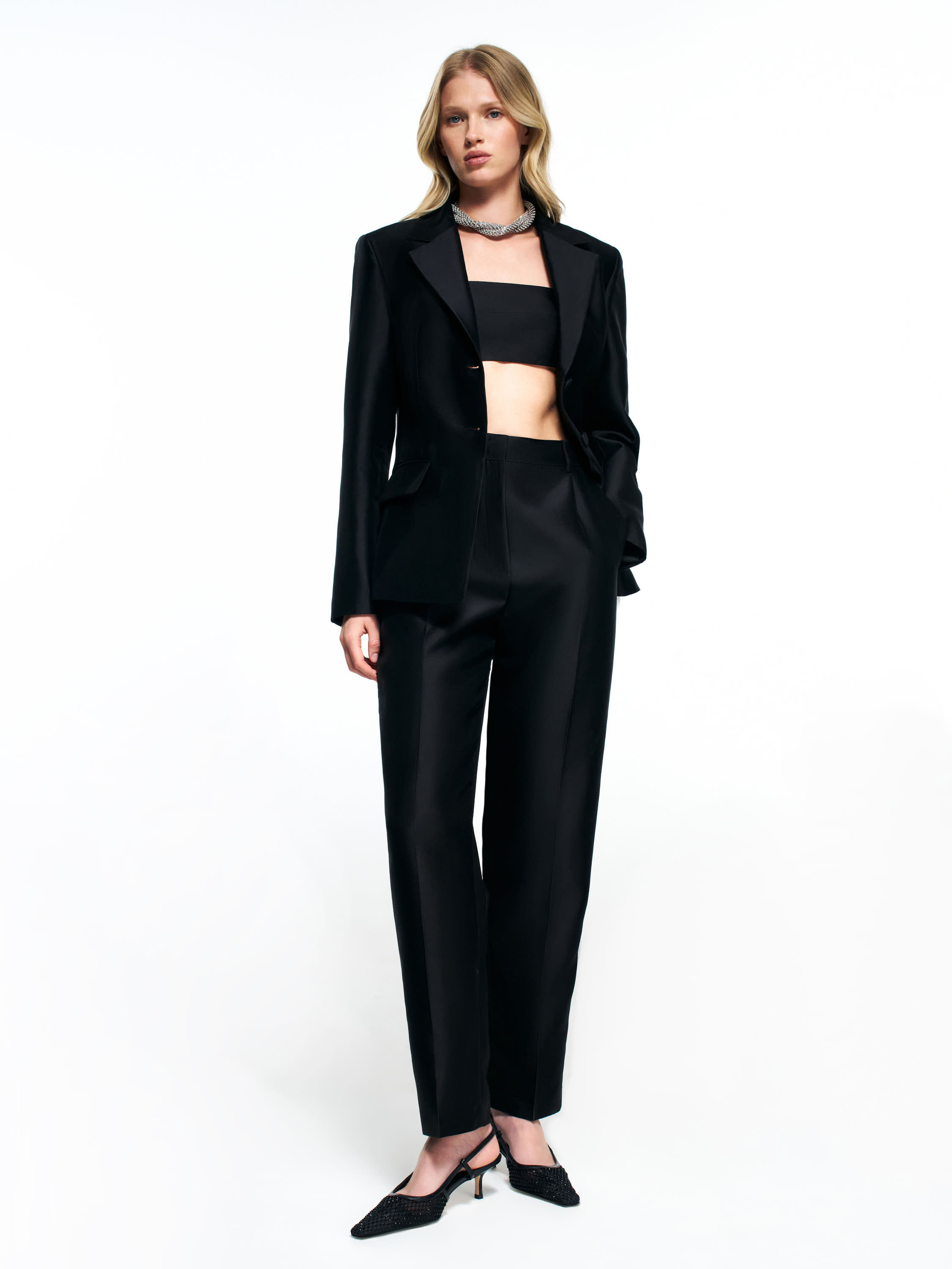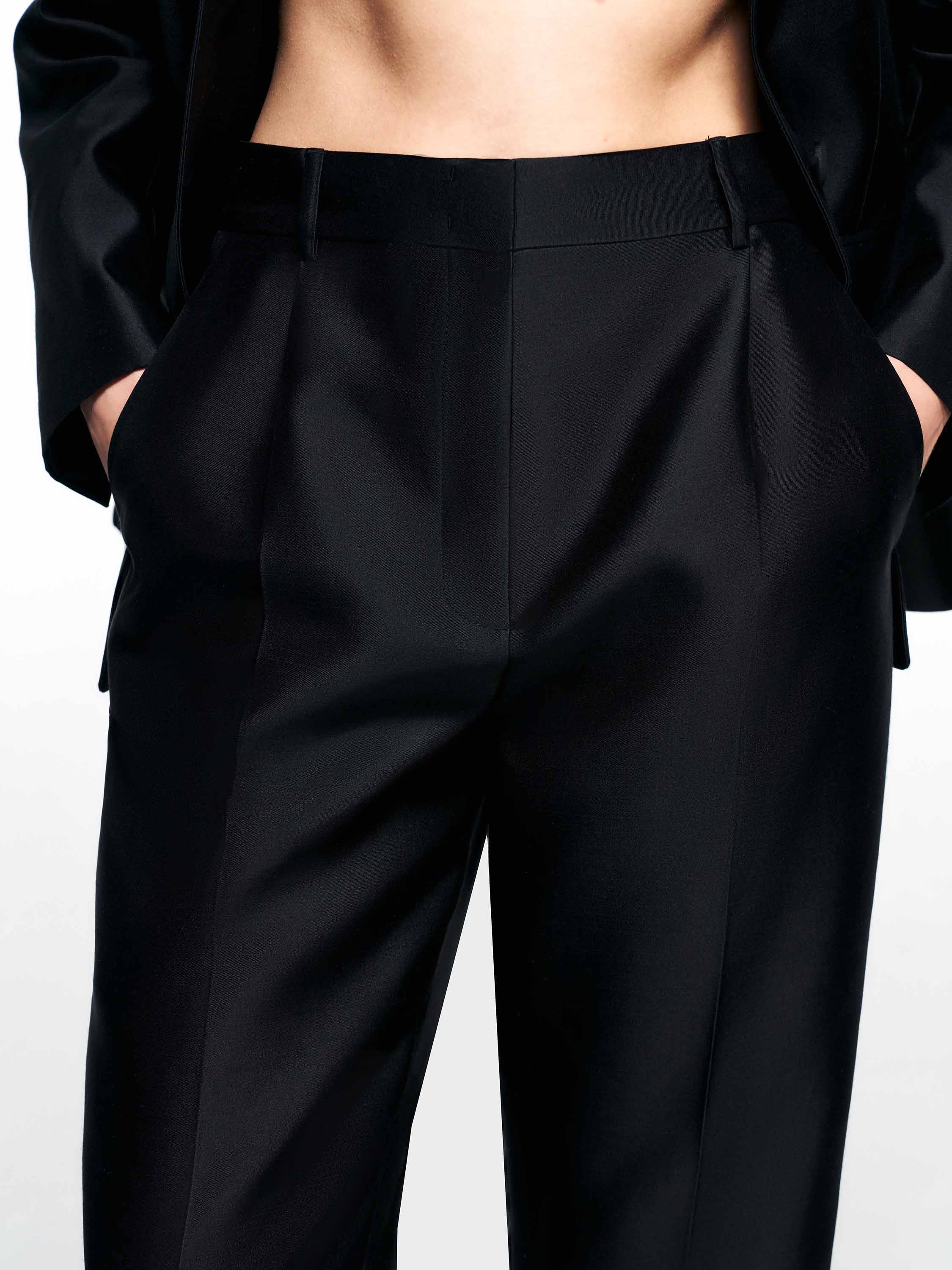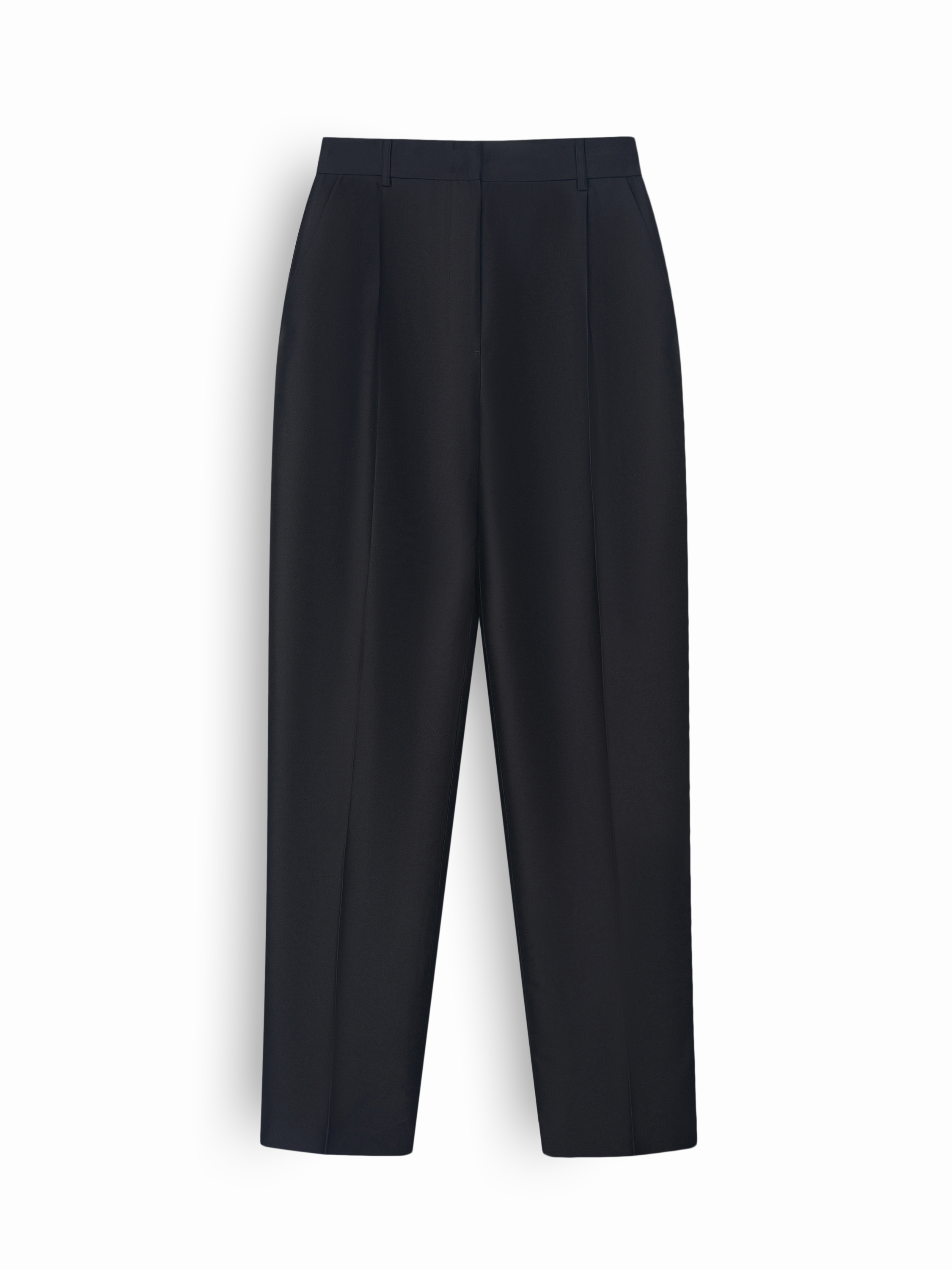 Брюки из шерсти и шелка — лаконичная модель с чистой линией и мягкой пластикой ткани. Полотно сочетает шерсть, классический шелк и тутовый шелк, благодаря чему выглядит матово-гладким, держит форму и при этом комфортно в движении. Посадка средняя, пояс выполнен аккуратно, с мягким прилеганием. Прямой силуэт с легким расширением к низу создает ровный вертикальный контур и визуально вытягивает линию ног. Стрелки формируют структуру и деликатно подчеркивают крой. Брюки подходят для собранных деловых комплектов, вечерних образов и повседневных сочетаний с трикотажем, рубашками и жакетами.