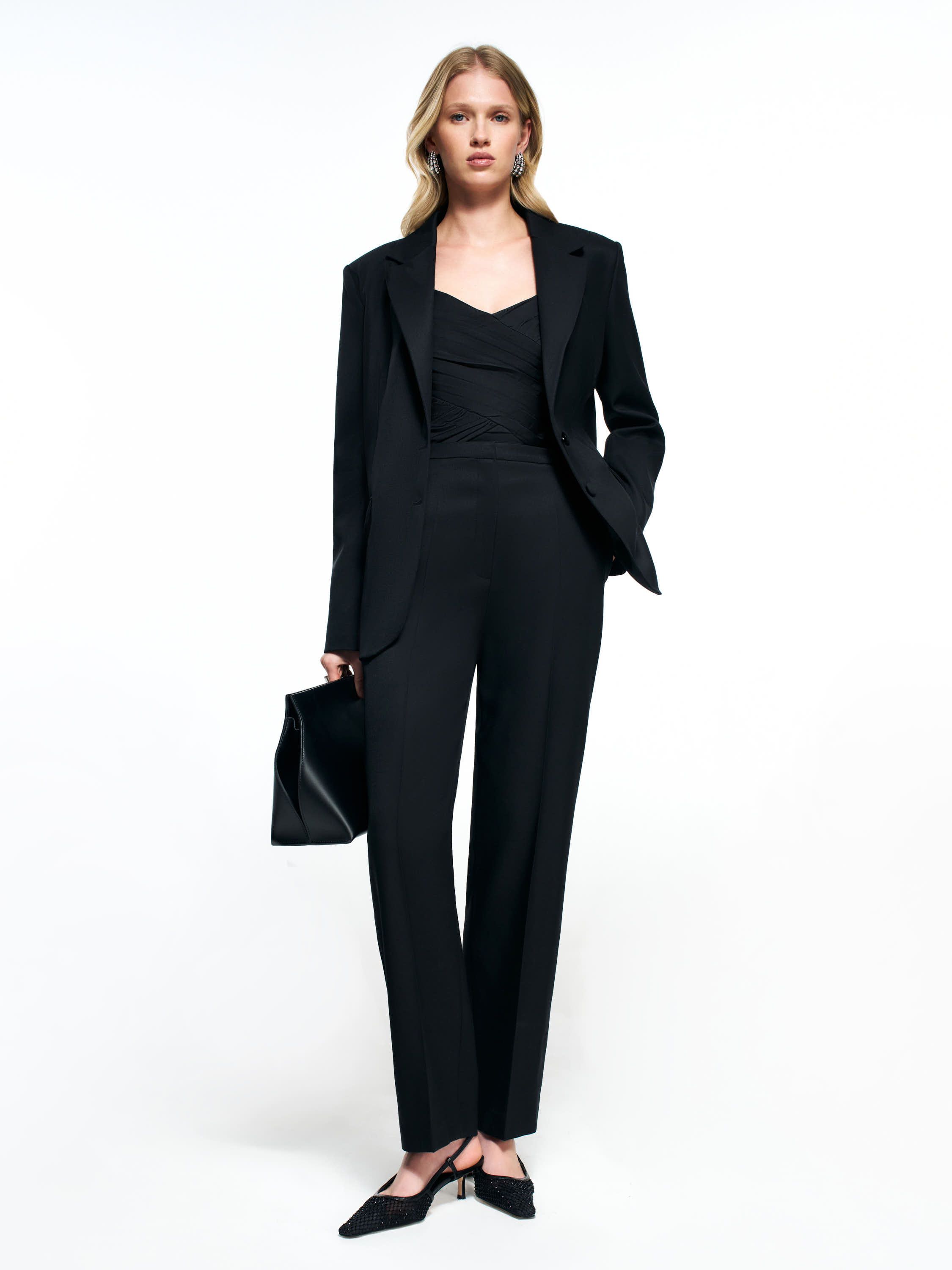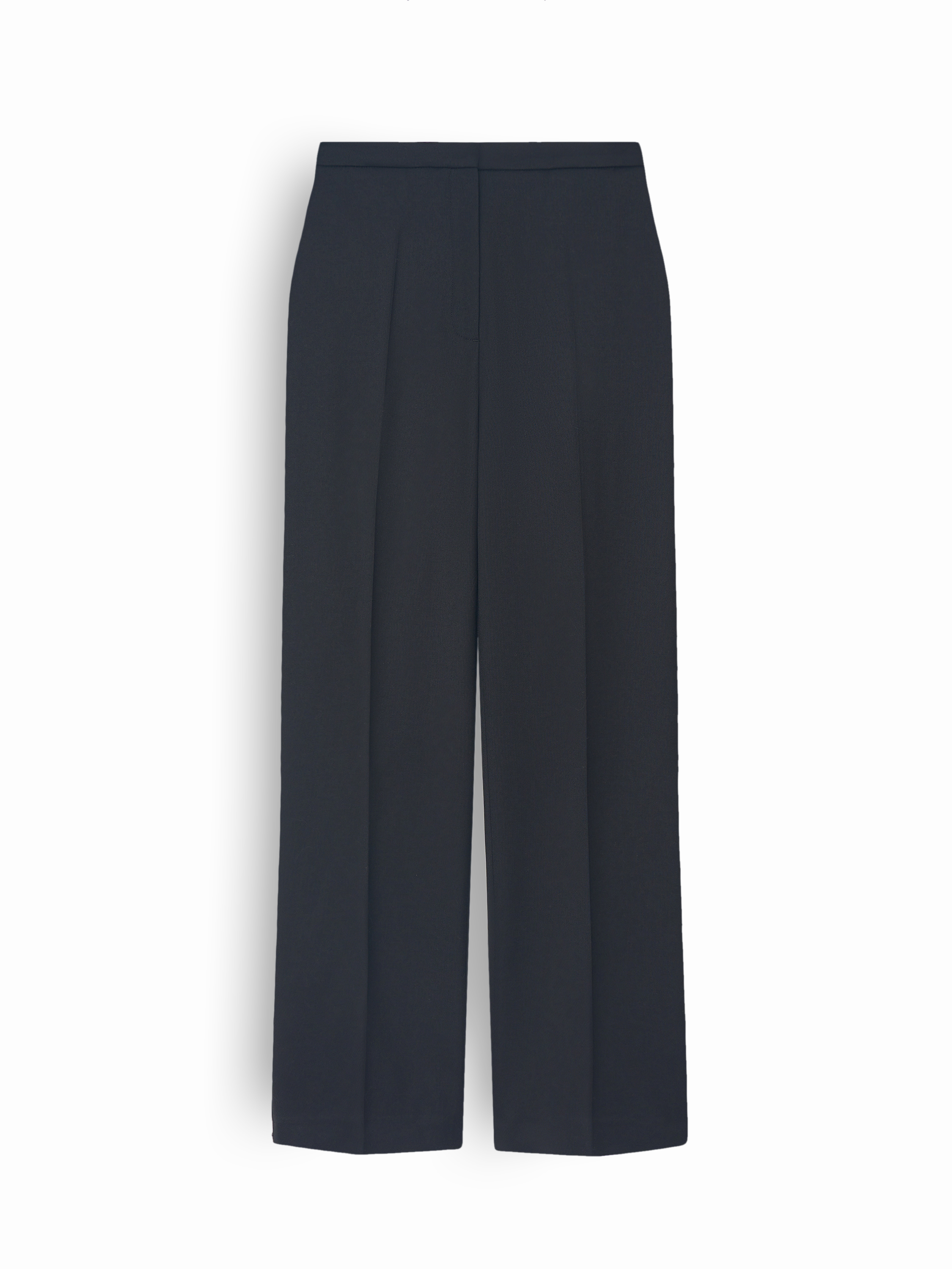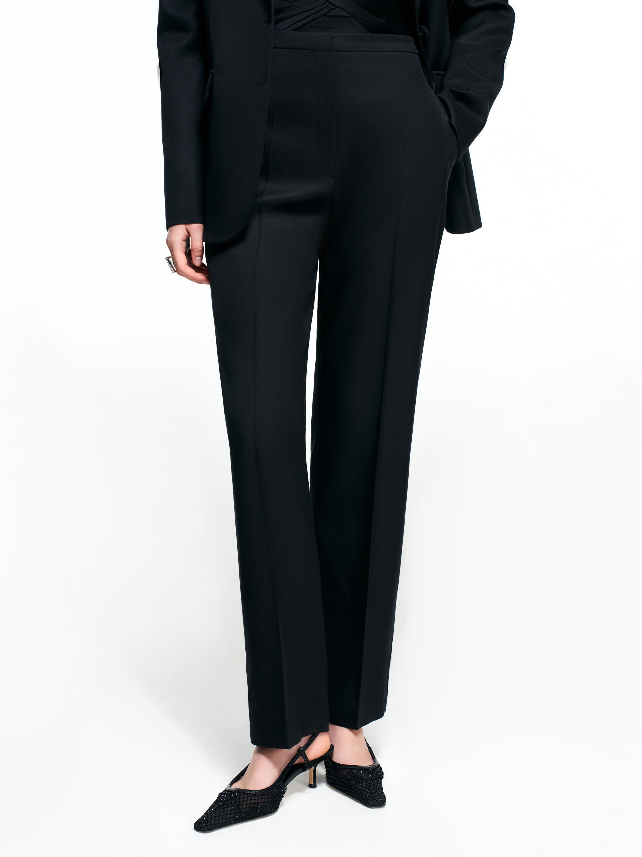 Брюки из смесовой костюмной ткани на основе шерсти и ацетата построены на чистом, вытянутом силуэте. Полотно плотное, гладкое, держит форму и подчеркивает вертикаль благодаря аккуратной линии стрелок. Посадка прямая, с мягким прилеганием по талии и ровным распределением объема по бедру. Брючины идут строго вниз, формируя собранный, аккуратный контур без утяжеления. Пояс со шлевками поддерживает классическую конструкцию, застежка выполнена скрыто и не нарушает лаконичность. Модель подходит для комплектов с жакетами, топами и строгими блузами, создавая сдержанные, вытянутые образы.