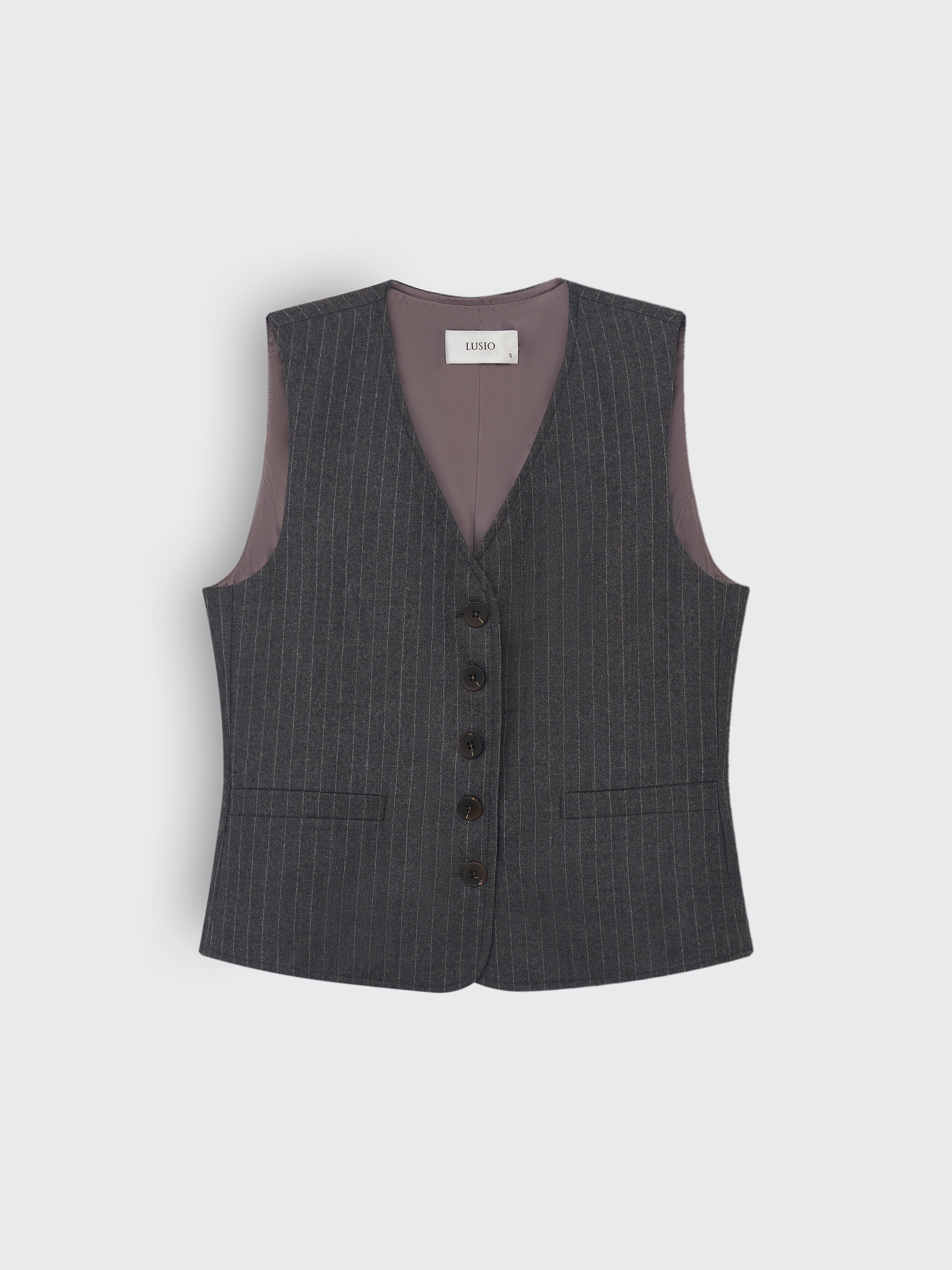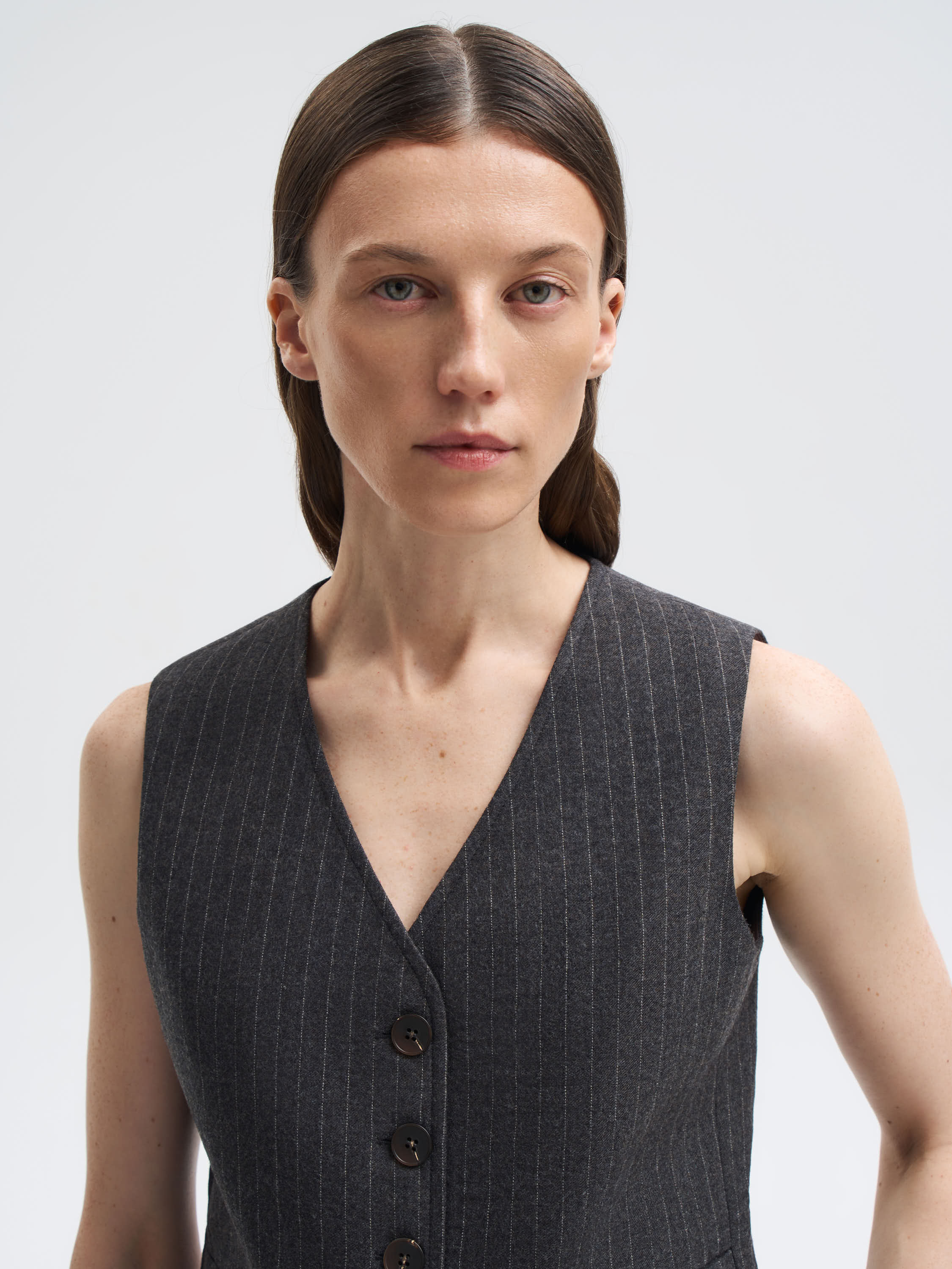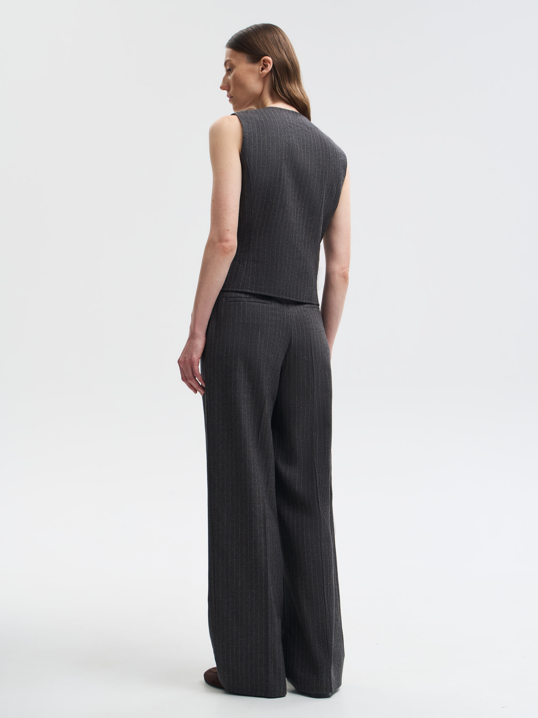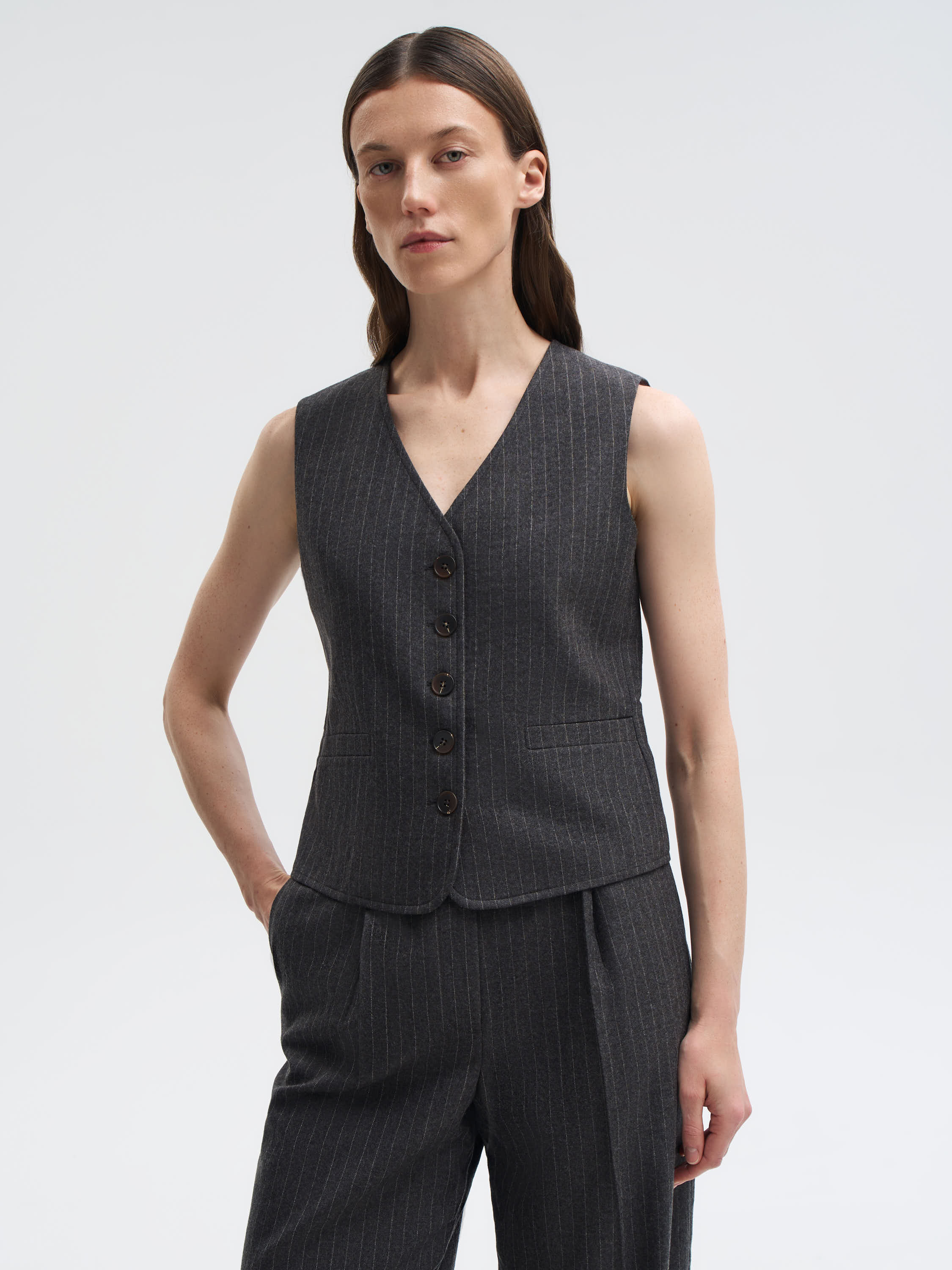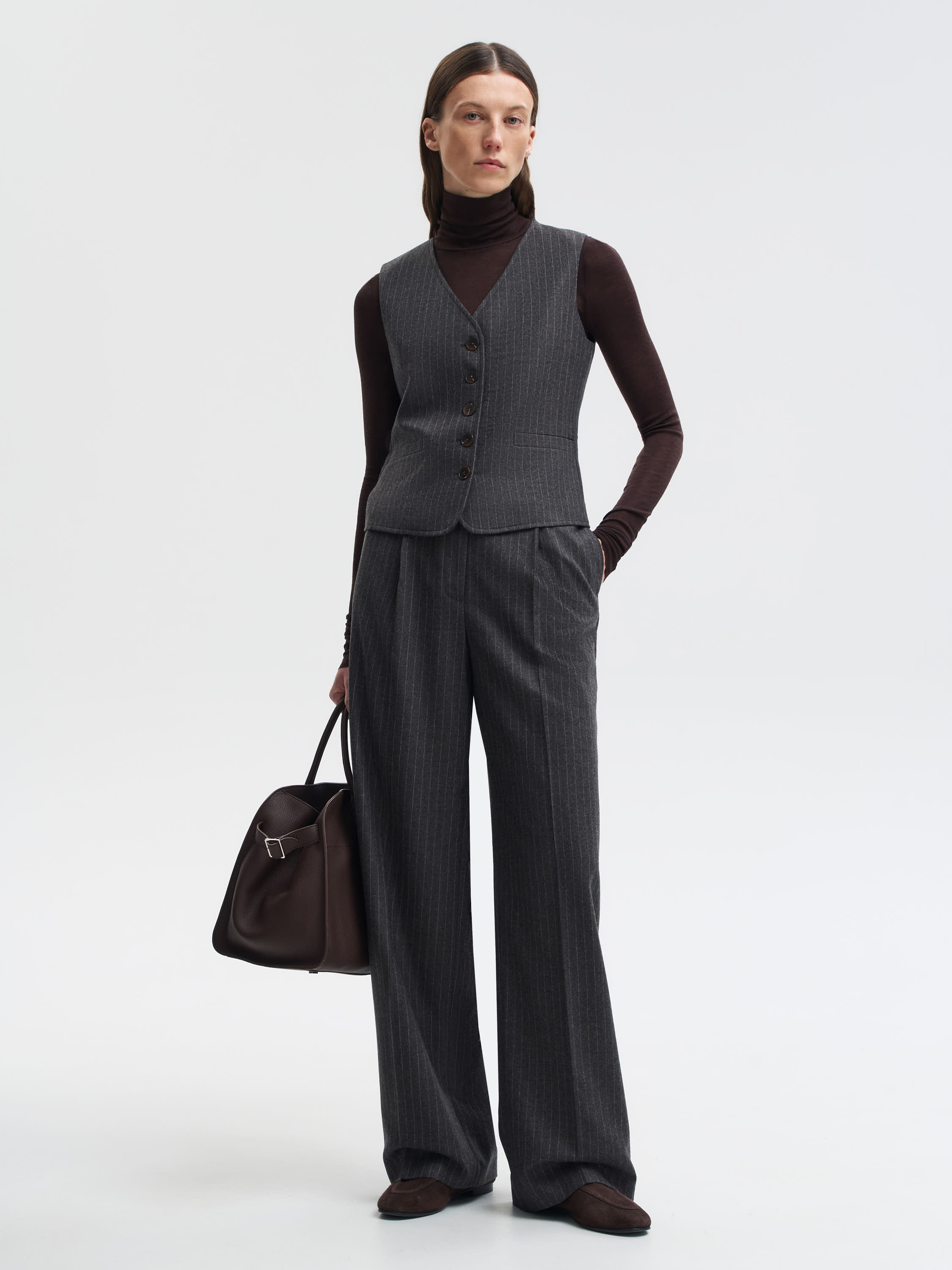 Жилет выполнен из 100% шерсти — материал отличается плотностью, мягкостью и устойчивостью формы. Классический крой с V-образным вырезом и застежкой на пуговицы подчеркивает линию талии и придает образу структурность. Лаконичный рисунок в тонкую полоску добавляет вертикаль и делает силуэт визуально стройнее. Аккуратные прорезные карманы поддерживают архитектуру кроя. Такой жилет легко адаптируется под деловой или повседневный гардероб: его можно сочетать с брюками из того же материала, рубашками или водолазками, создавая сдержанные и элегантные образы.
