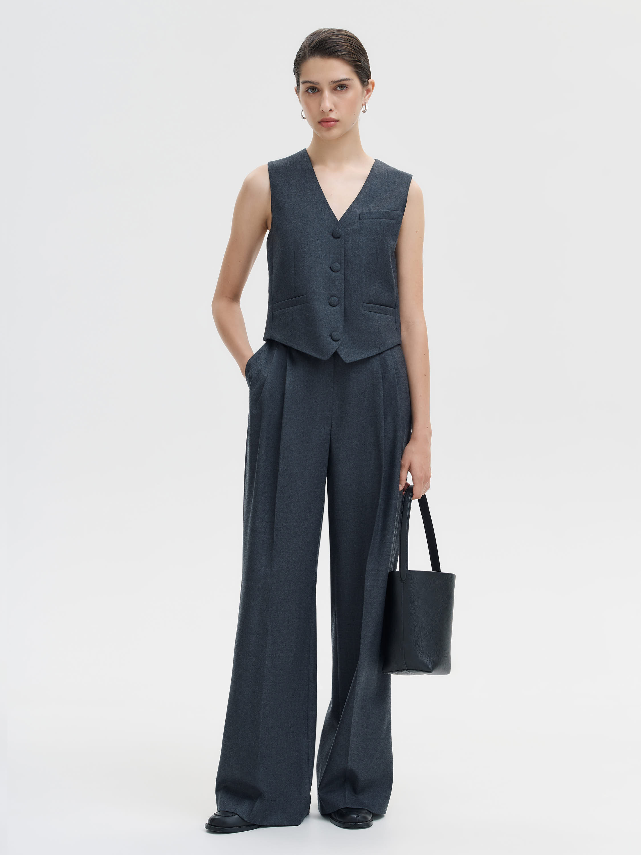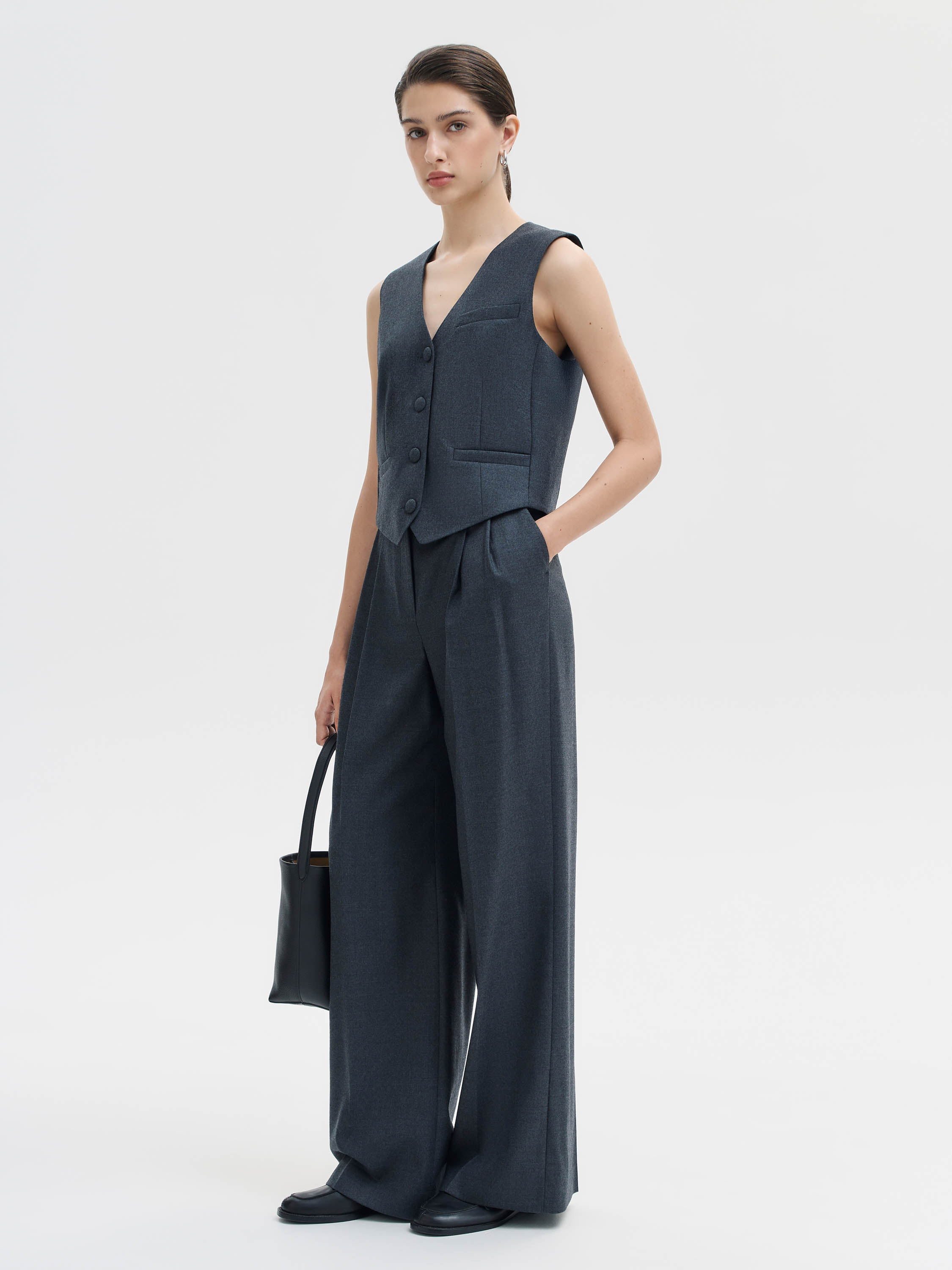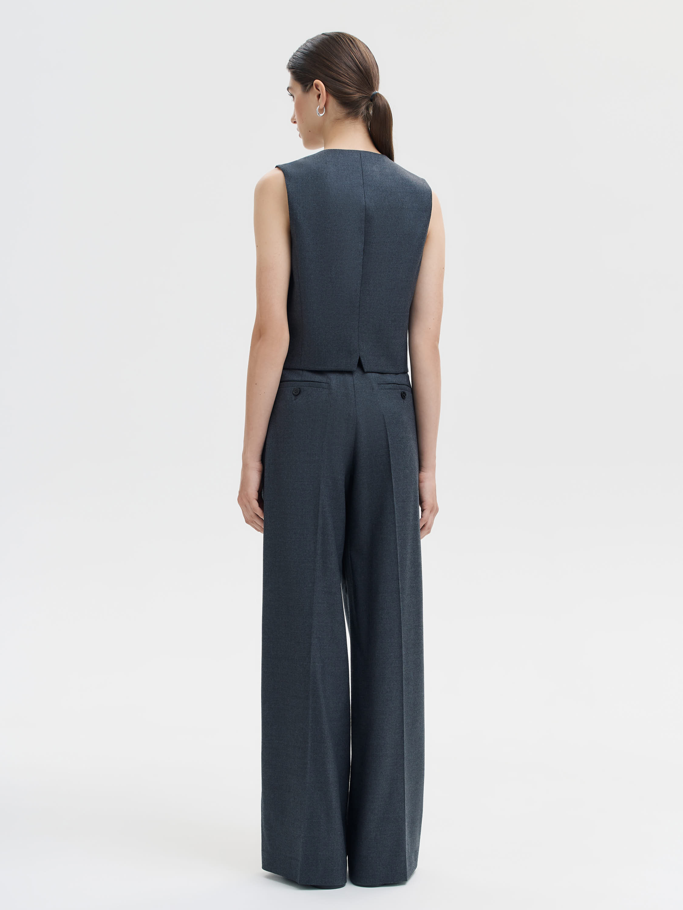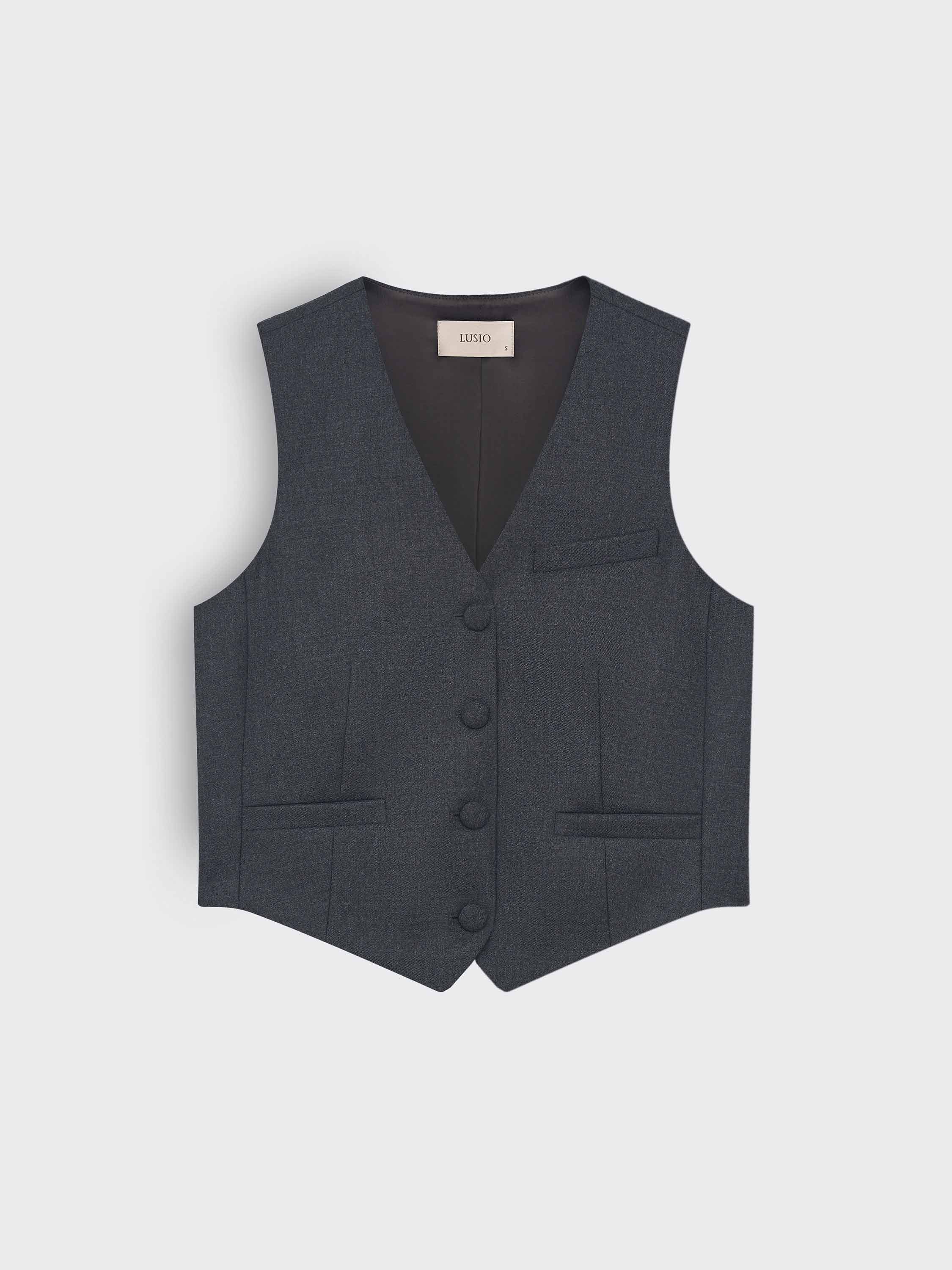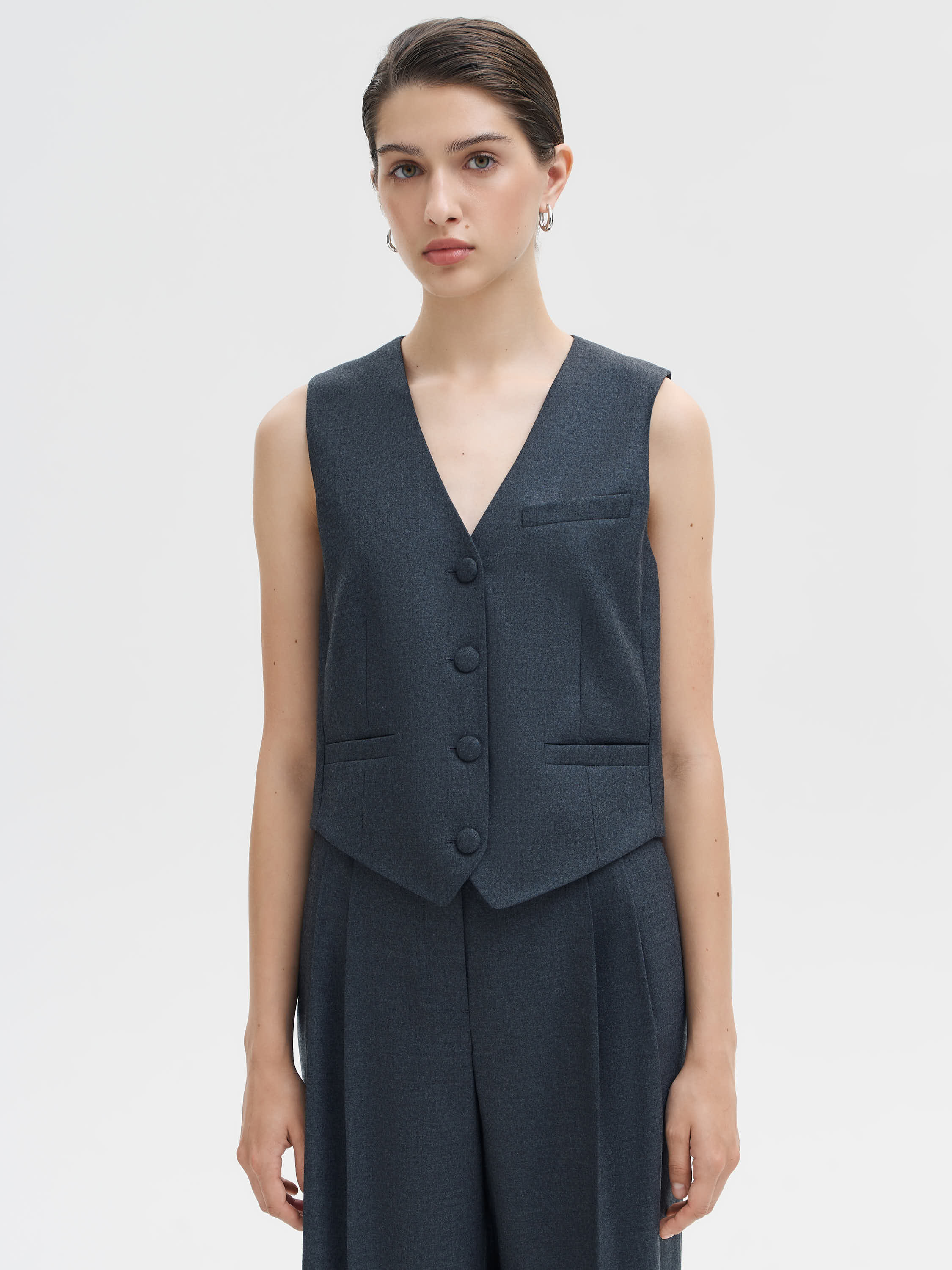 Жилет из плотной костюмной шерсти с добавлением эластана. Материал держит форму, при этом обладает легкой эластичностью, что повышает комфорт при движении. Глубокий V-образный вырез и ровная посадка создают четкий, собранный силуэт. Модель дополнена тремя прорезными карманами и застежкой на обтянутые тканью пуговицы, что подчеркивает цельность исполнения. Жилет гармонично смотрится как в составе костюма, так и в самостоятельных сочетаниях с рубашками или тонким трикотажем.