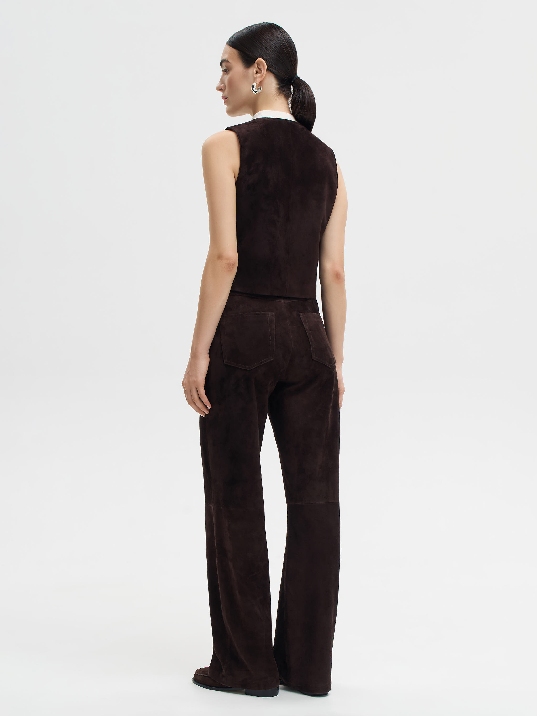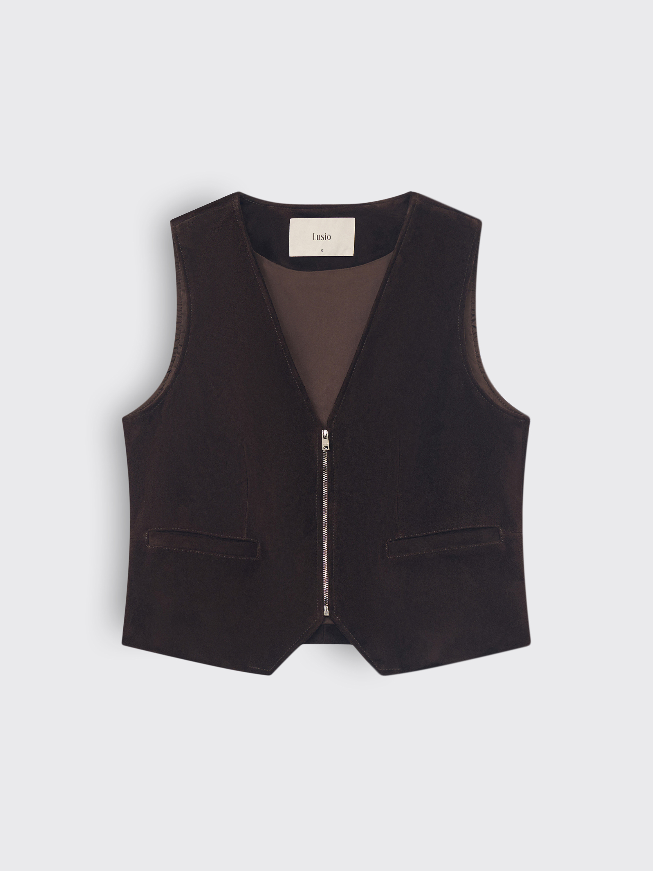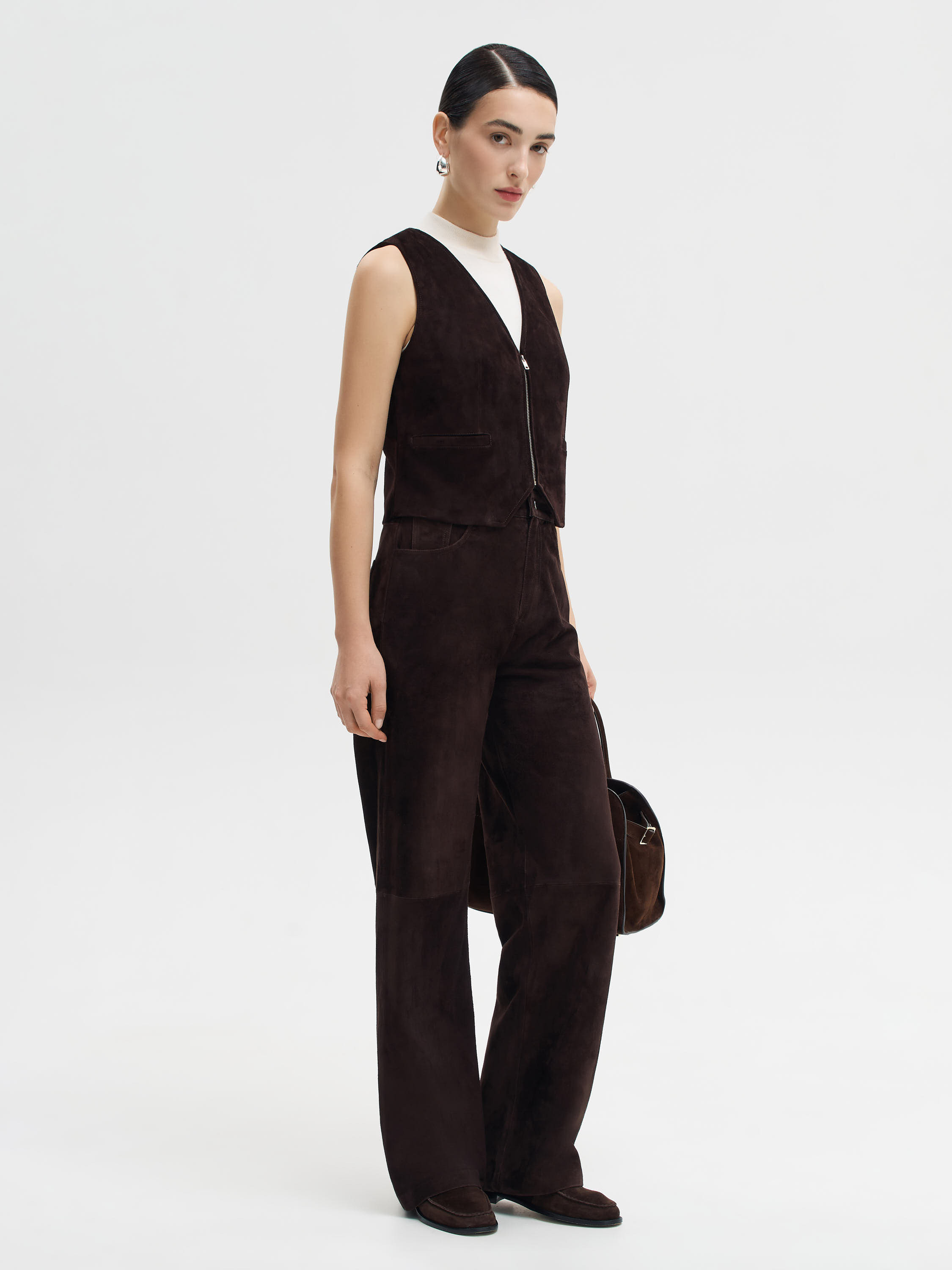 Жилет из натуральной замши в лаконичном силуэте с V-образным вырезом. Модель дополнена центральной молнией и аккуратными прорезными карманами, что подчеркивает строгую геометрию кроя. Мягкая матовая фактура замши придает образу благородство и глубину оттенка. Жилет можно носить как самостоятельный акцент или в многослойных комплектах с рубашками и трикотажем, формируя элегантные и современные сочетания.