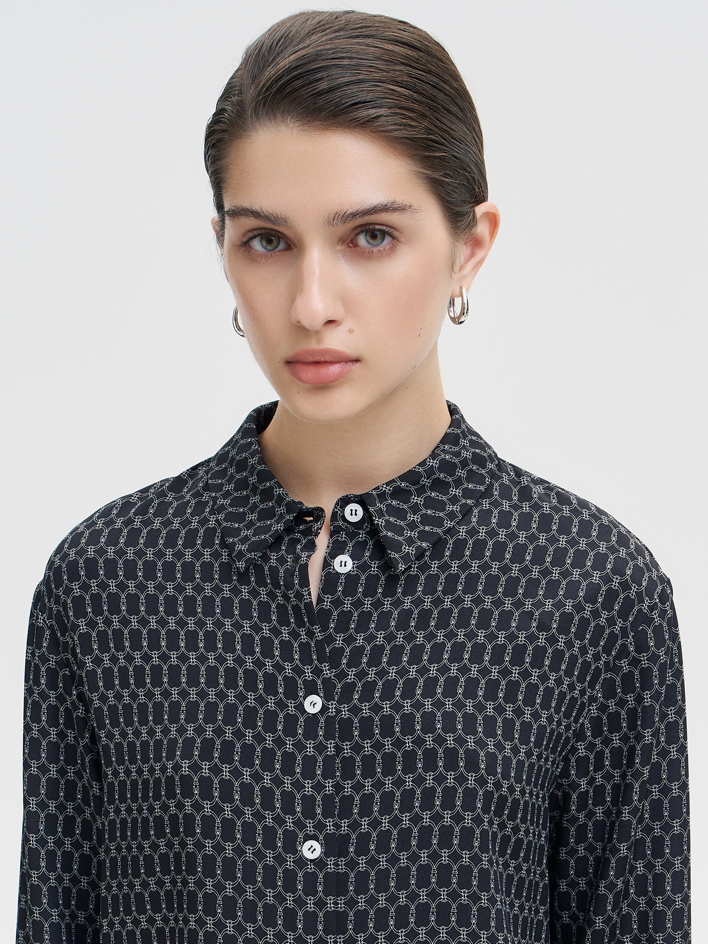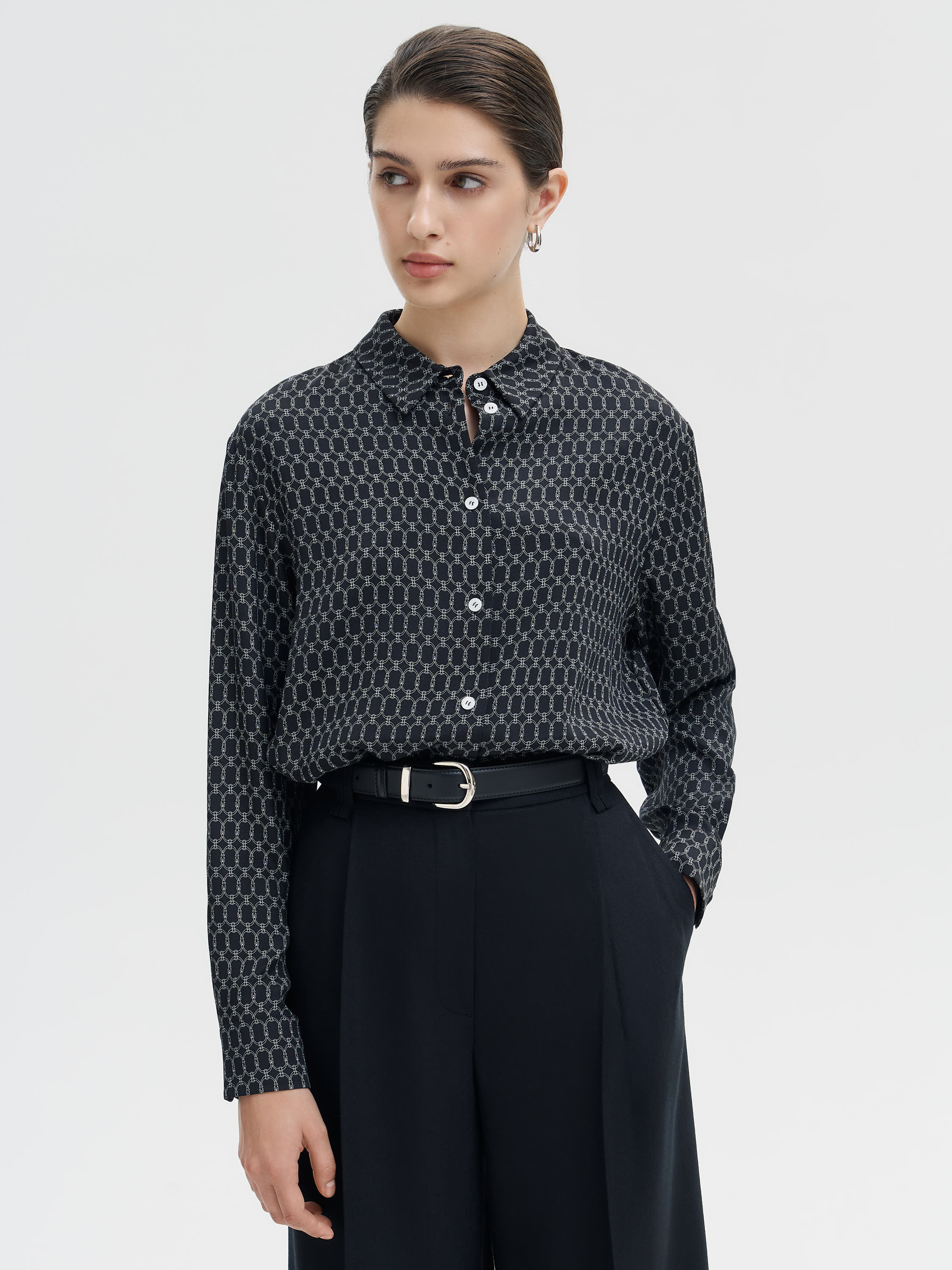 Блуза из смесового полотна на основе шелка с деликатным геометричным узором. Легкая ткань мягко струится, создавая благородное мерцание и тонкую игру фактур. Классический воротник и застежка на пуговицы подчеркивают чистоту линии, а свободный крой добавляет непринужденности. Мелкий ритмичный принт придает модели современное звучание, сохраняя элегантность и сдержанность образа.