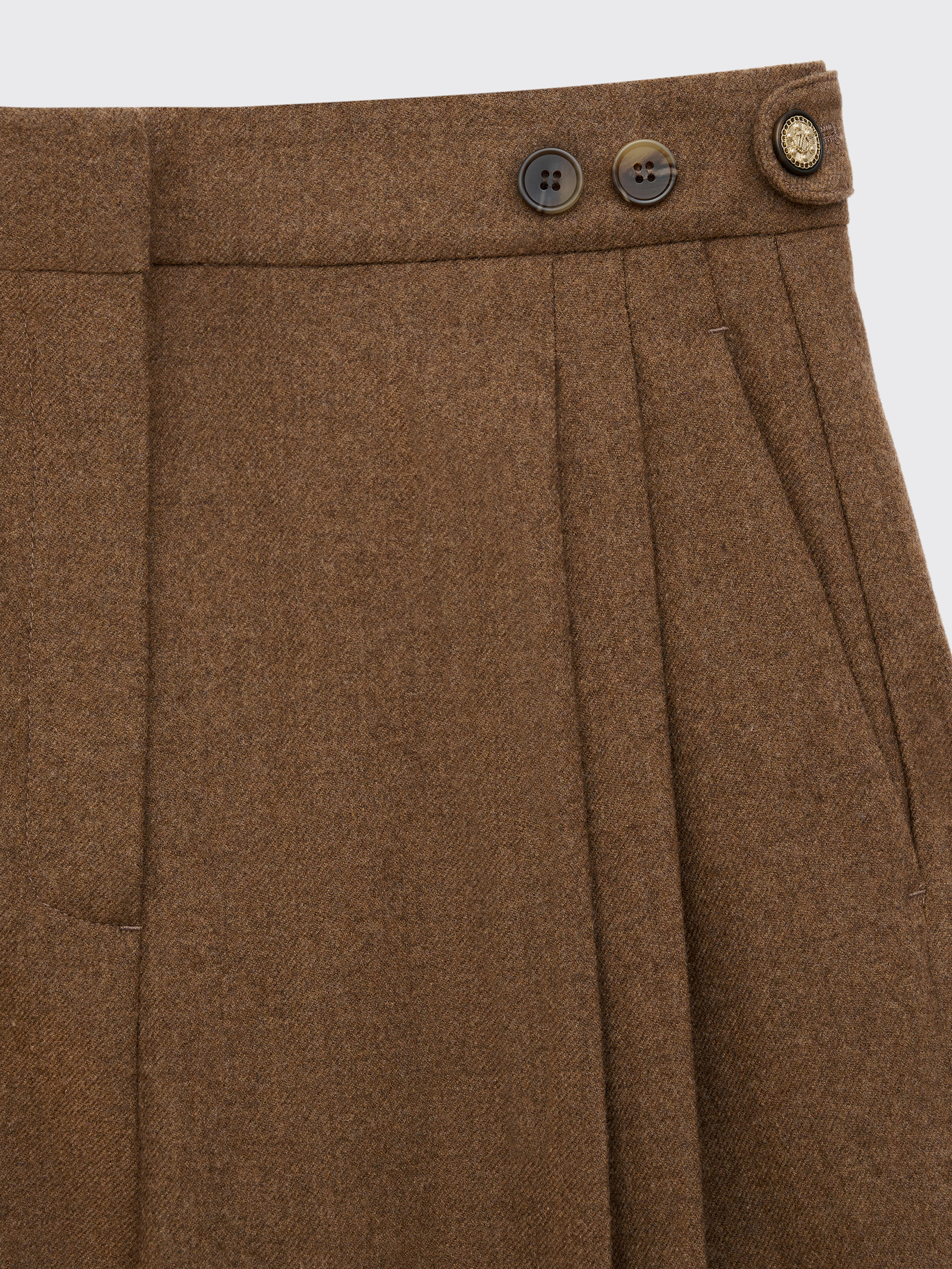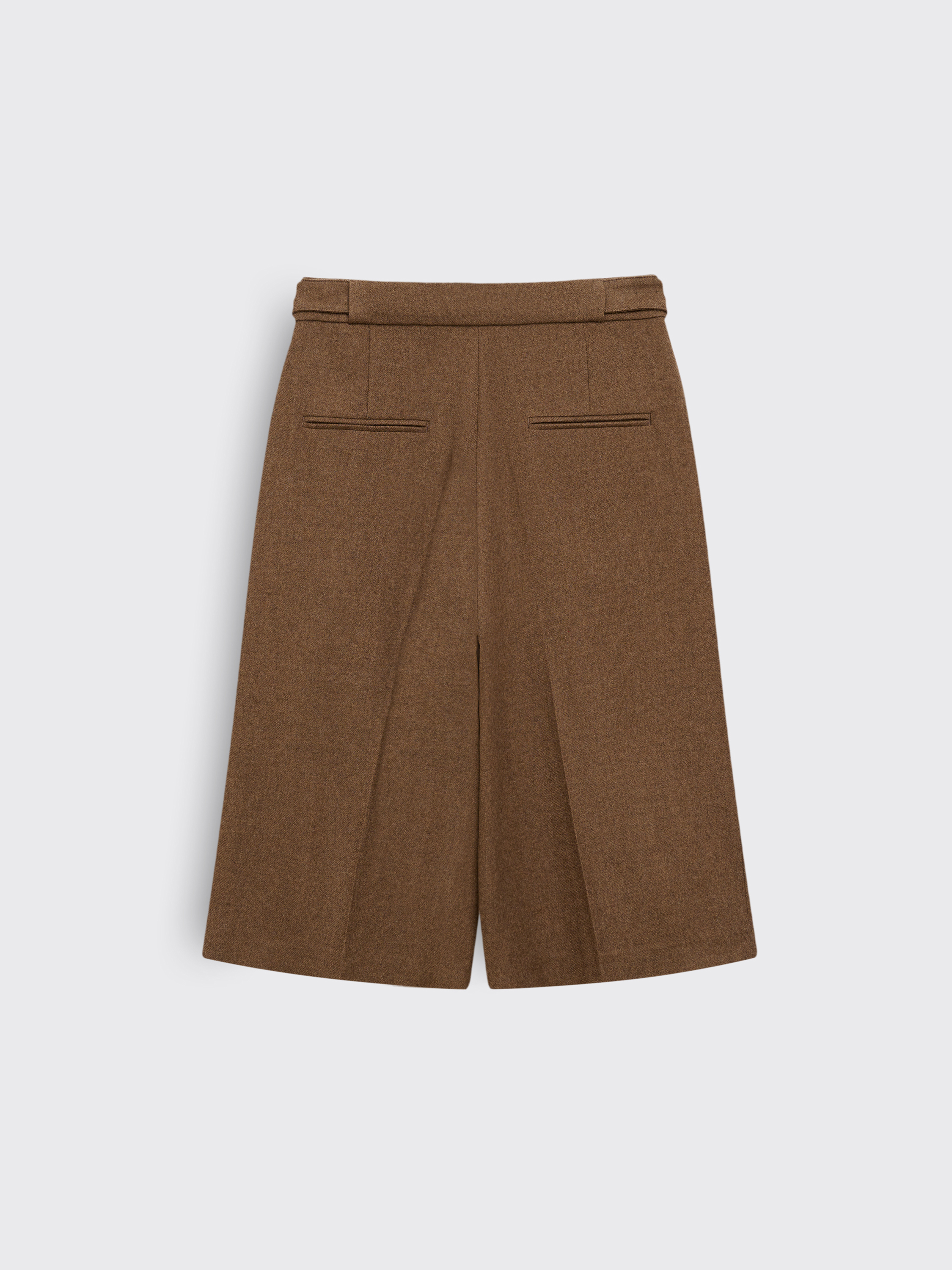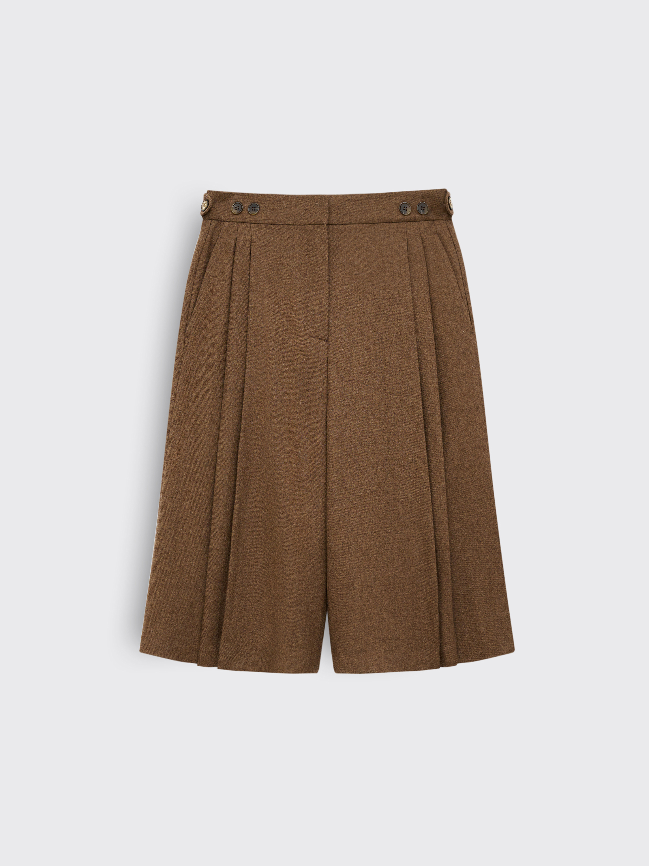 Костюмные шорты выполнены из смесового шерстяного полотна с добавлением верблюжьей шерсти и шелка, что обеспечивает плотную, ровную текстуру и стабильную форму. Высокая посадка и сконструированный пояс с декоративными пуговицами по бокам формируют четкую линию талии и задают аккуратную архитектуру модели. Глубокие складки от пояса создают объем без утяжеления и выстраивают сбалансированный силуэт, длина до колена сохраняет собранный характер. Модель сочетается с жакетами из комплекта, тонким трикотажем и лаконичными рубашками, формируя выверенные и спокойные образы.