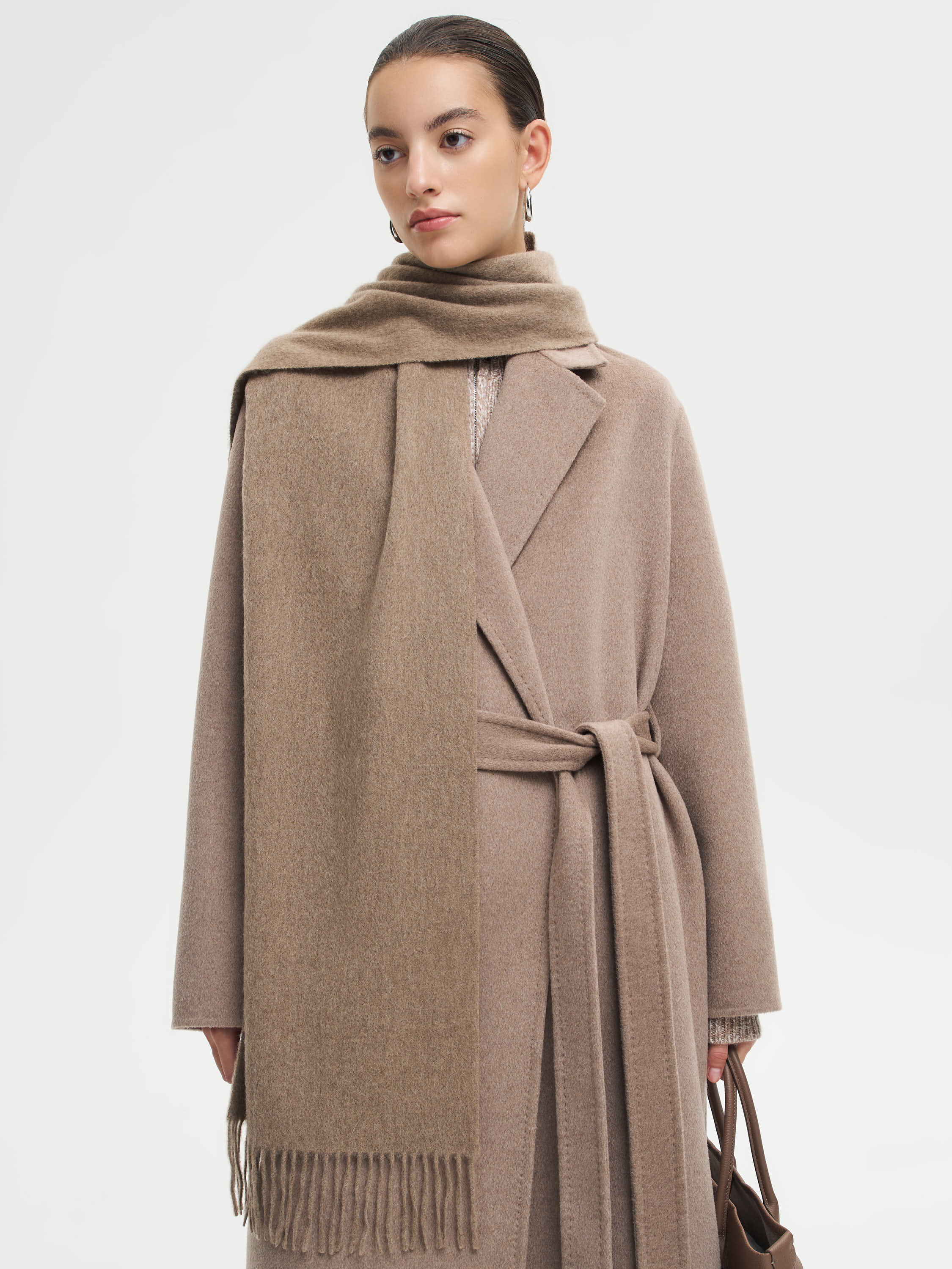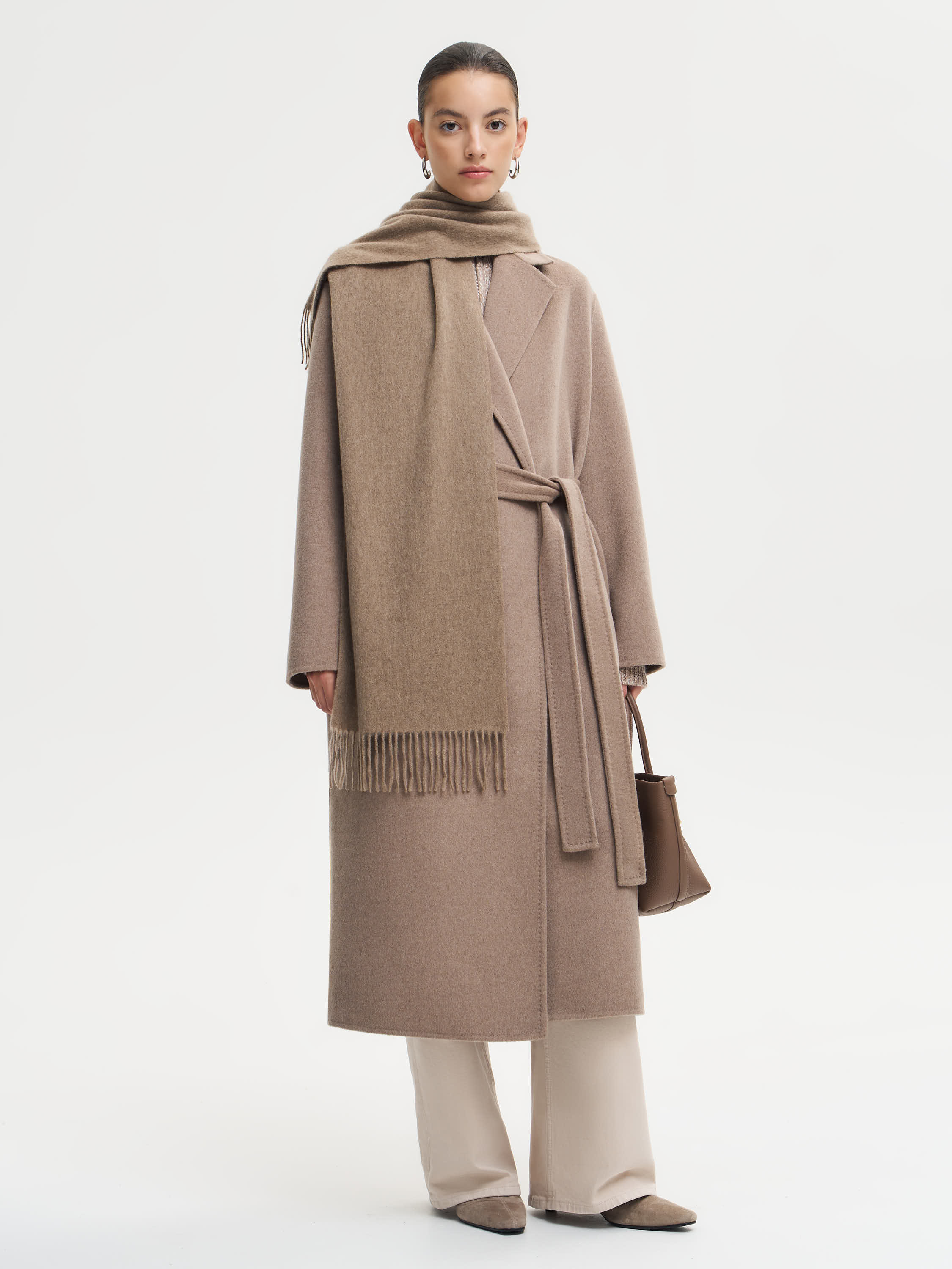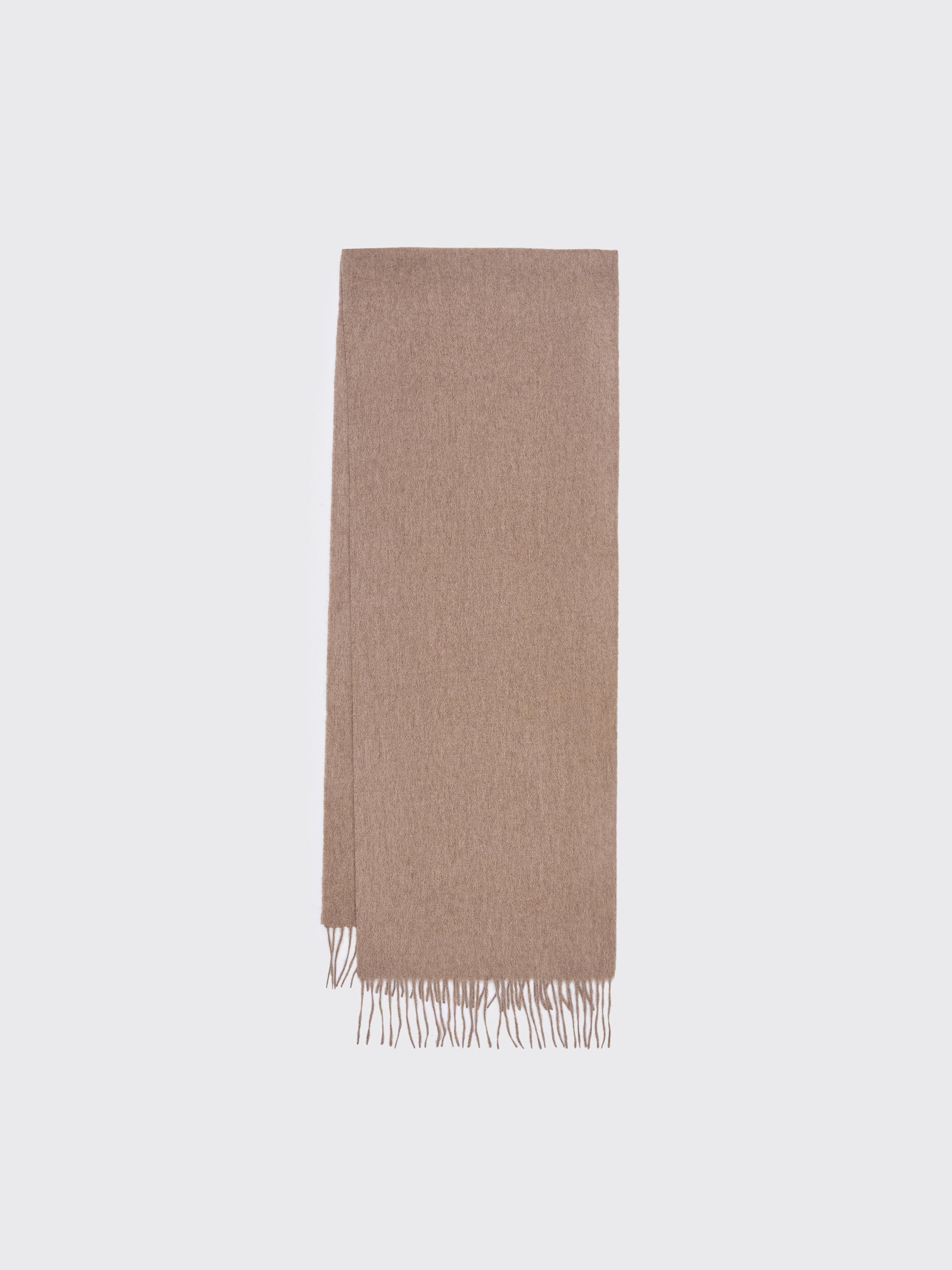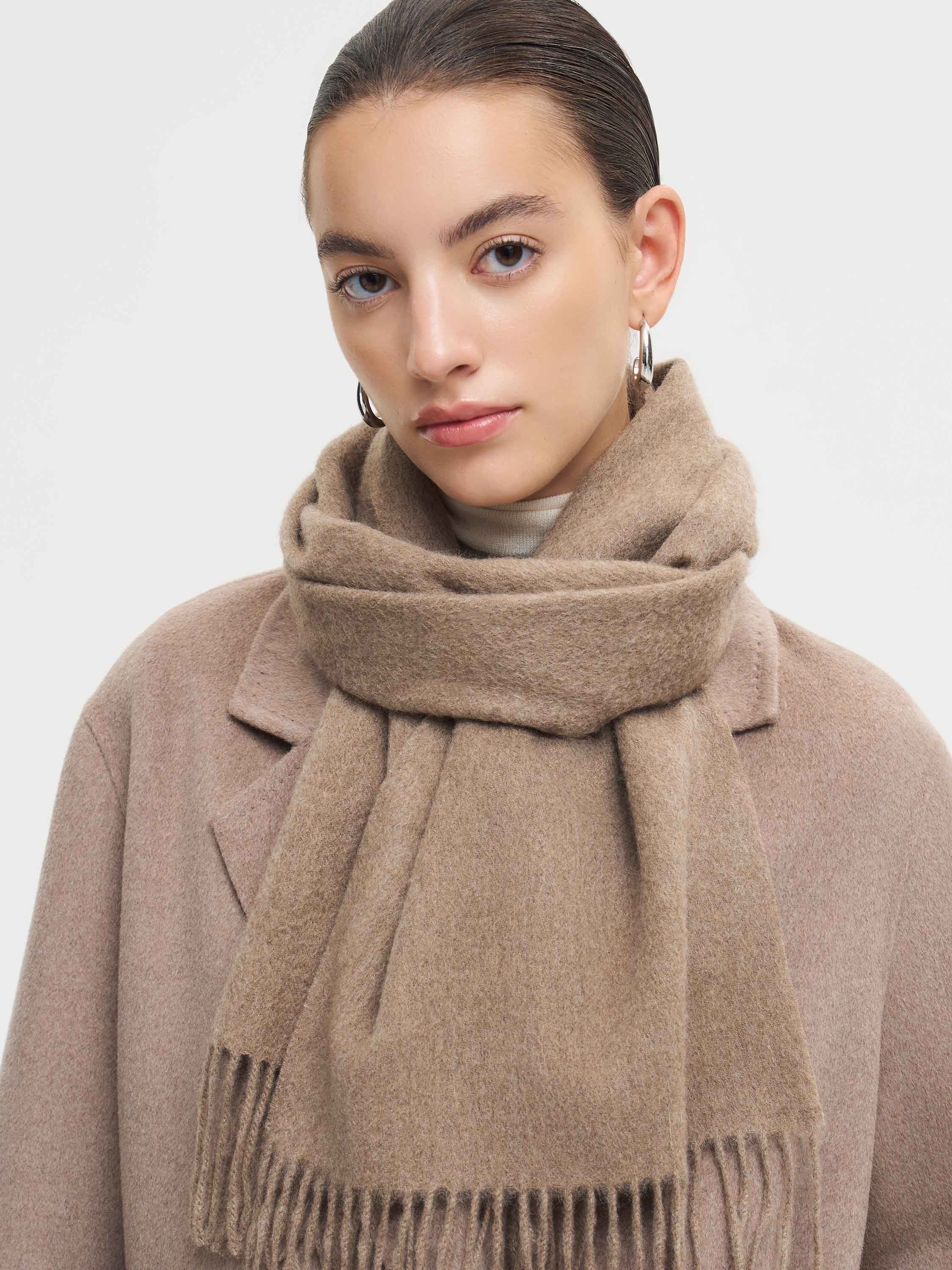 Объемный кашемировый шарф с мягким ворсом и длинной бахромой по краю. Пластичное полотно красиво драпируется и держит форму, создавая ощущение тепла и легкости одновременно. Его минималистичный дизайн делает акцент не на декоре, а на фактуре — чистый кашемир раскрывается в естественном свете, придавая образу глубину и спокойный лоск. Идеален поверх пальто, жакета или трикотажа — как финальный штрих к продуманному, но непринужденному силуэту.