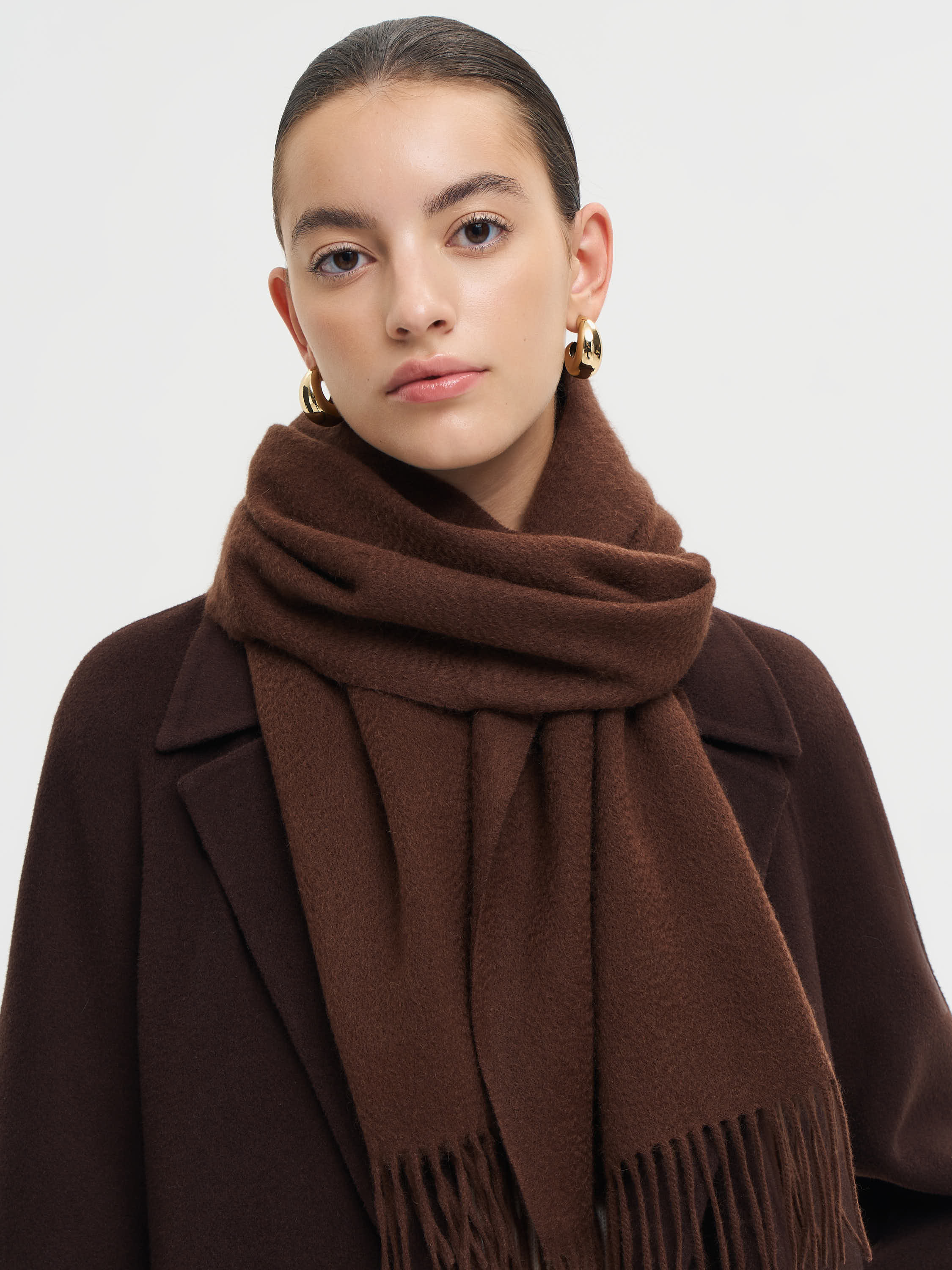 Объемный кашемировый шарф с мягким ворсом и длинной бахромой по краю. Пластичное полотно красиво драпируется и держит форму, создавая ощущение тепла и легкости одновременно. Его минималистичный дизайн делает акцент не на декоре, а на фактуре — чистый кашемир раскрывается в естественном свете, придавая образу глубину и спокойный лоск. Идеален поверх пальто, жакета или трикотажа — как финальный штрих к продуманному, но непринужденному силуэту.