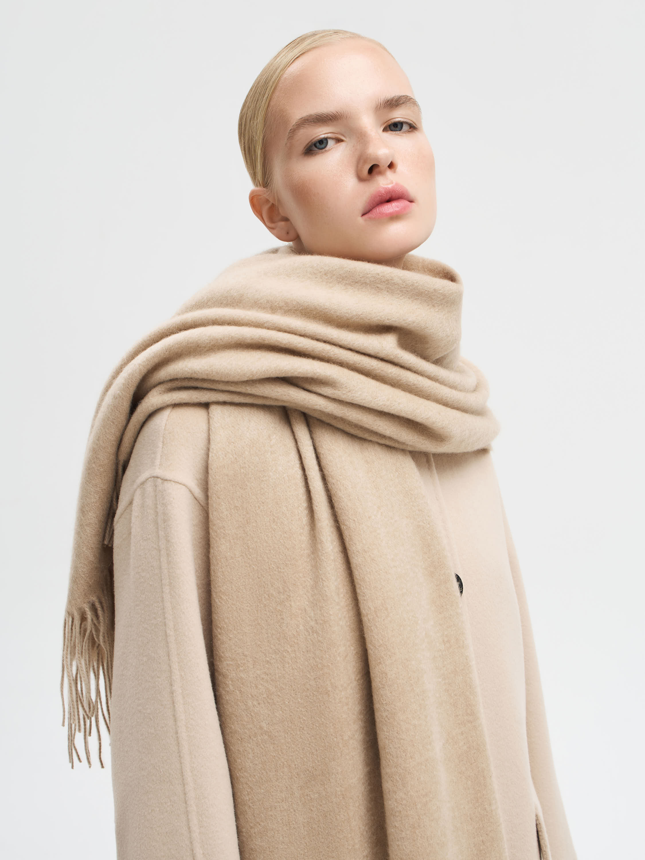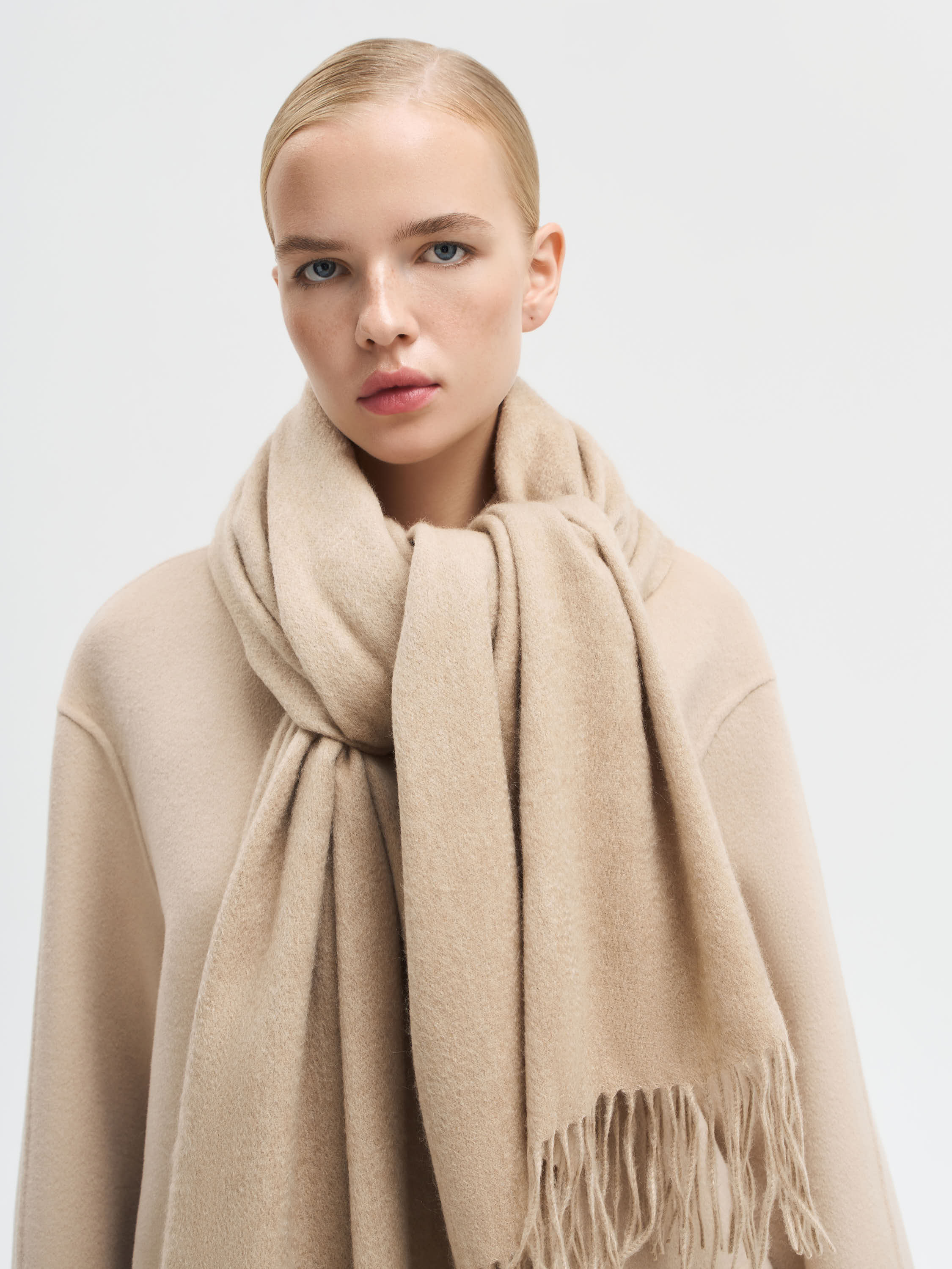 Шарф из 100% кашемира с объемной текстурой и длинной бахромой по краям. Мягкое полотно отличается деликатной тактильностью и сохраняет тепло, оставаясь легким в носке. За счет своей пластичности шарф драпируется свободно и выразительно, позволяя носить его разными способами. Модель представлена в нескольких оттенках, что дает возможность подобрать акцент под разные образы.