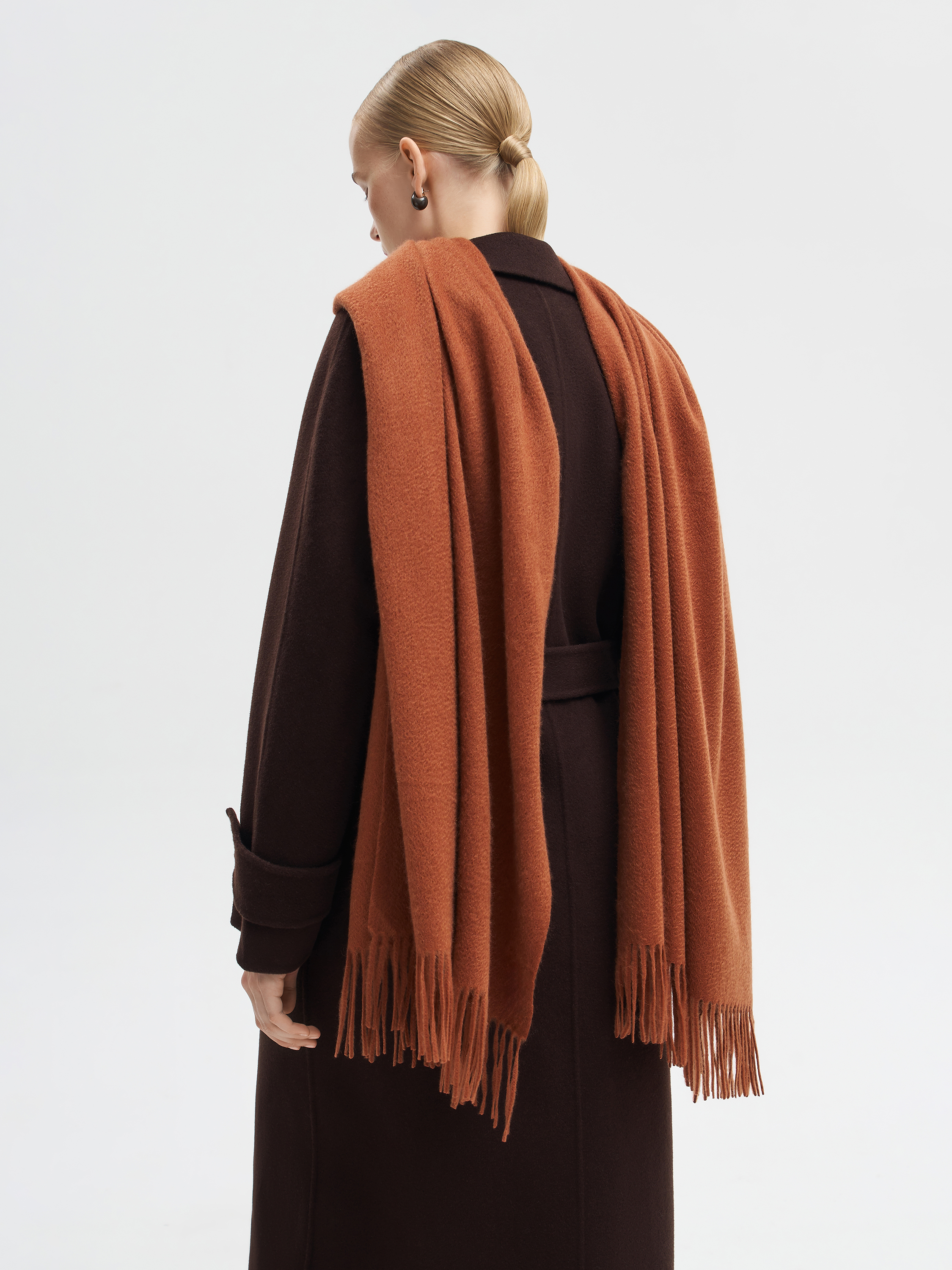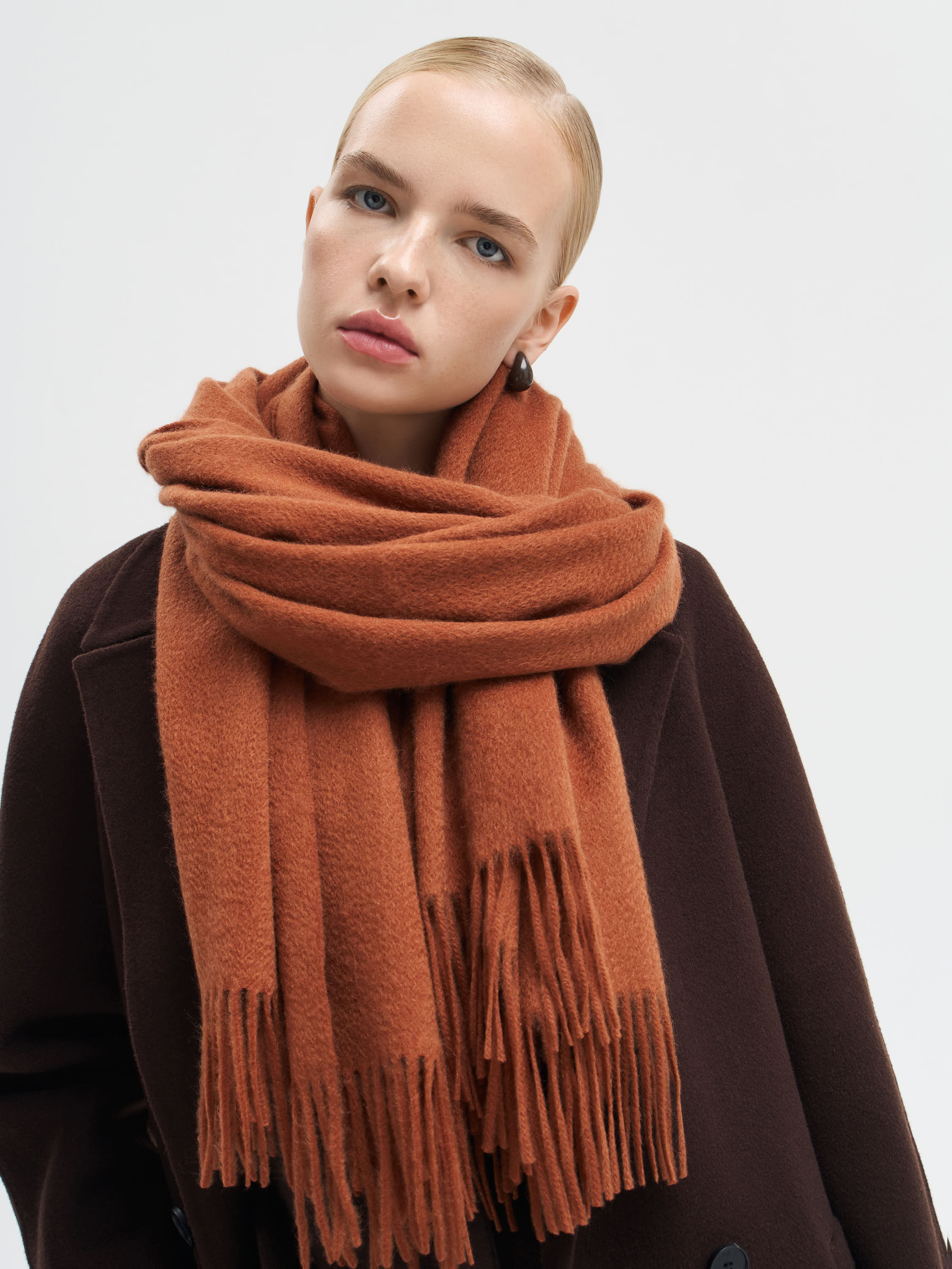 Шарф из 100% кашемира с объемной текстурой и длинной бахромой по краям. Мягкое полотно отличается деликатной тактильностью и сохраняет тепло, оставаясь легким в носке. За счет своей пластичности шарф драпируется свободно и выразительно, позволяя носить его разными способами. Модель представлена в нескольких оттенках, что дает возможность подобрать акцент под разные образы.