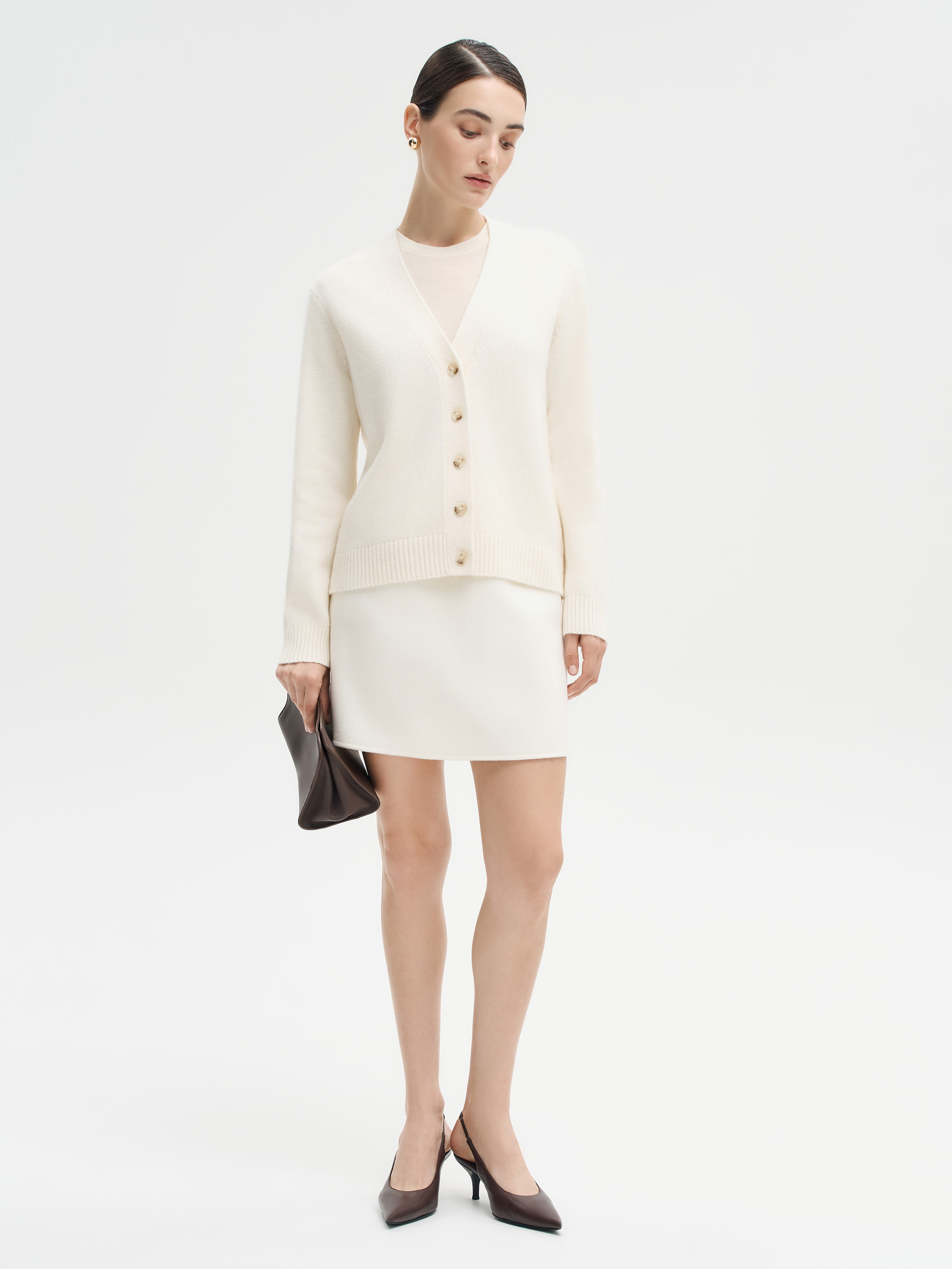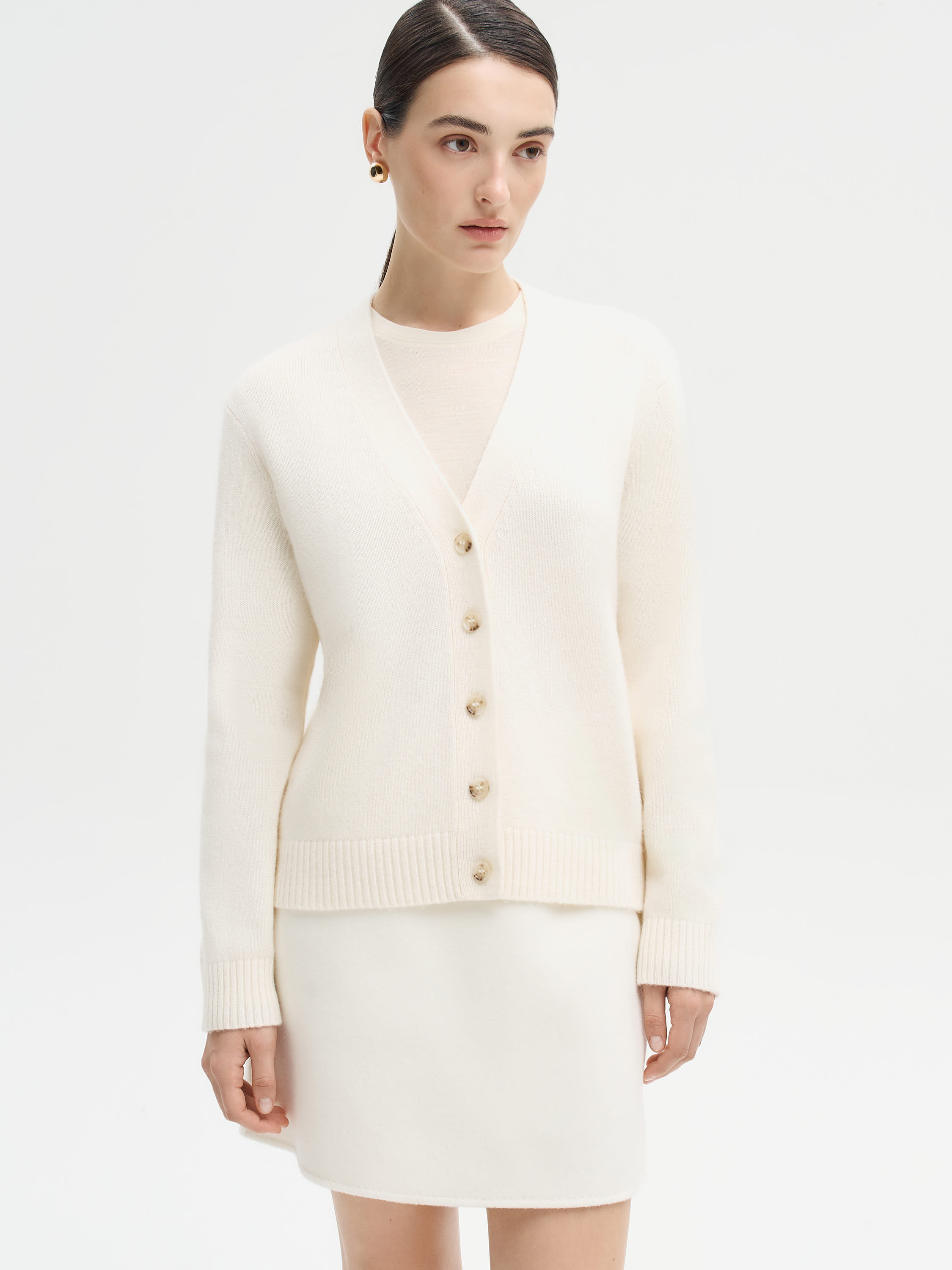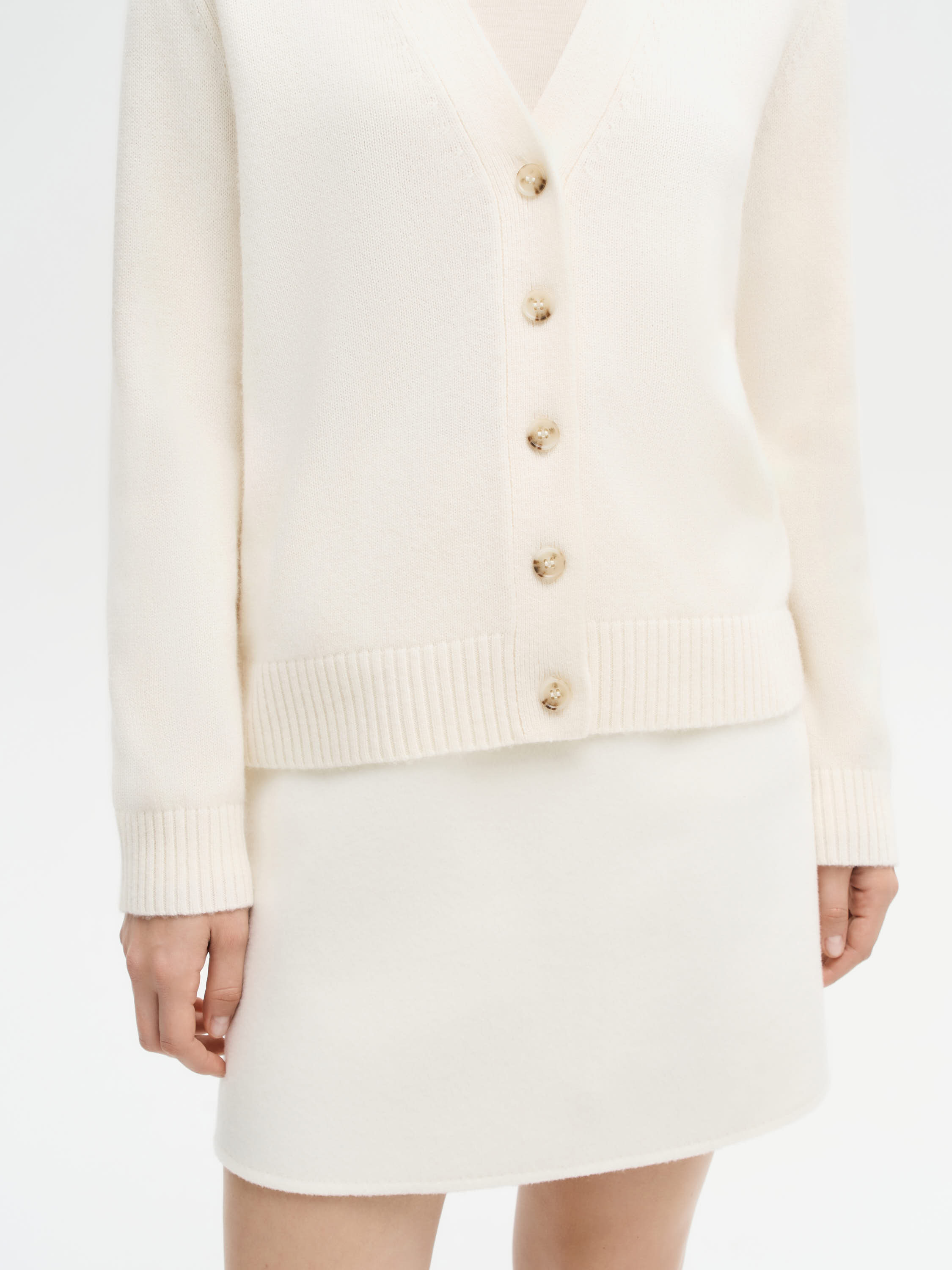 Элегантный кардиган с мягкой фактурой и чистыми линиями, созданный для лаконичных и универсальных образов. Выполнен из тонкой пряжи с высоким содержанием шерсти мериноса и добавлением кашемира, что обеспечивает комфортное тепло, пластичность и приятную тактильность. Крой прямой, с V-образным вырезом и застежкой на ряд пуговиц благородного оттенка. Манжеты и нижняя планка дополнены широкой резинкой, формирующей аккуратный силуэт. Модель гармонично смотрится как в самостоятельных ансамблях с брюками или юбками, так и в многослойных сочетаниях с топами, рубашками и платьями.