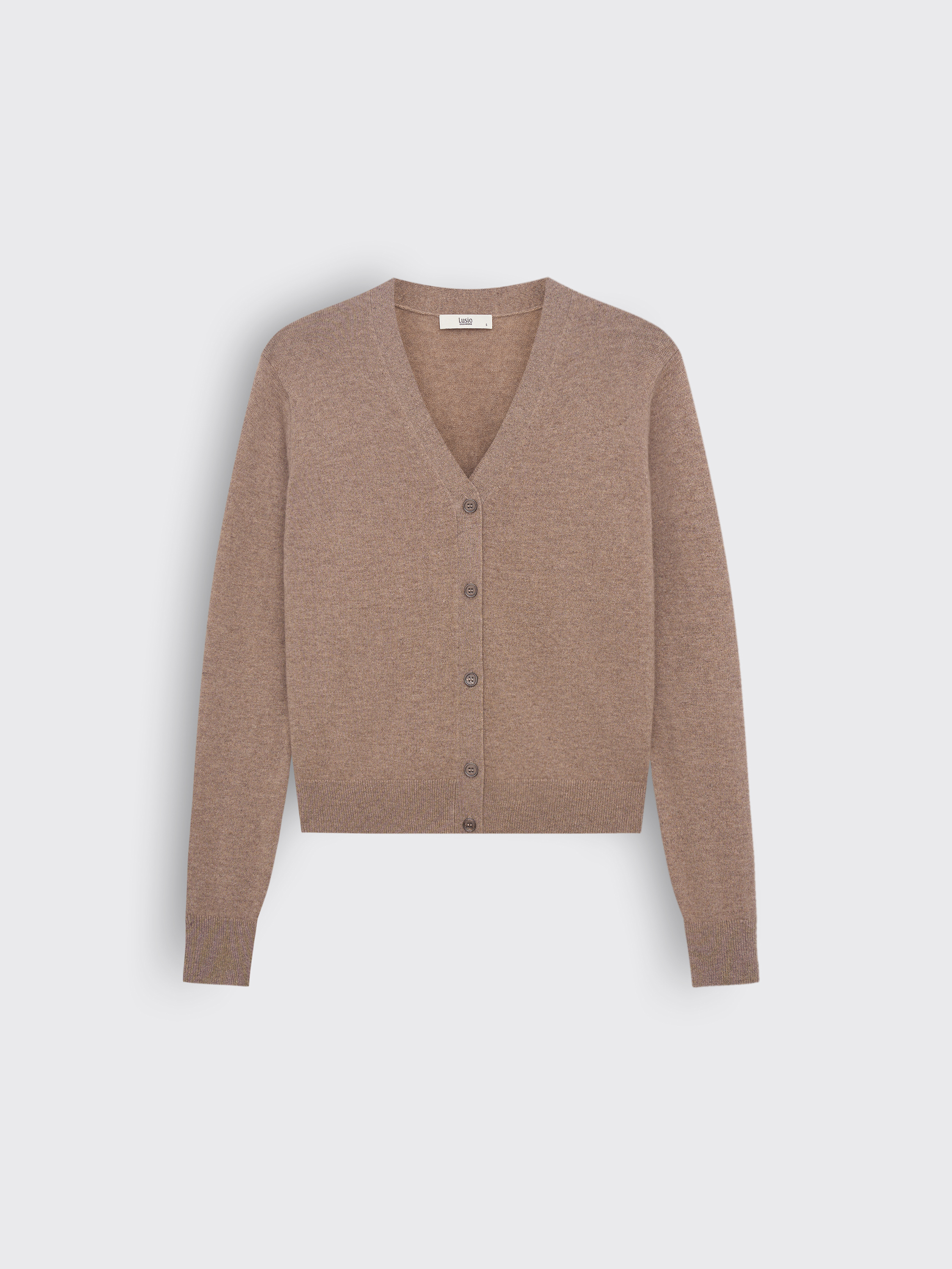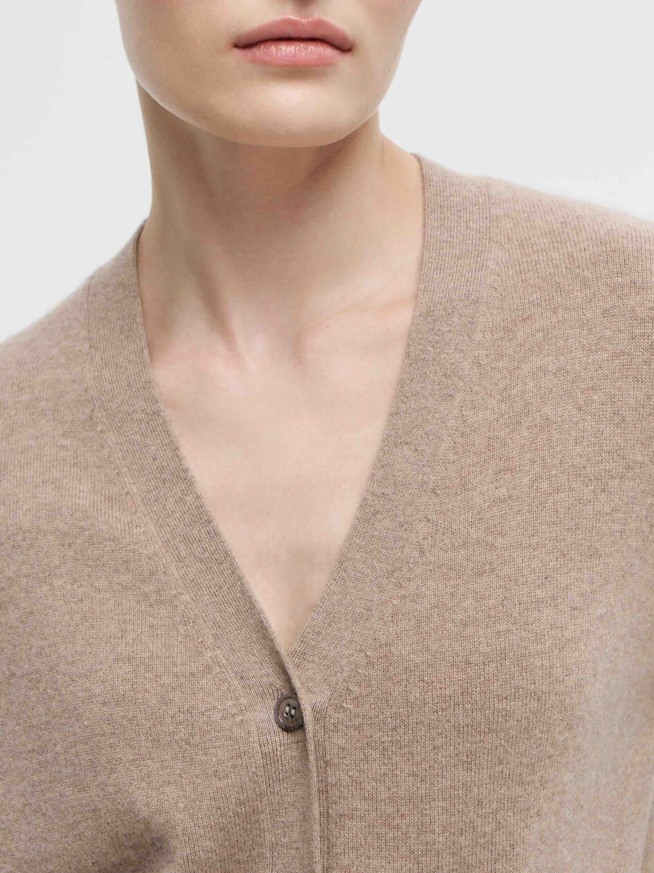Кардиган из мягкой пряжи на основе шерсти мериноса с добавлением кашемира. Материал тонкий, эластичный, с приятной тактильностью и естественным теплом, что делает изделие комфортным в носке в прохладный сезон. Крой прямой, с V-образным вырезом и застежкой на ряд пуговиц. Длинные рукава дополнены плотными манжетами, низ — с эластичной резинкой, формирующей аккуратный силуэт. Универсальная модель, которую можно носить как самостоятельный элемент с юбками или брюками, так и в многослойных комплектах — поверх топов, рубашек или платьев.