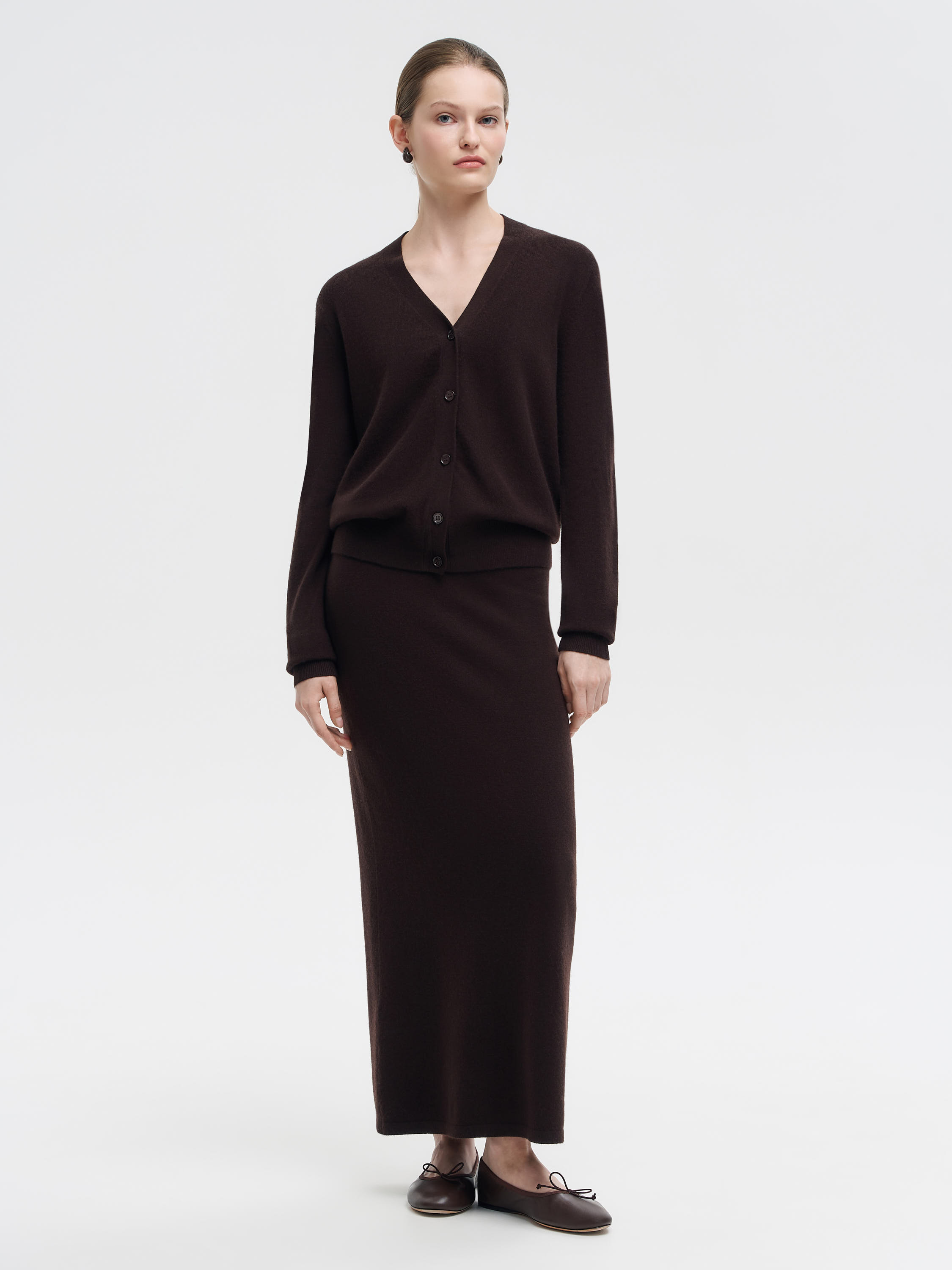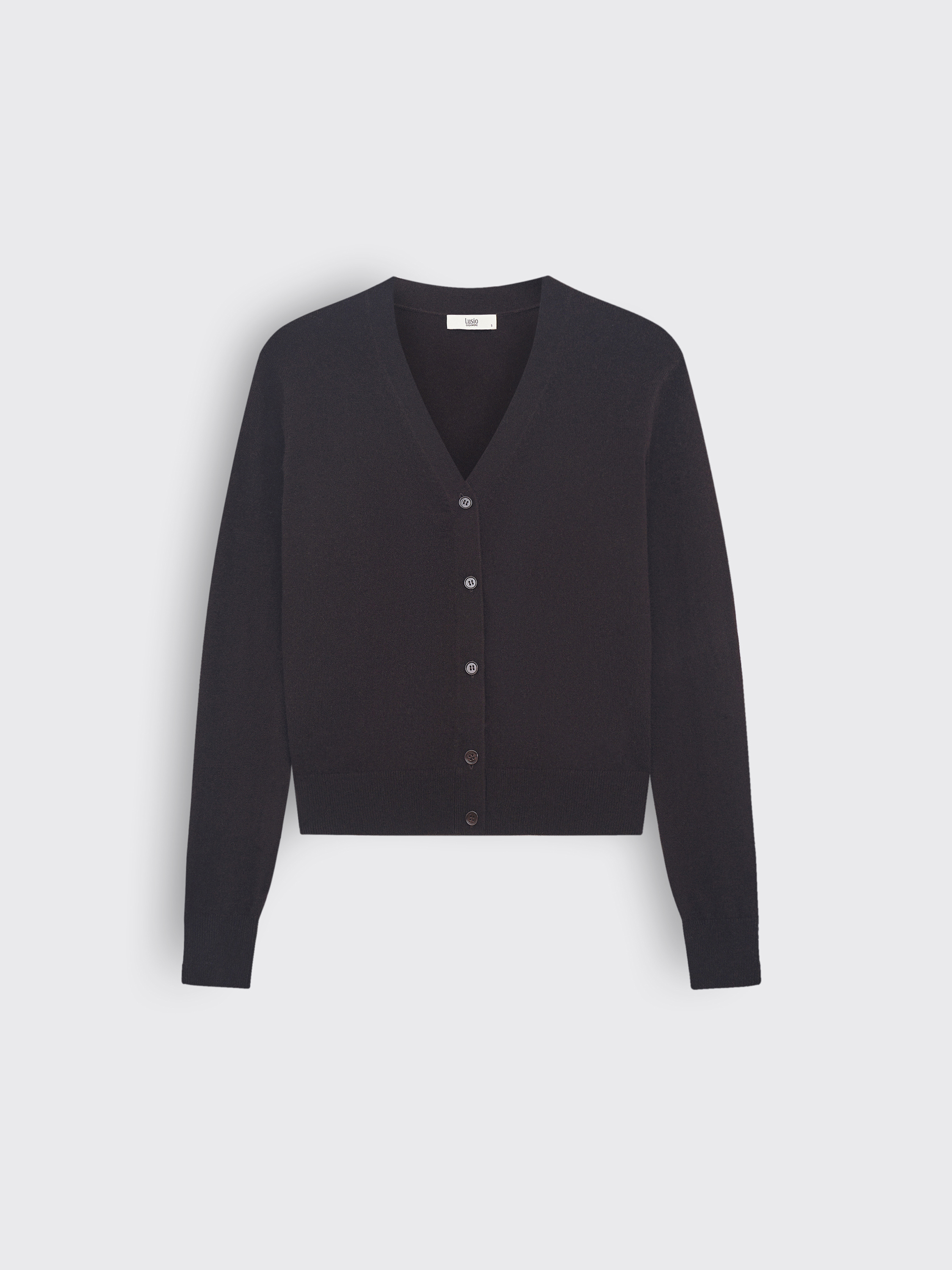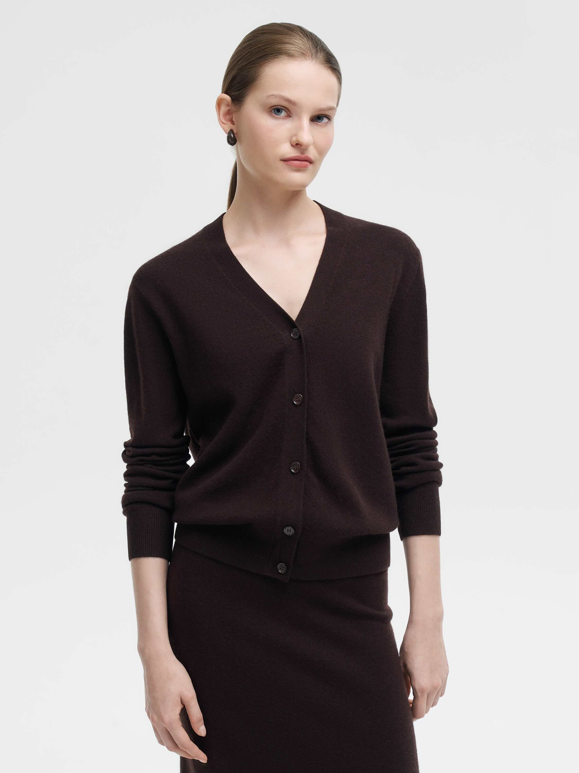Кардиган из мягкой пряжи на основе шерсти мериноса с добавлением кашемира. Материал тонкий, эластичный, с приятной тактильностью и естественным теплом, что делает изделие комфортным в носке в прохладный сезон. Крой прямой, с V-образным вырезом и застежкой на ряд пуговиц. Длинные рукава дополнены плотными манжетами, низ — с эластичной резинкой, формирующей аккуратный силуэт. Универсальная модель, которую можно носить как самостоятельный элемент с юбками или брюками, так и в многослойных комплектах — поверх топов, рубашек или платьев.