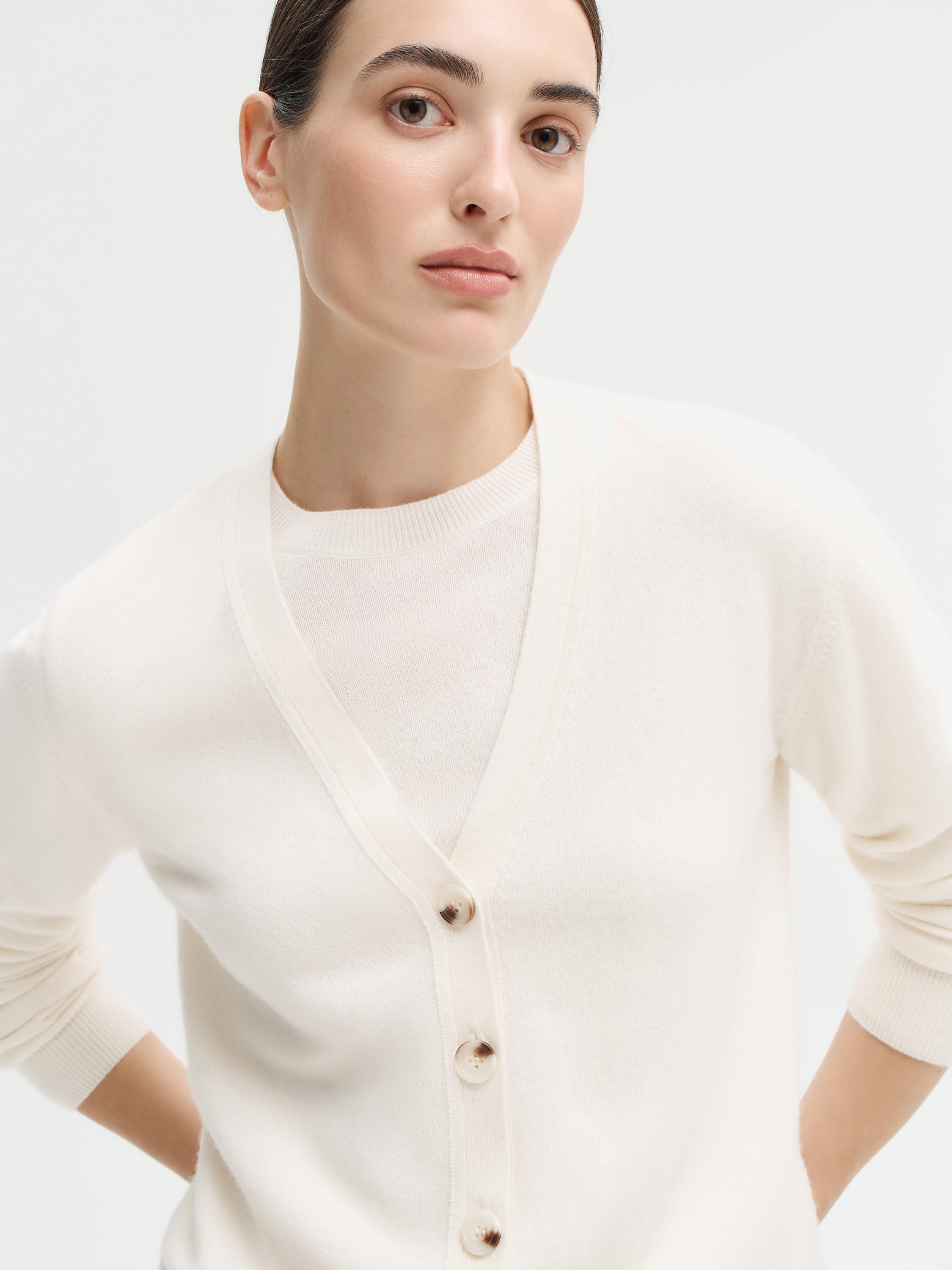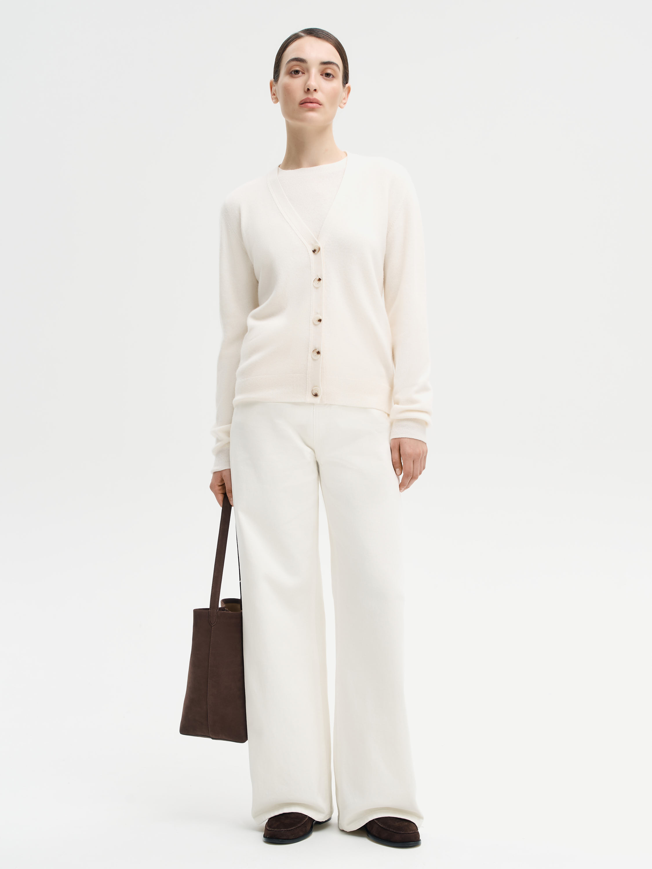 Кардиган из тонкой шерсти мериноса с добавлением кашемира отличается мягкой, пластичной текстурой и легким весом, обеспечивая комфорт в течение дня. Прямой силуэт с аккуратной линией плеч и глубоким V-образным вырезом создает универсальную основу для многослойных сочетаний. Длинные рукава и широкие манжеты в рубчик придают модели завершенность, а плотная резинка по низу аккуратно фиксирует форму. Кардиган легко интегрируется в повседневный и деловой гардероб: его можно носить с брюками и блузой, джинсами и футболкой, поверх платья или топа, а также как самостоятельный верх с юбкой или брюками с высокой посадкой.