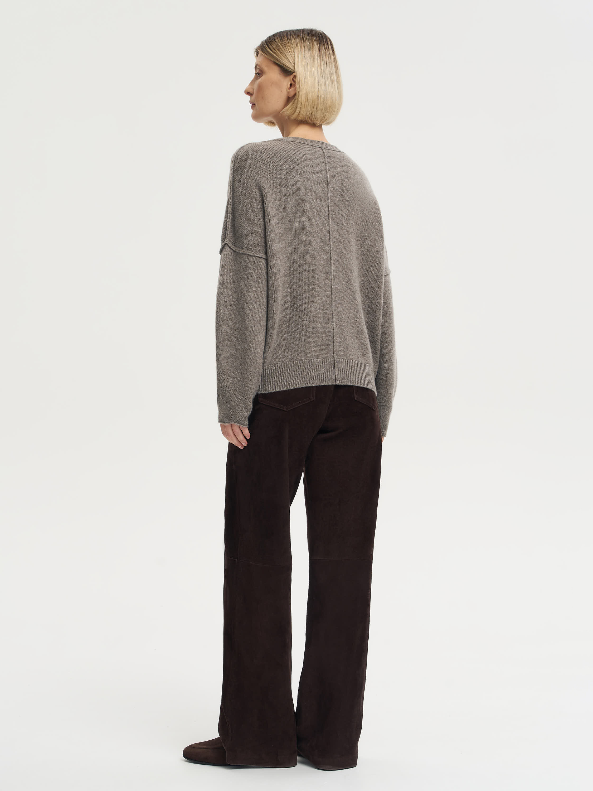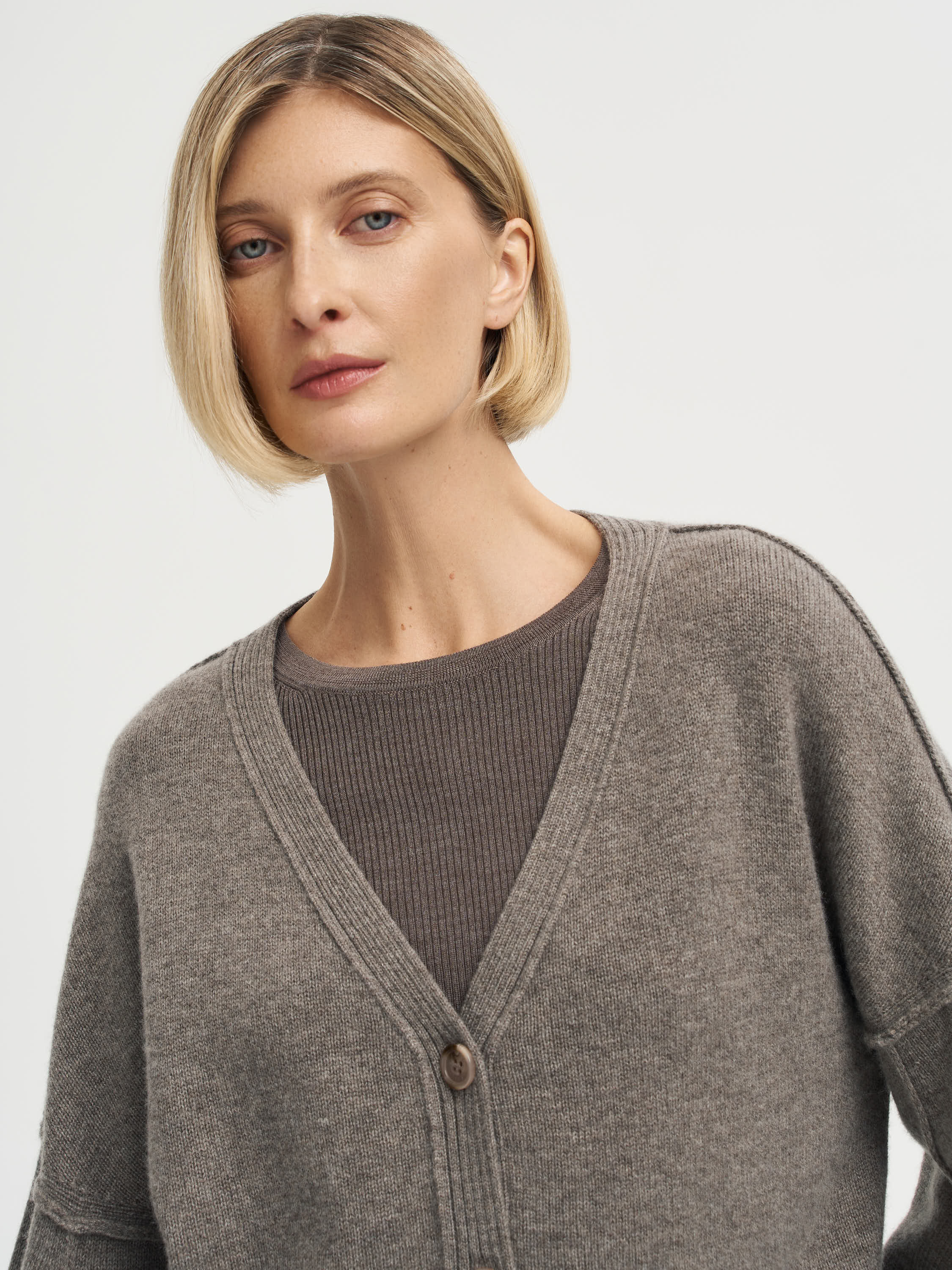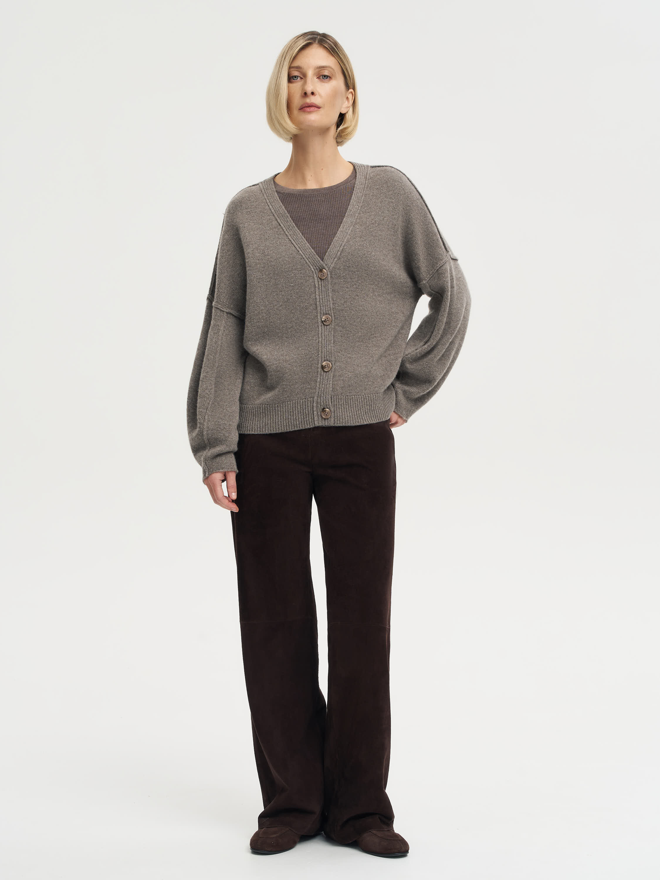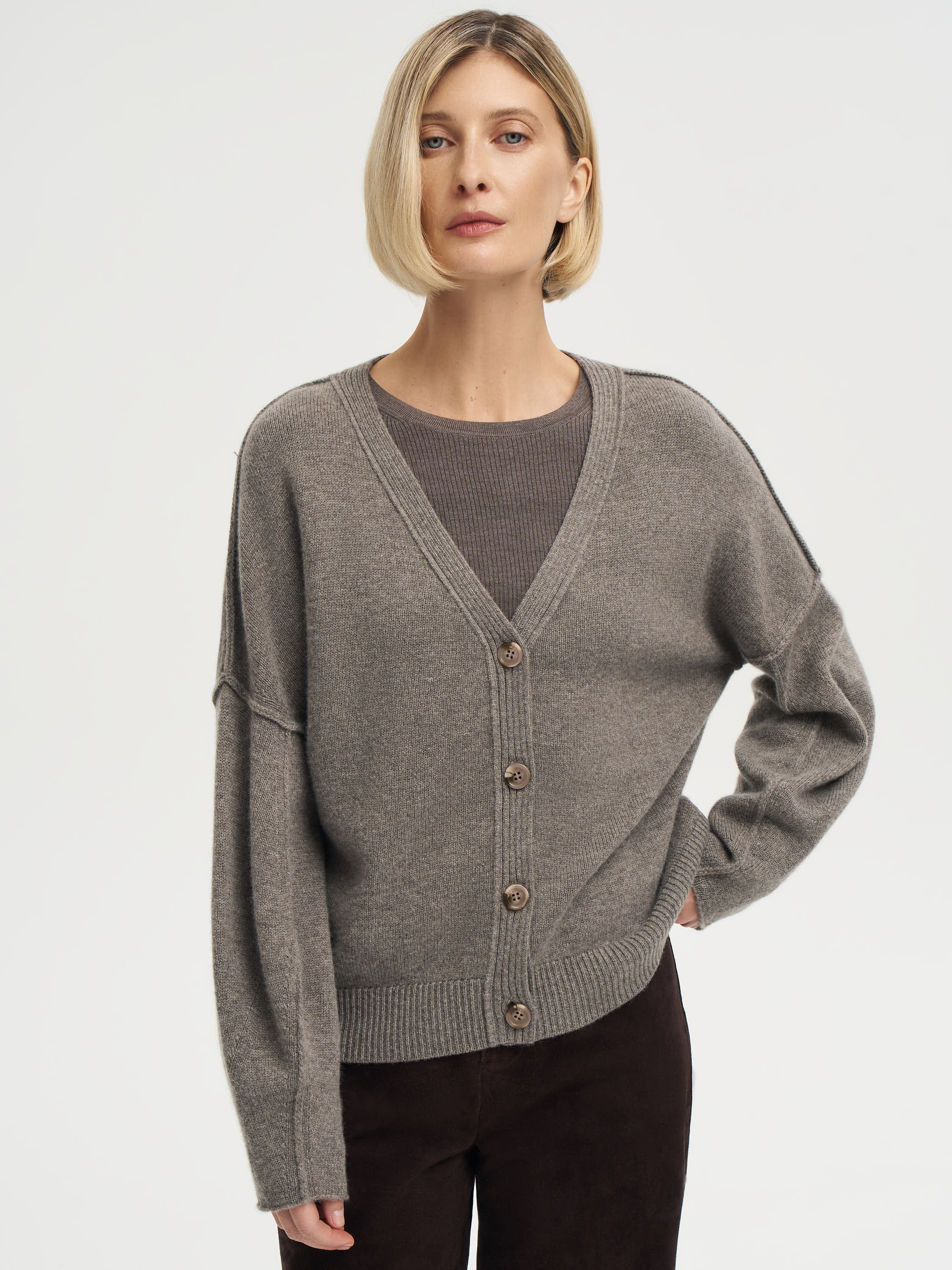 Кардиган из шерсти и кашемира с мягкой посадкой и удлиненными рукавами — вещь, в которой сочетаются комфорт и выразительная форма. Плотное, но пластичное трикотажное полотно создает аккуратный объем, не утяжеляя силуэт. Глубокий V-образный вырез и крупные пуговицы подчеркивают лаконичный характер модели. Широкие манжеты и резинка по низу добавляют структуру и делают образ собранным. Такой кардиган одинаково хорошо работает в многослойных комплектах с футболкой, водолазкой или шелковой блузой, оставаясь универсальной основой осеннего гардероба.