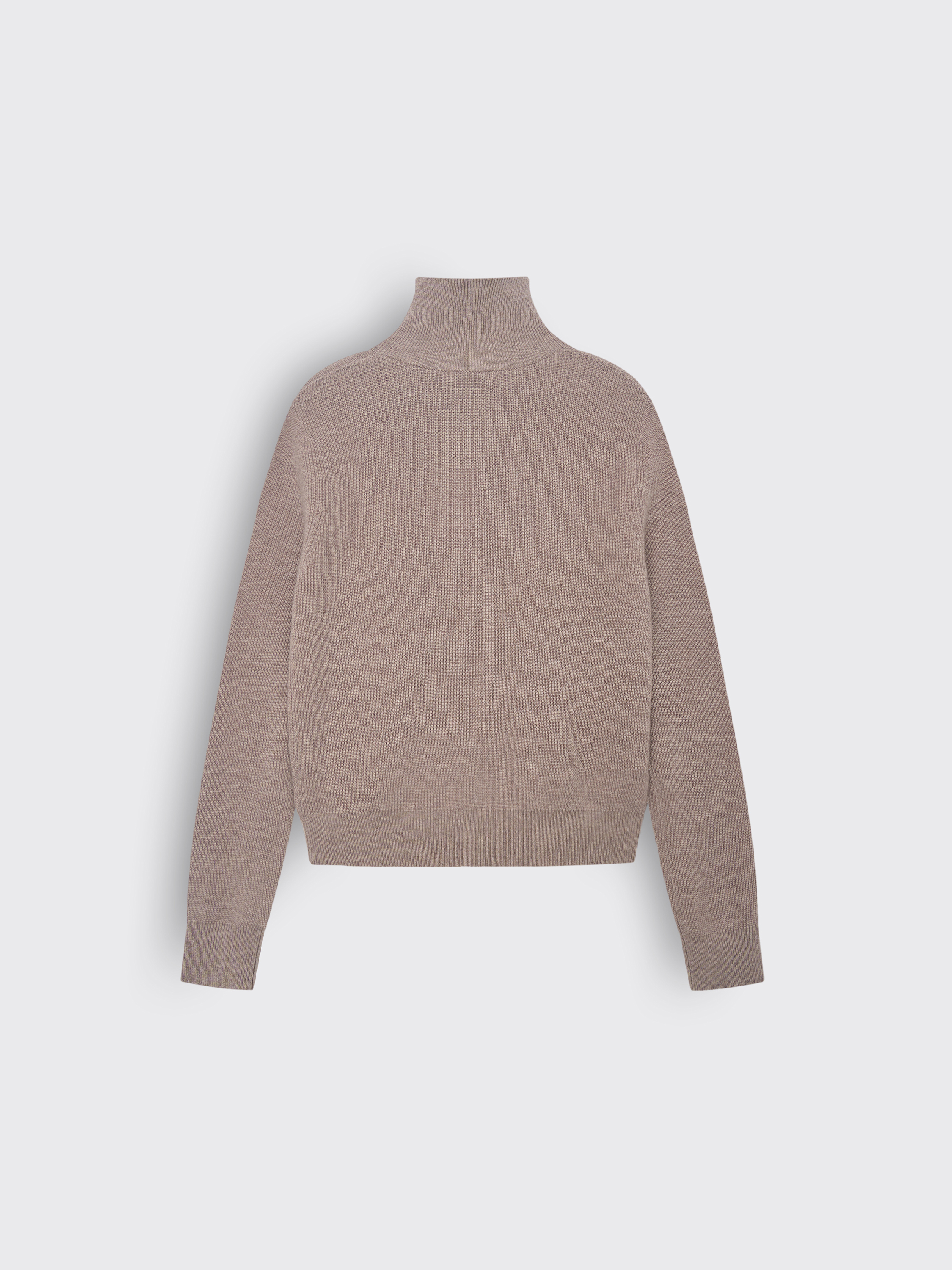 Кардиган выполнен из мягкой пряжи с содержанием мериносовой шерсти и кашемира, что делает его особенно приятным на ощупь и теплым. Укороченный силуэт с четкой линией плеч и акцентными накладными карманами создает современную графичность, а меланжевое переплетение нитей придает фактурности и глубины оттенку. Вырез без воротника делает модель универсальной: ее можно носить на голое тело или сочетать с тонкой водолазкой и топами, создавая расслабленные или более собранные образы.