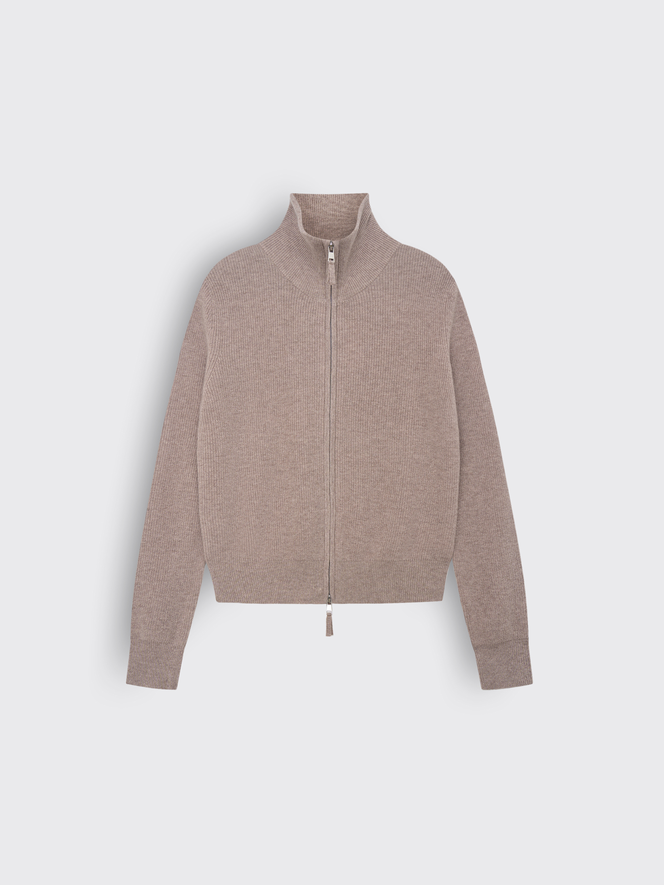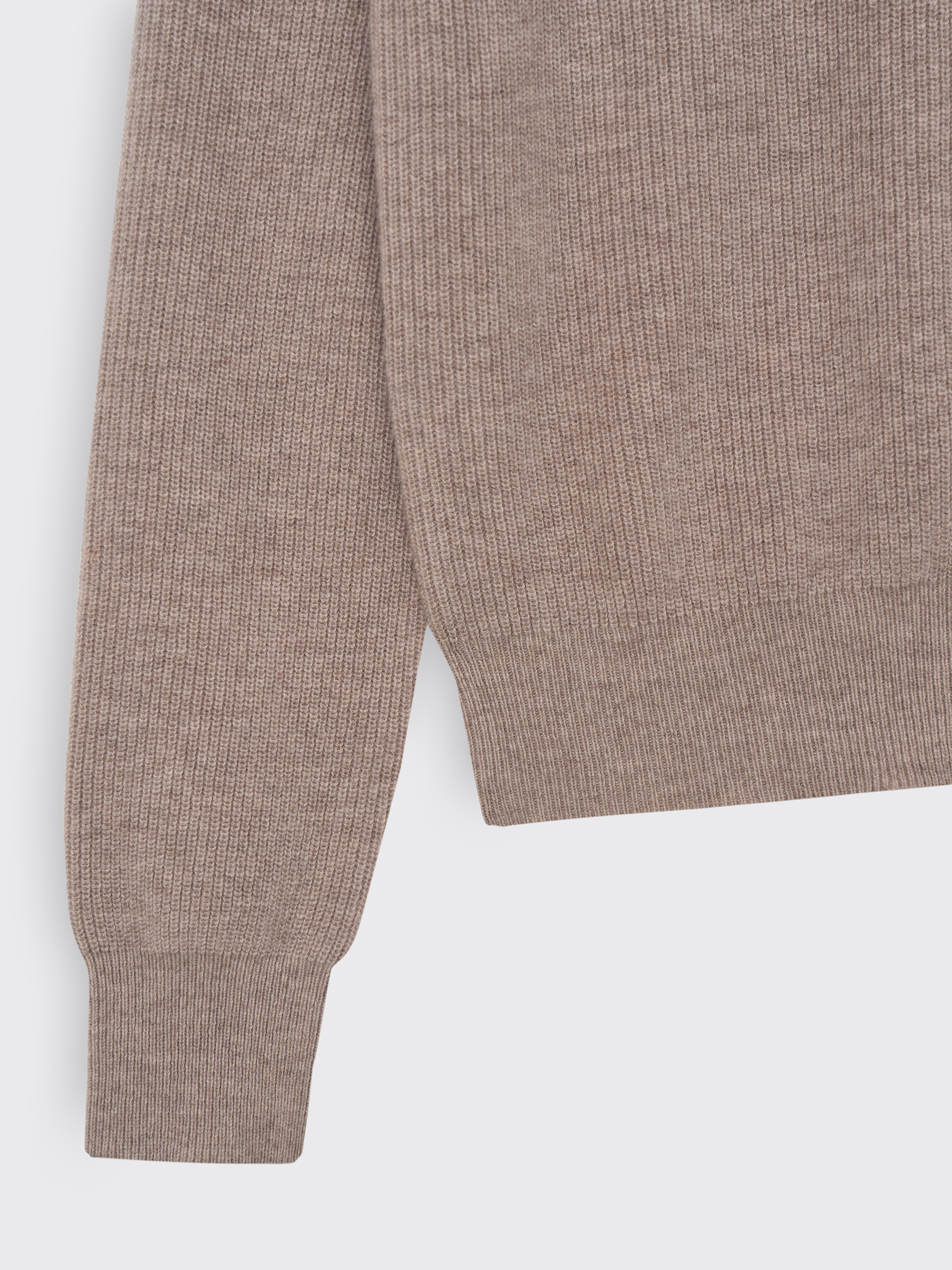 Кардиган выполнен из мягкой пряжи с содержанием мериносовой шерсти и кашемира, что делает его особенно приятным на ощупь и теплым. Укороченный силуэт с четкой линией плеч и акцентными накладными карманами создает современную графичность, а меланжевое переплетение нитей придает фактурности и глубины оттенку. Вырез без воротника делает модель универсальной: ее можно носить на голое тело или сочетать с тонкой водолазкой и топами, создавая расслабленные или более собранные образы.
