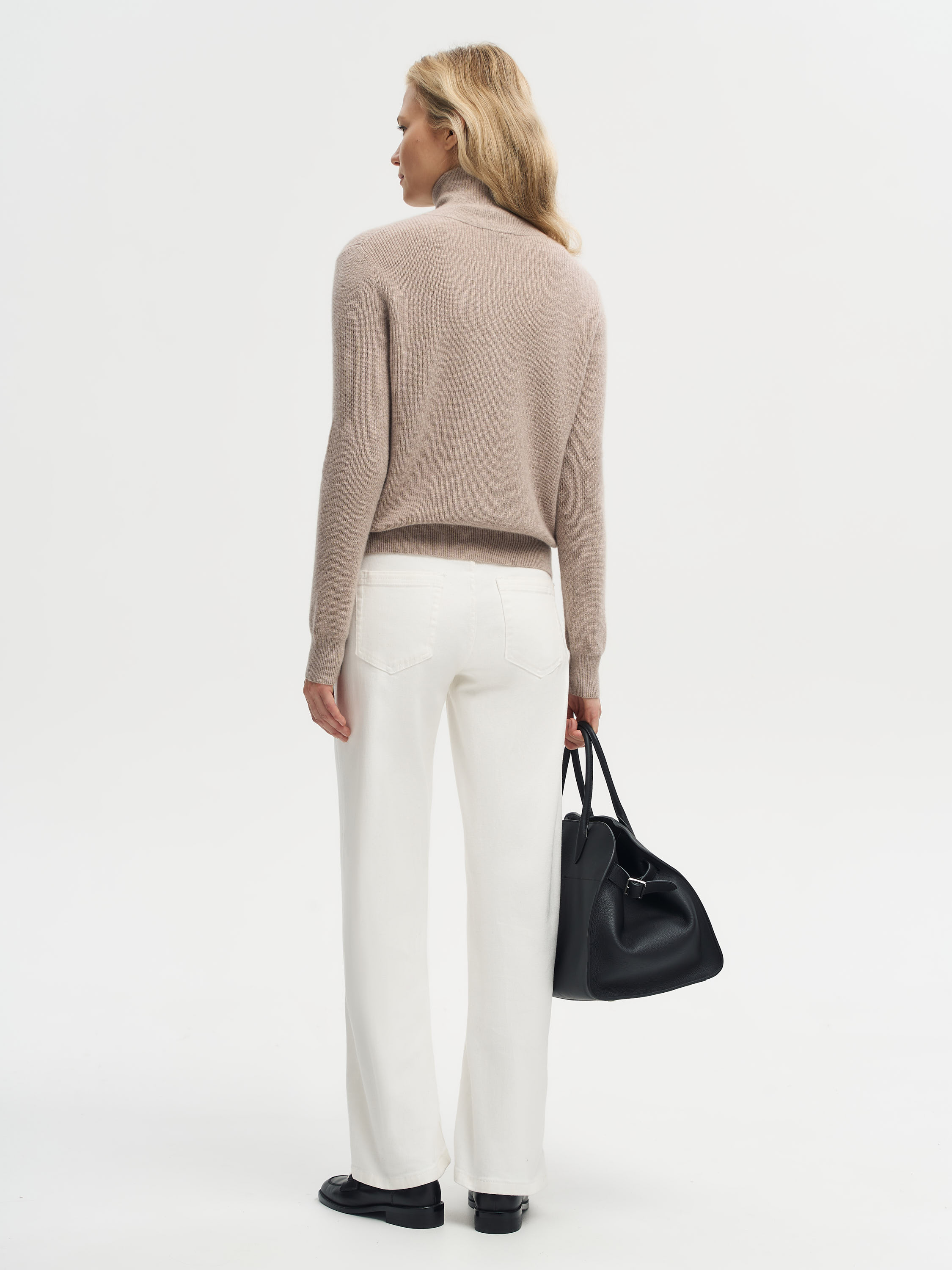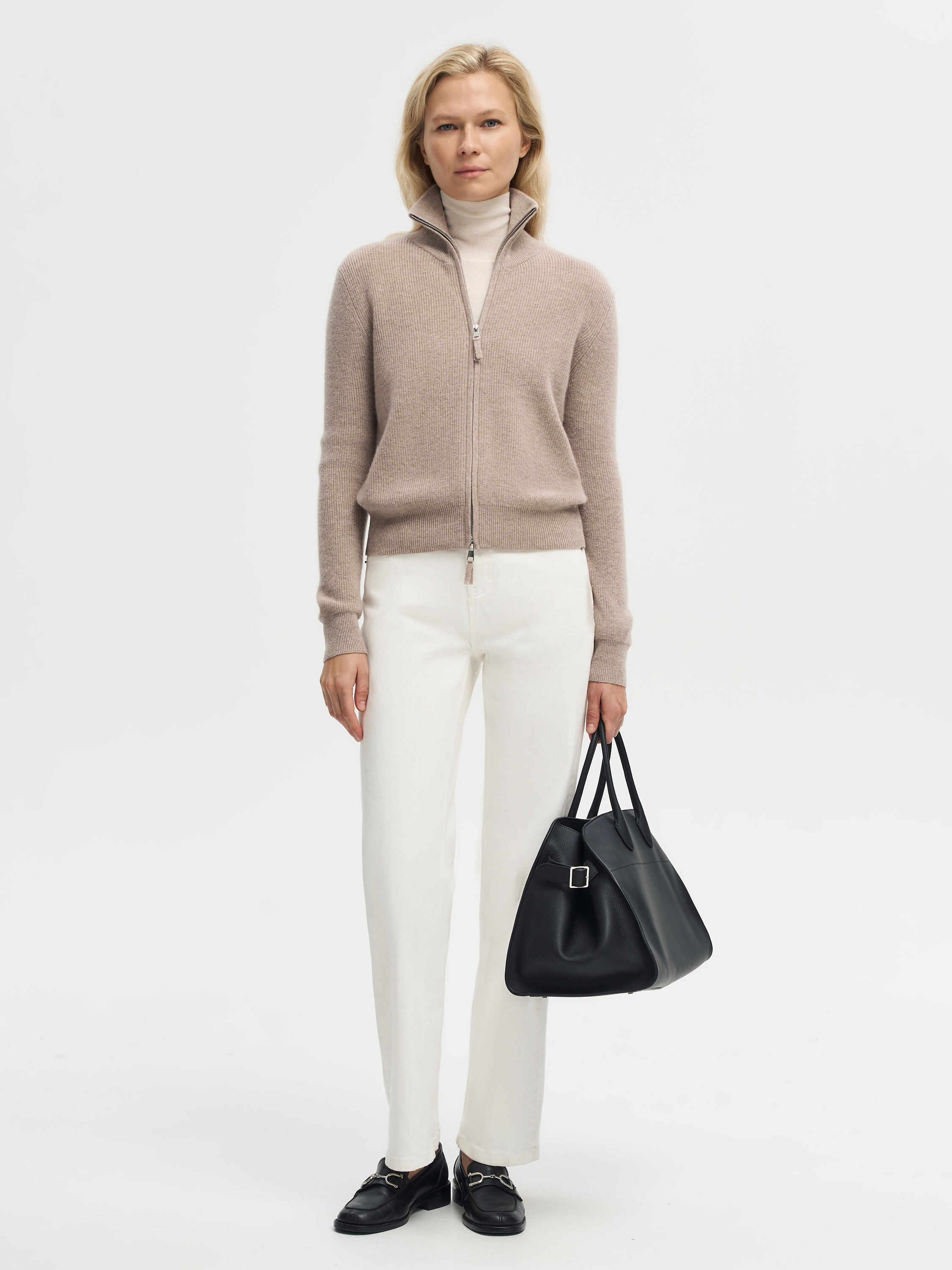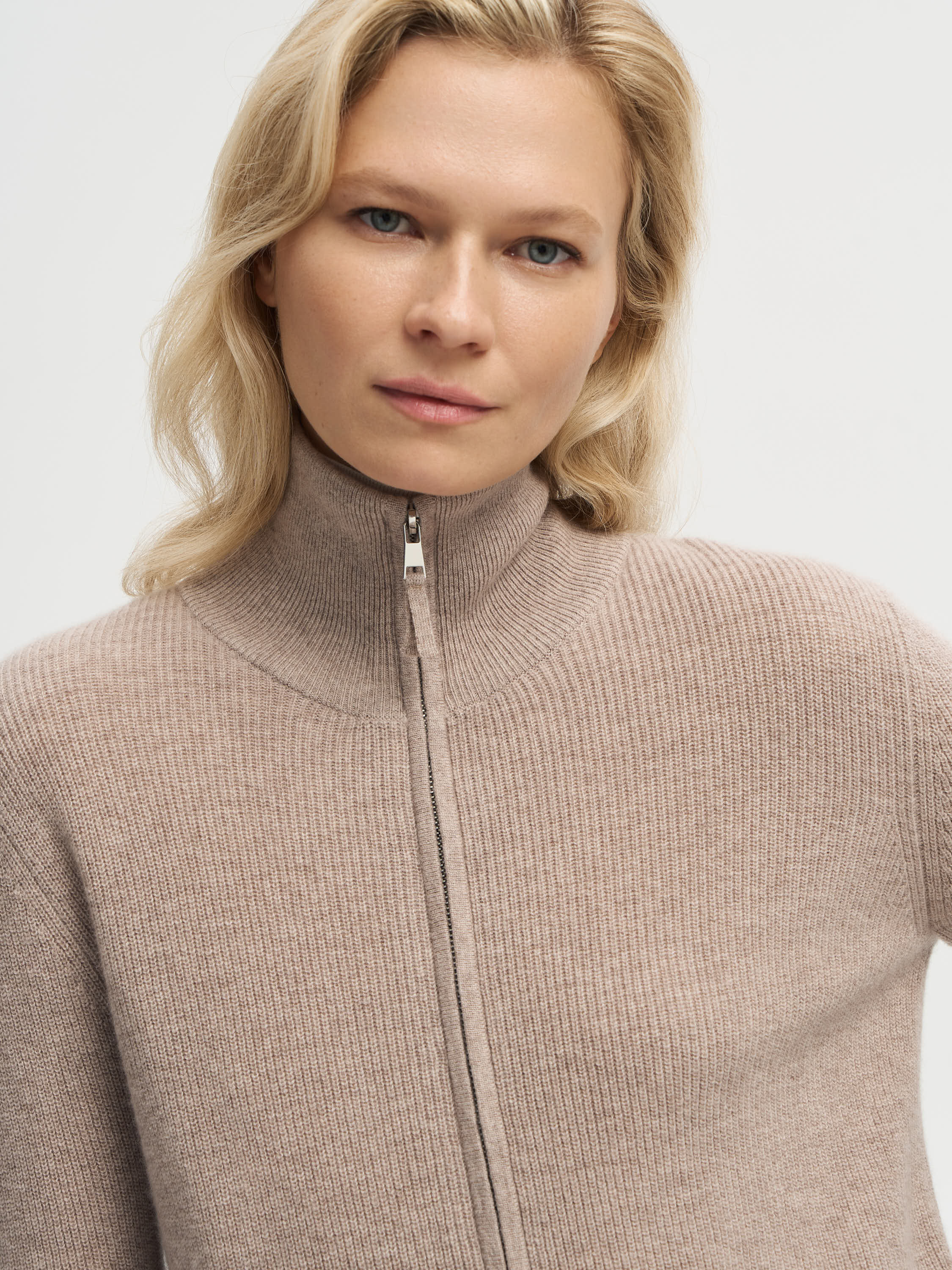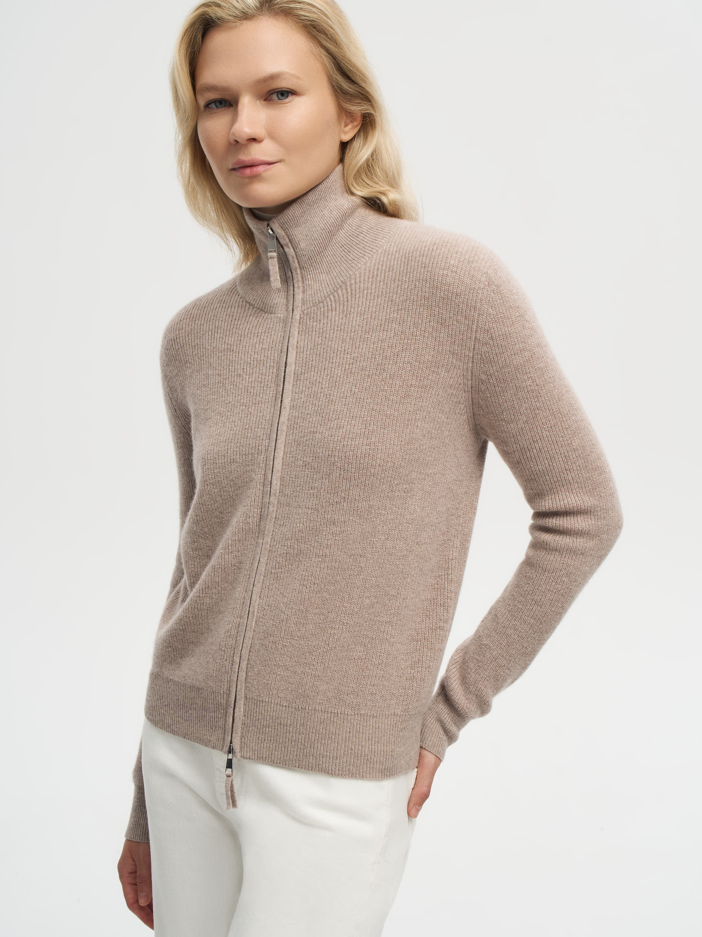 Кардиган выполнен из мягкой пряжи с содержанием мериносовой шерсти и кашемира, что делает его особенно приятным на ощупь и теплым. Укороченный силуэт с четкой линией плеч и акцентными накладными карманами создает современную графичность, а меланжевое переплетение нитей придает фактурности и глубины оттенку. Вырез без воротника делает модель универсальной: ее можно носить на голое тело или сочетать с тонкой водолазкой и топами, создавая расслабленные или более собранные образы.