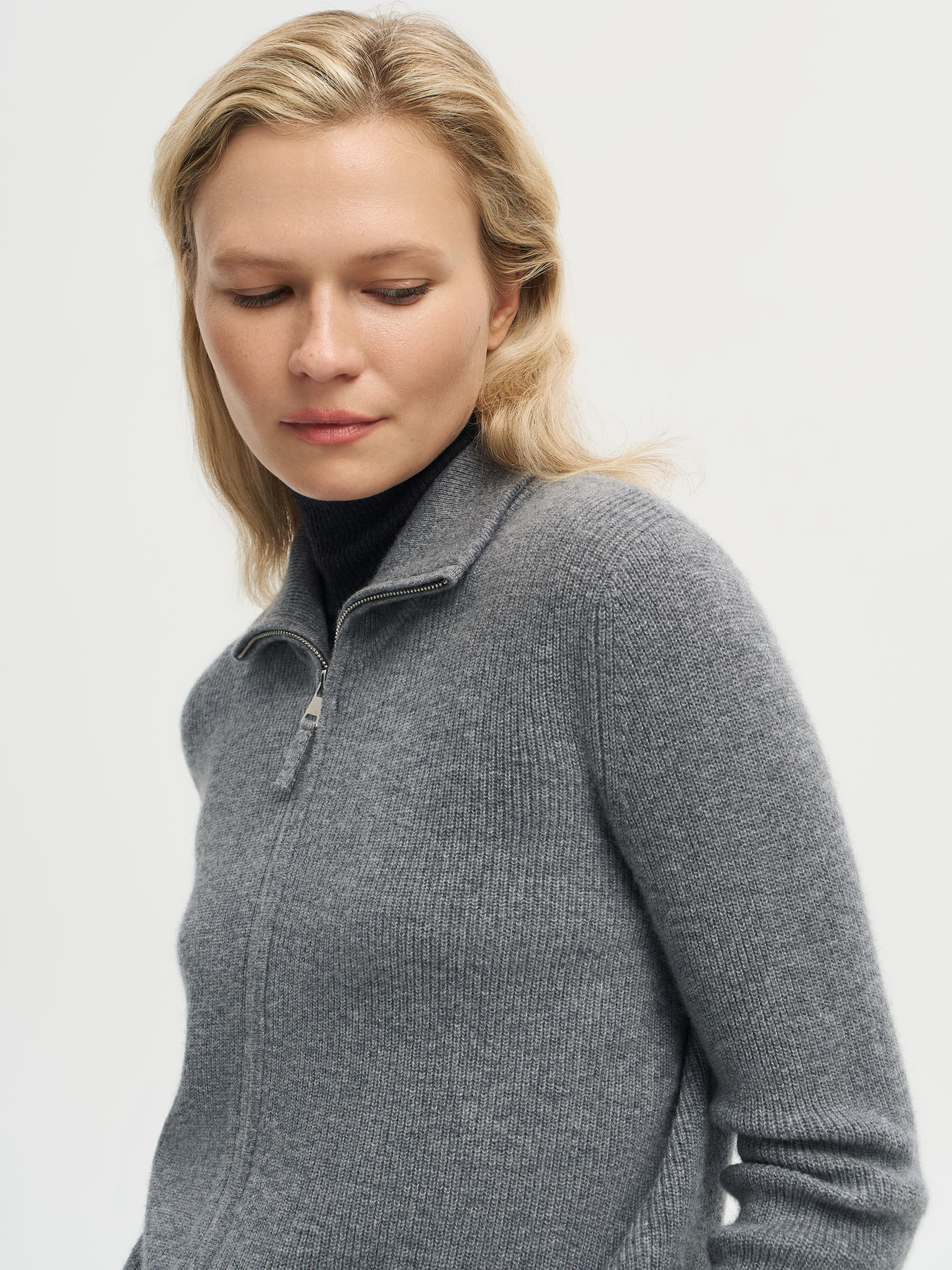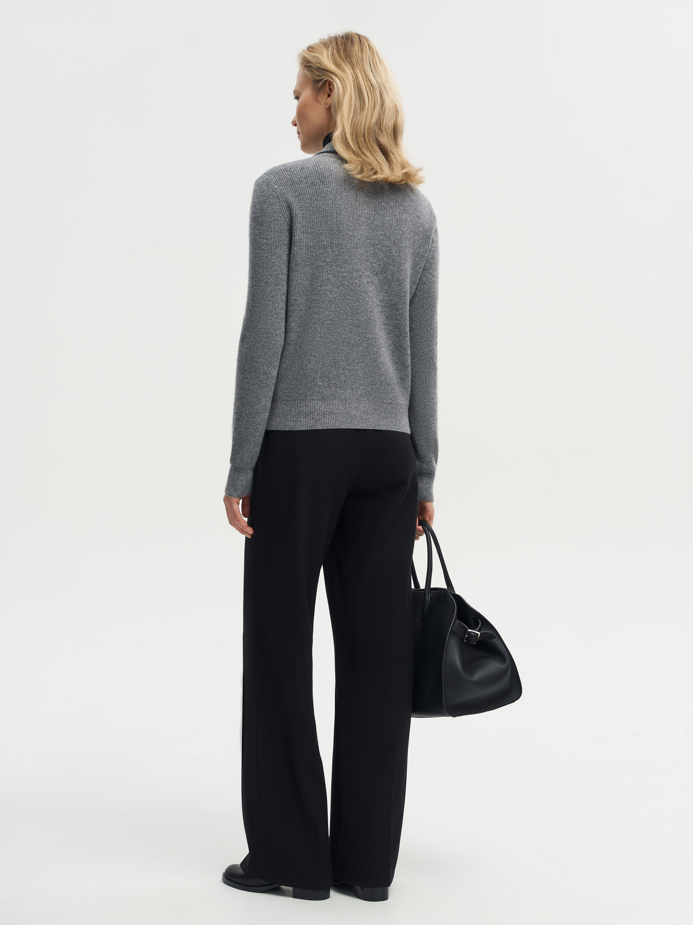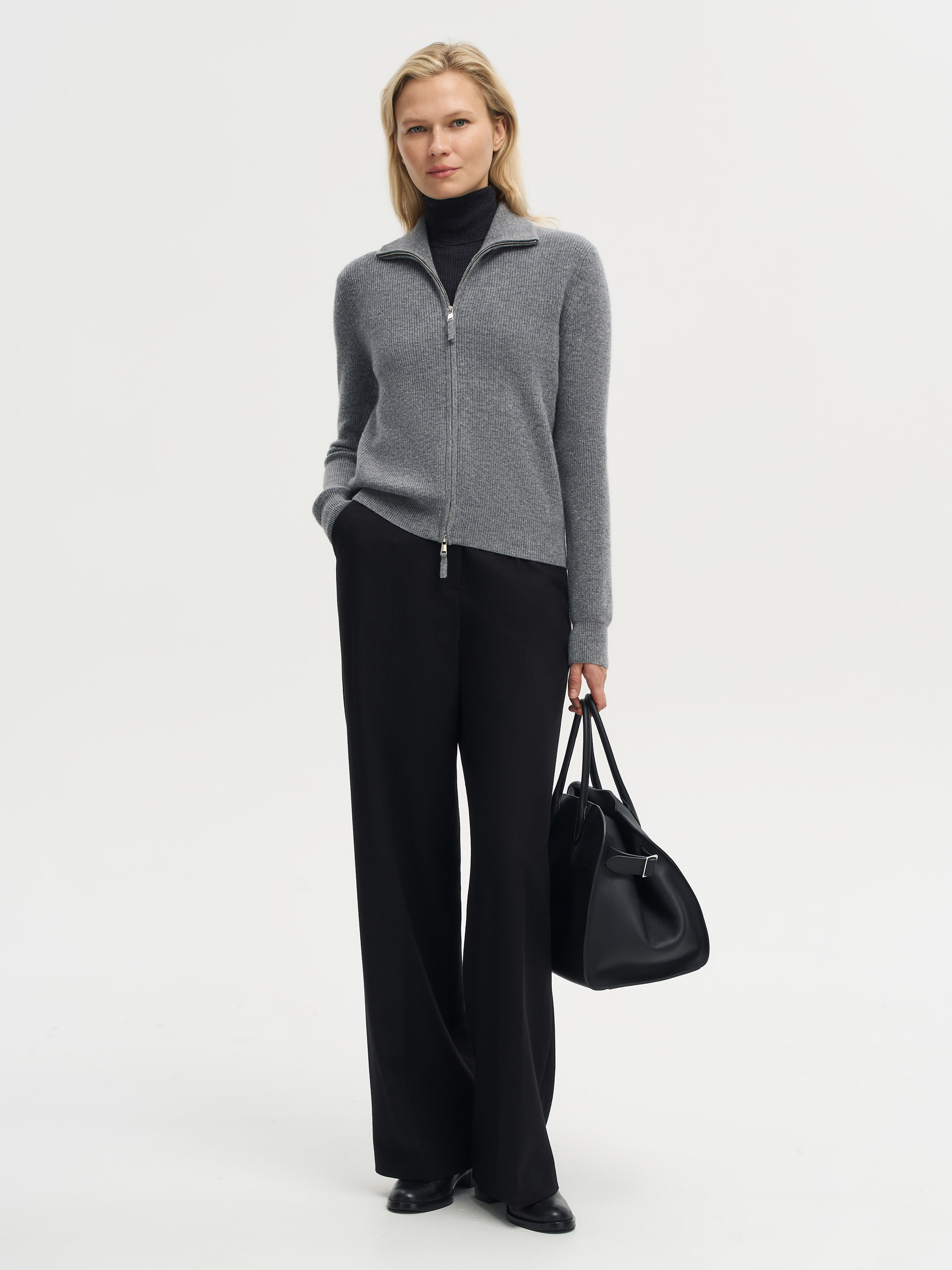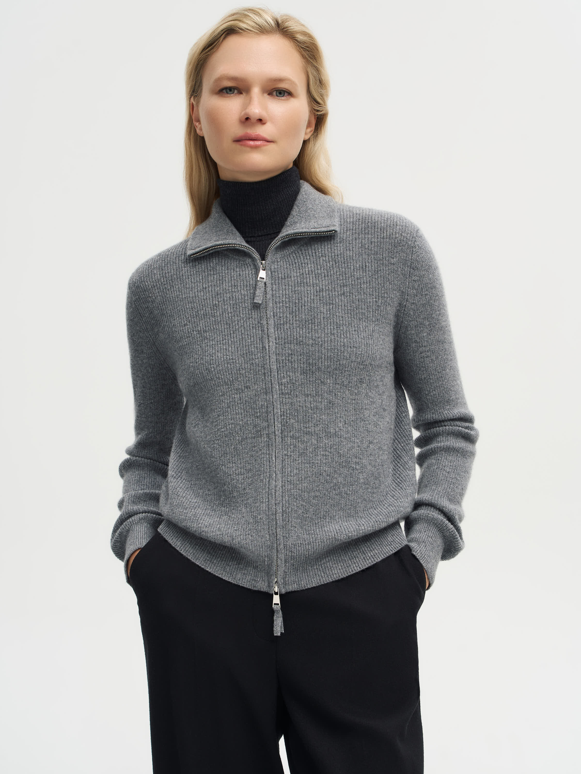 Кардиган выполнен из мягкой пряжи с содержанием мериносовой шерсти и кашемира, что делает его особенно приятным на ощупь и теплым. Укороченный силуэт с четкой линией плеч и акцентными накладными карманами создает современную графичность, а меланжевое переплетение нитей придает фактурности и глубины оттенку. Вырез без воротника делает модель универсальной: ее можно носить на голое тело или сочетать с тонкой водолазкой и топами, создавая расслабленные или более собранные образы.