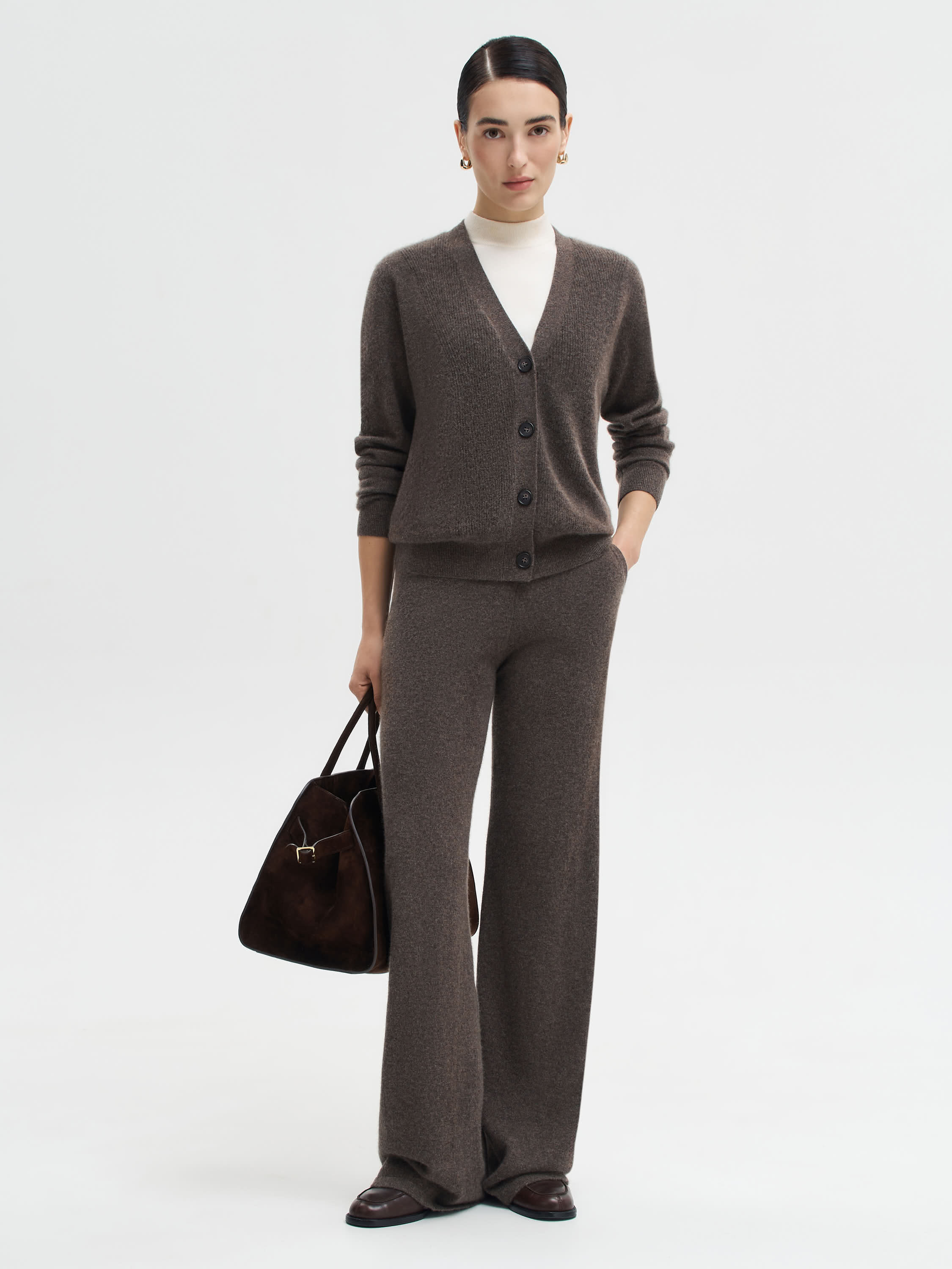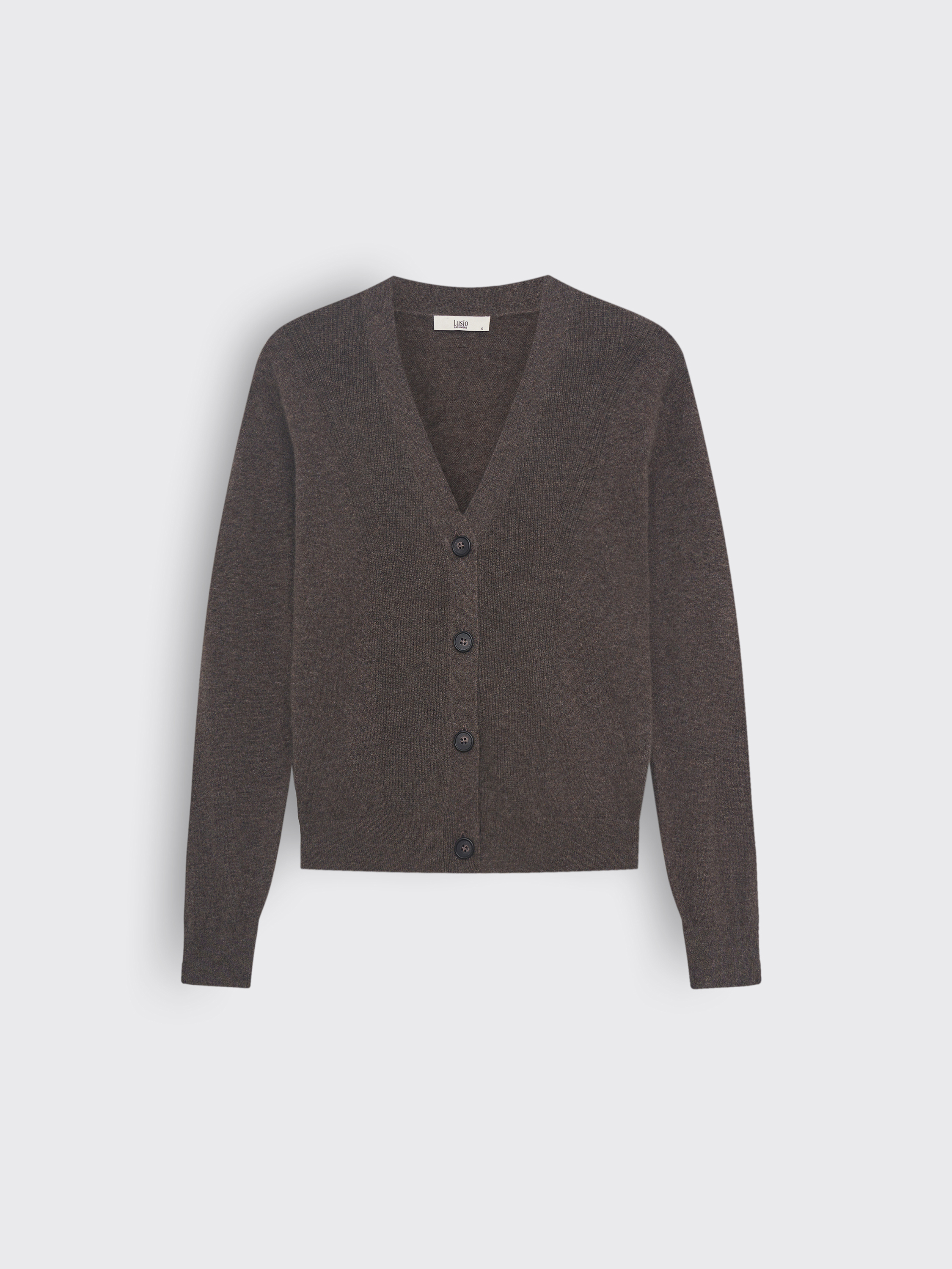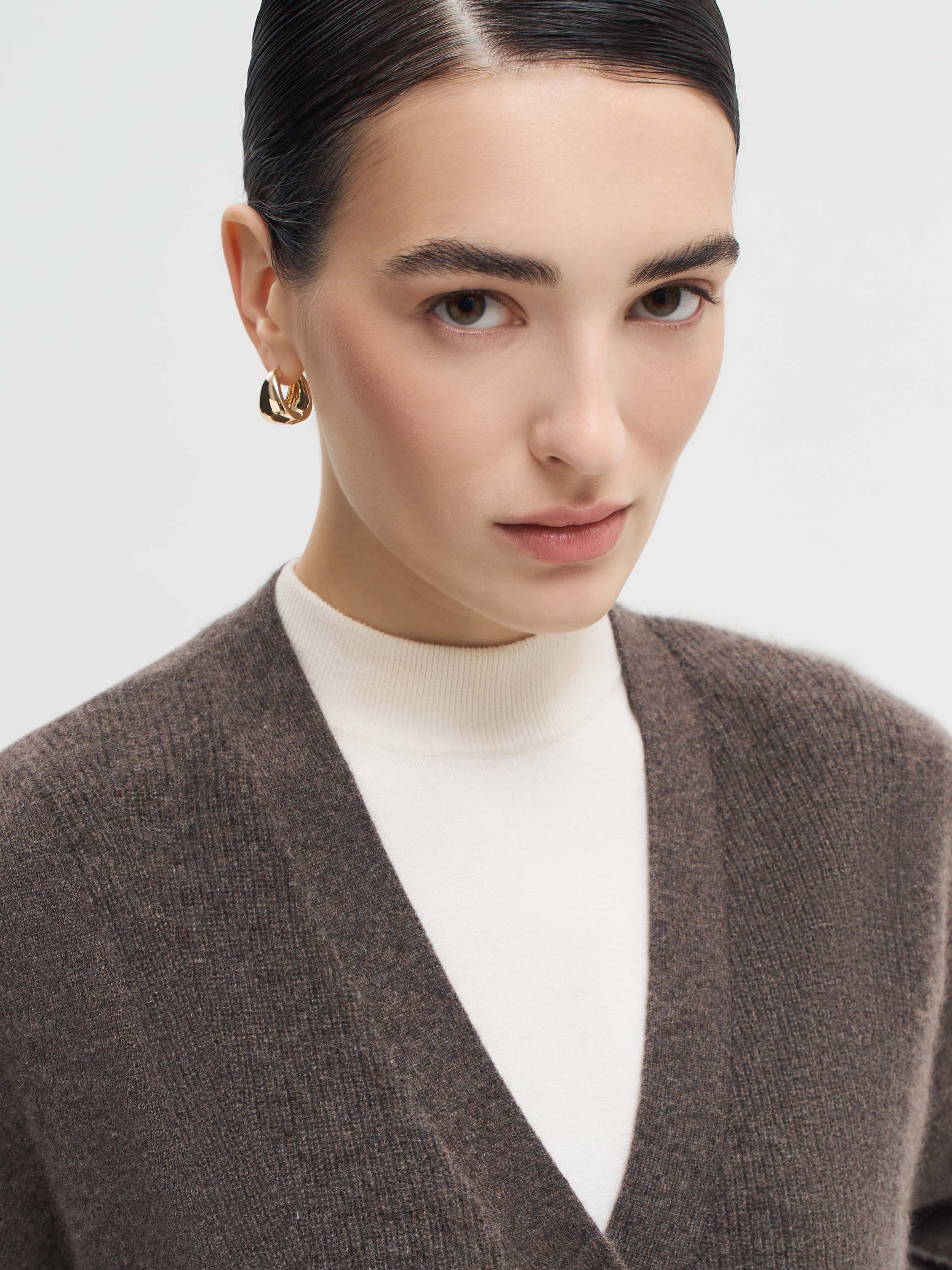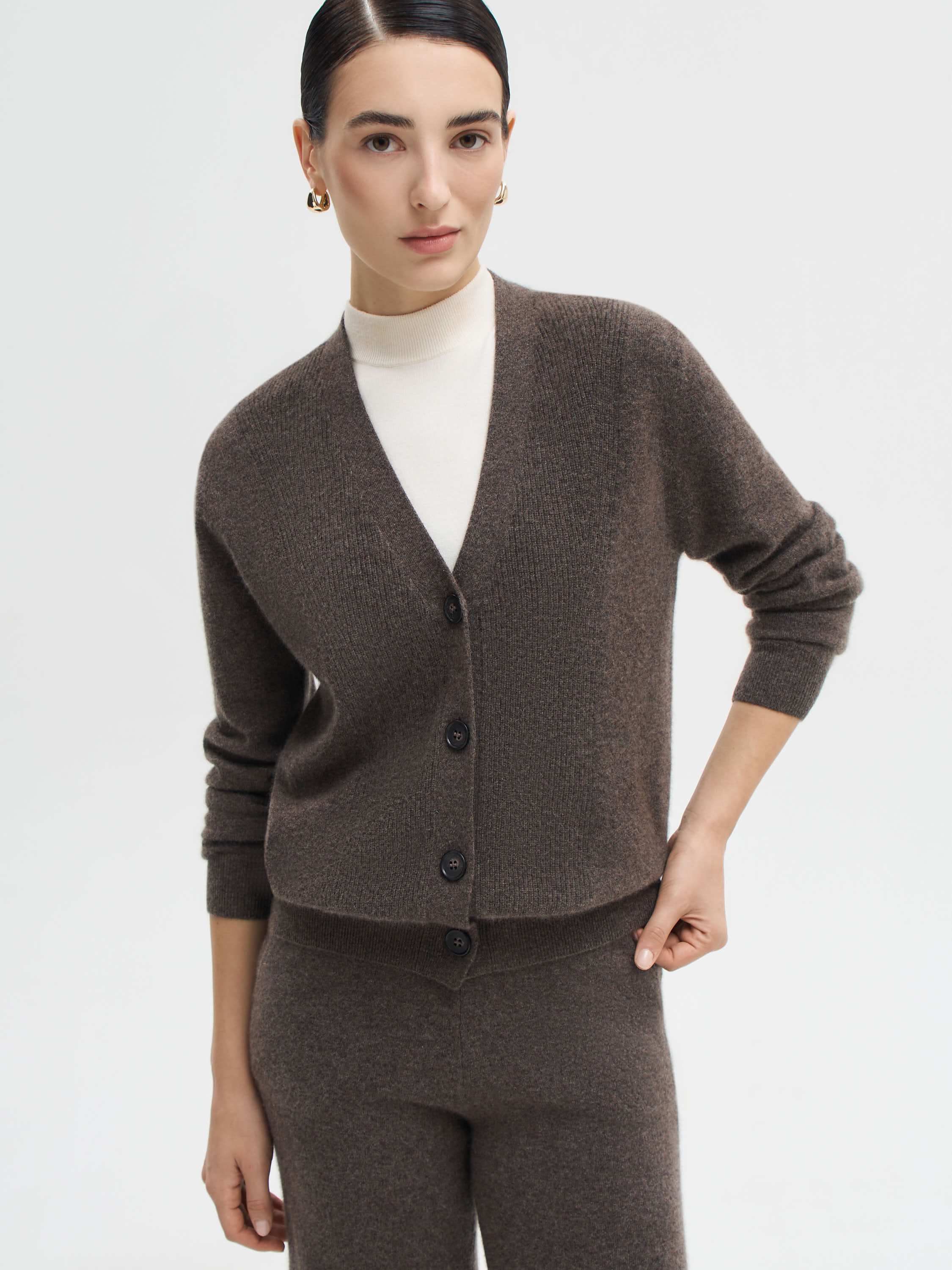 Кардиган из чистого кашемира отличается мягкостью и деликатным теплом, которое сохраняется даже в прохладный сезон. Тонкое и пластичное полотно комфортно при носке, хорошо держит форму и приятно ощущается на коже. Лаконичный прямой крой с V-образным вырезом и застежкой на пуговицы подчеркивает минималистичный характер модели, а длина до линии бедра делает ее универсальной для разных образов. Кардиган можно носить поверх топов и рубашек, сочетать с юбками и брюками или вписывать в многослойные комплекты с жакетами и пальто.