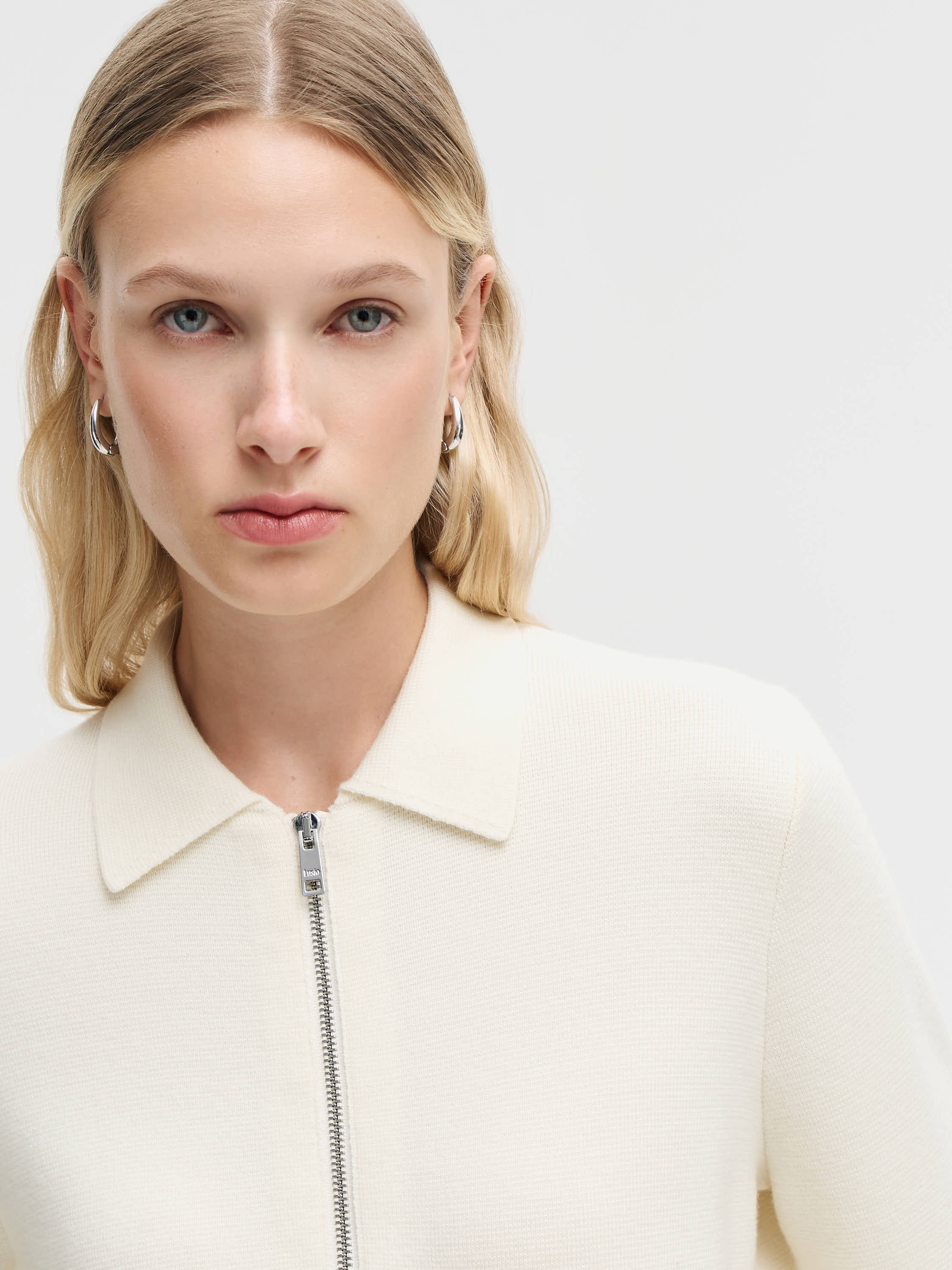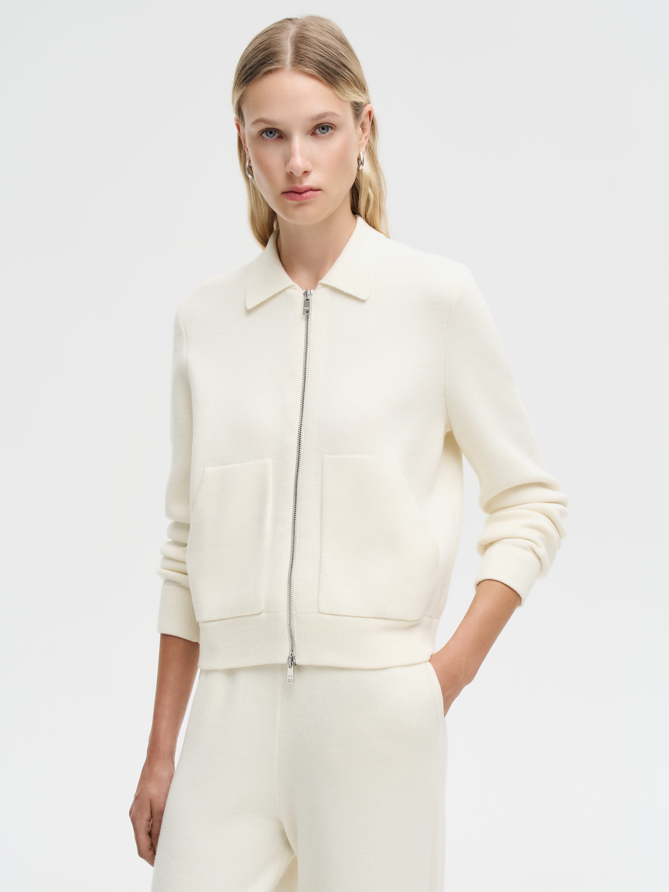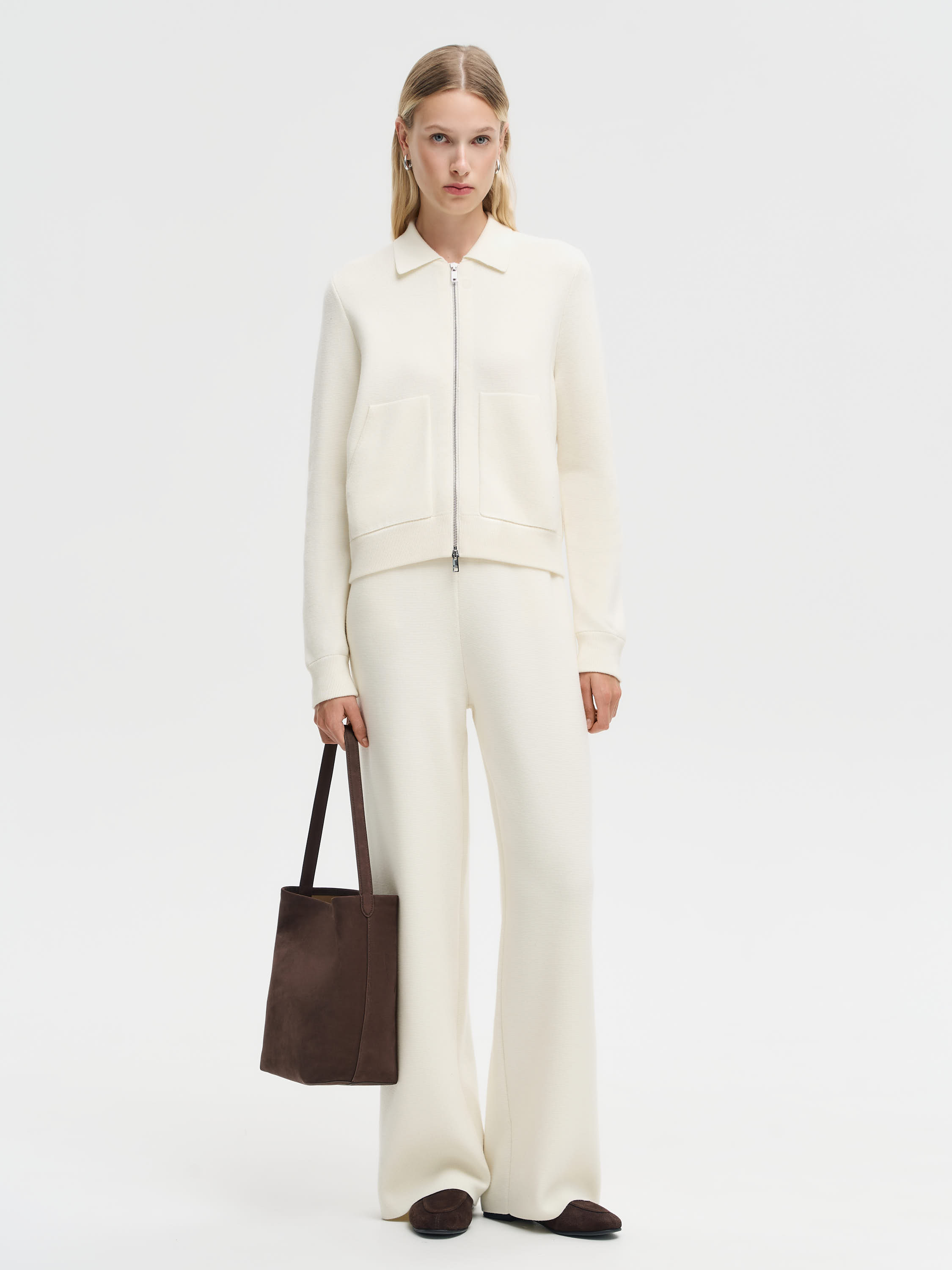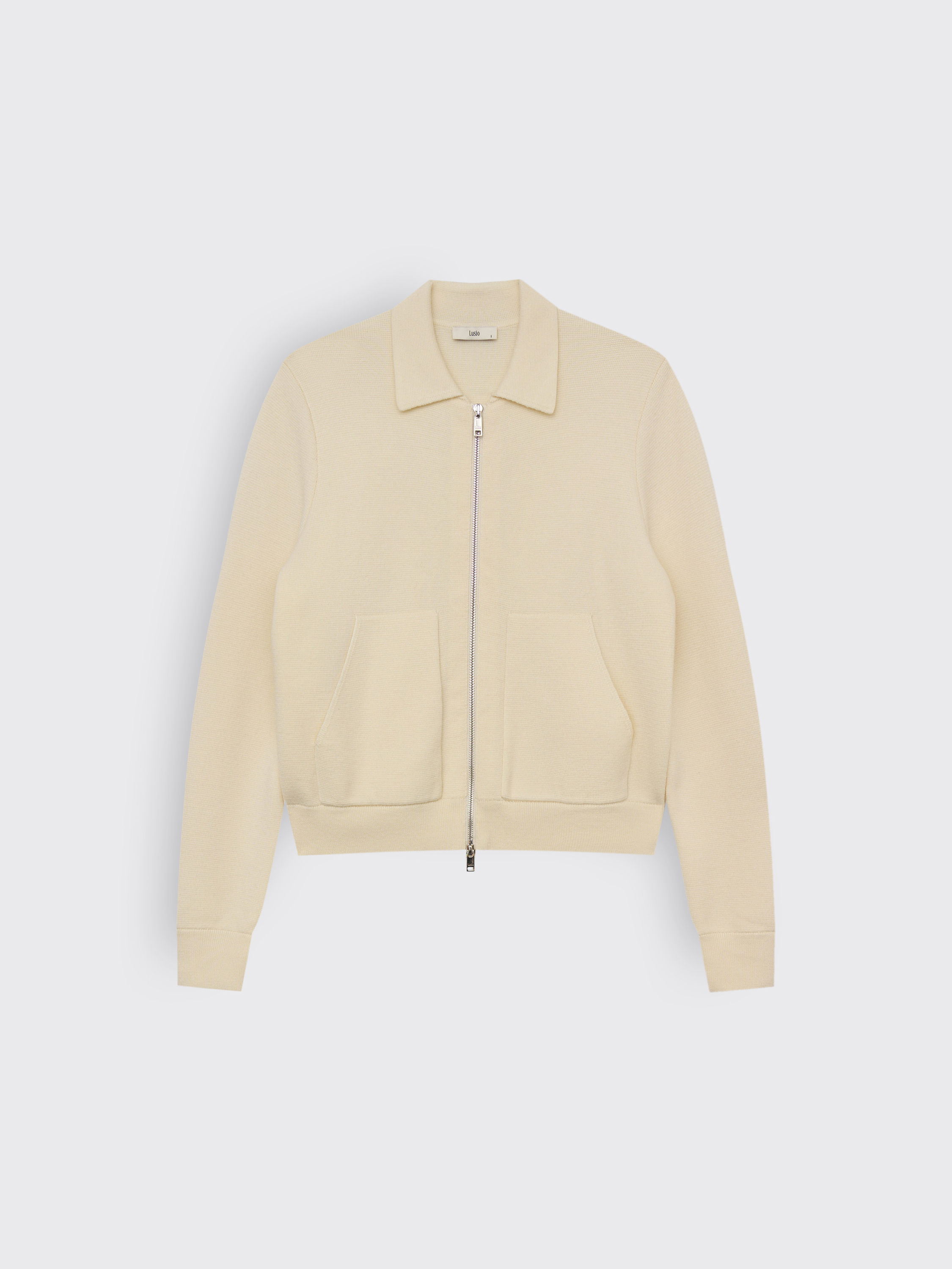Кардиган из шерсти мериноса с отложным воротником и застежкой на молнию. Мягкое трикотажное полотно отличается тонкостью и упругостью, хорошо держит форму и сохраняет тепло. Прямой силуэт с чуть укороченной линией низа подчеркивает аккуратность кроя, а крупные накладные карманы добавляют функциональности. Универсальная модель, которую можно носить как самостоятельный слой с брюками или юбкой, а также под пальто или тренч в прохладное время года.