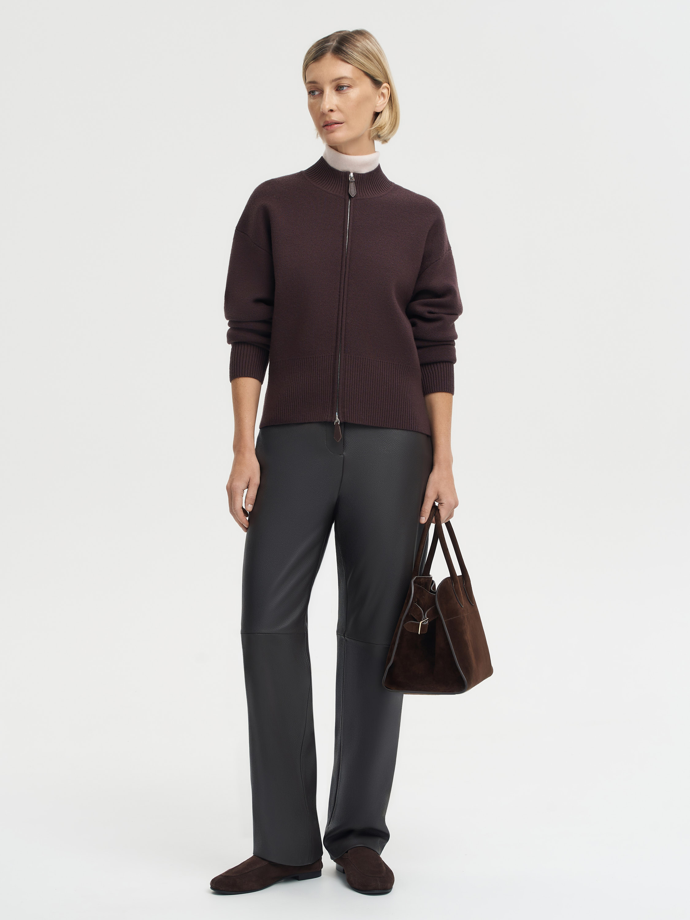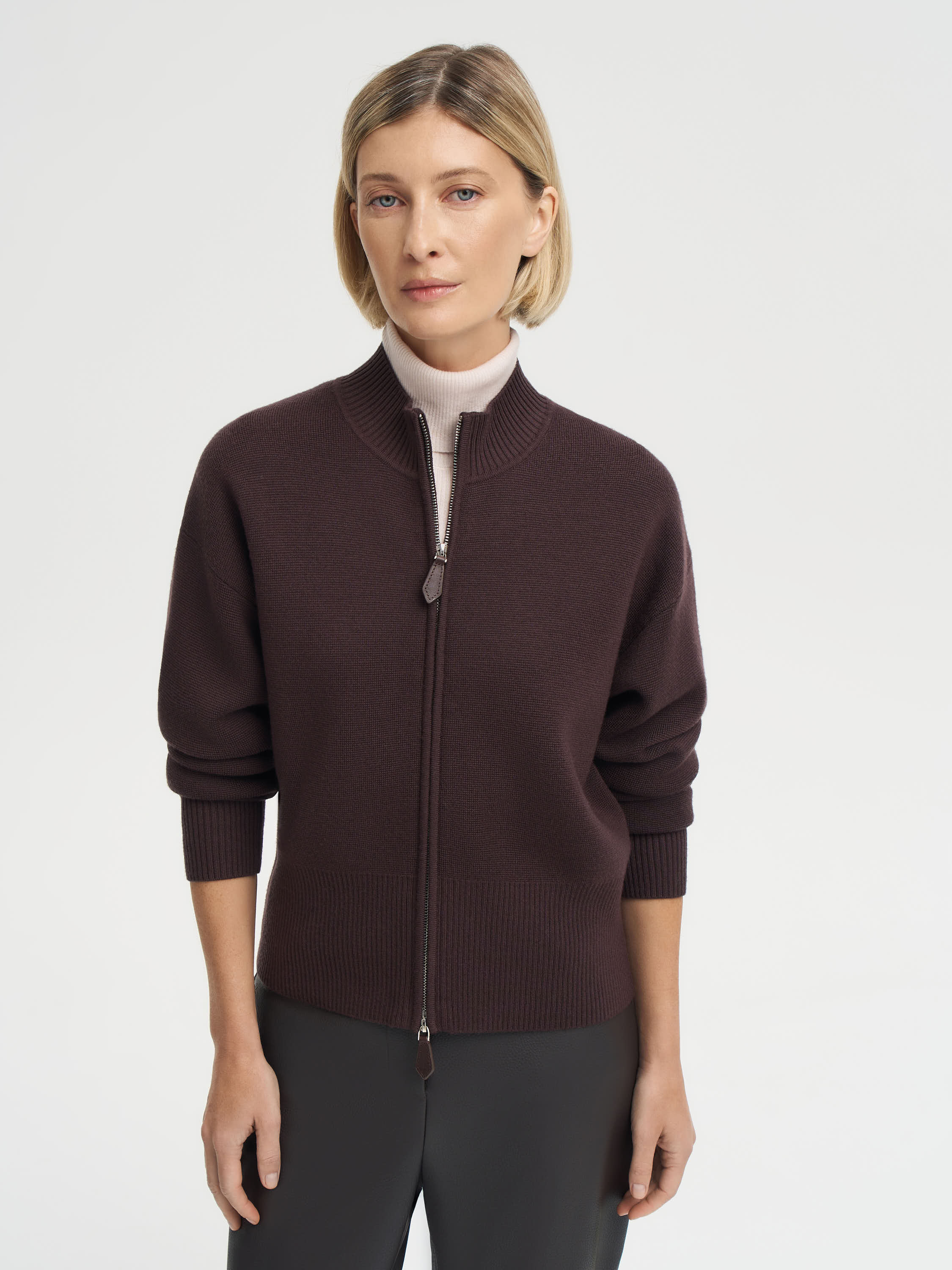 Кардиган из 100% шерсти мериноса — базовая вещь с акцентом на фактуру и детали. Плотное трикотажное полотно хорошо держит форму, оставаясь мягким и эластичным. Молния по центру делает модель функциональной, а двусторонний замок позволяет регулировать посадку и создавать разные пропорции в образе. Укороченный силуэт и широкая резинка по низу подчеркивают современный характер вещи, которая одинаково уместна и в деловом, и в повседневном гардеробе. Такой кардиган можно носить поверх рубашки, тонкой водолазки или платья, добавляя образу тепла и текстуры.