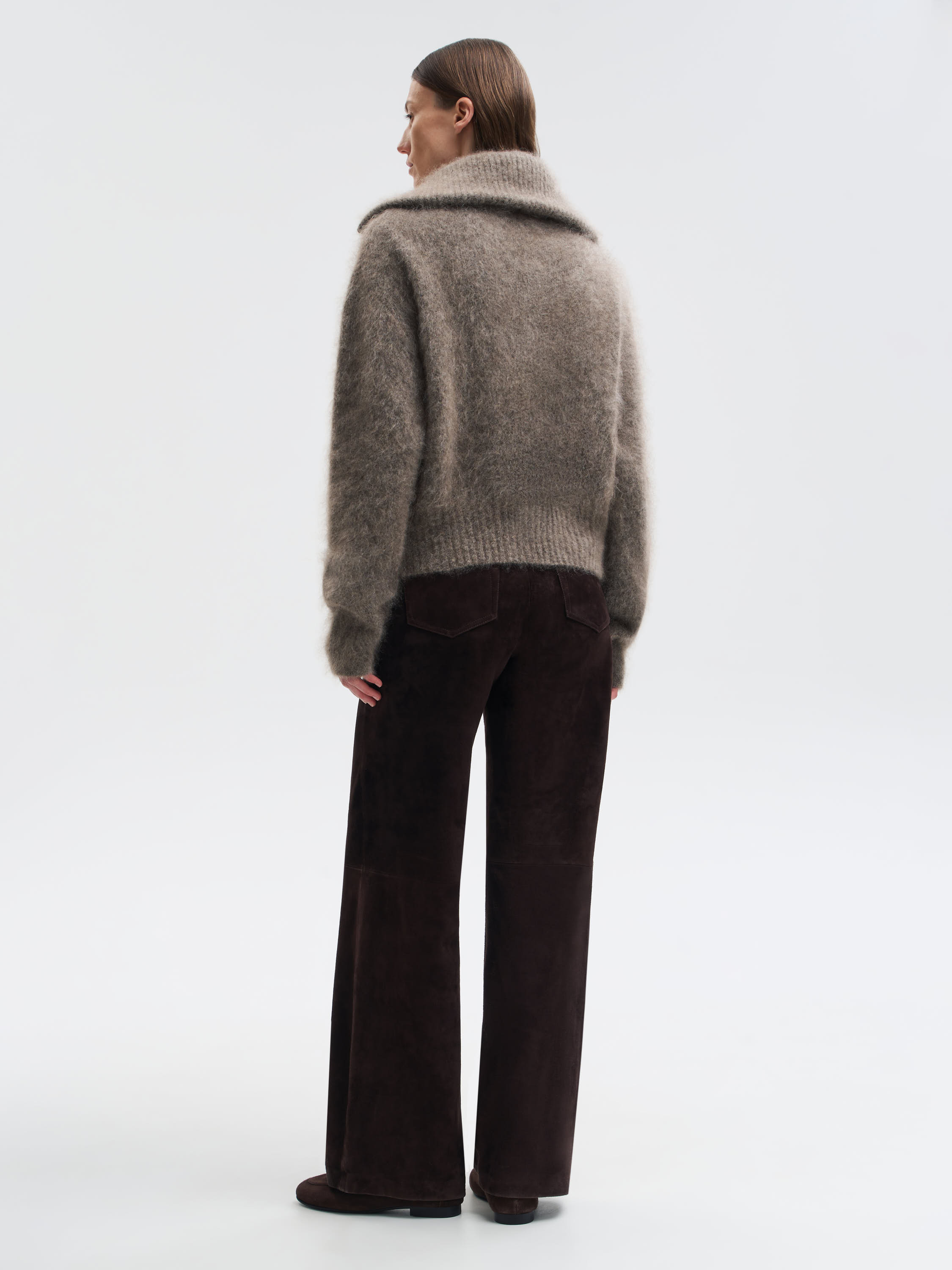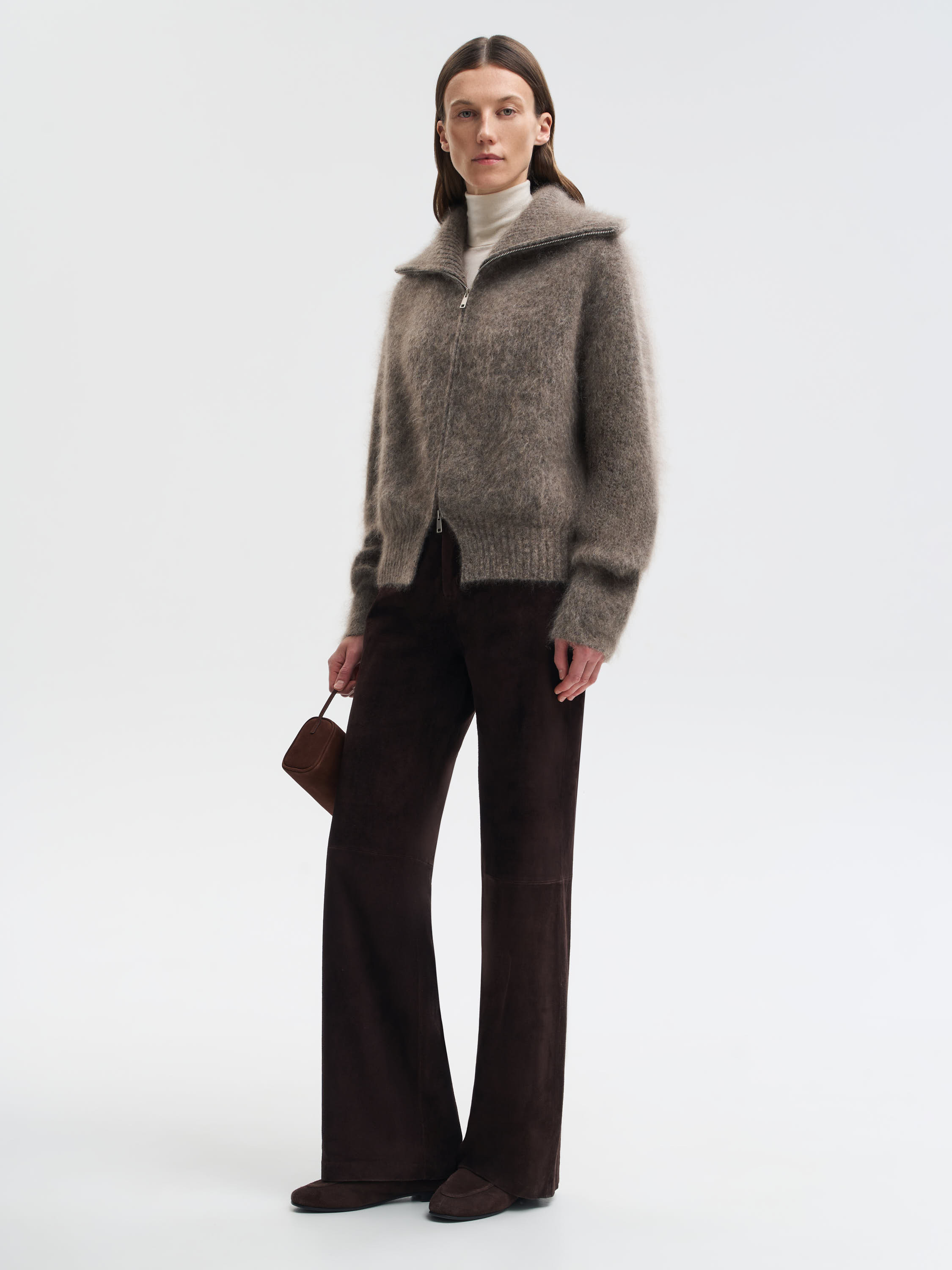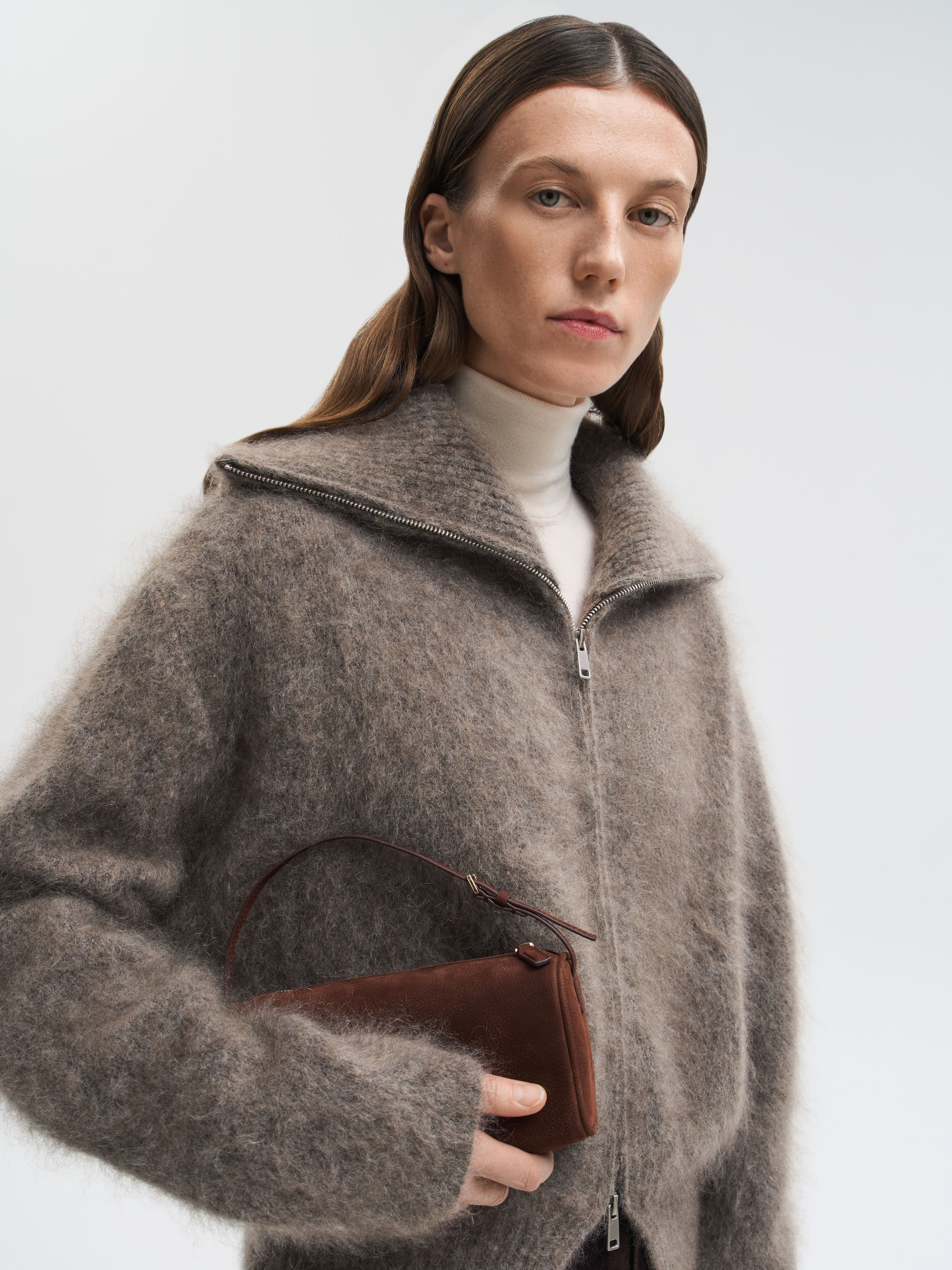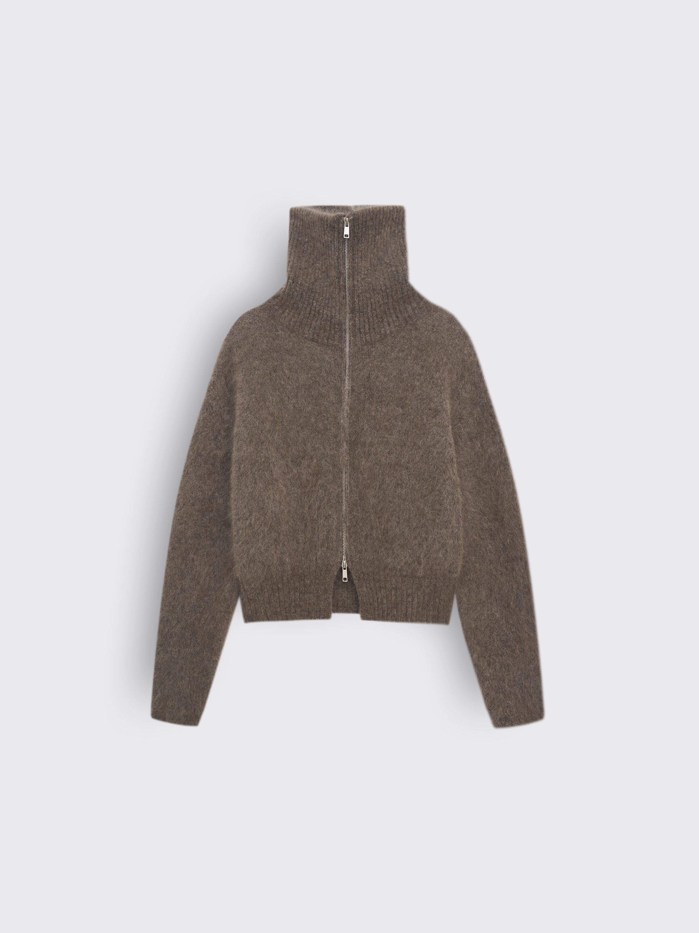 Кардиган из мохера с мягкой фактурой и легким ворсом. Теплая, объемная модель на молнии с широким воротником, который можно носить расправленным или поднятым. Благодаря содержанию мохера изделие получается легким, но хорошо сохраняющим тепло. Лаконичный крой и выразительная текстура делают кардиган универсальной вещью для повседневных образов.