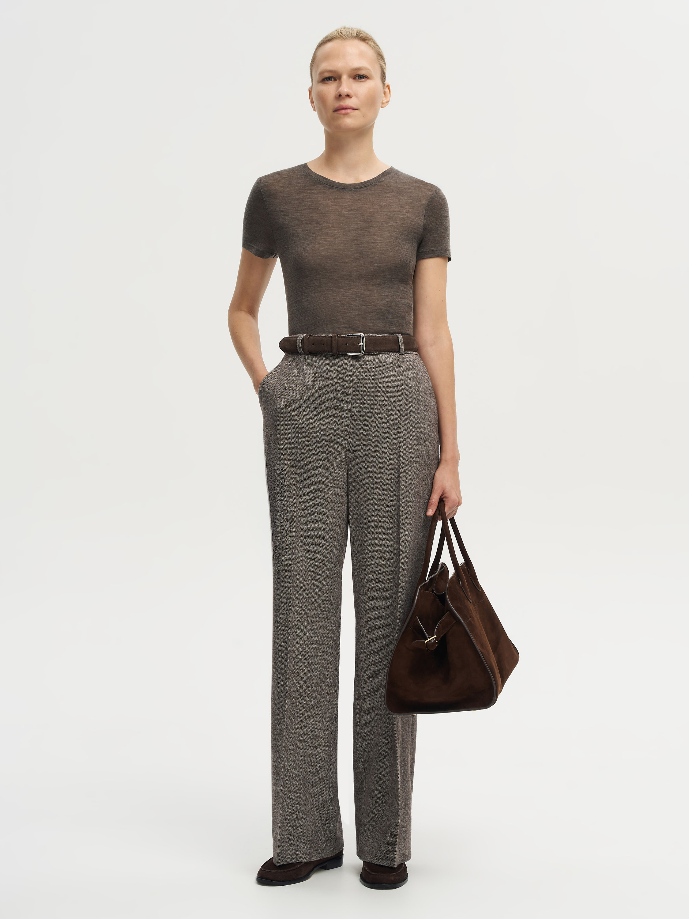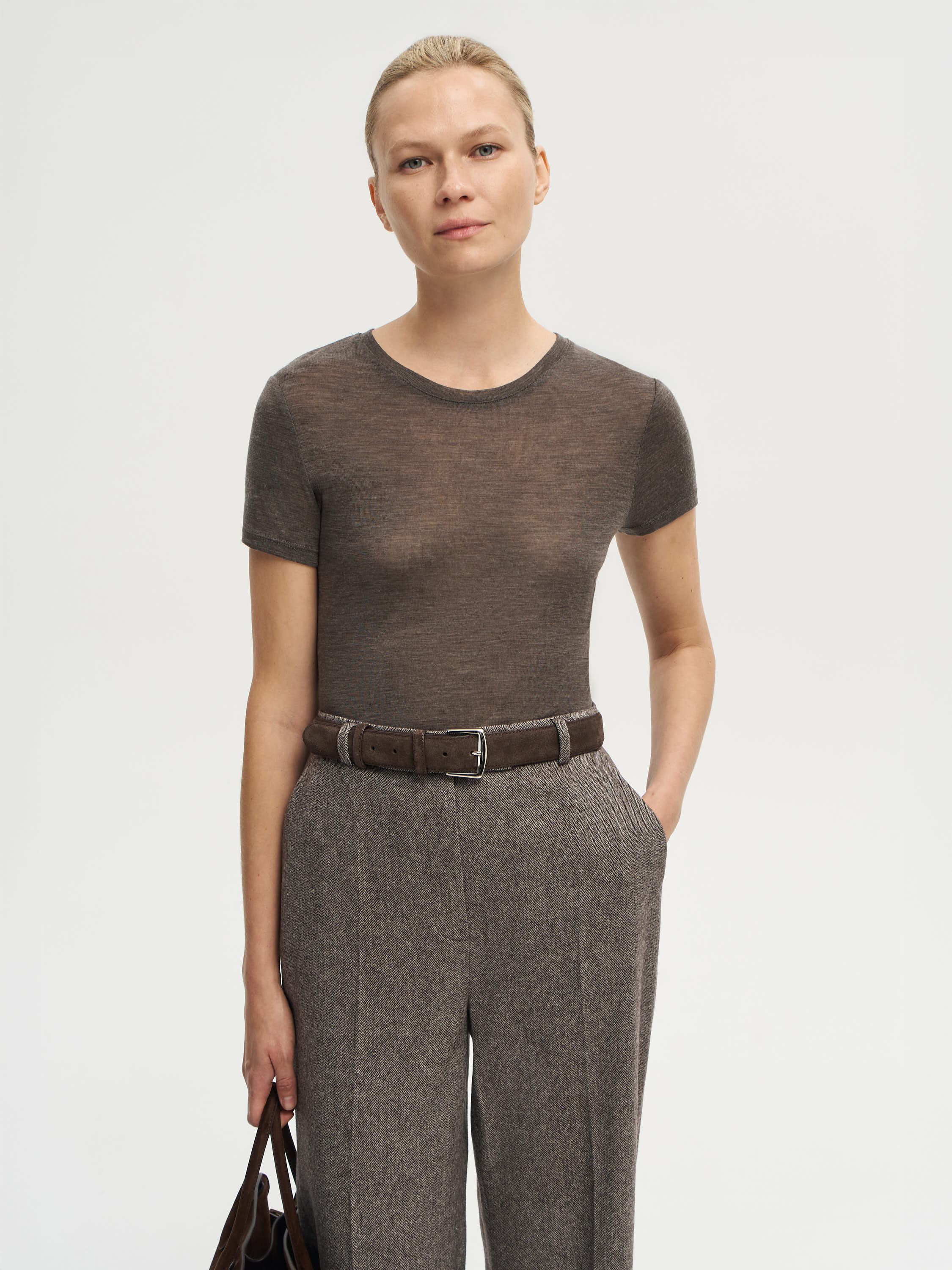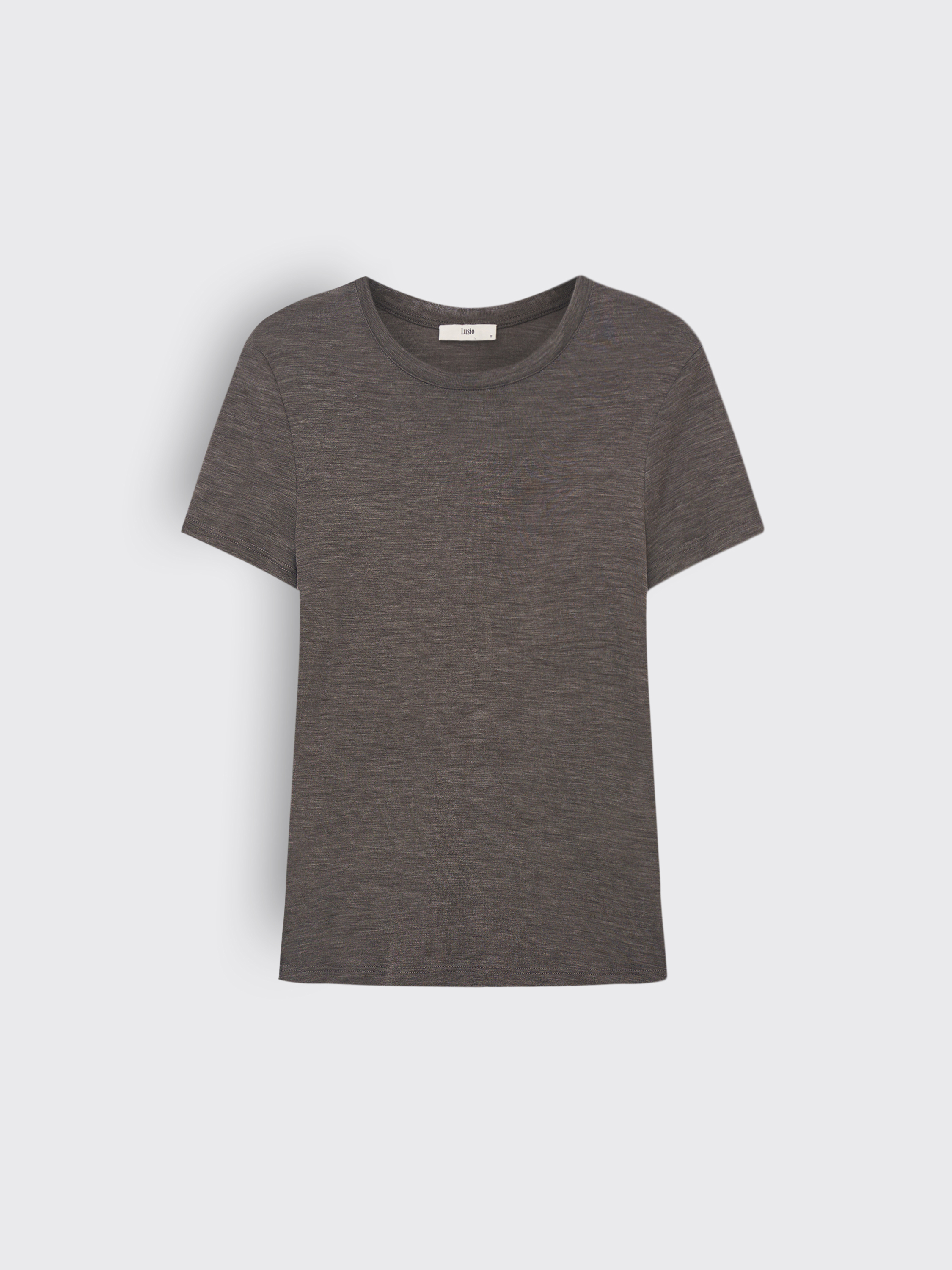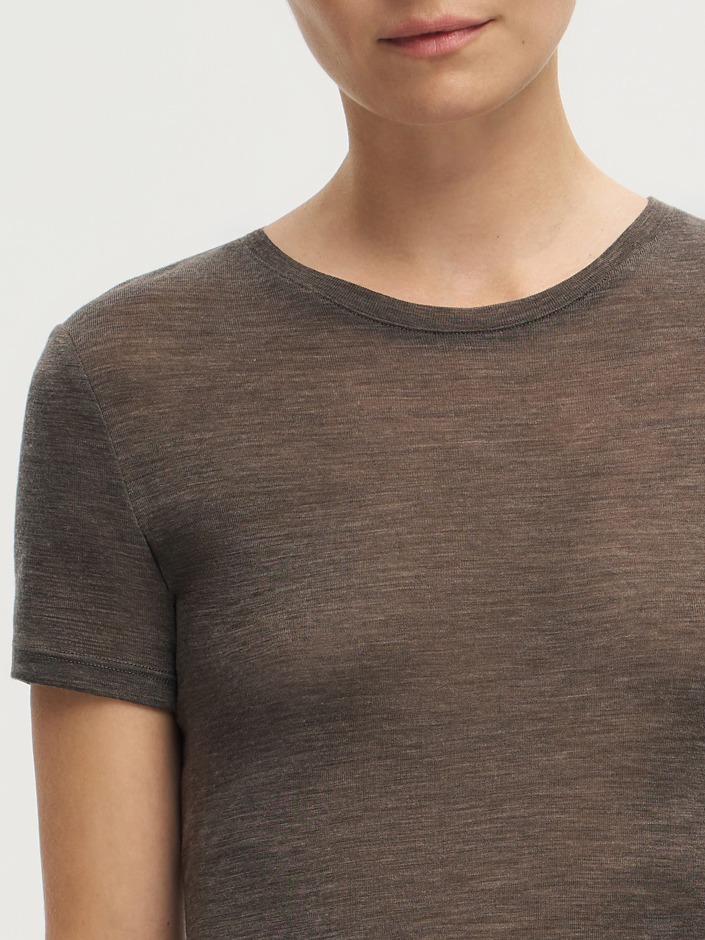 Футболка выполнена из тонкой шерсти с легким меланжевым эффектом, создающим мягкий переход оттенков и визуальную глубину ткани. Материал отличается деликатной текстурой, хорошо пропускает воздух и комфортен при контакте с кожей. Крой прямой, с округлой горловиной и короткими рукавами, что подчеркивает чистоту силуэта и делает модель универсальной основой в гардеробе. Такая футболка уместна в многослойных комплектах с жакетами, трикотажем или рубашками, а также работает как самостоятельный элемент в минималистичных образах.