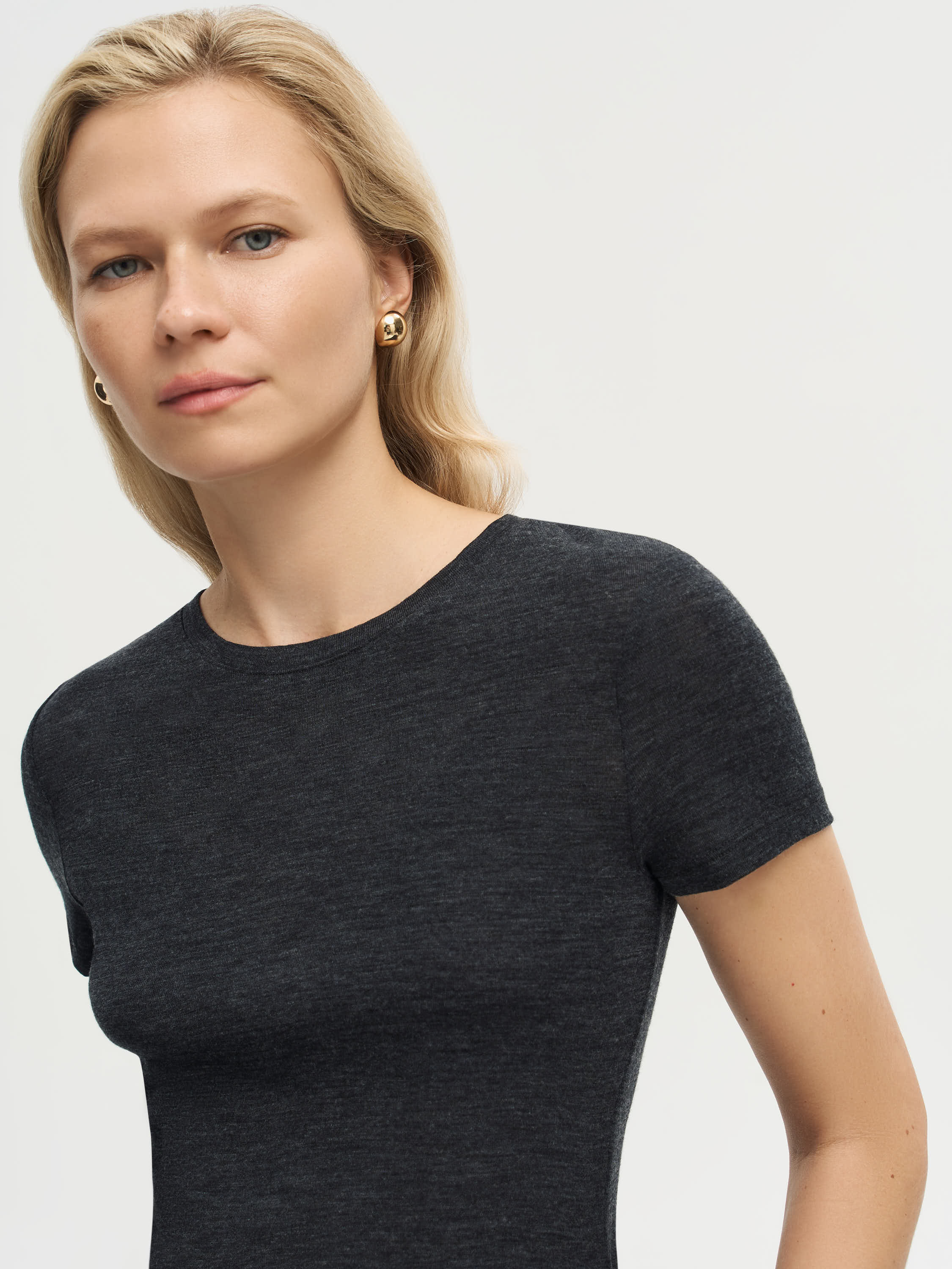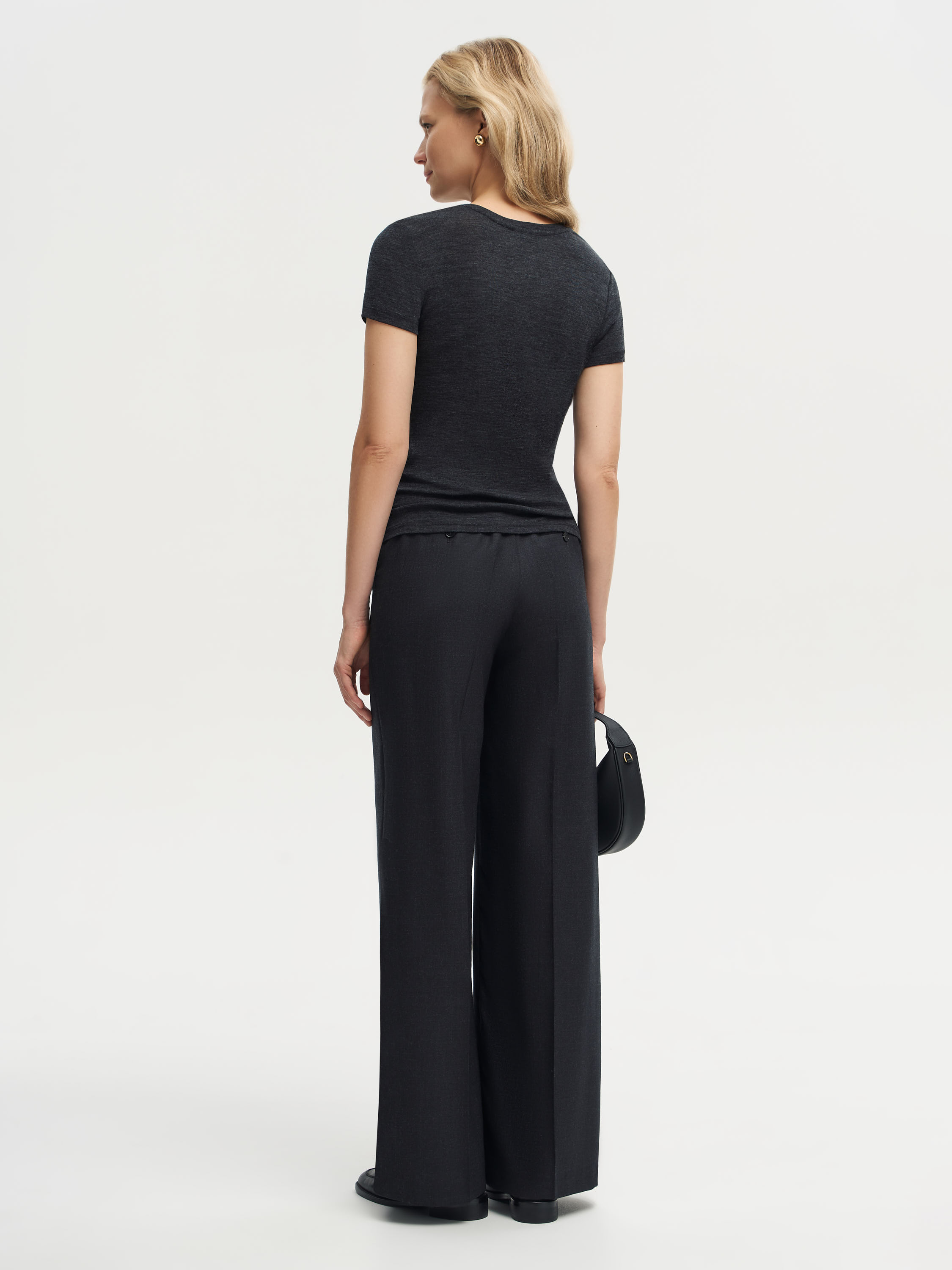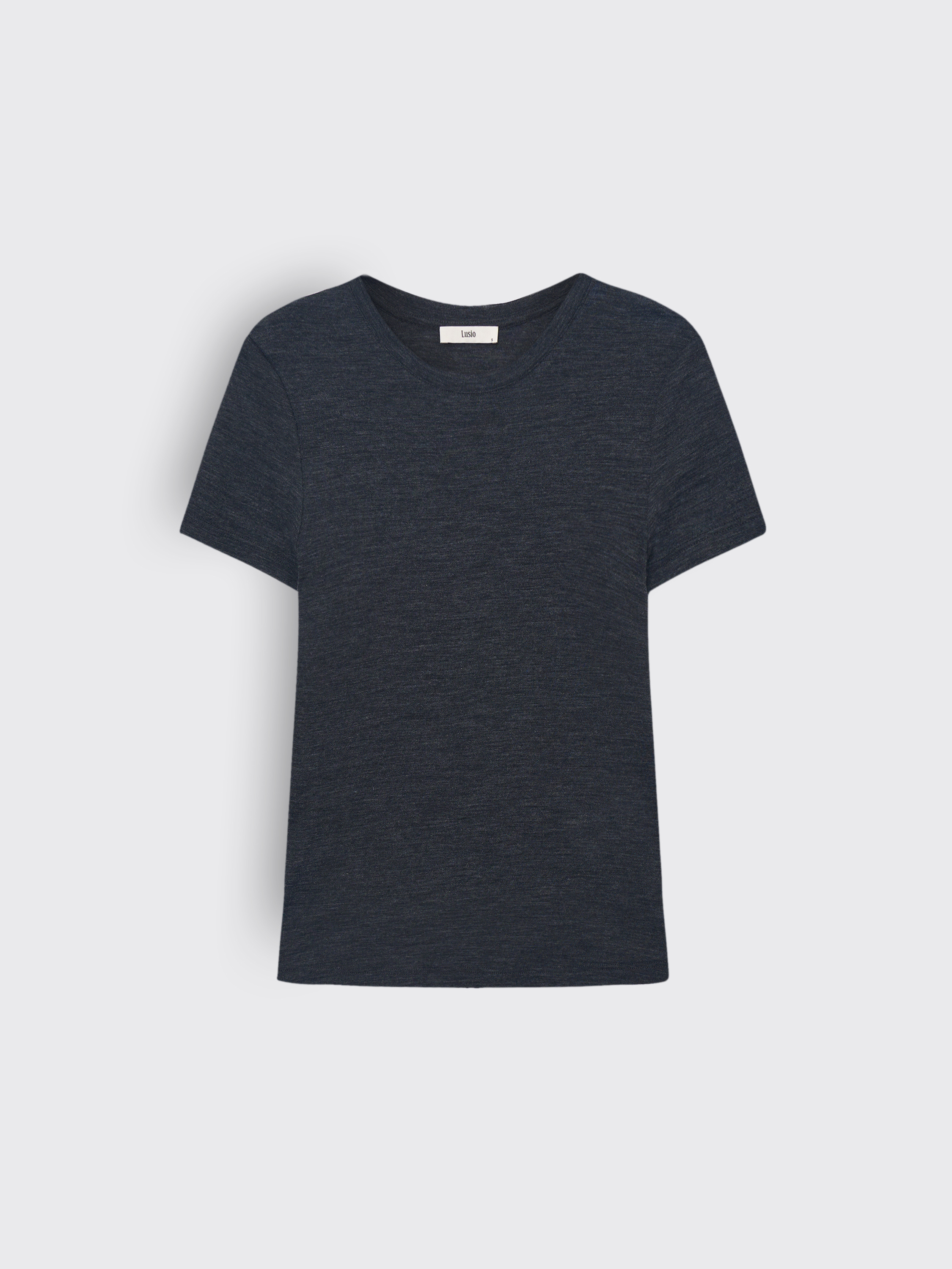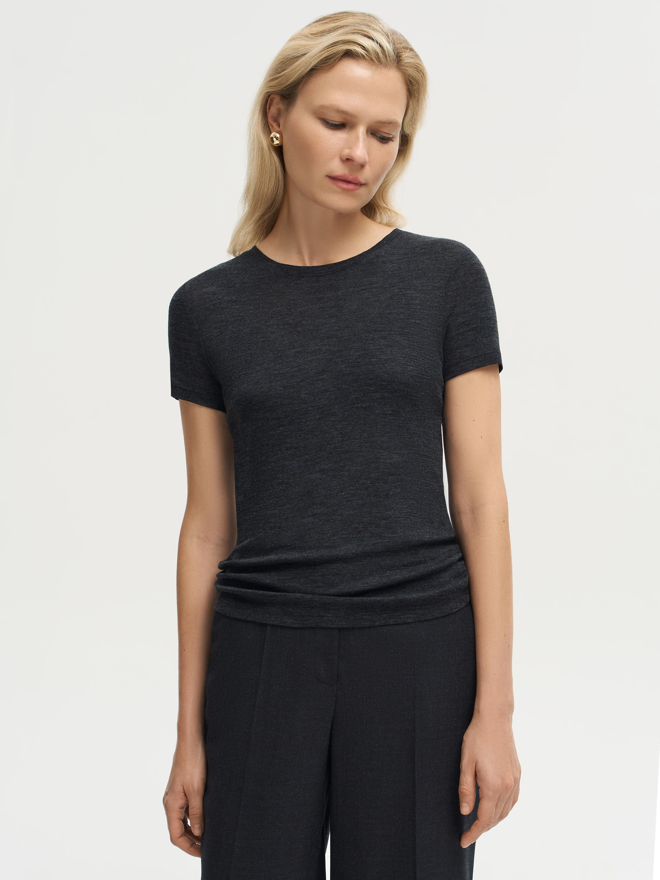 Футболка выполнена из тонкой шерсти с легким меланжевым эффектом, создающим мягкий переход оттенков и визуальную глубину ткани. Материал отличается деликатной текстурой, хорошо пропускает воздух и комфортен при контакте с кожей. Крой прямой, с округлой горловиной и короткими рукавами, что подчеркивает чистоту силуэта и делает модель универсальной основой в гардеробе. Такая футболка уместна в многослойных комплектах с жакетами, трикотажем или рубашками, а также работает как самостоятельный элемент в минималистичных образах.