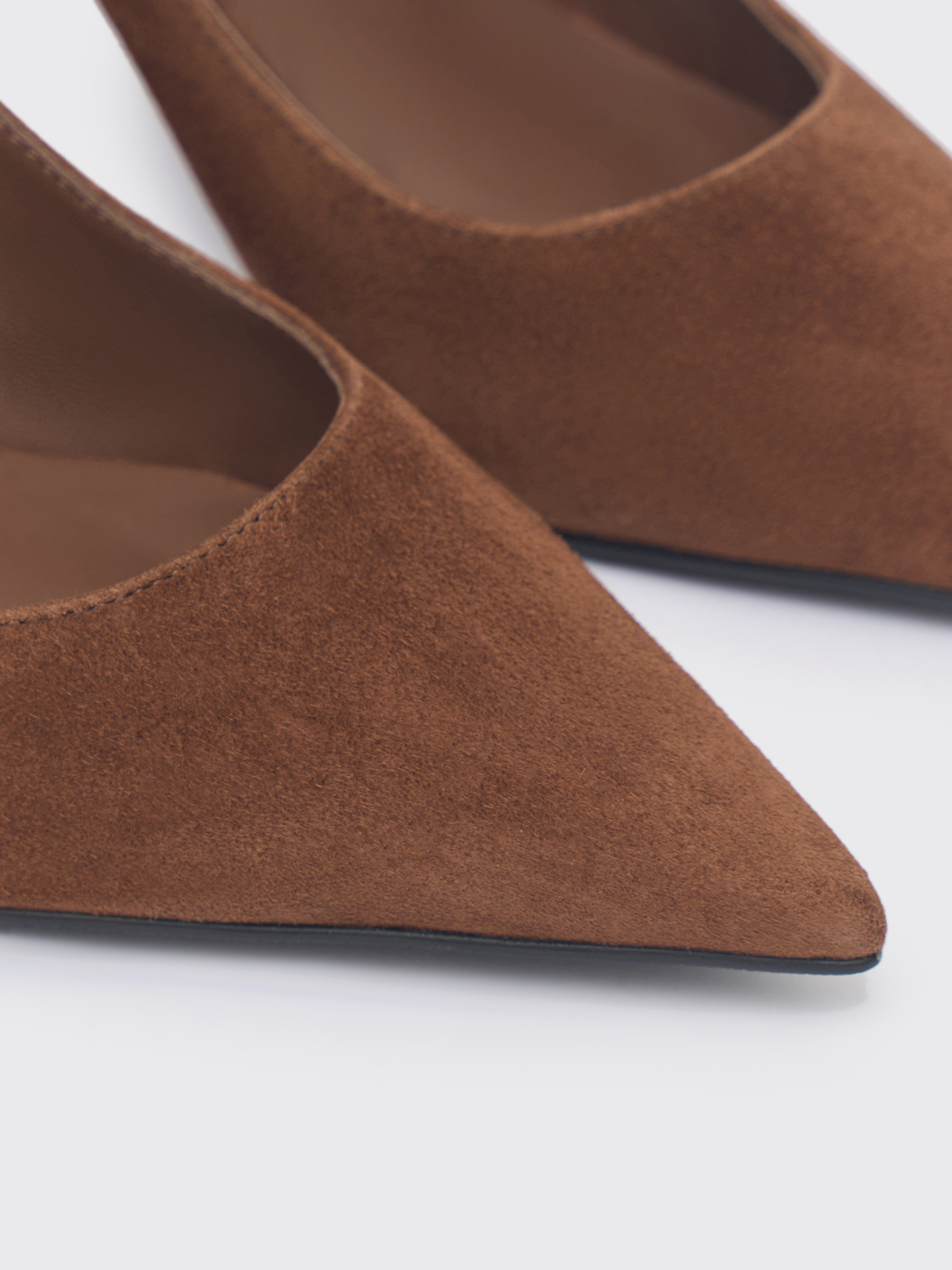 Лодочки из замши переосмысляют классику, сохраняя её универсальность и добавляя мягкость за счет благородной фактуры. Сдержанный силуэт с заостренным мысом и тонким каблуком делает модель актуальной вне времени. В благородном оттенке лодочки поддерживают естественную палитру сезона и гармонично сочетаются с трикотажем, шерстью и замшей. В благородном, насыщенном, они становятся выразительным акцентом и добавляют глубины образу — как в повседневных комплектах, так и в вечерних.