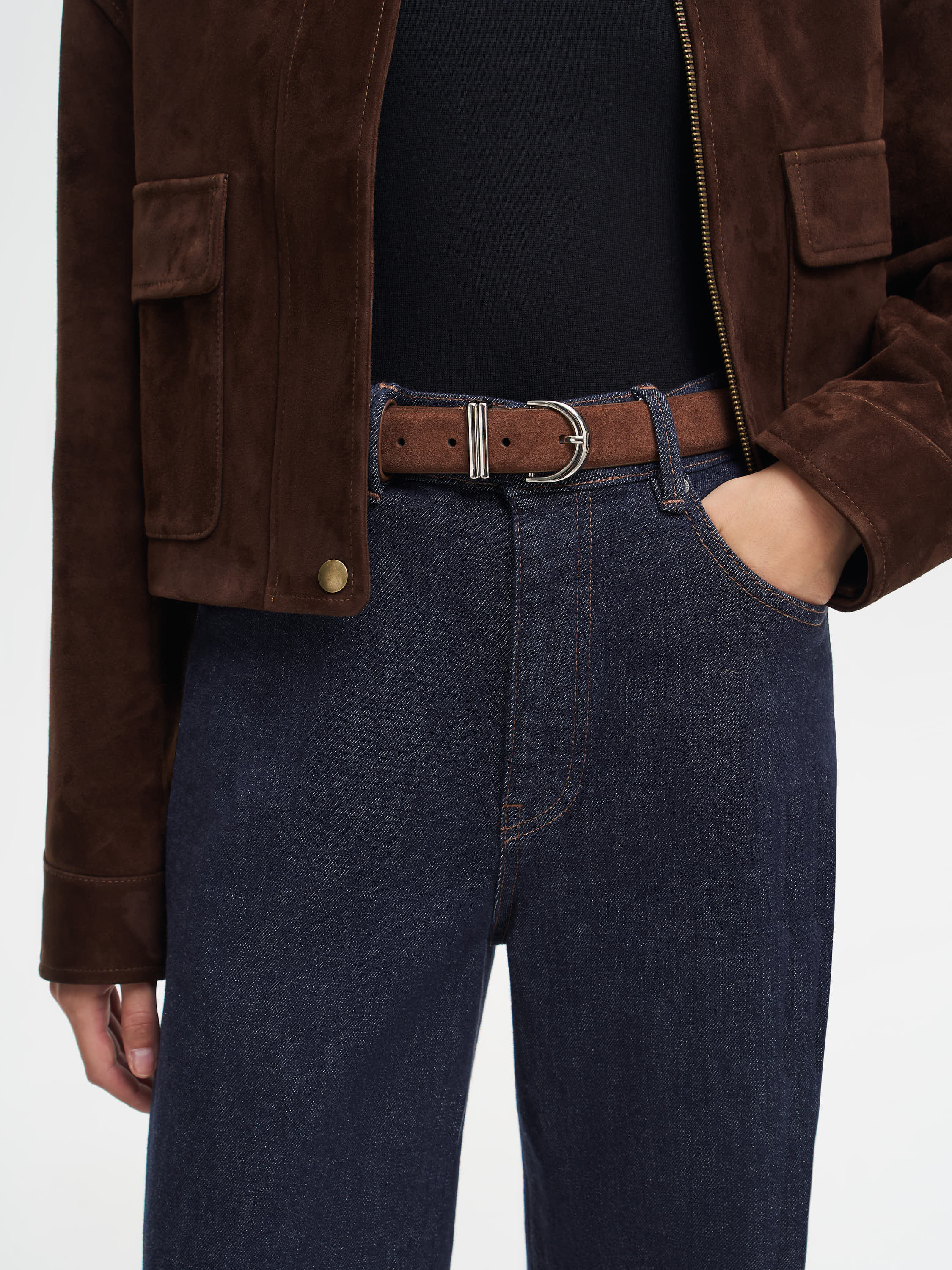 Ремень из натуральной замши с мягкой бархатистой поверхностью и аккуратной металлической пряжкой. Классическая форма и сдержанный дизайн позволяют использовать аксессуар как в повседневных, так и в более собранных образах. Благодаря плотной структуре материал сохраняет форму, а деликатная фактура придает образу визуальную глубину и ощущение тактильного комфорта.
